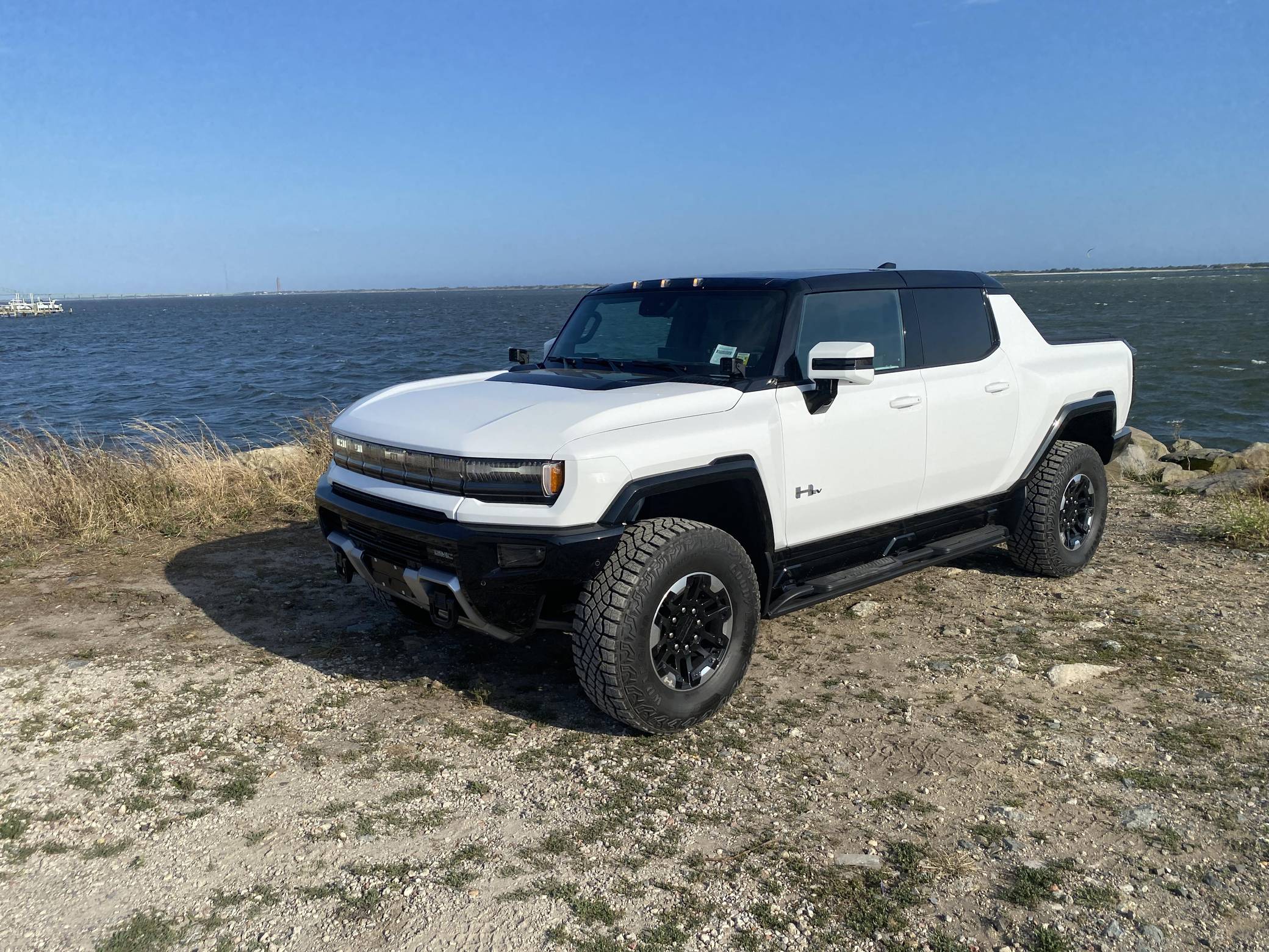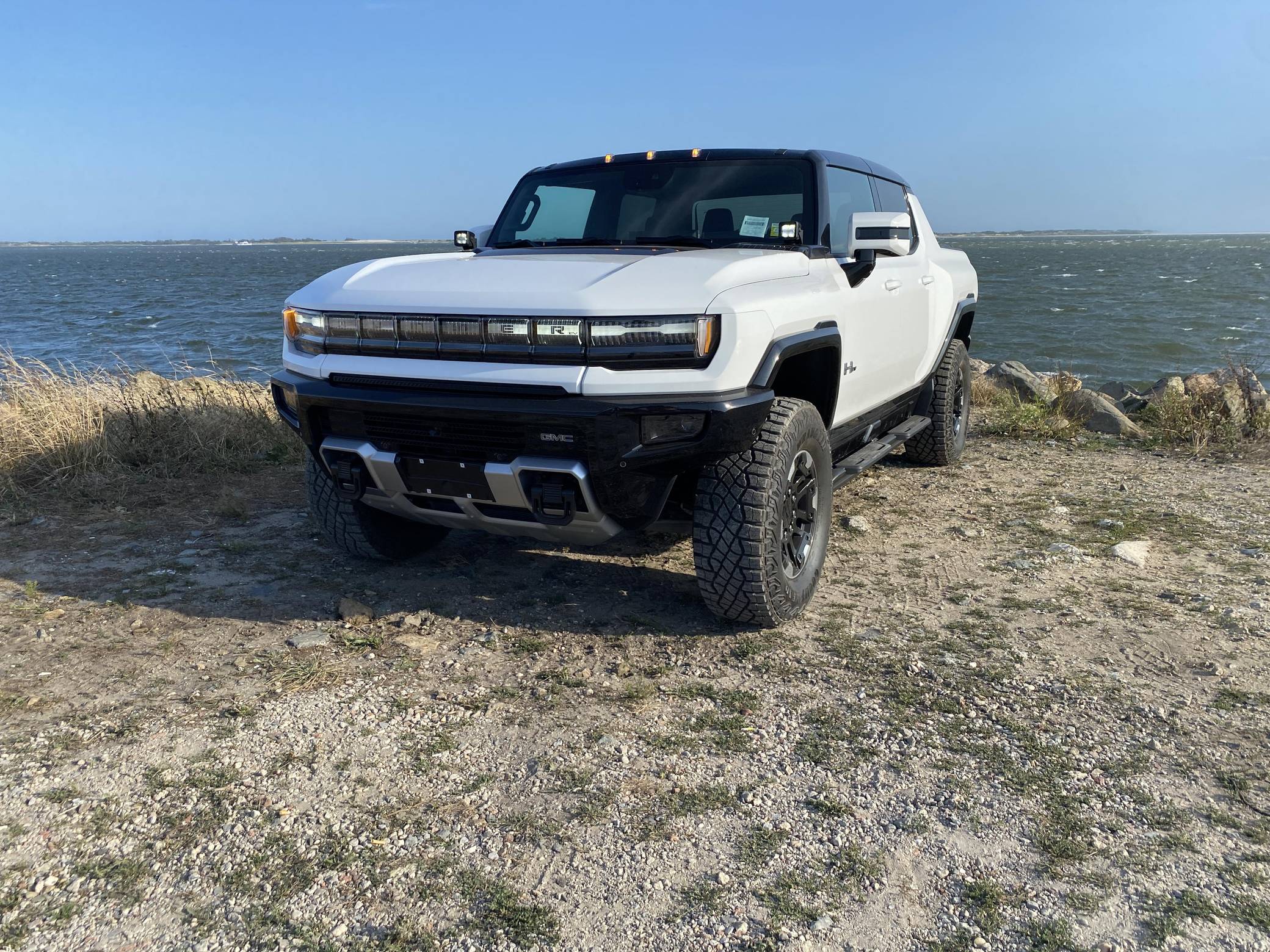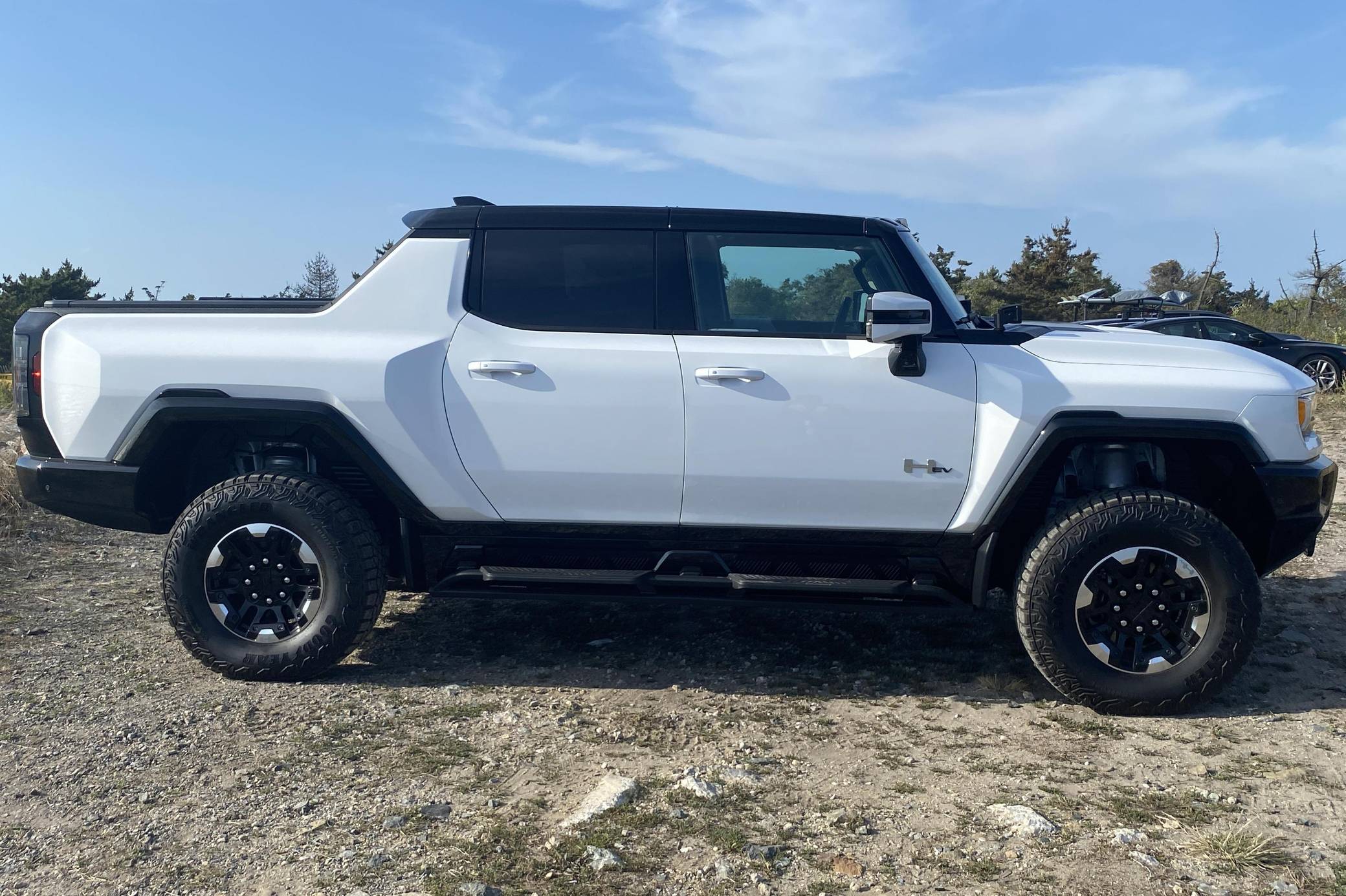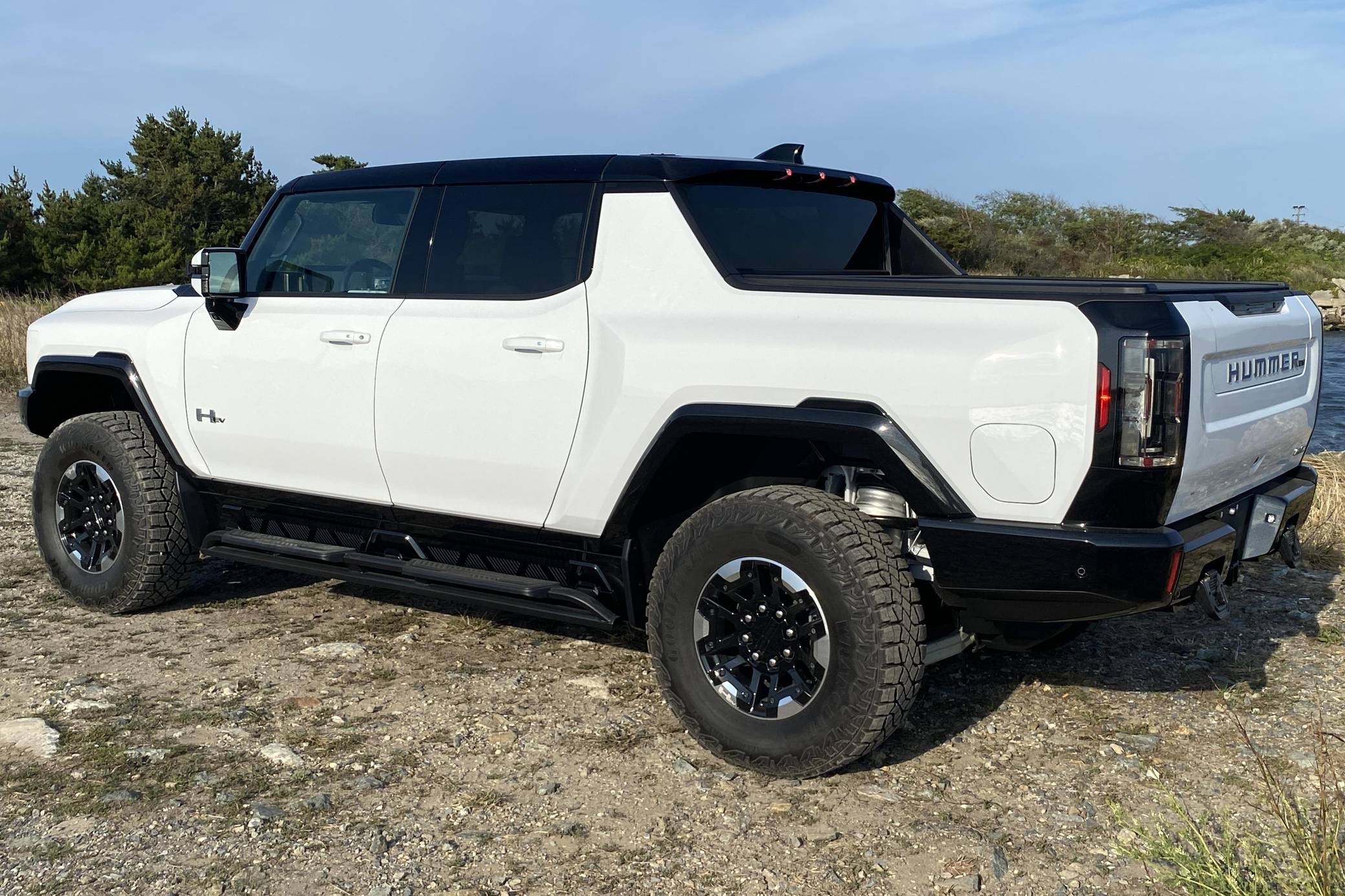 2022 GMC Hummer EV Pickup Edition 1, finished in Interstellar White with a Jet Black and Light Gray interior. It's equipped with the Illumination Package, 18-inch wheels, an Air Ride adaptive suspension system, a four-wheel steering system with a CrabWalk mode, a MultiPro tailgate with an integrated KICKER sound system, a power-retractable tonneau cover, and an Infinity Roof with transparent Sky Panels, among other features. The seller reports no modifications. General Motors unexpectedly resurrected the Hummer name on a massive electric truck assigned to the GMC brand. Built around the firm's Ultium technology, the Hummer EV stands out with a powerful electric drivetrain and several off-road-focused features, like a four-wheel-steering system with a CrabWalk mode capable of turning the four wheels in the same direction. Hummer EV production began in late 2021. Power comes from three electric motors, which draw electricity from a 212-kilowatt-hour lithium-ion battery pack to zap the four wheels with about 1,000 horsepower, according to GMC. The Hummer EV Pickup Edition 1 offers an EPA-estimated driving range of 329 miles.