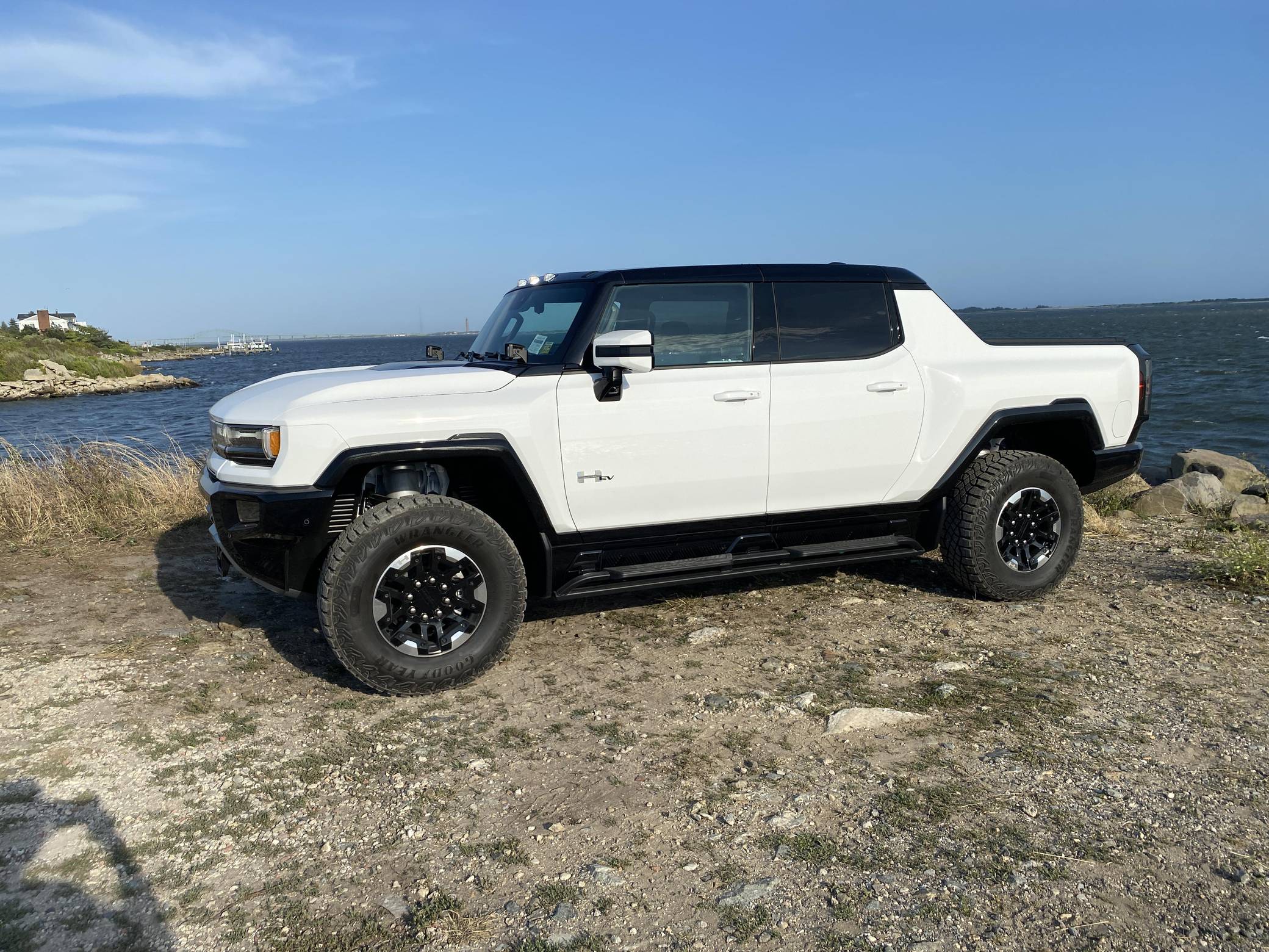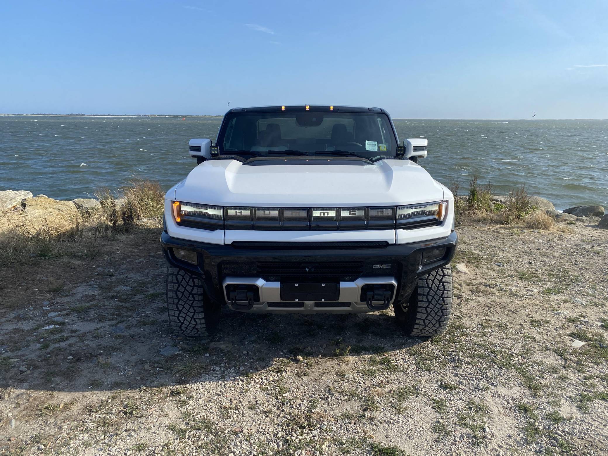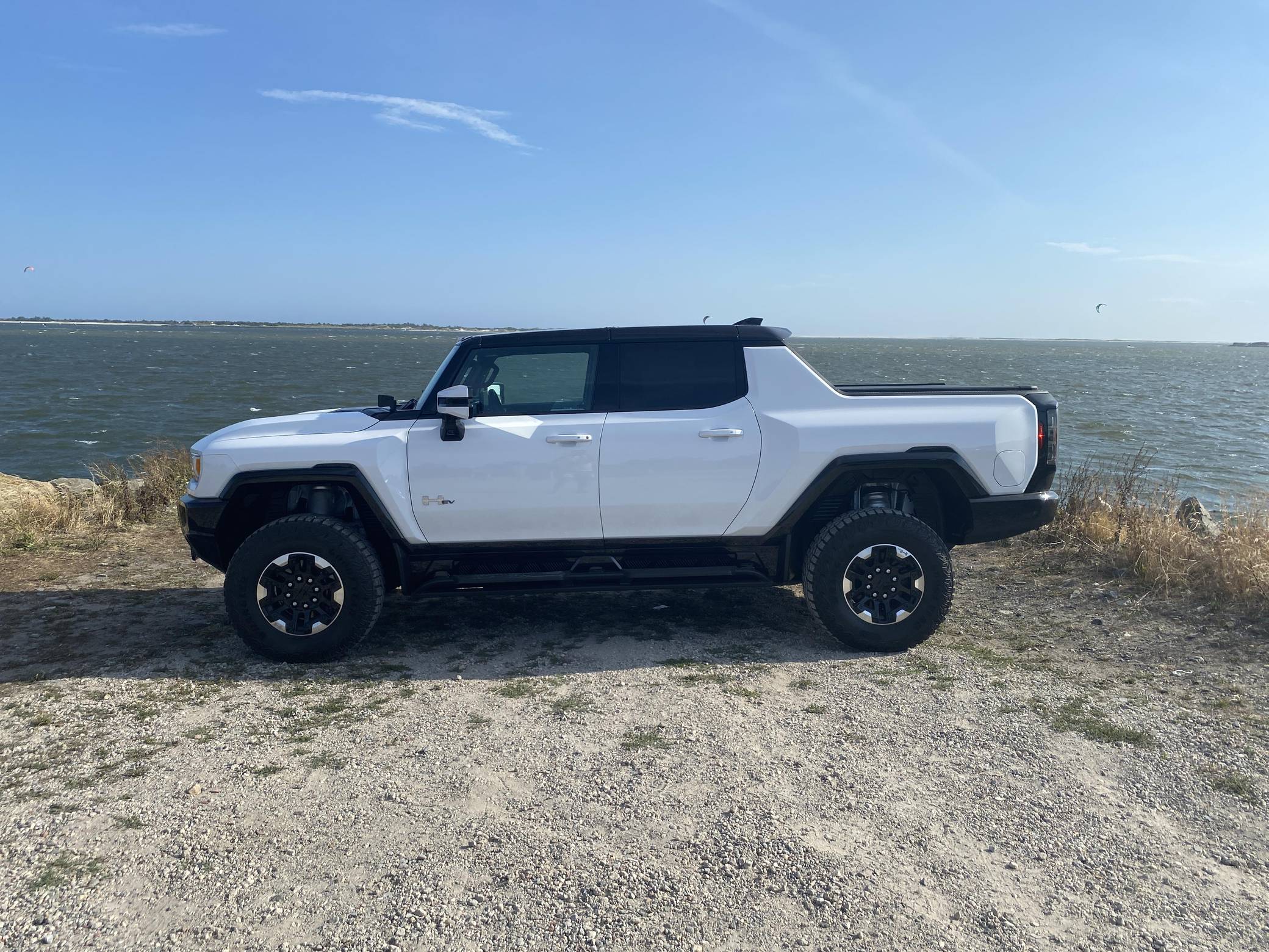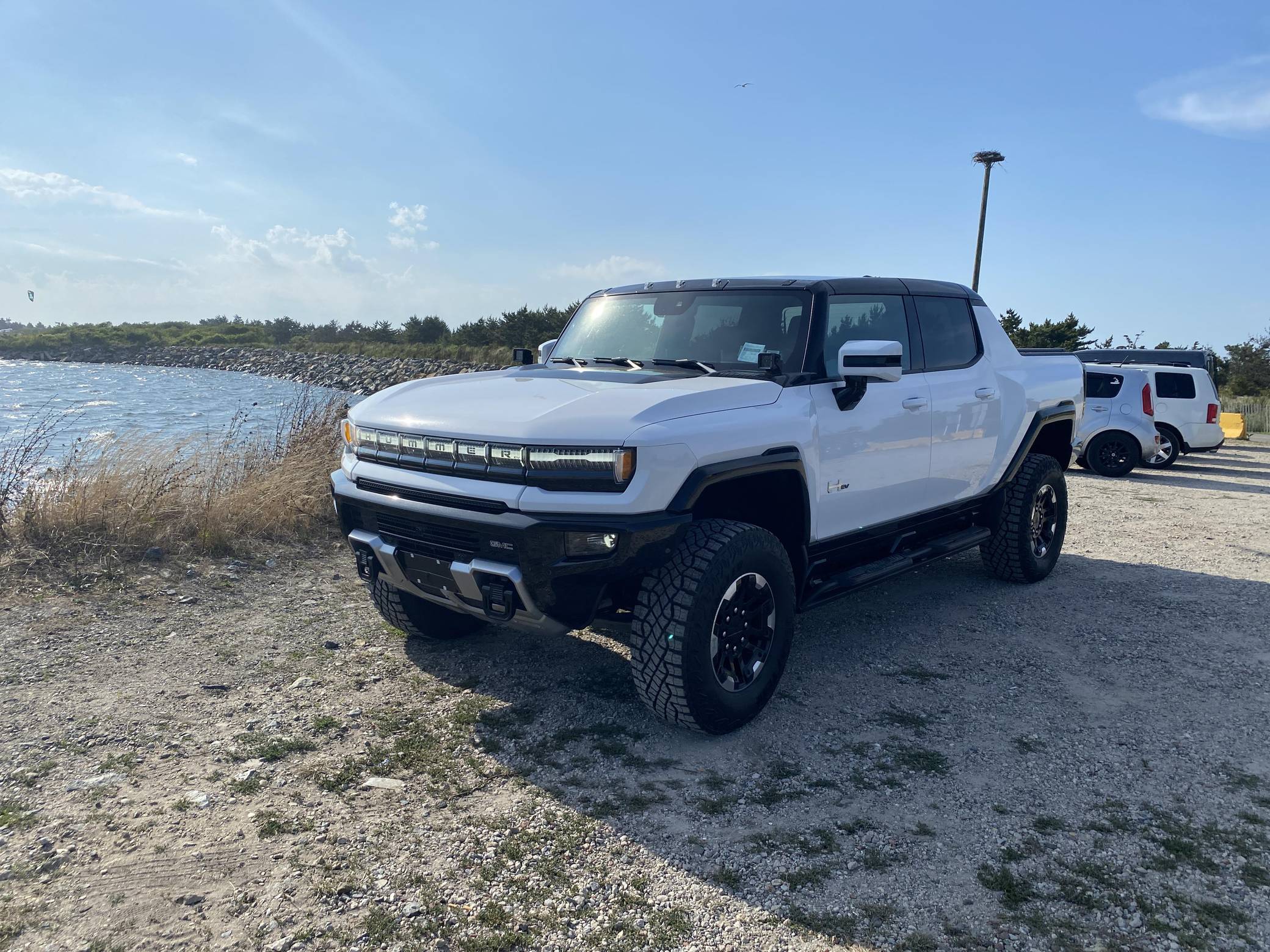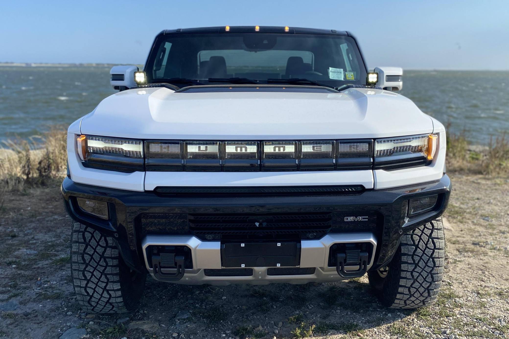 2022 GMC Hummer EV Pickup Edition 1, finished in Interstellar White with a Jet Black and Light Gray interior. It's equipped with the Illumination Package, 18-inch wheels, an Air Ride adaptive suspension system, a four-wheel steering system with a CrabWalk mode, a MultiPro tailgate with an integrated KICKER sound system, a power-retractable tonneau cover, and an Infinity Roof with transparent Sky Panels, among other features. The seller reports no modifications. General Motors unexpectedly resurrected the Hummer name on a massive electric truck assigned to the GMC brand. Built around the firm's Ultium technology, the Hummer EV stands out with a powerful electric drivetrain and several off-road-focused features, like a four-wheel-steering system with a CrabWalk mode capable of turning the four wheels in the same direction. Hummer EV production began in late 2021. Power comes from three electric motors, which draw electricity from a 212-kilowatt-hour lithium-ion battery pack to zap the four wheels with about 1,000 horsepower, according to GMC. The Hummer EV Pickup Edition 1 offers an EPA-estimated driving range of 329 miles.