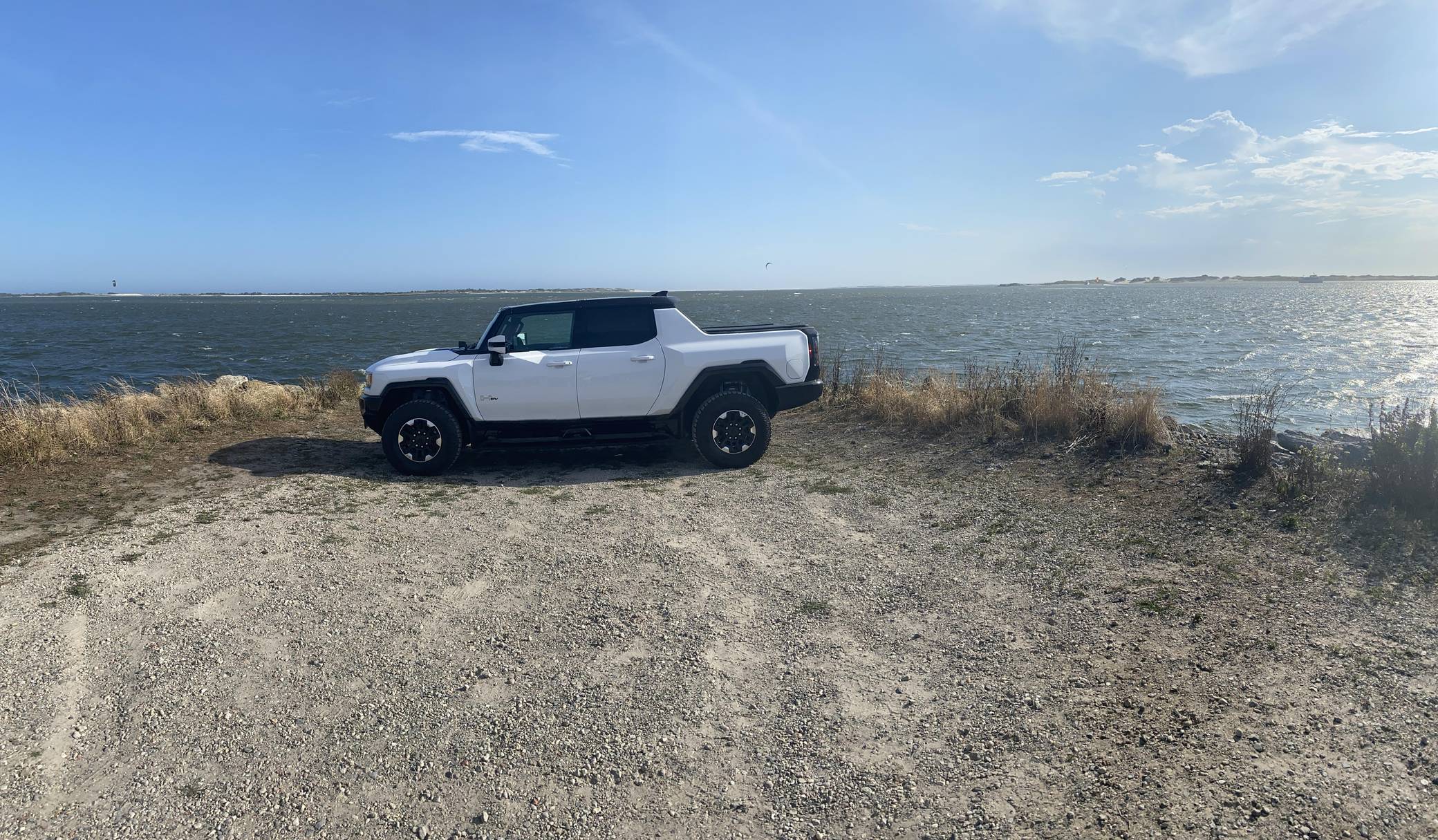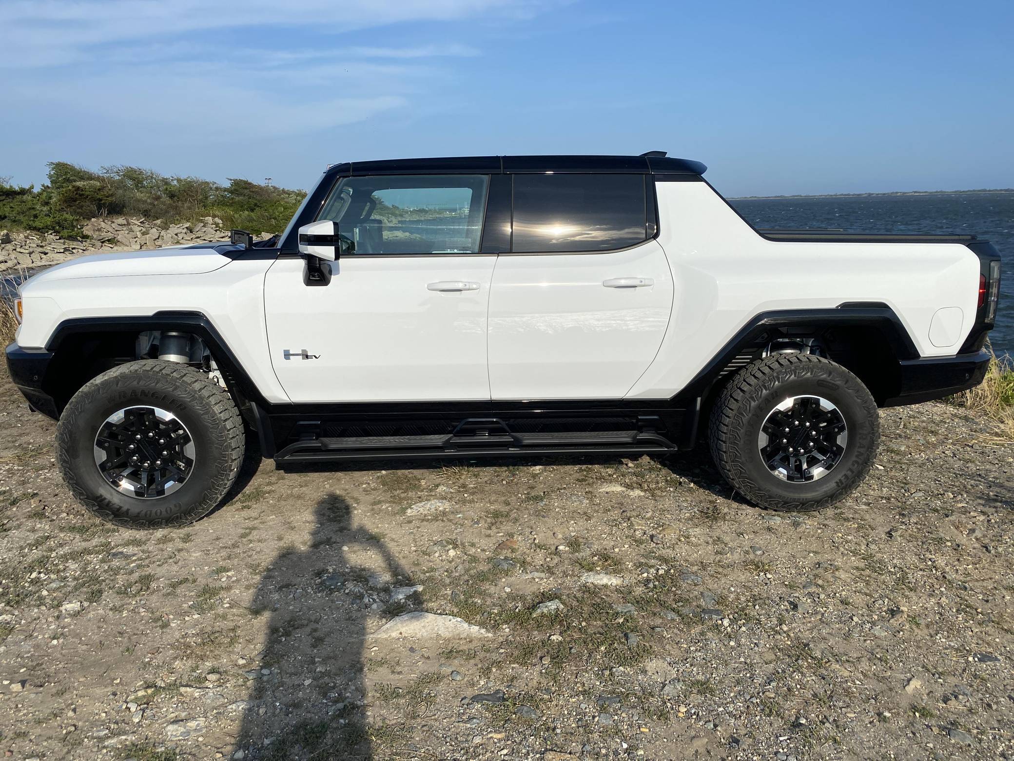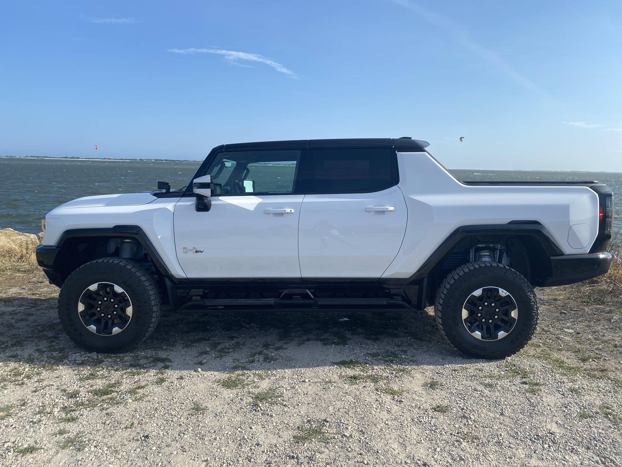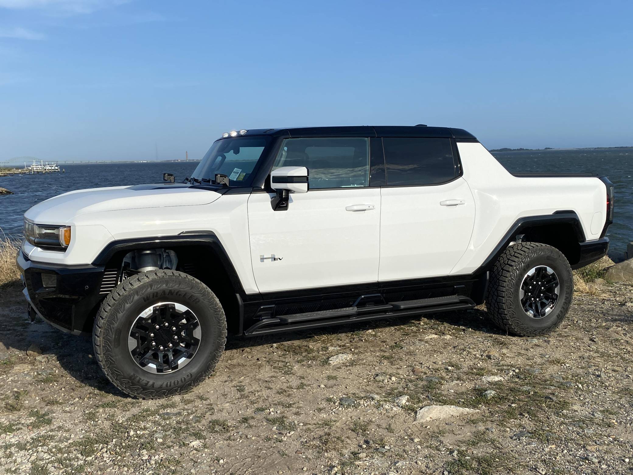 2022 GMC Hummer EV Pickup Edition 1, finished in Interstellar White with a Jet Black and Light Gray interior. It's equipped with the Illumination Package, 18-inch wheels, an Air Ride adaptive suspension system, a four-wheel steering system with a CrabWalk mode, a MultiPro tailgate with an integrated KICKER sound system, a power-retractable tonneau cover, and an Infinity Roof with transparent Sky Panels, among other features. The seller reports no modifications. General Motors unexpectedly resurrected the Hummer name on a massive electric truck assigned to the GMC brand. Built around the firm's Ultium technology, the Hummer EV stands out with a powerful electric drivetrain and several off-road-focused features, like a four-wheel-steering system with a CrabWalk mode capable of turning the four wheels in the same direction. Hummer EV production began in late 2021. Power comes from three electric motors, which draw electricity from a 212-kilowatt-hour lithium-ion battery pack to zap the four wheels with about 1,000 horsepower, according to GMC. The Hummer EV Pickup Edition 1 offers an EPA-estimated driving range of 329 miles.