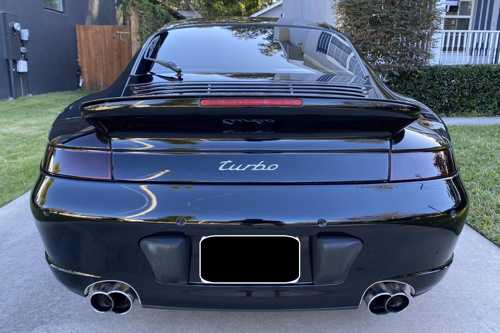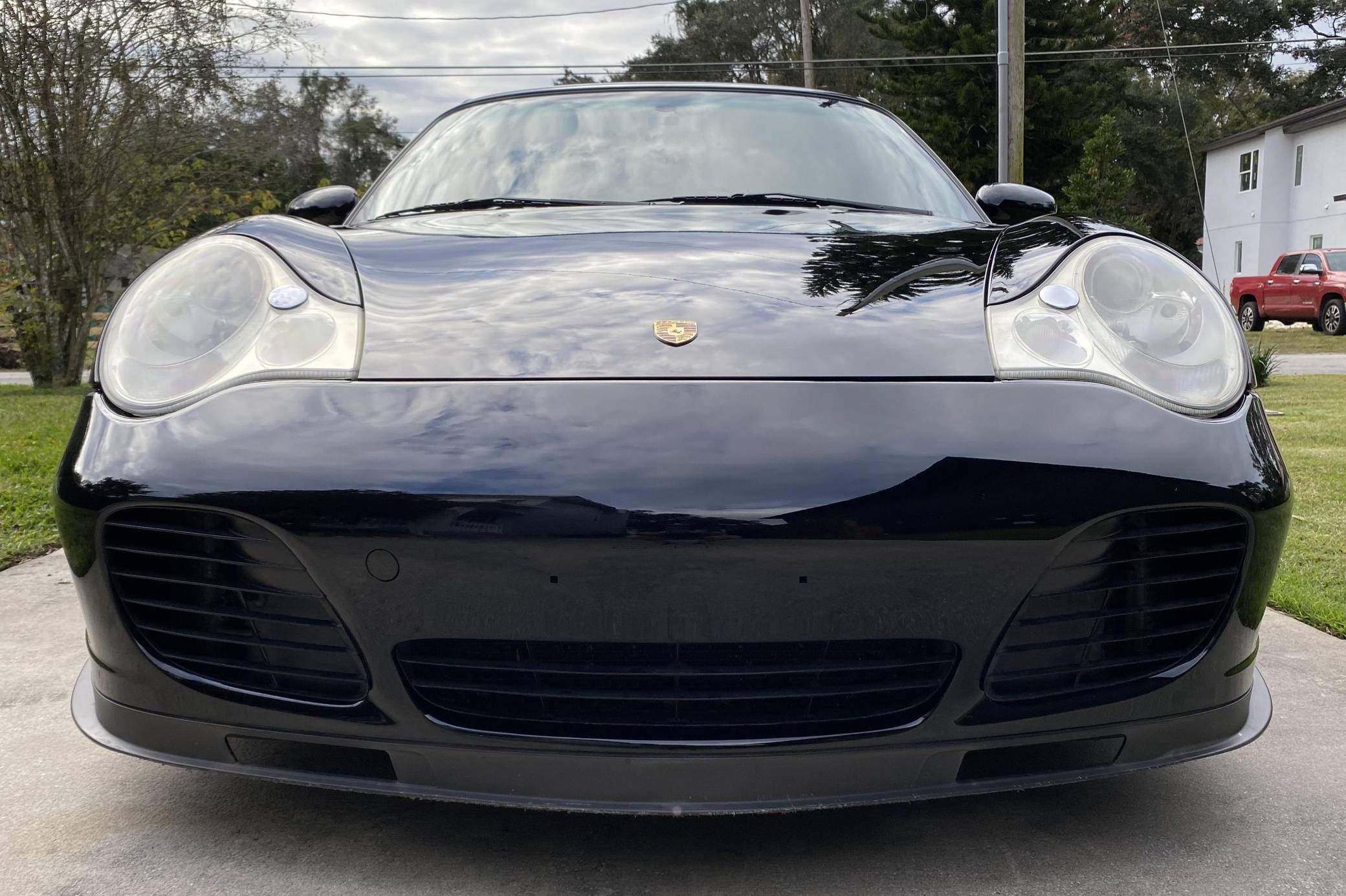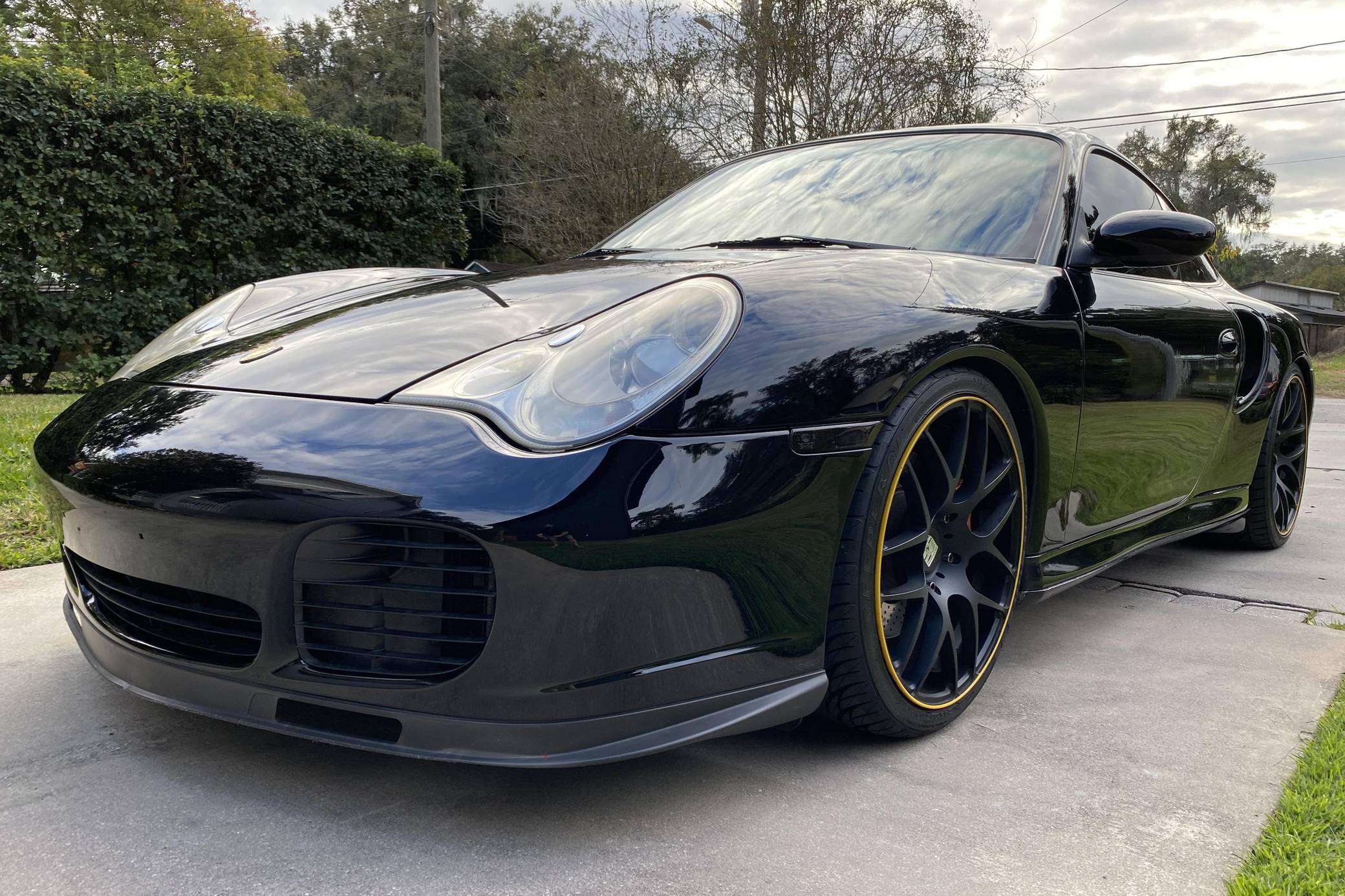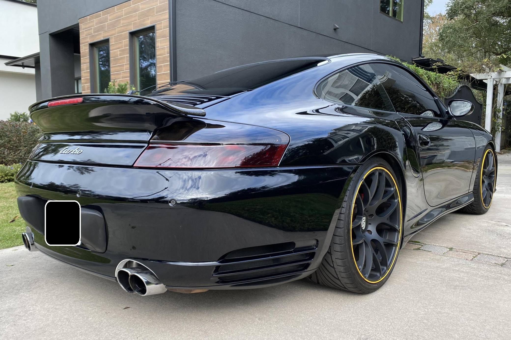 2003 Porsche 911 Turbo Coupe, finished in Black with a black interior. Factory equipment includes the aforementioned X50 Power Kit, a sunroof, a rear window wiper, a full leather interior, the Carbon Interior Package, and a Bose sound system, according to a build sheet pictured in the gallery. Modifications reported by the seller include aftermarket 19-inch wheels, H&R springs, a carbon fiber fixed rear wing, a custom Alcantara-wrapped steering wheel, and a 997 transmission mount. The fifth-generation 911 was introduced for the 1999 model year, with the long-awaited Turbo variant landing in America for 2001. The "996" was the first 911 to be completely redesigned from its predecessors. While its water-cooled engine and distinctive headlights irked some Porsche purists, the 996 is appreciated by enthusiasts for providing an analog driving experience in a smaller, lighter package than the 911s that followed it. Power comes from a turbocharged 3. 6-liter flat-6 "Mezger" engine, rated at 444 horsepower and 457 lb-ft of torque. Output is sent to all 4 wheels via a 5-speed automatic transmission.