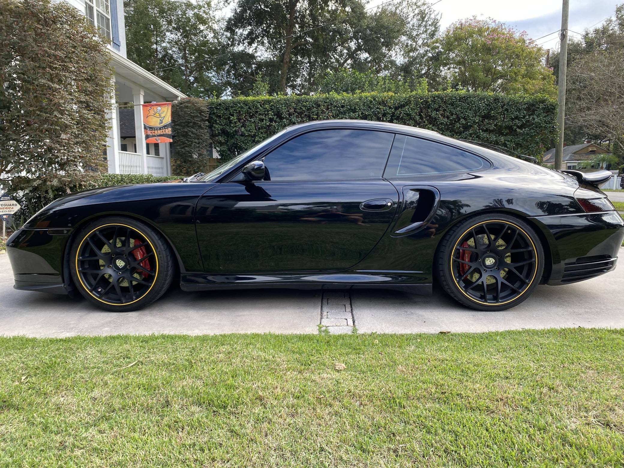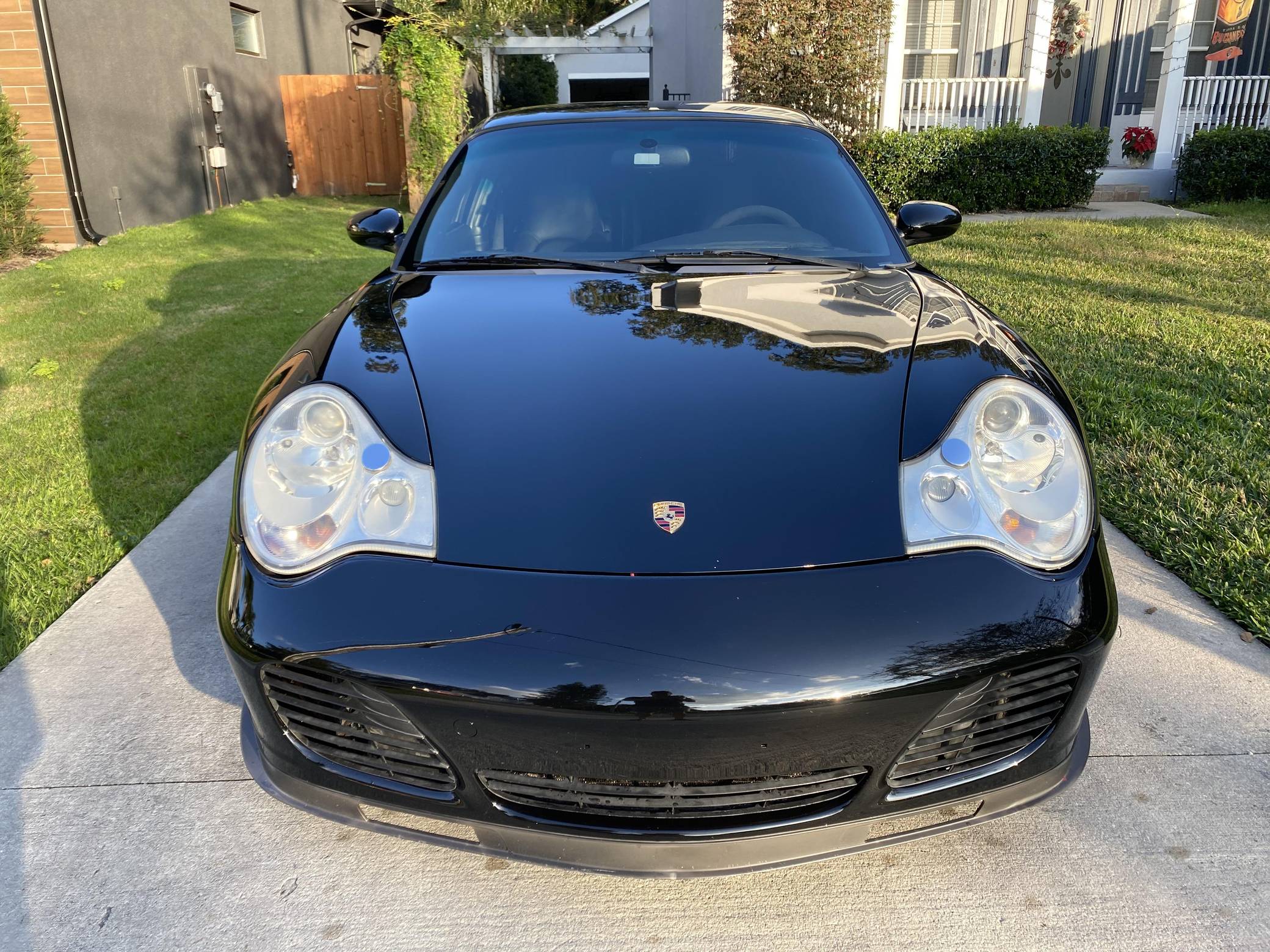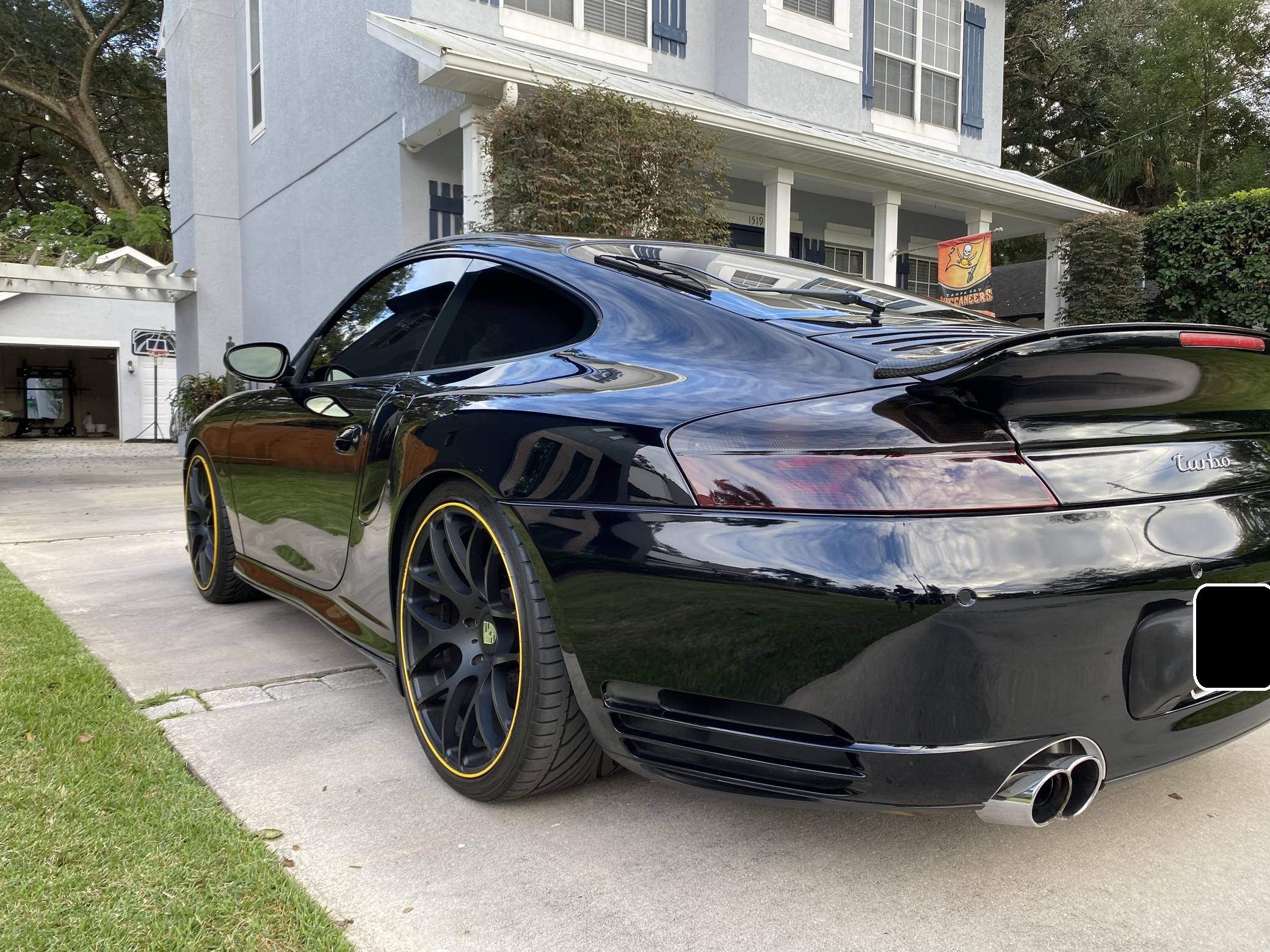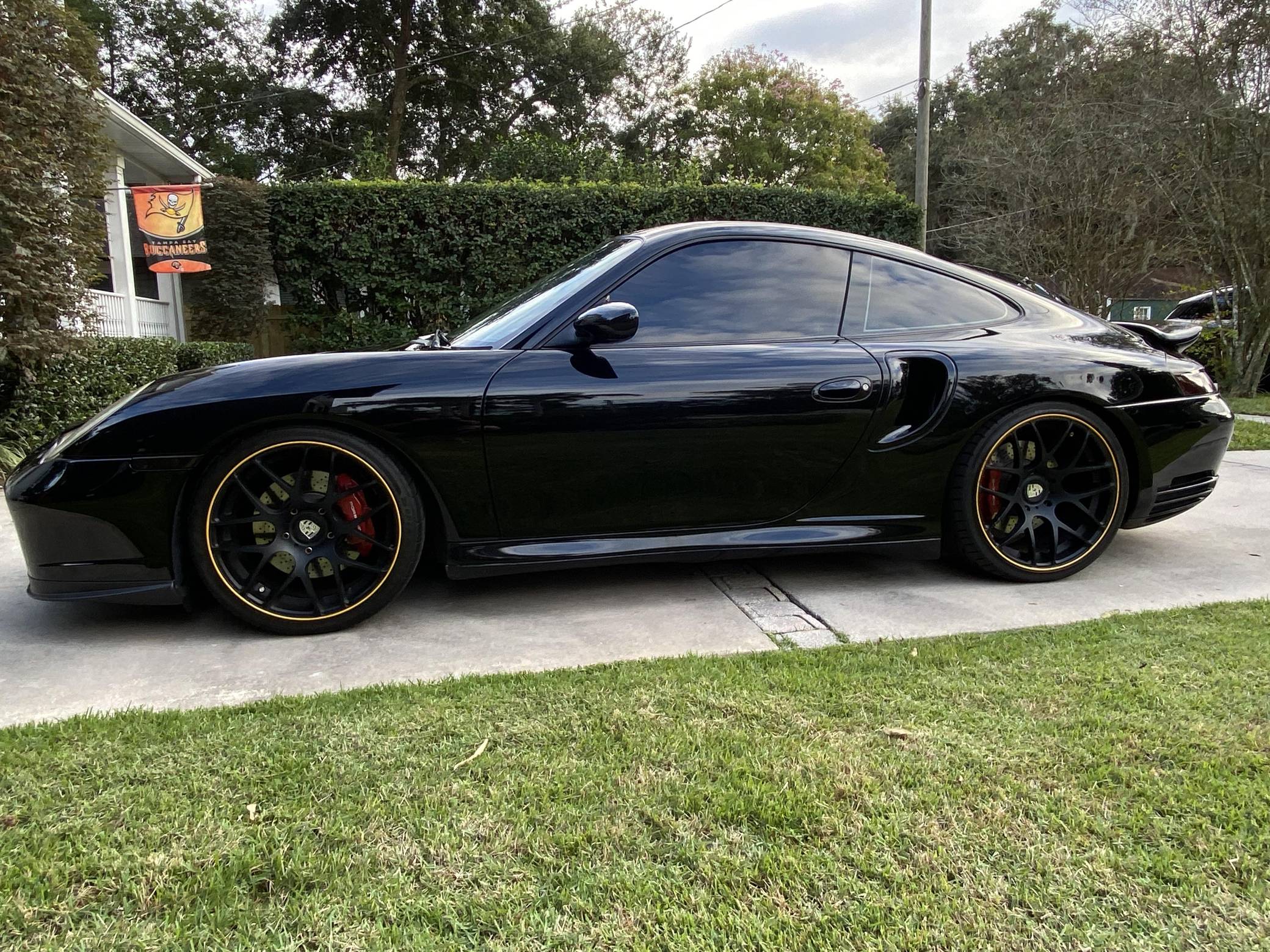 2003 Porsche 911 Turbo Coupe, finished in Black with a black interior. Factory equipment includes the aforementioned X50 Power Kit, a sunroof, a rear window wiper, a full leather interior, the Carbon Interior Package, and a Bose sound system, according to a build sheet pictured in the gallery. Modifications reported by the seller include aftermarket 19-inch wheels, H&R springs, a carbon fiber fixed rear wing, a custom Alcantara-wrapped steering wheel, and a 997 transmission mount. The fifth-generation 911 was introduced for the 1999 model year, with the long-awaited Turbo variant landing in America for 2001. The "996" was the first 911 to be completely redesigned from its predecessors. While its water-cooled engine and distinctive headlights irked some Porsche purists, the 996 is appreciated by enthusiasts for providing an analog driving experience in a smaller, lighter package than the 911s that followed it. Power comes from a turbocharged 3. 6-liter flat-6 "Mezger" engine, rated at 444 horsepower and 457 lb-ft of torque. Output is sent to all 4 wheels via a 5-speed automatic transmission.