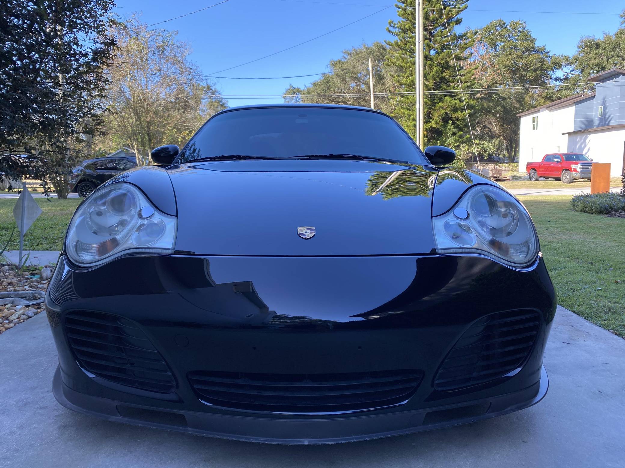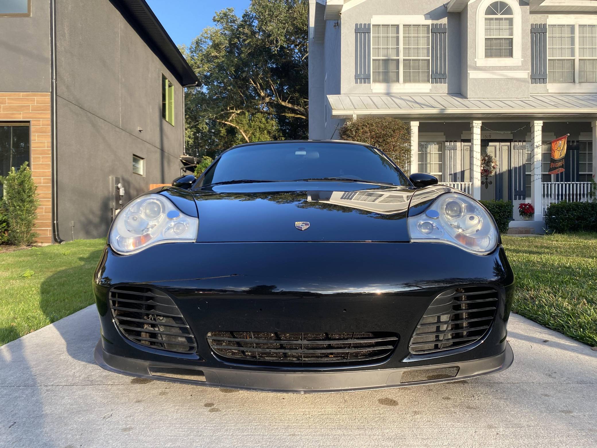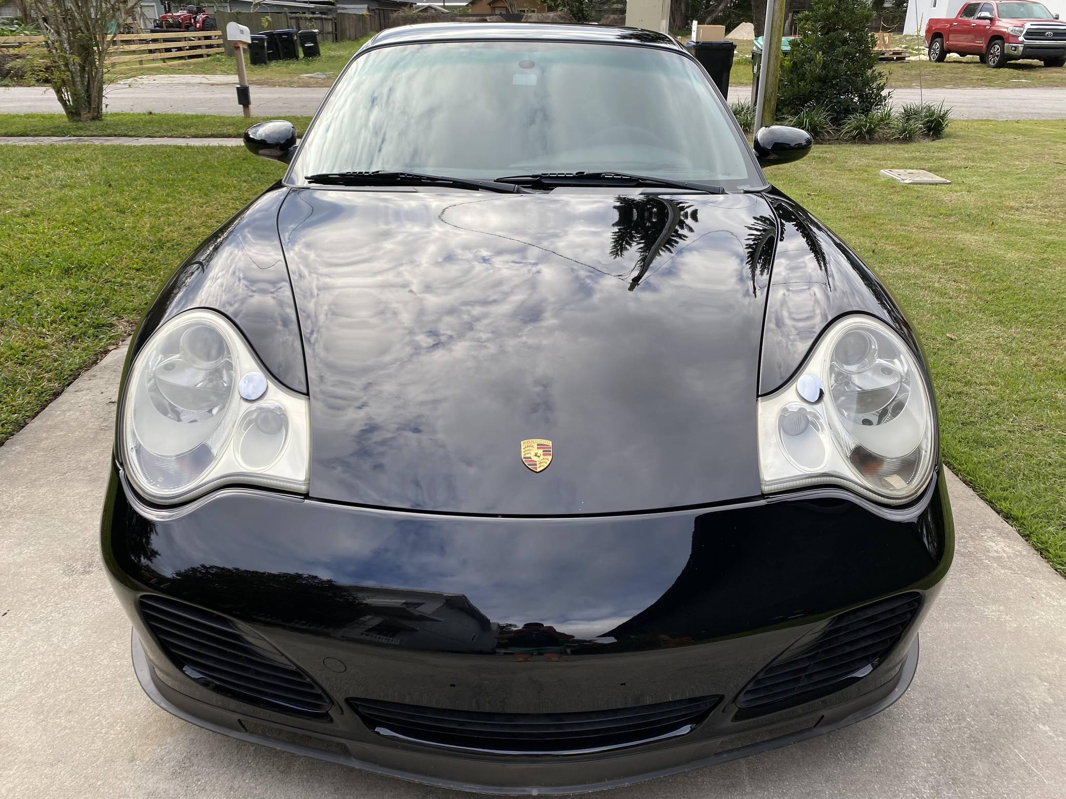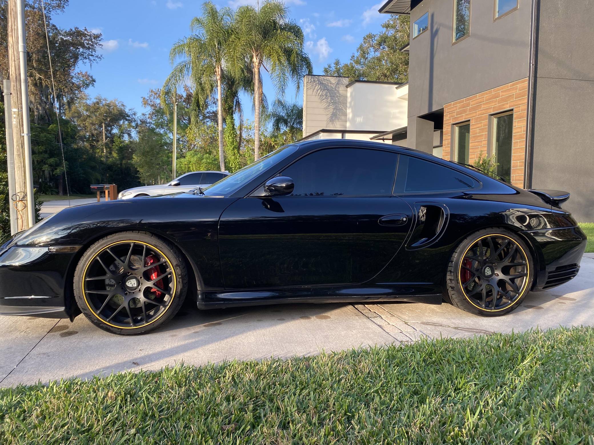 2003 Porsche 911 Turbo Coupe, finished in Black with a black interior. Factory equipment includes the aforementioned X50 Power Kit, a sunroof, a rear window wiper, a full leather interior, the Carbon Interior Package, and a Bose sound system, according to a build sheet pictured in the gallery. Modifications reported by the seller include aftermarket 19-inch wheels, H&R springs, a carbon fiber fixed rear wing, a custom Alcantara-wrapped steering wheel, and a 997 transmission mount. The fifth-generation 911 was introduced for the 1999 model year, with the long-awaited Turbo variant landing in America for 2001. The "996" was the first 911 to be completely redesigned from its predecessors. While its water-cooled engine and distinctive headlights irked some Porsche purists, the 996 is appreciated by enthusiasts for providing an analog driving experience in a smaller, lighter package than the 911s that followed it. Power comes from a turbocharged 3. 6-liter flat-6 "Mezger" engine, rated at 444 horsepower and 457 lb-ft of torque. Output is sent to all 4 wheels via a 5-speed automatic transmission.