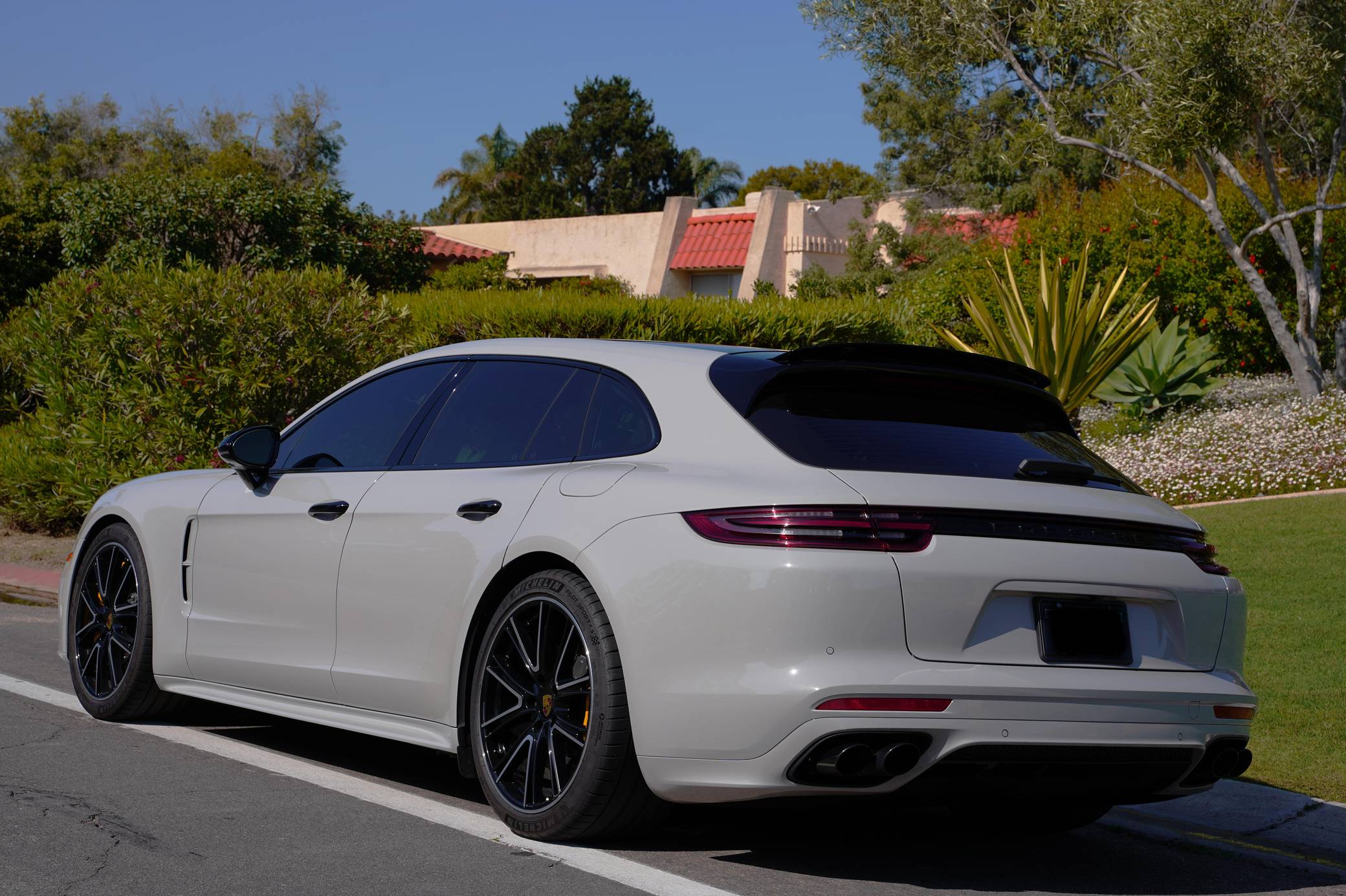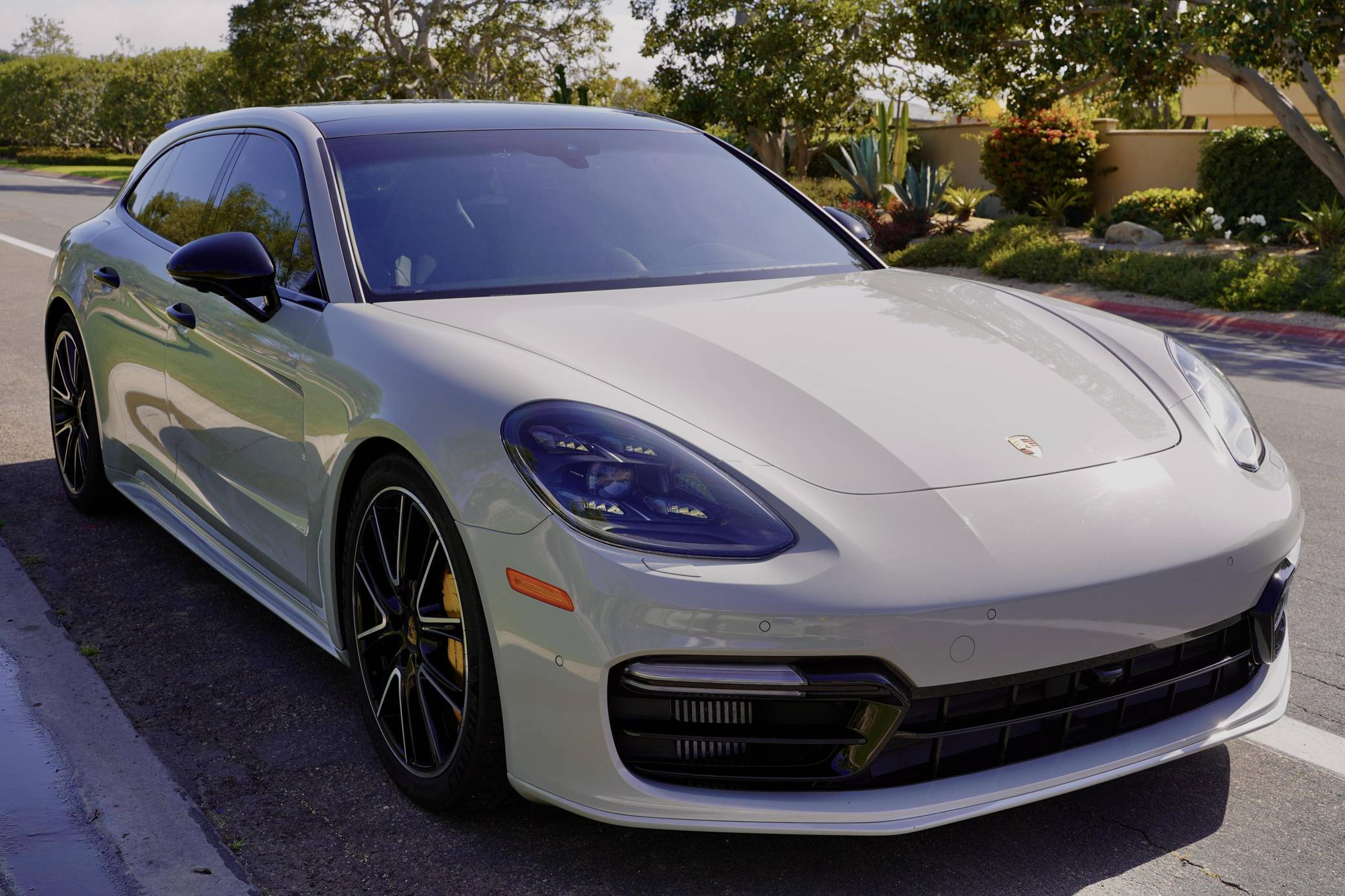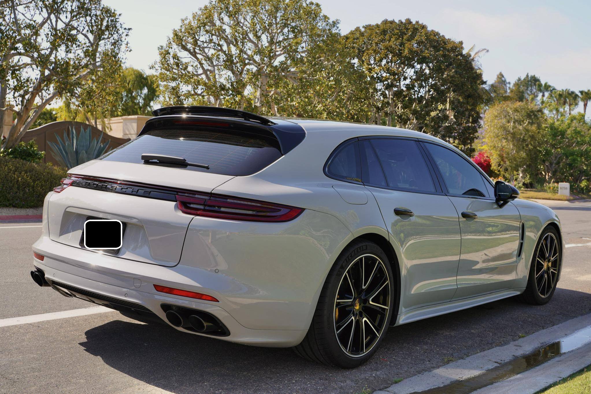 2018 Porsche Panamera Turbo S E-Hybrid Sport Turismo, finished in Chalk with a black and Chalk interior. Factory equipment includes the SportDesign Package painted in high gloss black, Carbon Fiber Interior Package, Premium Package Plus, and the Interior Lighting Package for rear compartment, 21-inch Exclusive Design wheels in High Gloss Black, Porsche Ceramic Composite Brakes (PCCB), a sport exhaust system with tailpipes in black, door handles in black, power-adjustable front and rear seats, heated and ventilated front and rear seats, heated steering wheel, carbon fiber- and leather-wrapped steering wheel, 4-zone climate control, and the Burmester 3D High-End surround sound system. The sole modification reported by the seller is Huper Optik ceramic window tint. Porsche's second-generation Panamera arrived for 2017 with a much sleeker-looking design, and it spawned the Sport Turismo (the firm's first series-produced station wagon) in 2018, but the updates weren't strictly visual. It was built on a new, aluminum-intensive architecture and it inaugurated a range of 6- and 8-cylinder engines. Porsche still builds the second-generation Panamera (called "971" internally) in 2022. Power comes from a twin-turbocharged 4. 0-liter V8 and an electric motor, carrying a combined rating of 680 horsepower and 626 lb-ft of torque. It spins the four wheels via an 8-speed PDK automatic transmission.