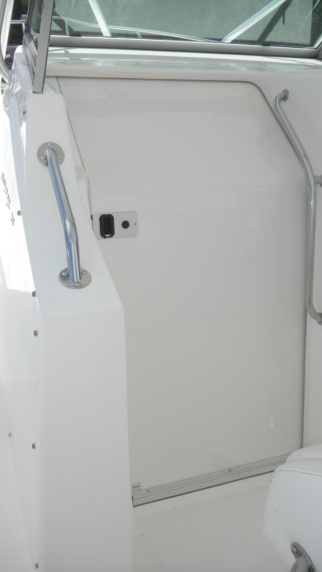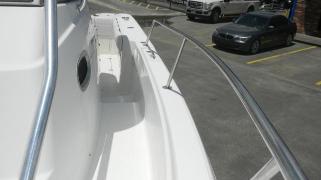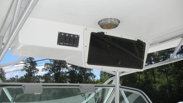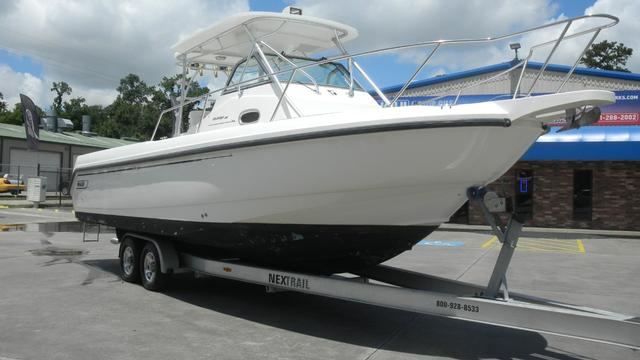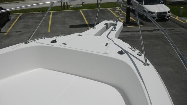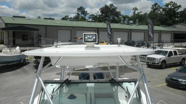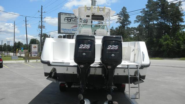 Head with Shower, Large Cockpit, Galley, Microwave, Refrigerator, Sink, Full T-Top, Stainless Steel Swim Ladder, Lots of Storage, In-Deck Storage Compartments, Center Console Storage, Dry Storage Compartments, Fish Box, Livewell, Swim Platforms on Engine Bracket, Rod Holders, Rod Storage, Freshwater Washdown, Saltwater Washdown, Courtesy Lights, Cockpit Lights, Search Light, Stainless Steel Hardware & Thru Hulls Fitting, Windshield, Reinforced Bow Eye, Heavy Duty Rubrail, Rocket Launchers, Trim Tabs, Dual Outboard Engines, Fuel Filters on Engines, Hydraulic Trim Tabs, Bilge Pump(s), Anchor w/Electric Windlass, Engine Monitoring System, Trailer, 12V Power Outlet, Dual Battery, Battery Switch(es), Shore Power, AM/FM/CD.
