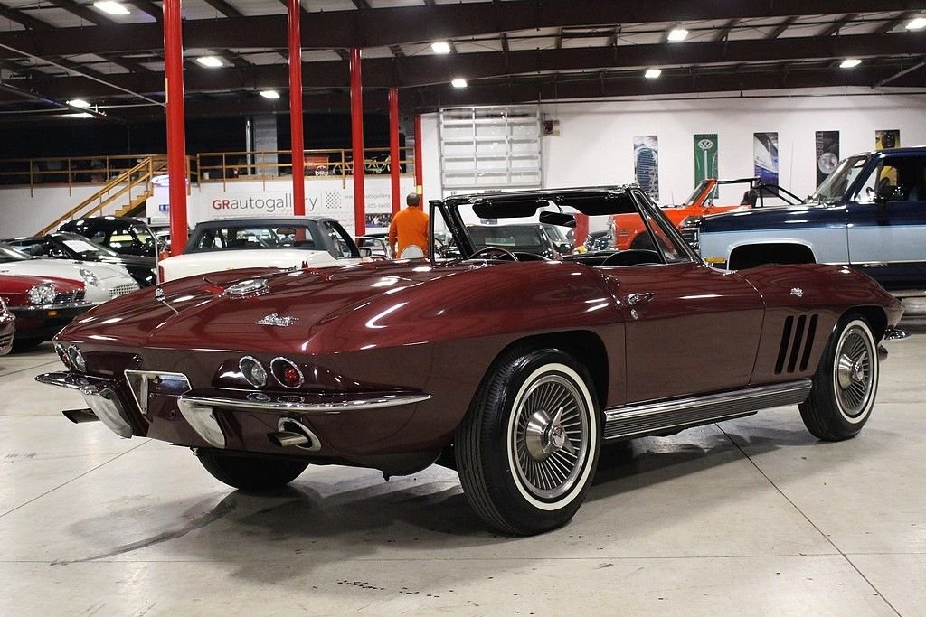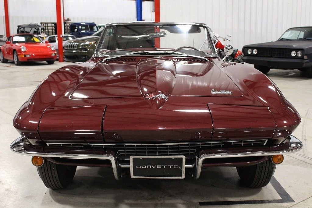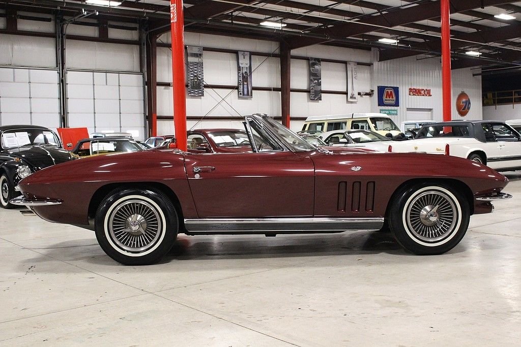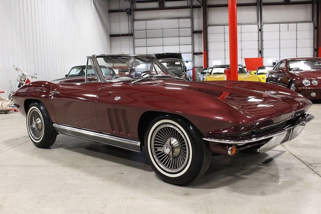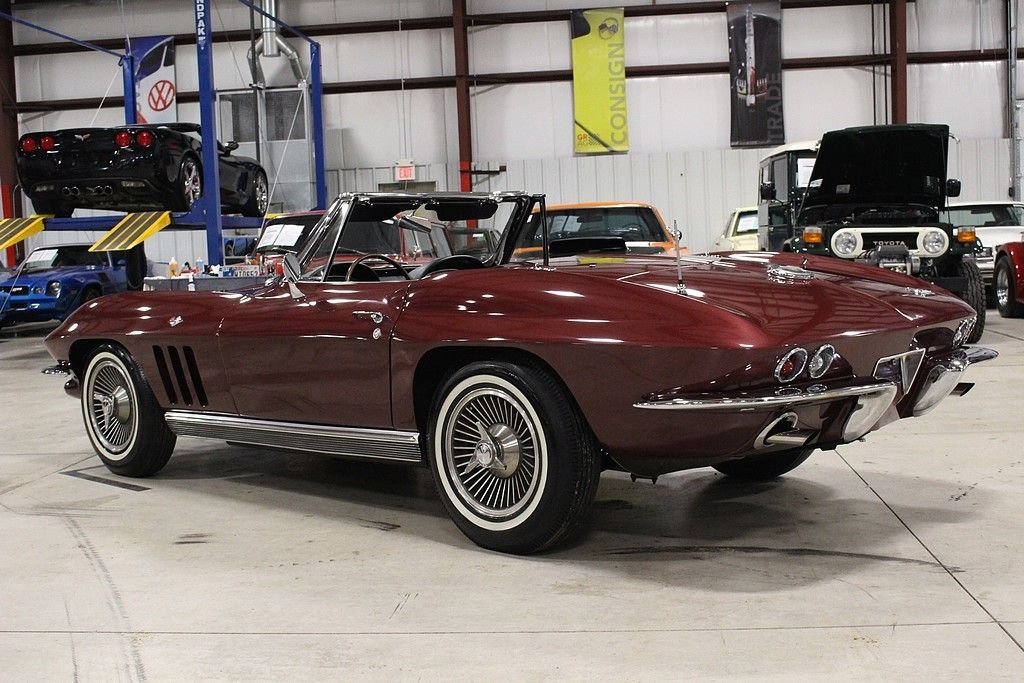 The car features an older restoration performed in 2001-2002 and has remained with the current owner since 2005. The car is finished in Milano Maroon, over black vinyl interior and white Convertible top. According to the owner, the car features is numbers matching 327 / 350 hp engine. Other highlights include Holly 4 barrel carb, 4-speed manual transmission, its factory original color, Highly original black vinyl interior, knock off wheels, white stipe tires, power antenna, am/fm radio, complete ignition shielding, clock, teak steering wheel, 160 mph speedometer, 7000 rpm tachometer, rear exhaust etc. The car originates from the desert southwest and has an excellent frame and underside, the paint still shows a little age, but still stands tall and the retains some originality and shows just the right amount of patina. Under the hood remains very tidy and with attention to detail. Mechanically, the car runs out and drives great and will offer much open air motoring excitement to the next owner. Mid year Corvettes still remain a blue chip investment in the automotive world with years 65 though 1967 holding the most value. What a great opportunity offered here at a great price.