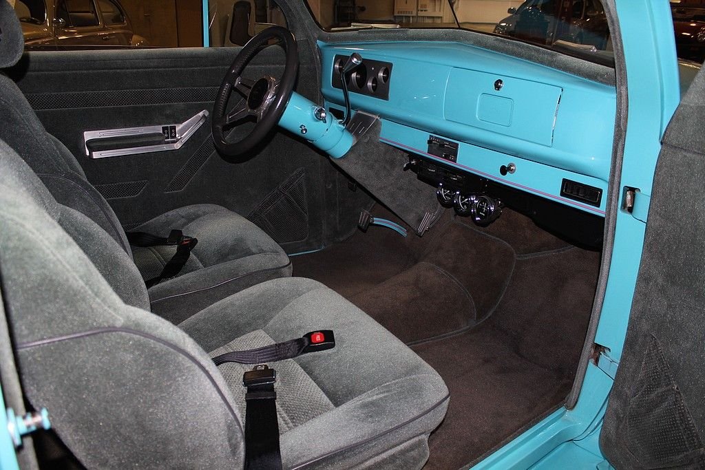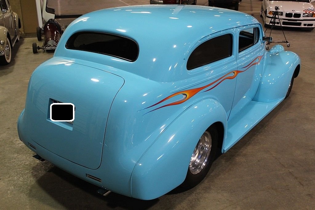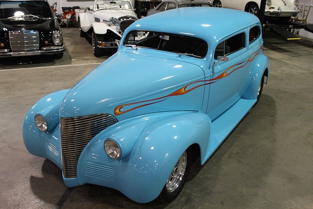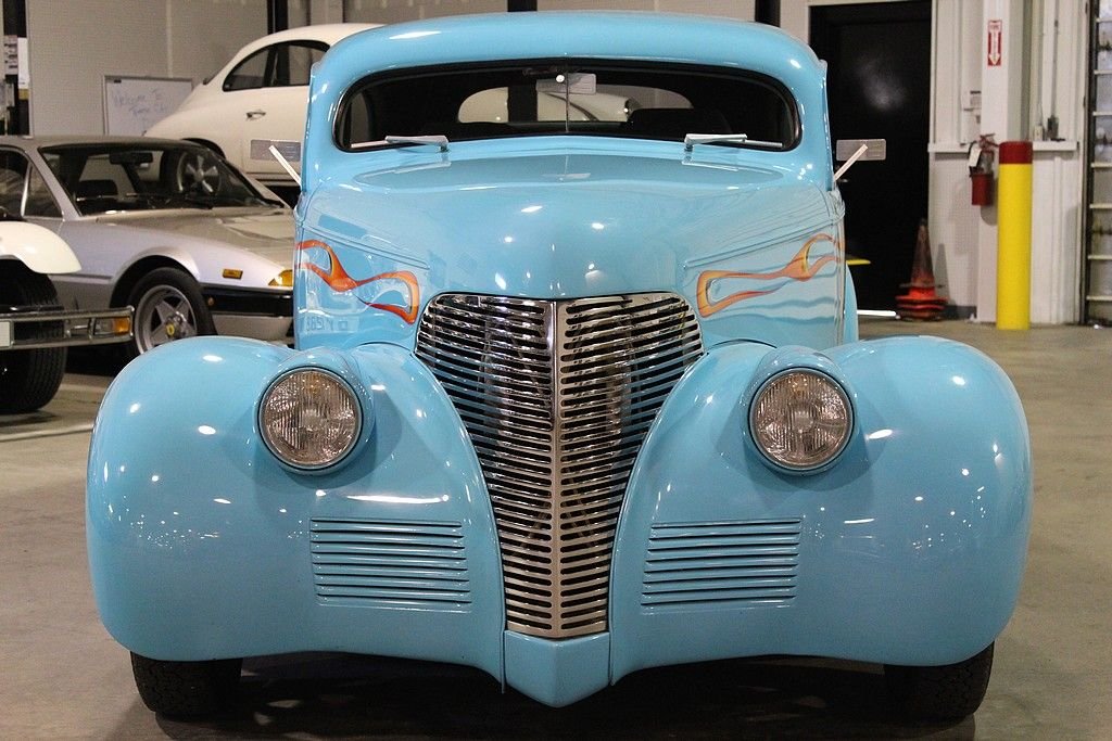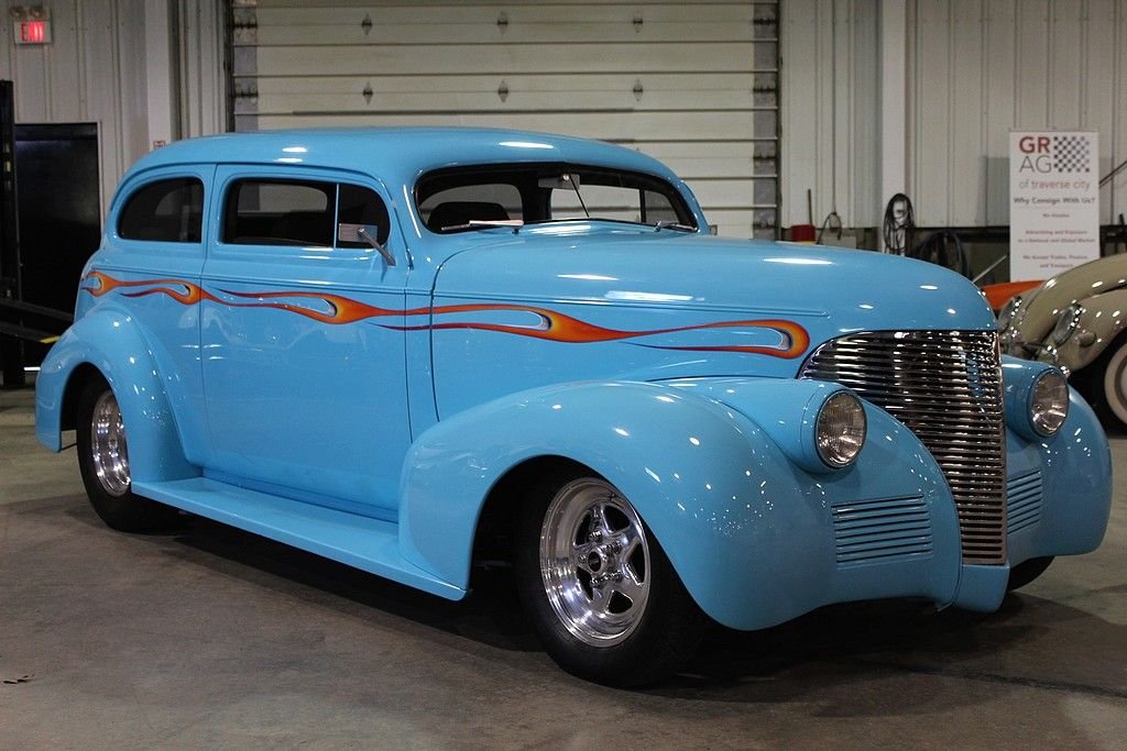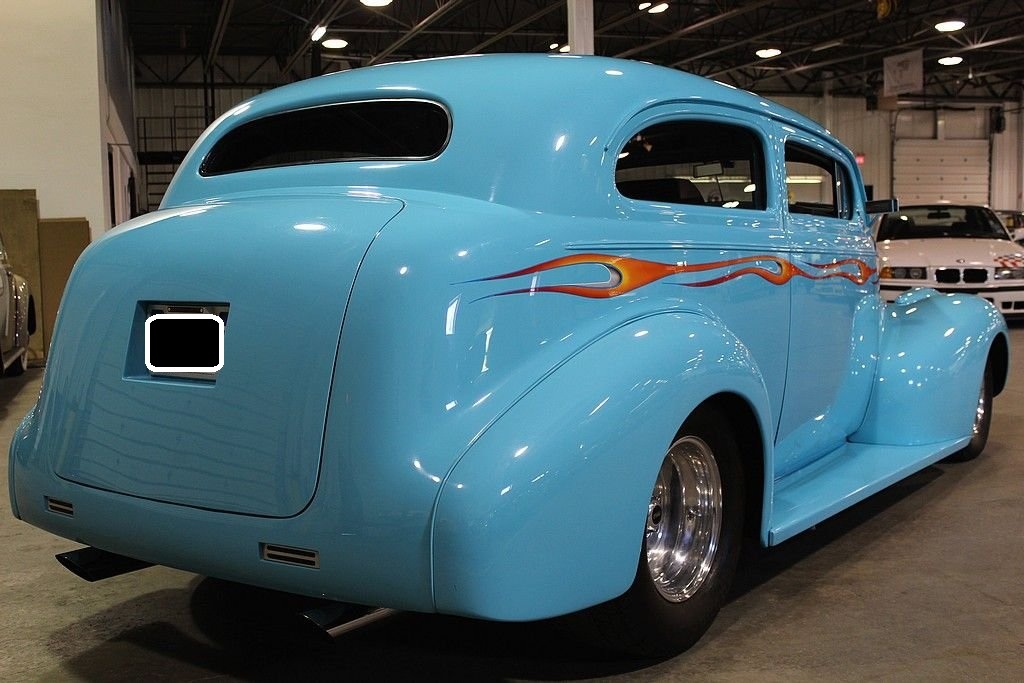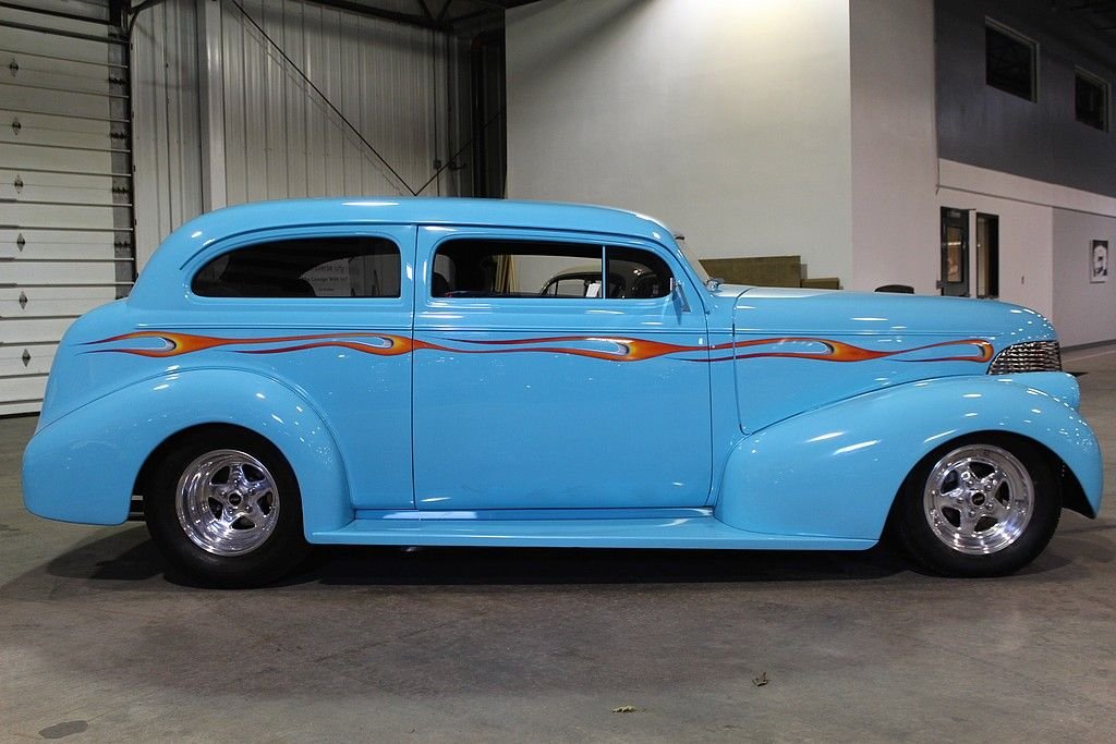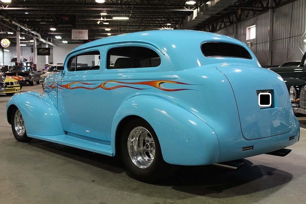 By 1939 Chevrolet was well established in the automotive world and working on a many varieties of styling and engine options for the consumers around the world. However, in the late 30's the big three was really emphasizing the wagon style of bodies and even though this car is a 2 dr. sedan it resembles that of a wagon as did the 4 door sedan. In fact the first year for the suburban carryall, which was a passenger truck-based utility wagon was introduced in 1936. A lot of the styling cues from the late 30's lasted until just after WWII ended due to the lack of production from 1942 through 1947. However, this is no ordinary 1939 Chevrolet 2 dr. sedan. In fact this car has been down to the frame and completely modified including an altered frame to make room for the tubbed rear end to fit the rear tires mated to a set of Weld Pro-Star aluminum wheels. The entire body of the car is steel except for the fiberglass hood, which is connected to a hydraulic lift powered by an electric motor. The top of the car has been chopped 4” in the front and 3” in the back meaning all glass had to be custom cut and fit. Top quality turquoise PPG clear coat paint was used during the restoration and it shows extremely well. Adding to the paint is the custom air-brush painted flame that is very detailed. To finish the exterior off is the shaved door handles and electric doors operated by remote. The interior is very roomy with a custom interior down to the door panels and headliner offering electric windows, an overhead console with stereo and cd player. An electronic gauge cluster and tilt wheel top finish this interior off nicely. The engine is where this gets really exciting. Definitely nothing you would find in 1939. This is powered by a Chevrolet 454 Cubic inch engine delivering over 400 HP connected to a Turbo 400 automatic transmission making this a true joy to not only sound bad but also drive down the road. This car has a Mustang II front end with front disc brakes. The rear end is a 10 bolt with posi-traction. It is connected to a 4-link rear suspension and coil over adjustable shocks. You would not even come close to being able to build such an incredible hot rod for the money we are asking here today. This car can be immediately enjoyed and shown.
