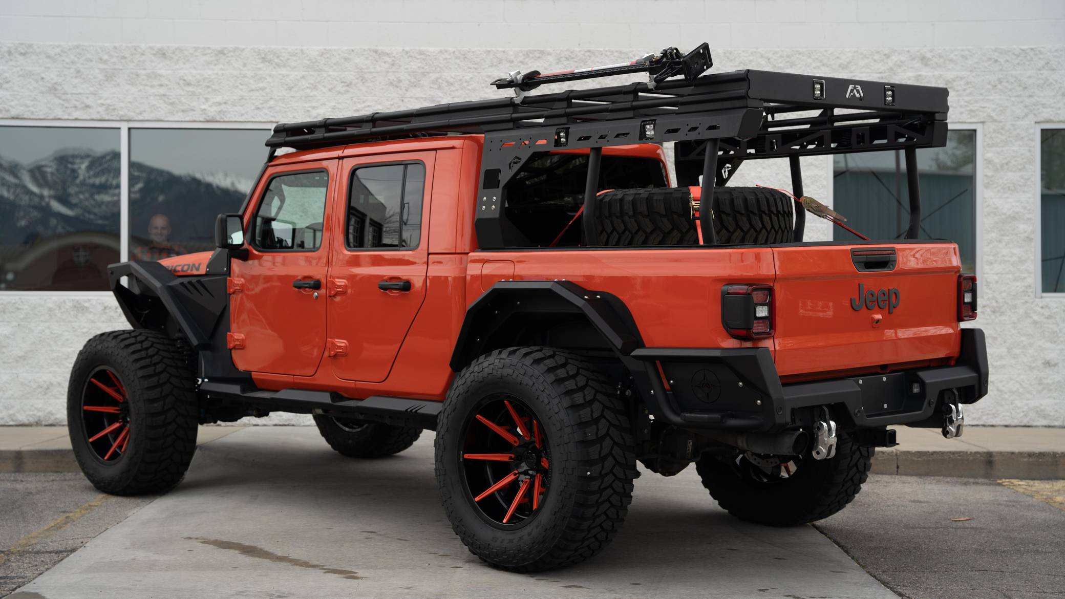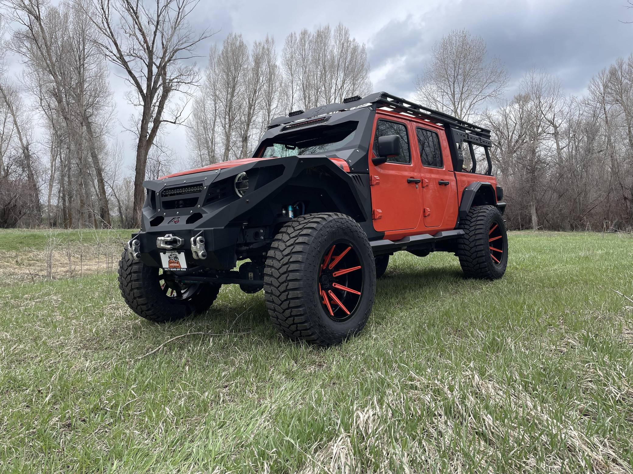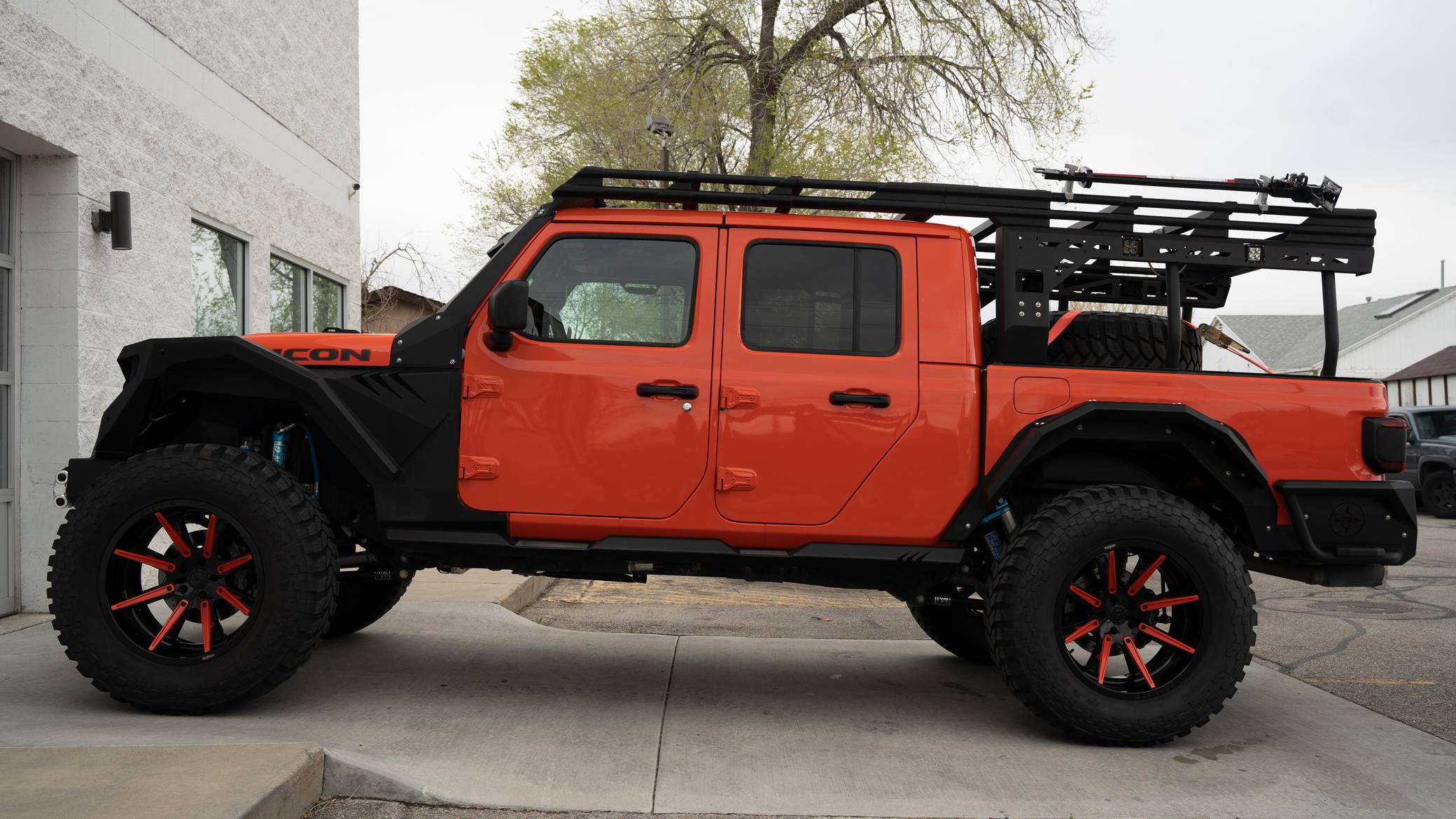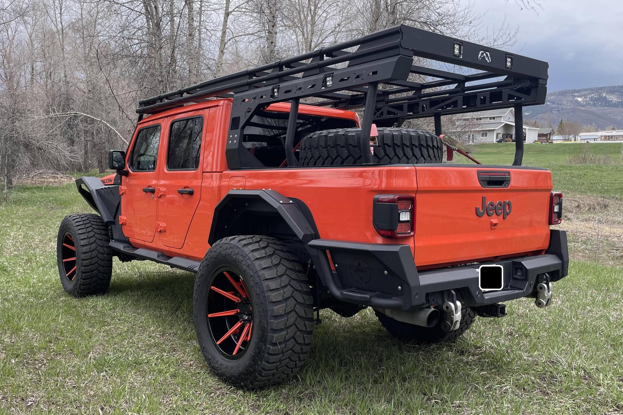 THIS. . . is a 2020 Jeep Gladiator Rubicon 4x4, finished in Punk'n Metallic with a black interior. It also shows that this is a one-owner Jeep. Modifications reported by the seller include a Magnuson Products TVS1900 supercharger kit, Yukon Gear & Axle 4. 88-ratio gears, 22-inch Forgiato wheels, an EVO MGF Enforcer Pro Stage 4 Plus lift kit, a Wilwood big brake kit, a Fab Fours Grumper front bumper, and a DECKED truck bed system. More details about the aftermarket parts installed on this truck are provided below. Factory equipment includes the Cold Weather, 8. 4-inch Radio and Premium Audio, and Jeep Active Safety groups, a transmission skid plate, a spray-in bedliner, a 3-piece removable hardtop with a headliner, leather upholstery, a front-facing camera, and adaptive cruise control. Jeep returned to the pickup segment after a long hiatus when it released the Gladiator for 2020. Offered only with four doors, it’s closely related to the fourth-generation Wrangler so it offers heritage-laced styling, body-on-frame construction, and excellent off-road capacity. It’s still sold new in 2022. Power comes from a 3. 6-liter supercharged V6, rated at 285 horsepower and 260 lb-ft of torque when left stock and naturally aspirated. The supercharger increase those figures to 440 and 380, respectively, according to Magnuson Products, but a dyno sheet is not available. The engine spins the four wheels via an 8-speed automatic transmission and a 2-speed transfer case.