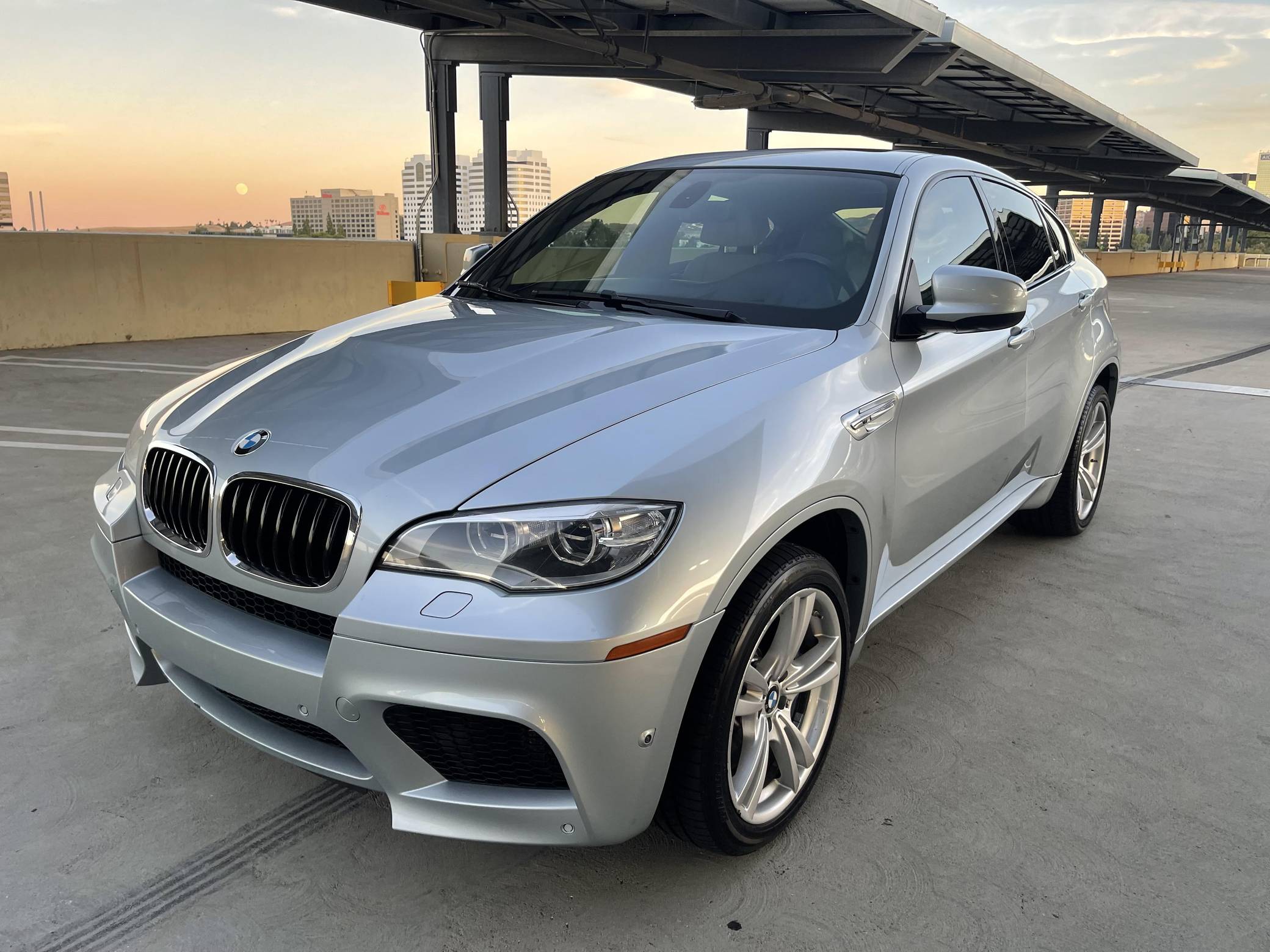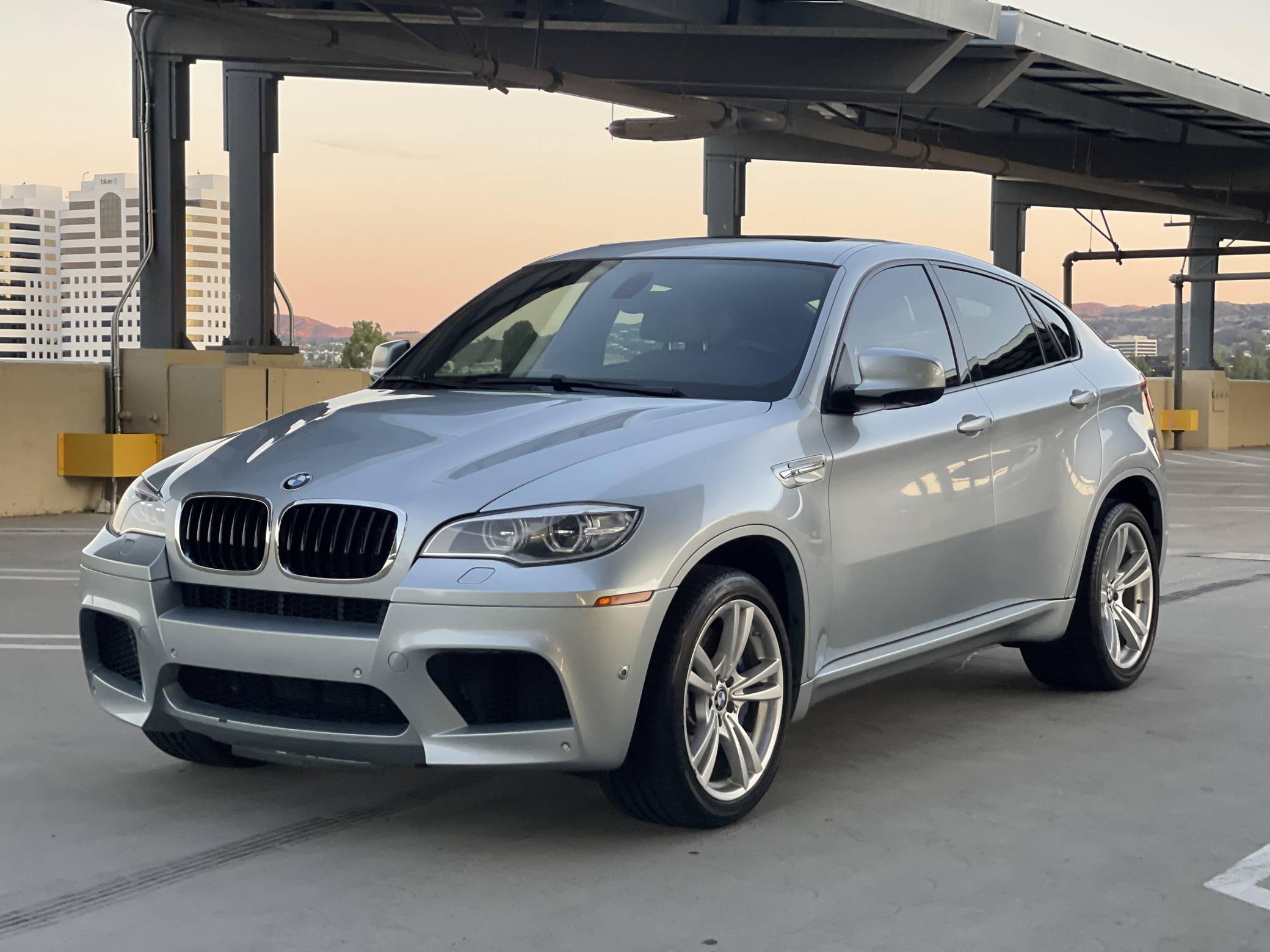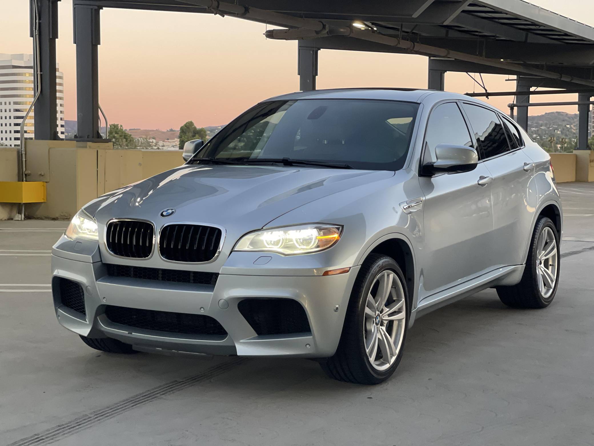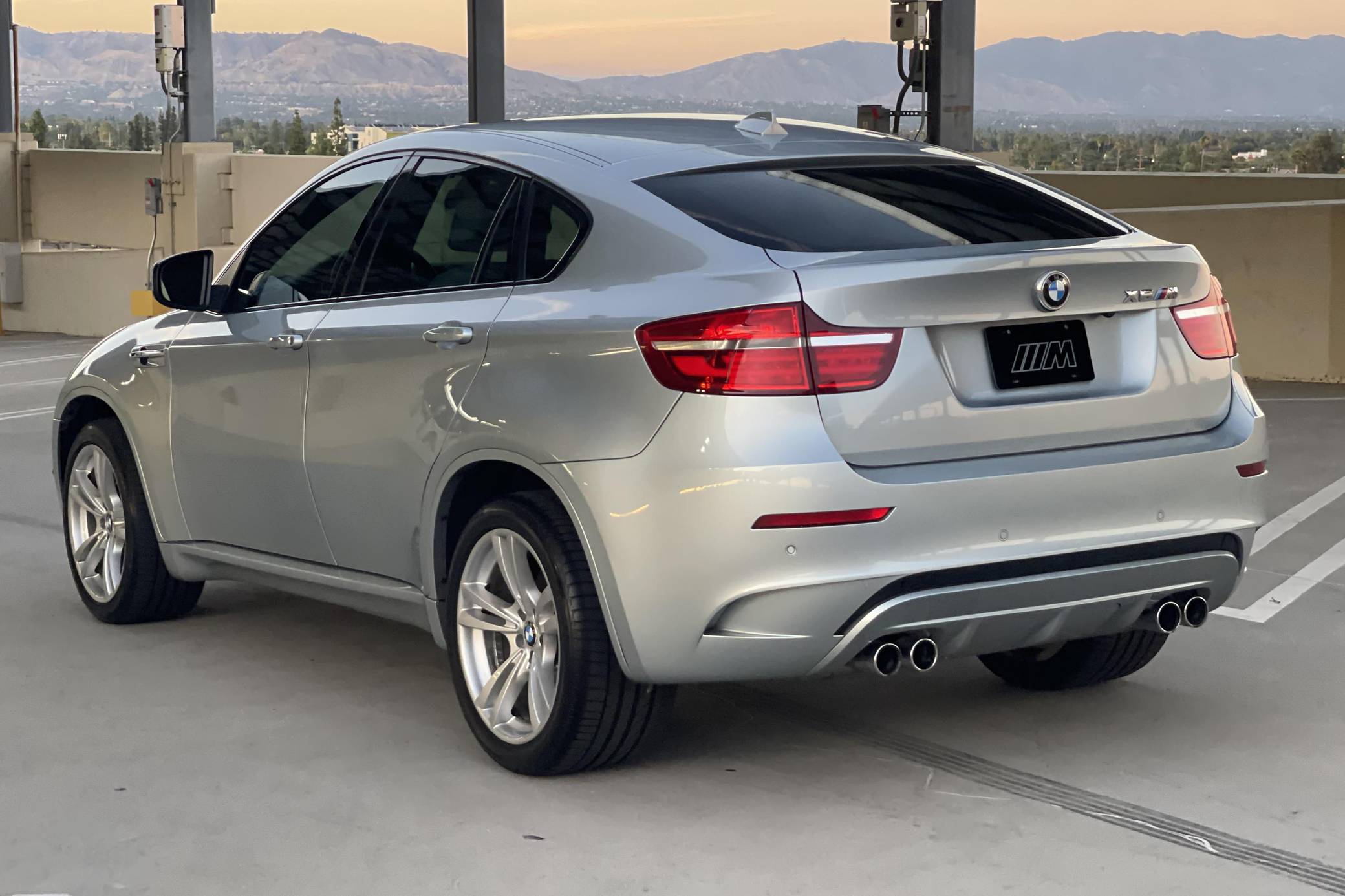 2013 BMW X6 M, finished in Silverstone Metallic with a Silverstone interior. According to the build sheet provided in the gallery, factory equipment includes 20-inch Style 299 wheels, adaptive LED headlights, soft-close automatic doors, Merino leather upholstery, heated and ventilated front seats, heated rear seats, a rear-seat entertainment system, rear- and side-view cameras, Park Distance Control (PDC), and a head-up display. Modifications are limited to tinted windows. The X6 M is billed as a "Sports Activity Coupe", though it respectably offers nearly 60 cubic feet of cargo capacity with the rear seats folded. Introduced for 2011, it would join the X5 M as the second M car to feature an automatic transmission exclusively and the "S63" V8 engine. It would also feature correspondingly upsized brakes and an armada of handling-focused tweaks. Power comes from an "S63" 4. 4-liter twin-turbocharged V8, rated at 555 horsepower and 500 lb-ft of torque. Output is sent to all four wheels through BMW's xDrive all-wheel-drive system and a 6-speed automatic transmission.
