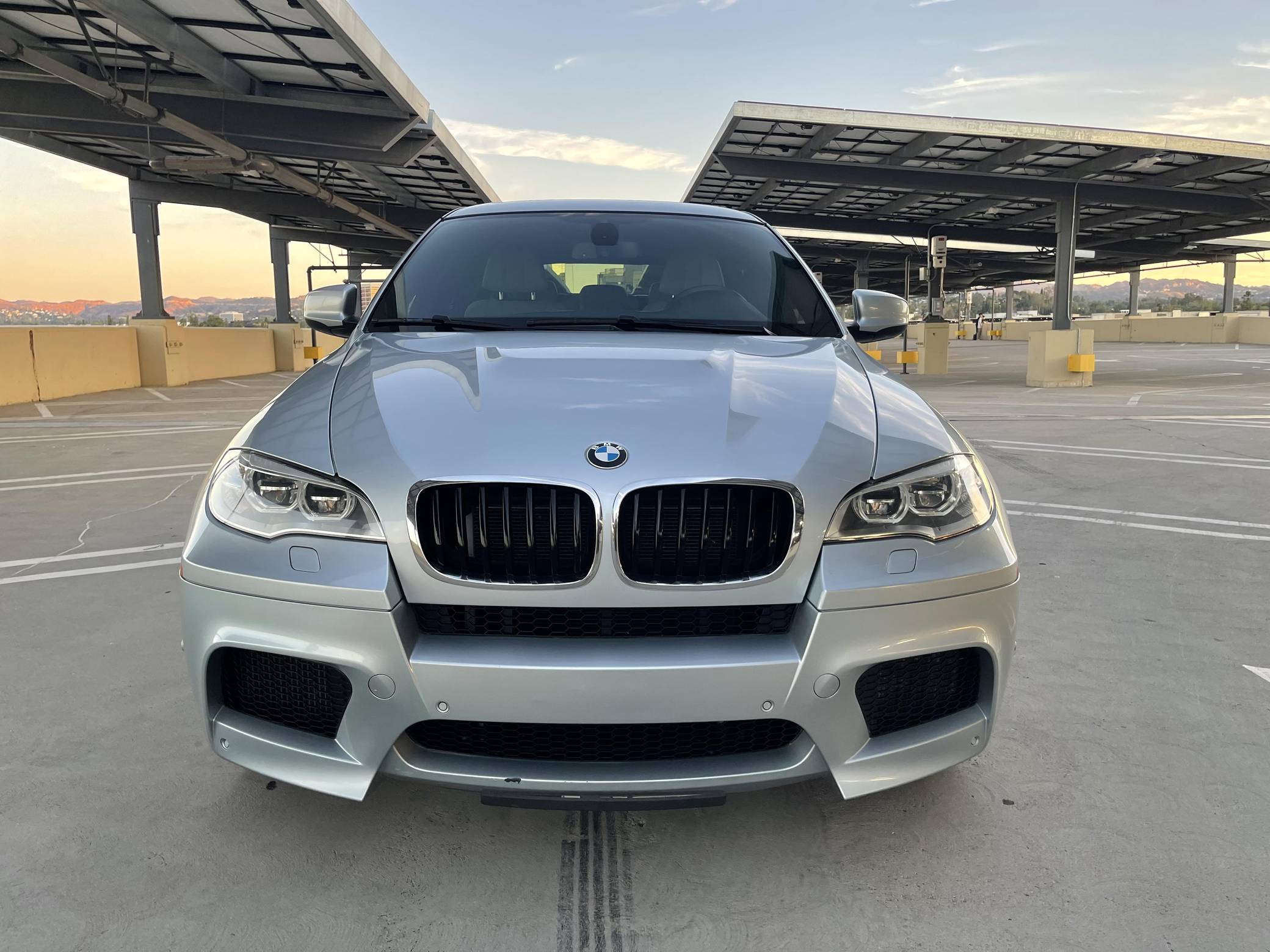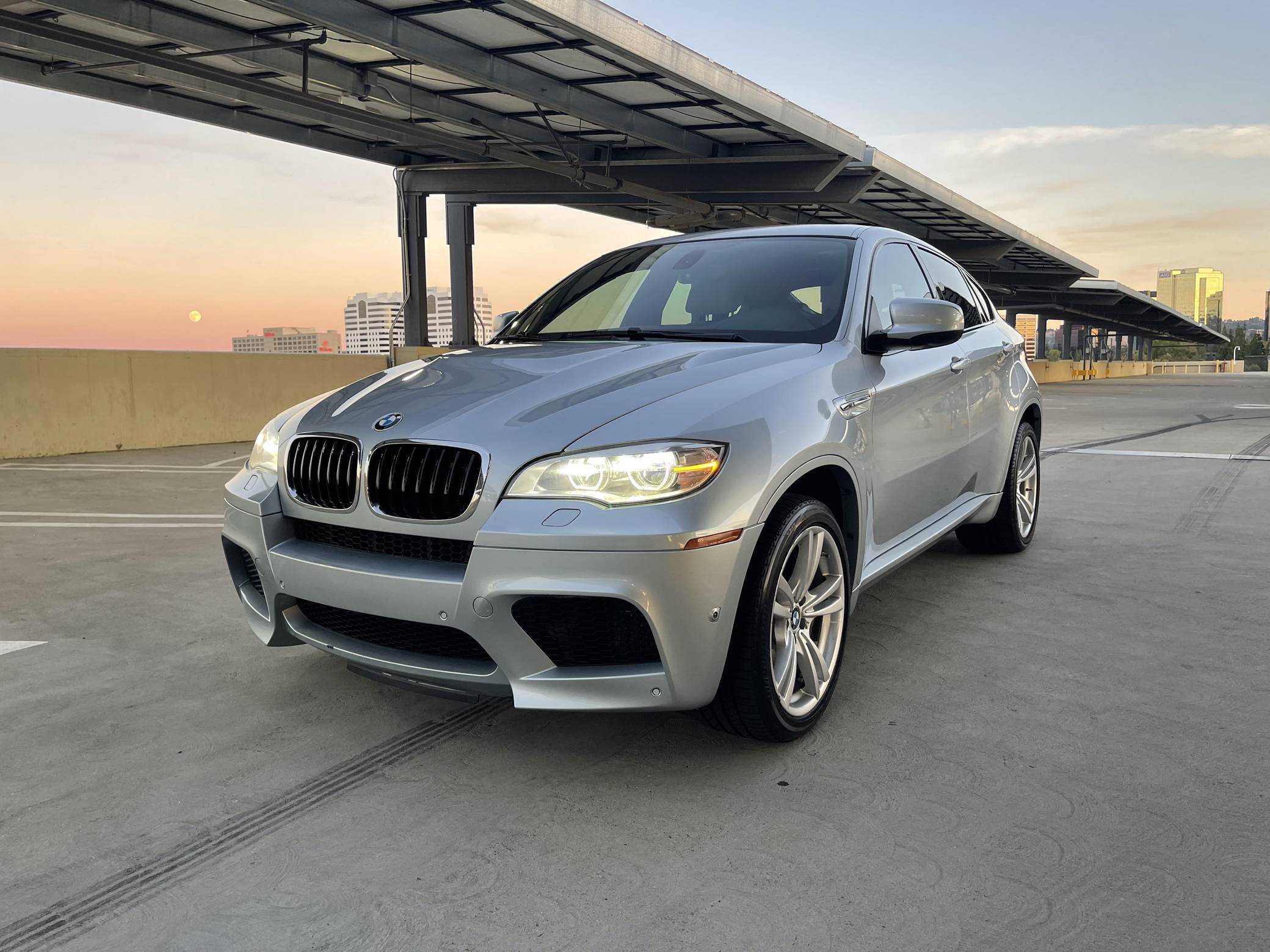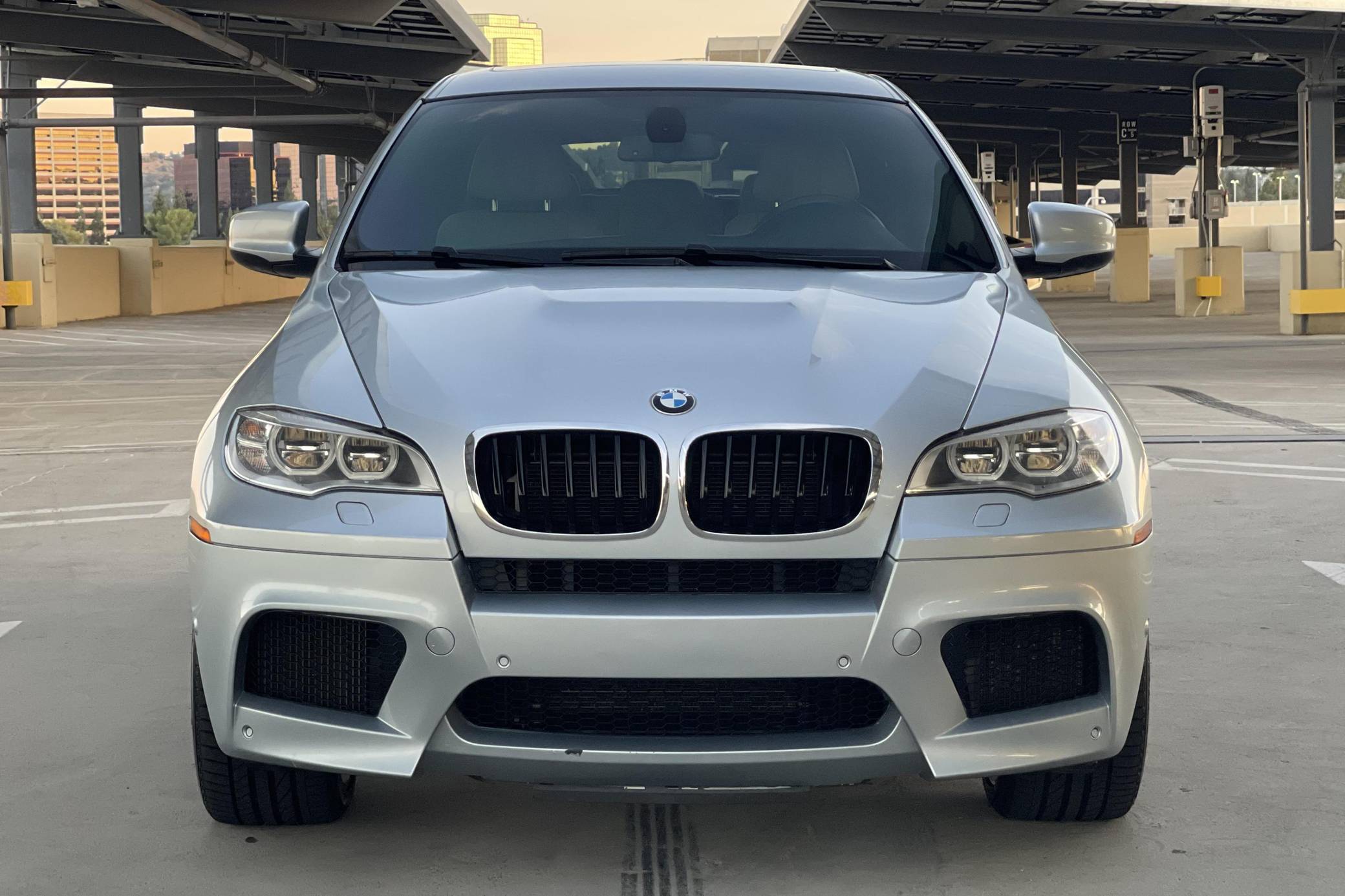 2013 BMW X6 M, finished in Silverstone Metallic with a Silverstone interior. According to the build sheet provided in the gallery, factory equipment includes 20-inch Style 299 wheels, adaptive LED headlights, soft-close automatic doors, Merino leather upholstery, heated and ventilated front seats, heated rear seats, a rear-seat entertainment system, rear- and side-view cameras, Park Distance Control (PDC), and a head-up display. Modifications are limited to tinted windows. The X6 M is billed as a "Sports Activity Coupe", though it respectably offers nearly 60 cubic feet of cargo capacity with the rear seats folded. Introduced for 2011, it would join the X5 M as the second M car to feature an automatic transmission exclusively and the "S63" V8 engine. It would also feature correspondingly upsized brakes and an armada of handling-focused tweaks. Power comes from an "S63" 4. 4-liter twin-turbocharged V8, rated at 555 horsepower and 500 lb-ft of torque. Output is sent to all four wheels through BMW's xDrive all-wheel-drive system and a 6-speed automatic transmission.