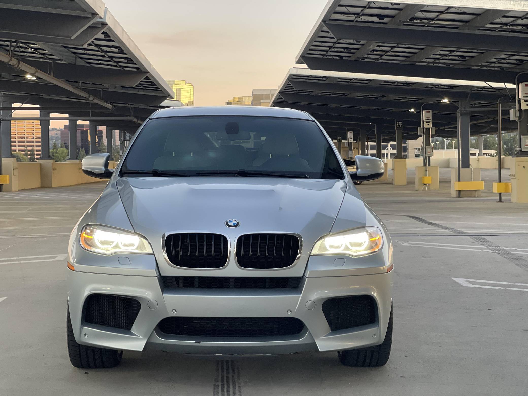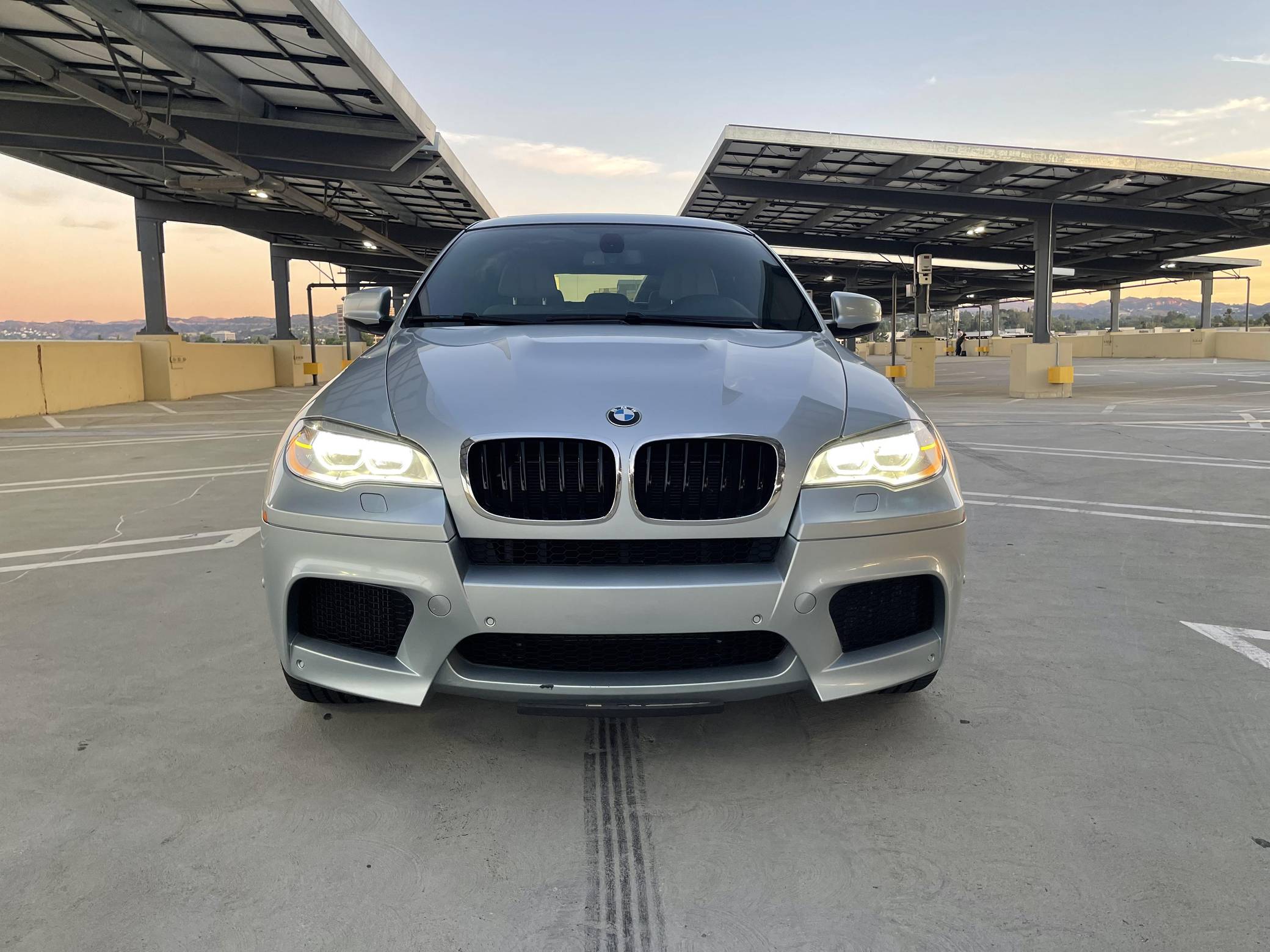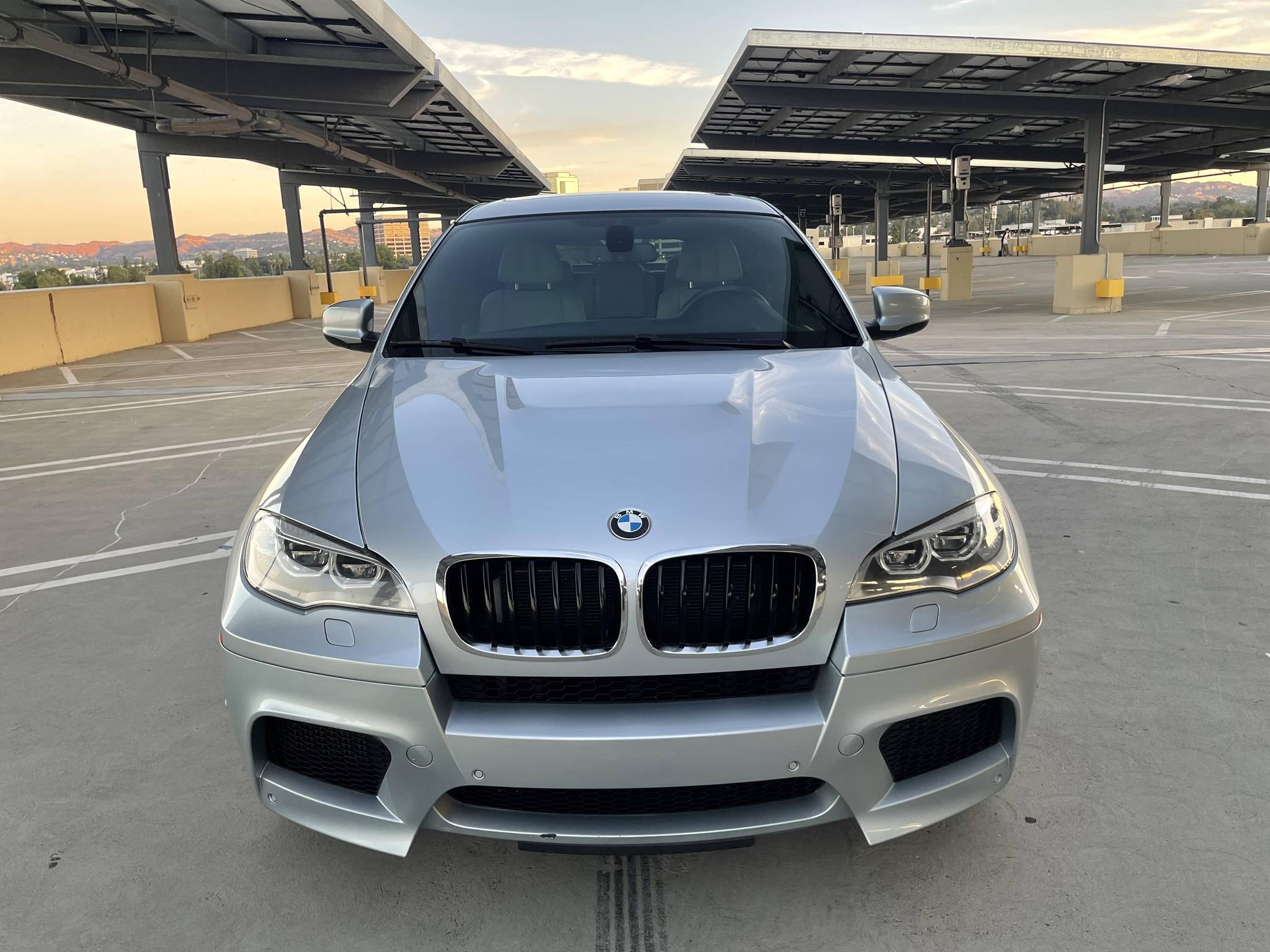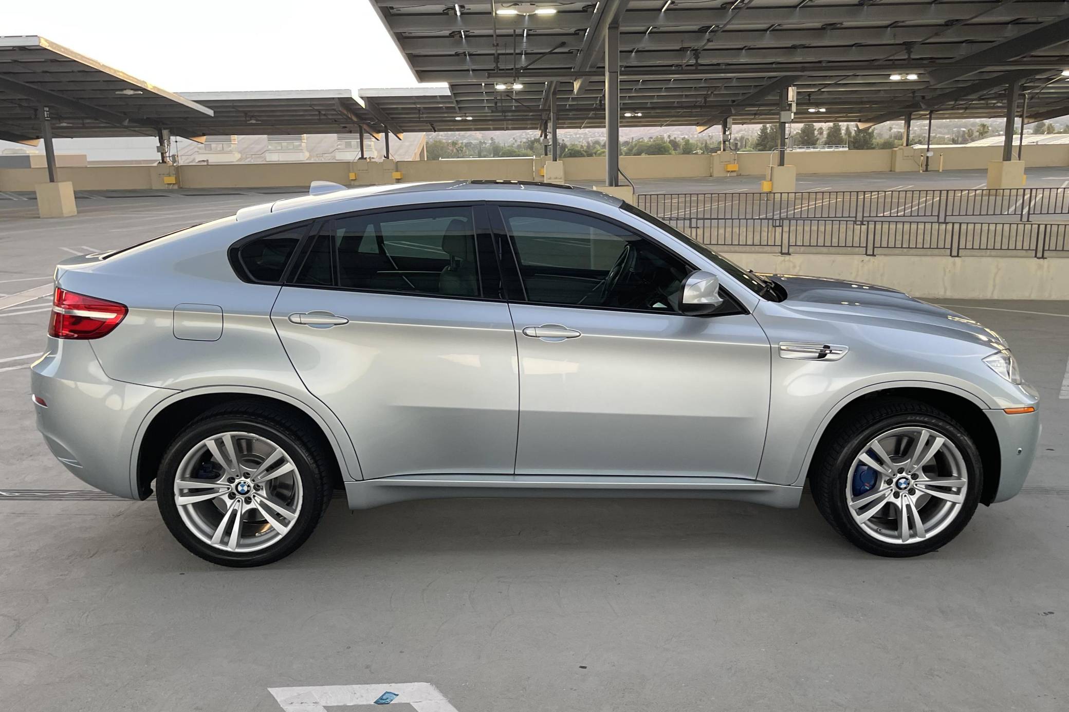 2013 BMW X6 M, finished in Silverstone Metallic with a Silverstone interior. According to the build sheet provided in the gallery, factory equipment includes 20-inch Style 299 wheels, adaptive LED headlights, soft-close automatic doors, Merino leather upholstery, heated and ventilated front seats, heated rear seats, a rear-seat entertainment system, rear- and side-view cameras, Park Distance Control (PDC), and a head-up display. Modifications are limited to tinted windows. The X6 M is billed as a "Sports Activity Coupe", though it respectably offers nearly 60 cubic feet of cargo capacity with the rear seats folded. Introduced for 2011, it would join the X5 M as the second M car to feature an automatic transmission exclusively and the "S63" V8 engine. It would also feature correspondingly upsized brakes and an armada of handling-focused tweaks. Power comes from an "S63" 4. 4-liter twin-turbocharged V8, rated at 555 horsepower and 500 lb-ft of torque. Output is sent to all four wheels through BMW's xDrive all-wheel-drive system and a 6-speed automatic transmission.