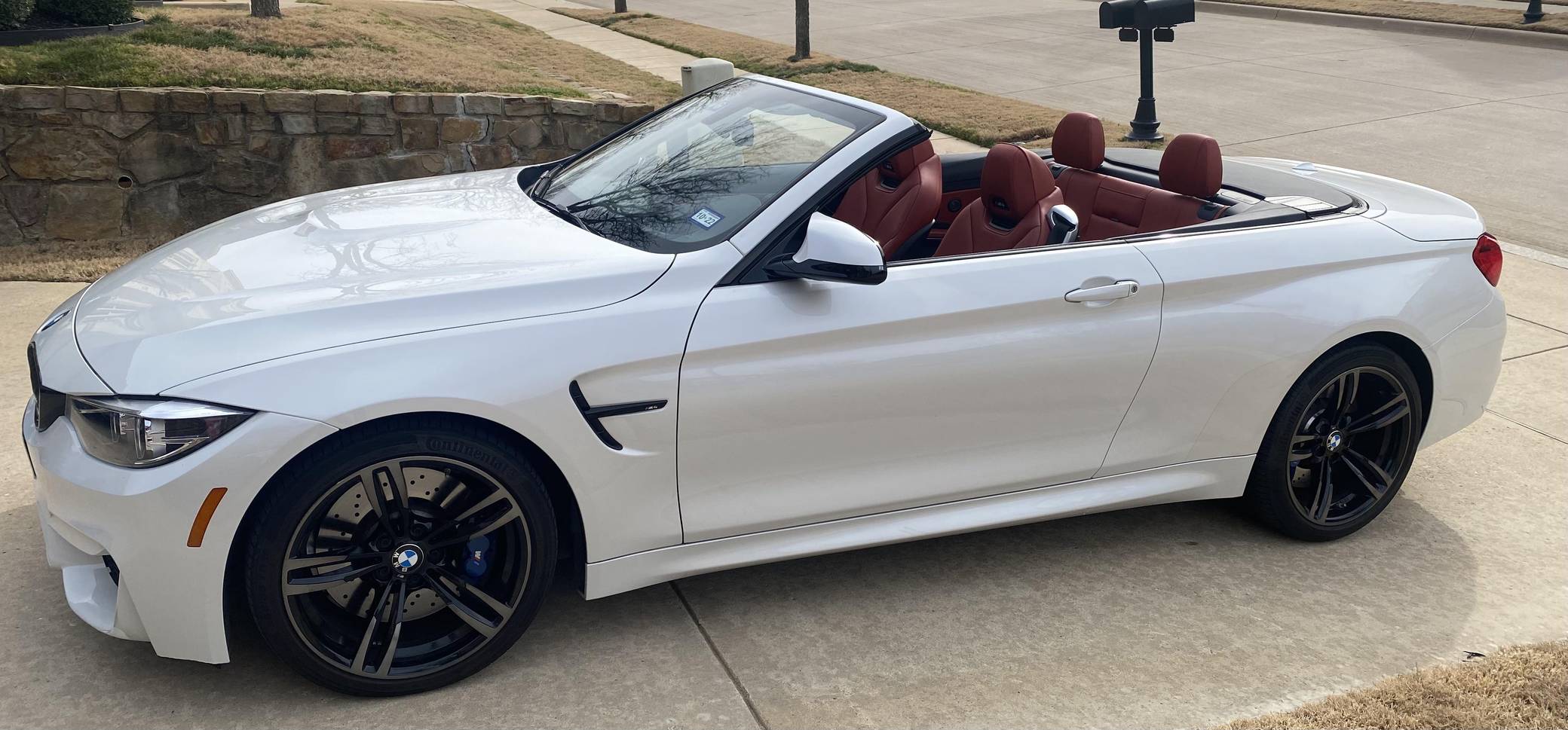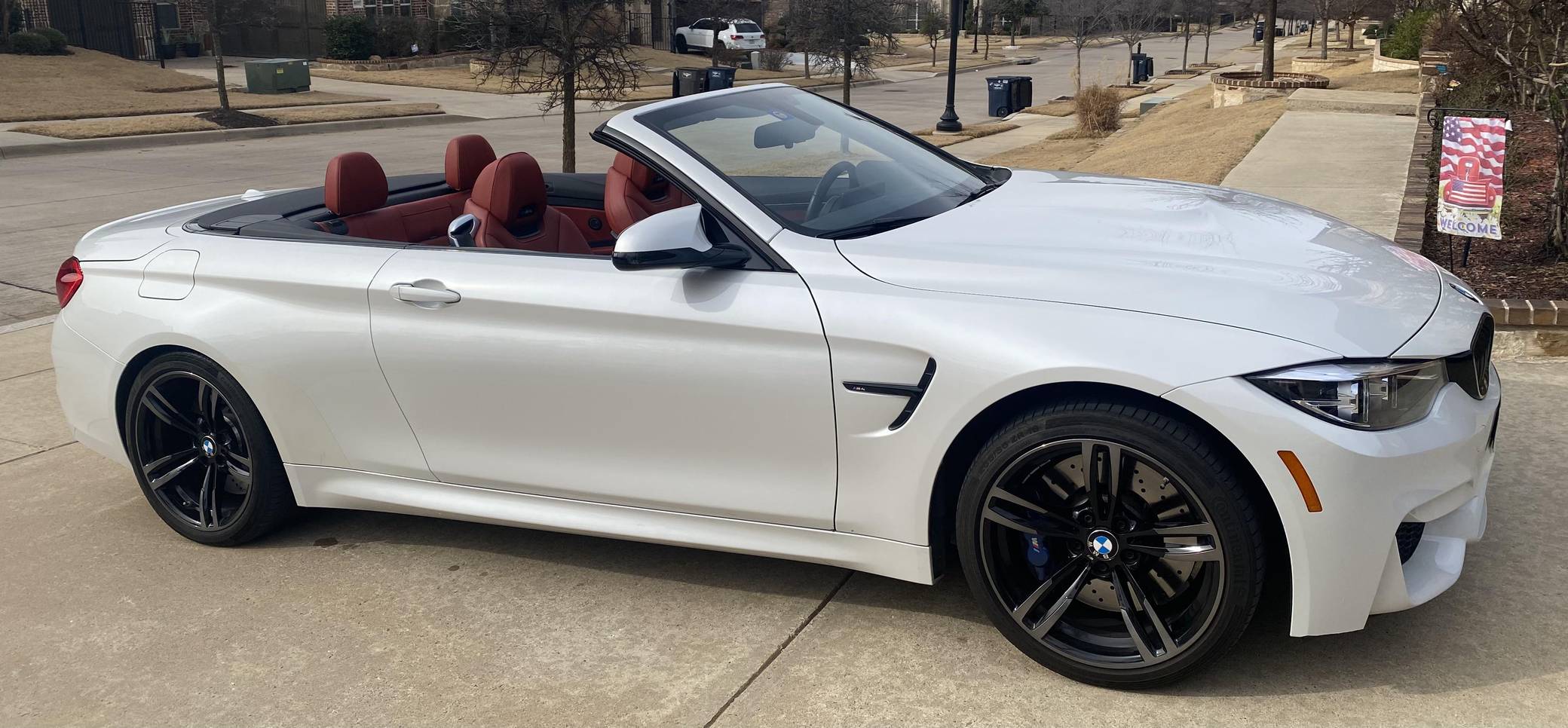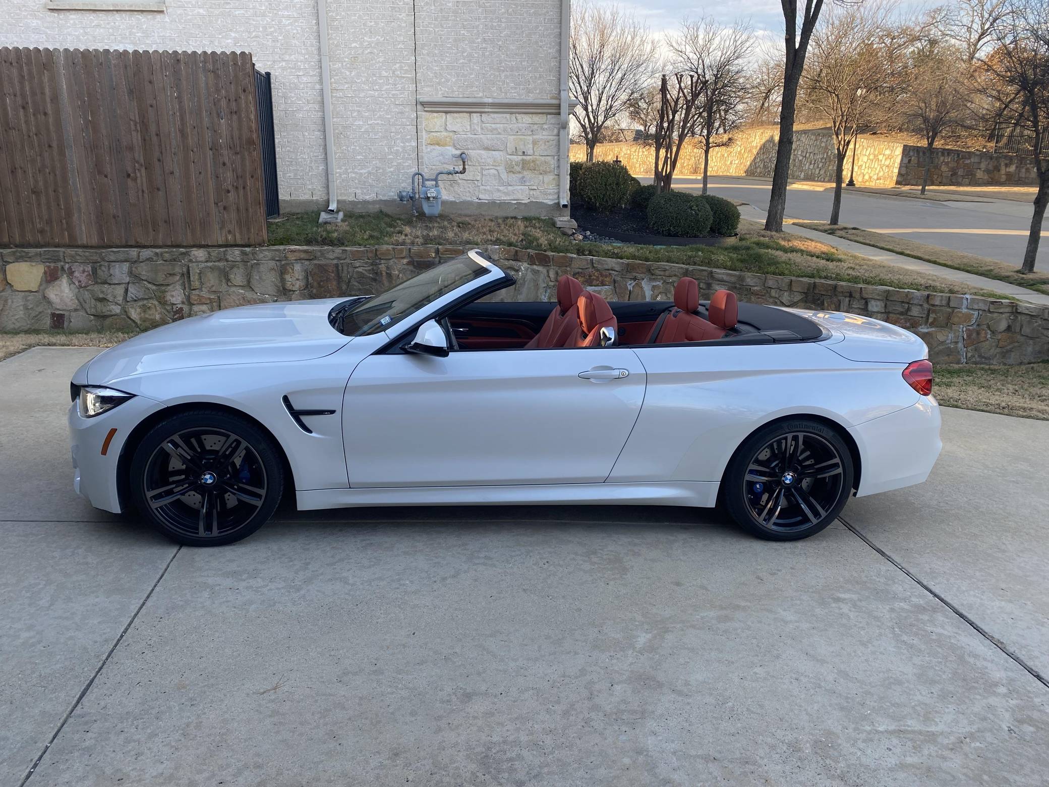 THIS. . . is a 2018 BMW M4 Convertible, finished in Mineral White Metallic with a Sakhir Orange interior. This convertible's odometer displays about 15,600 miles. It also shows that this is a one-owner car that has been Texas-owned since it was new. Factory equipment includes the Competition Package, 19-inch "Style 437M" wheels, an Adaptive M suspension system, a power-folding hardtop, carbon fiber interior trim, heated and power-adjustable front sport seats, a Harman Kardon surround sound system, a navigation system, and a head-up display. This M4's build sheet is pictured in the gallery, and the seller reports no modifications. 2015 was the first model year for the M4, which took the torch from the two-door M3. BMW surfed the downsizing wave sweeping across the industry by replacing the naturally-aspirated V8 with a twin-turbocharged straight-6, and a significant torque increase accompanied the new engine. Chopping off two cylinders and replacing metal bits with carbon fiber components allowed BMW to make the M4 up to 176 pounds lighter than the M3 it replaced. Production ended in 2020. Power comes from a 3. 0-liter twin-turbocharged straight-6, rated at 444 horsepower and 406 lb-ft of torque. Called "S55" internally, it spins the rear wheels via a 7-speed automatic transmission.
