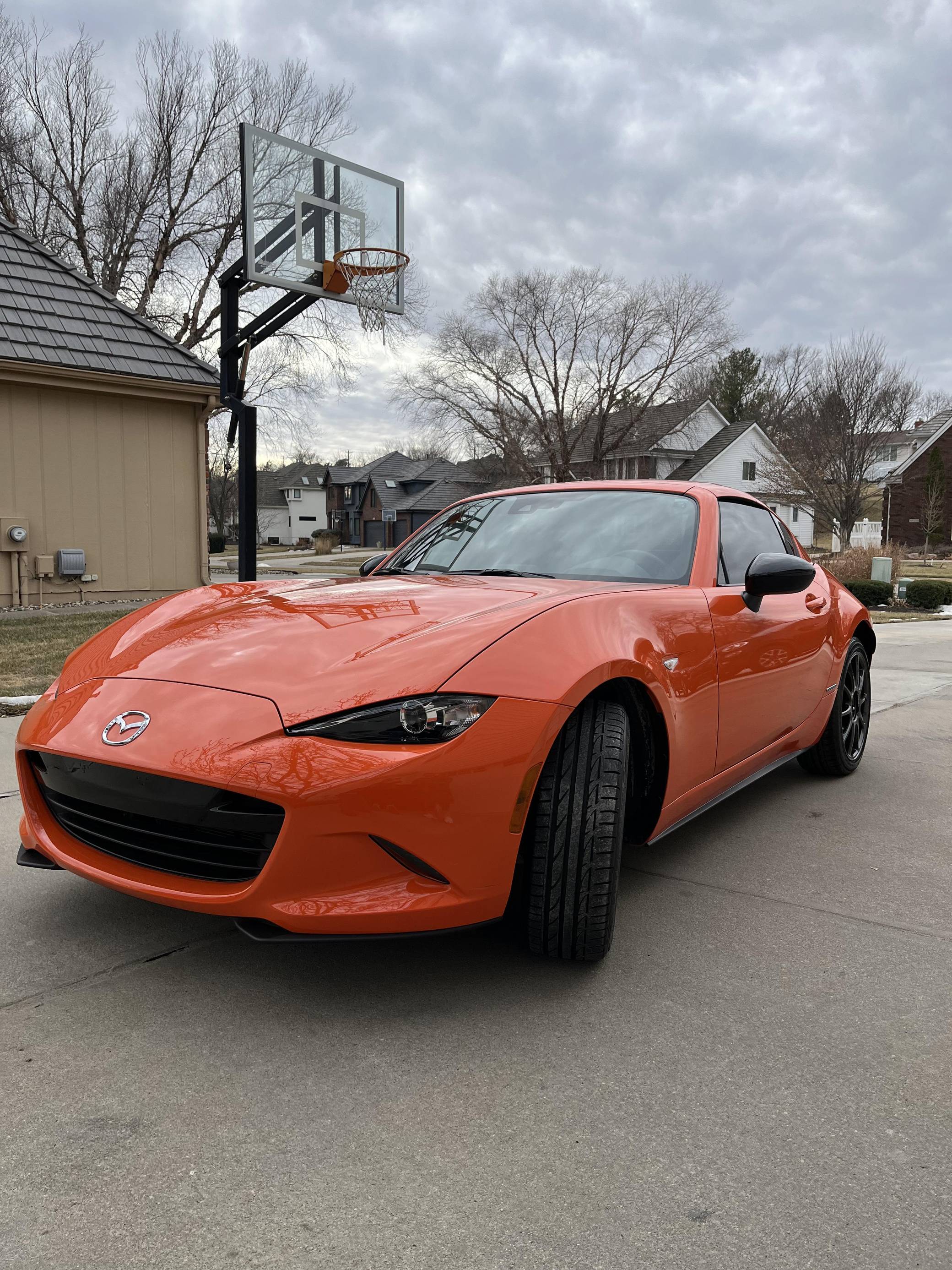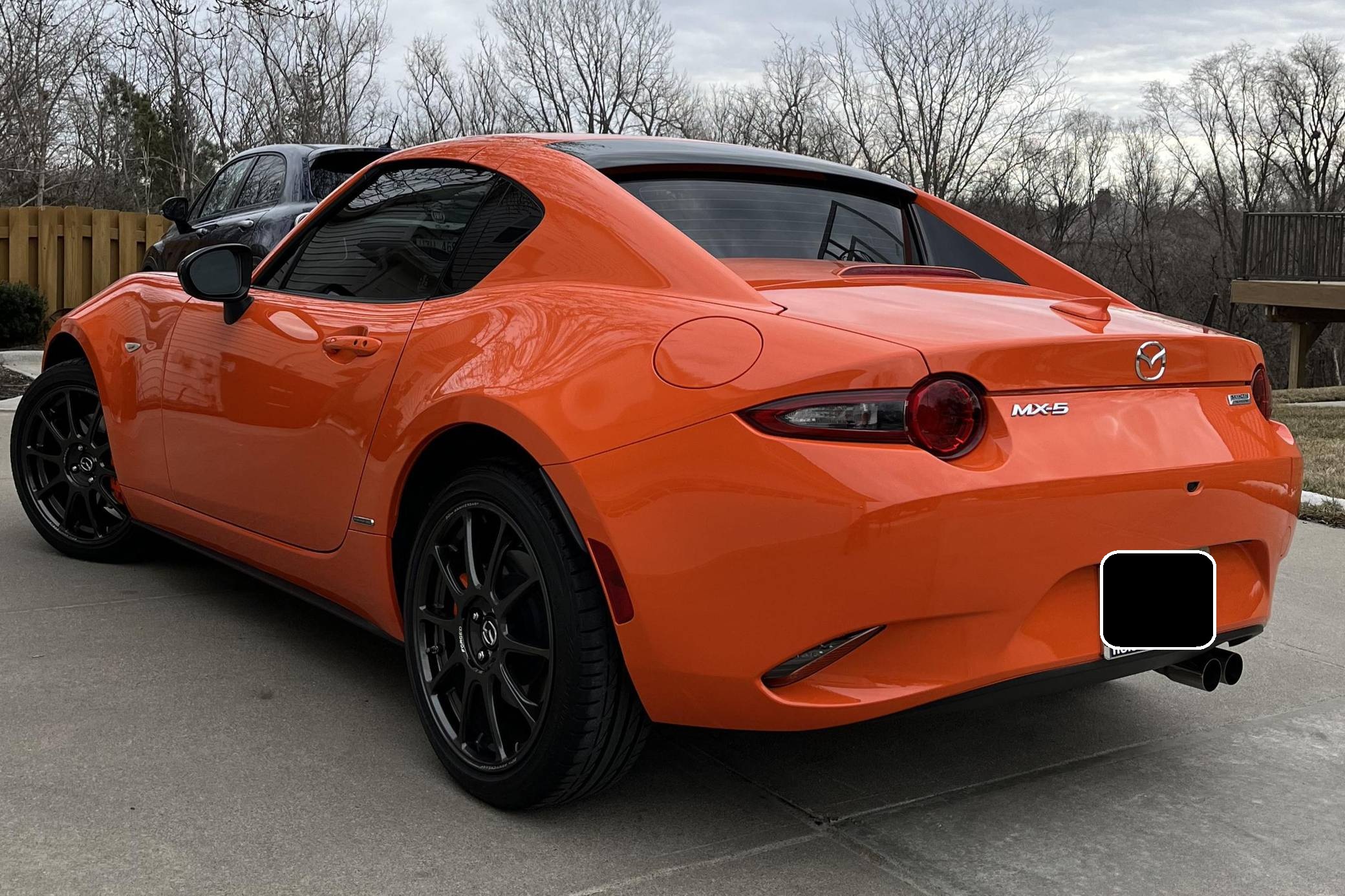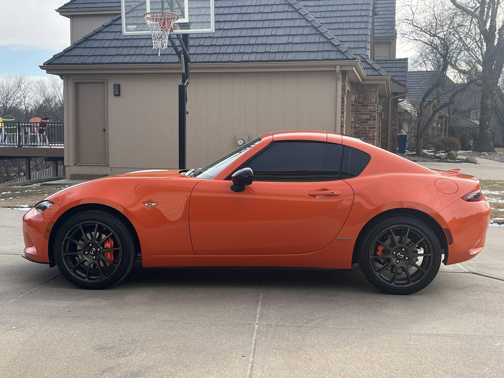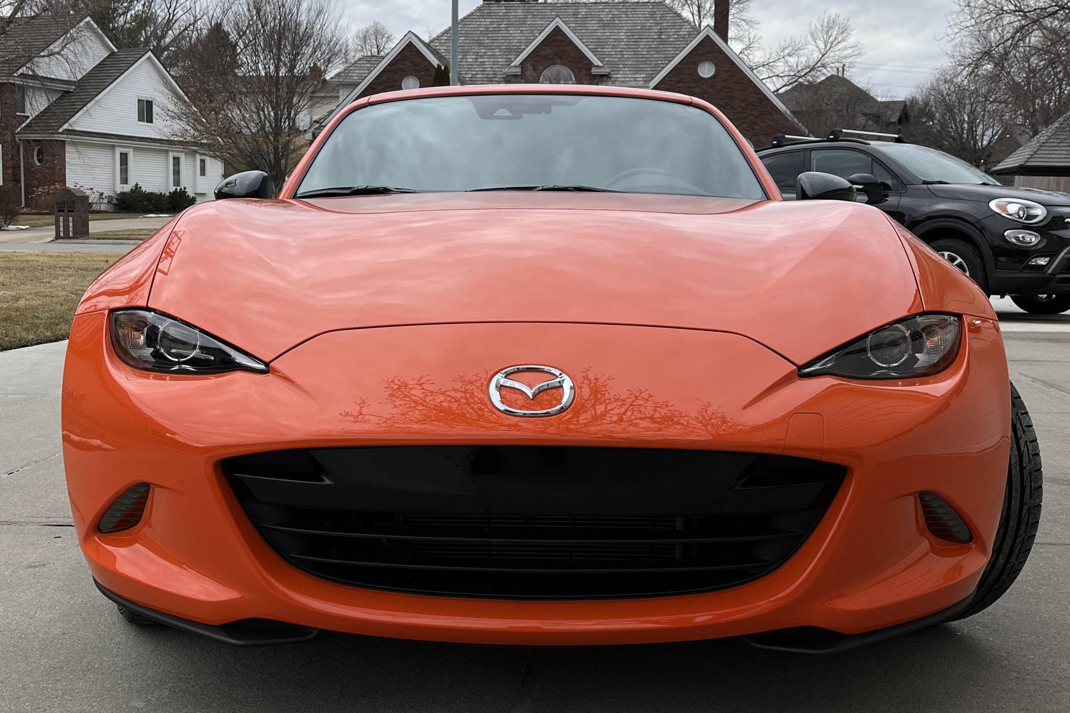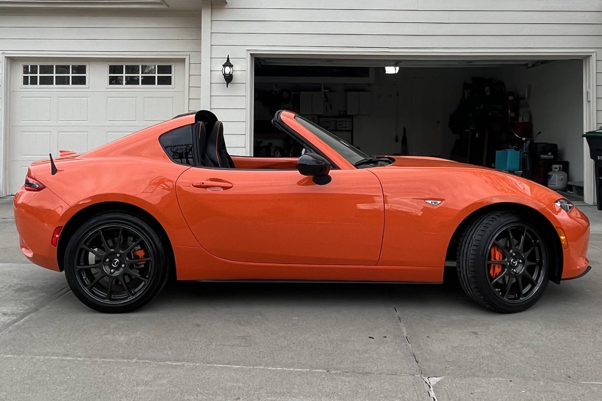 THIS… is a 2019 Mazda MX-5 RF 30th Anniversary Edition, finished in Racing Orange with a black interior. This MX-5 is fitted with the desirable 6-speed manual transmission, and the odometer currently displays approximately 6,900 miles. Modifications are limited to a stubby antenna and window tint. The "Retractable Fastback" or "RF" version of the "ND" Miata debuted in 2016 with a power-operated hardtop panel that disappears into the trunk area, as well as distinctive flying buttresses that alter the car's side profile. The "ND2" model launched for the 2019 model year and featured revisions to the engine with more power and a higher redline, a telescoping steering column, revised seat controls, a new cupholder, reverse camera, and a redesigned door handle mechanism. The 30th Anniversary Edition differentiates itself from other trim levels with a distinct Racing Orange hue, Rays forged wheels, Racing Orange-painted brake calipers, and orange accents throughout the interior, as well as a few other unique features. Only 3,000 were produced. Power comes from a 2. 0-liter inline-4, rated at 181 horsepower and 151 lb-ft of torque. Output is sent to the rear wheels via a 6-speed manual transmission.
