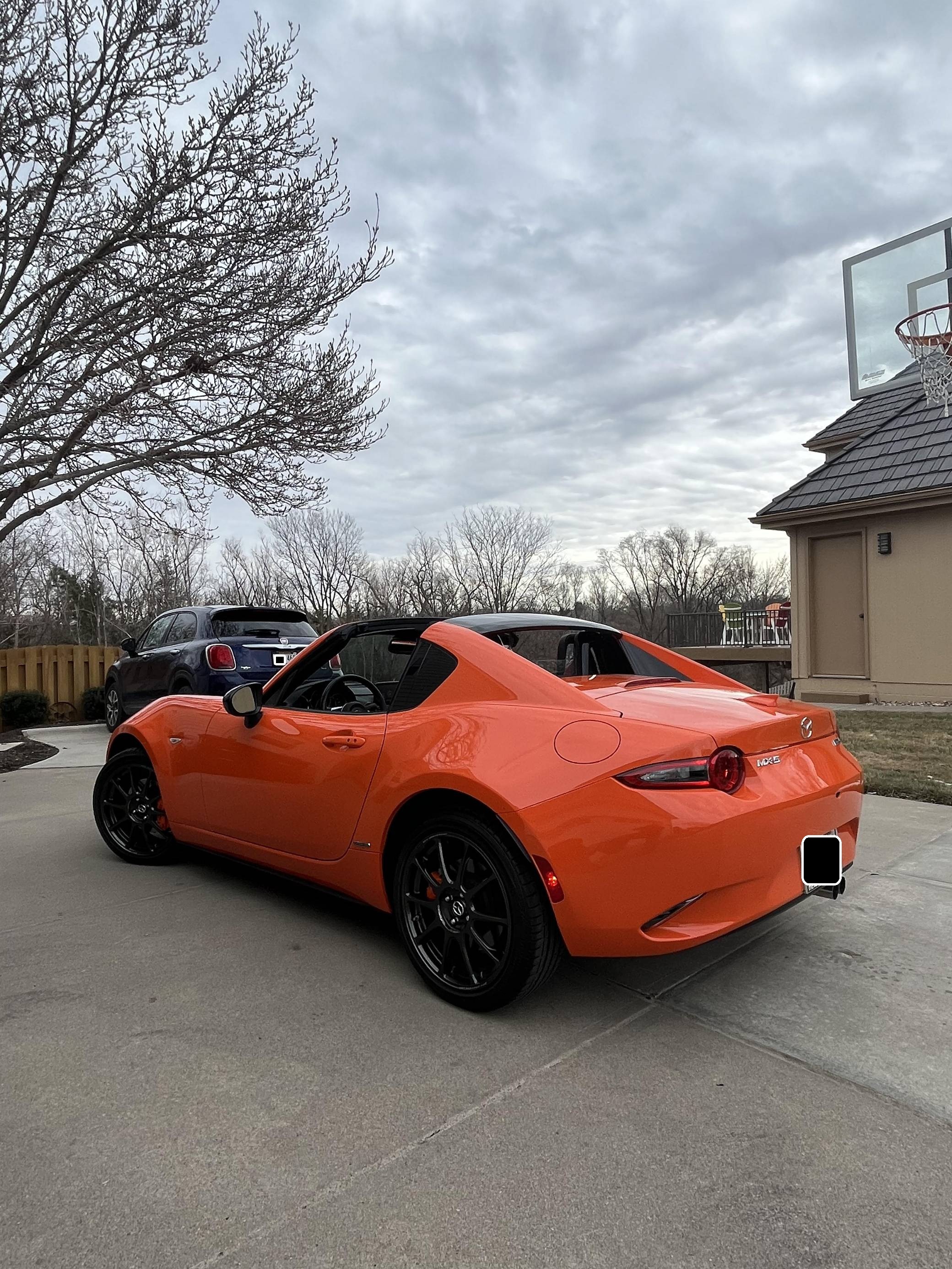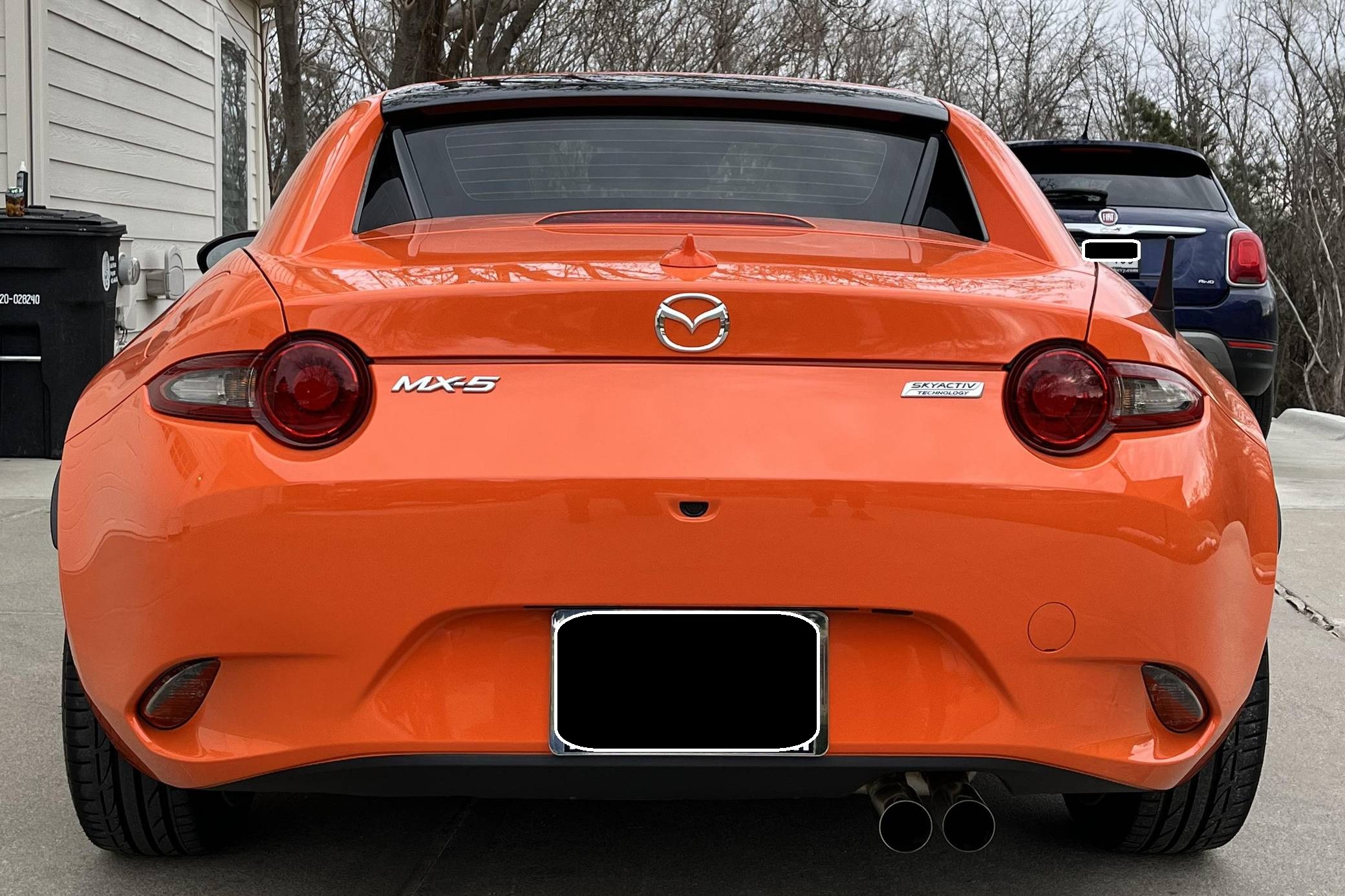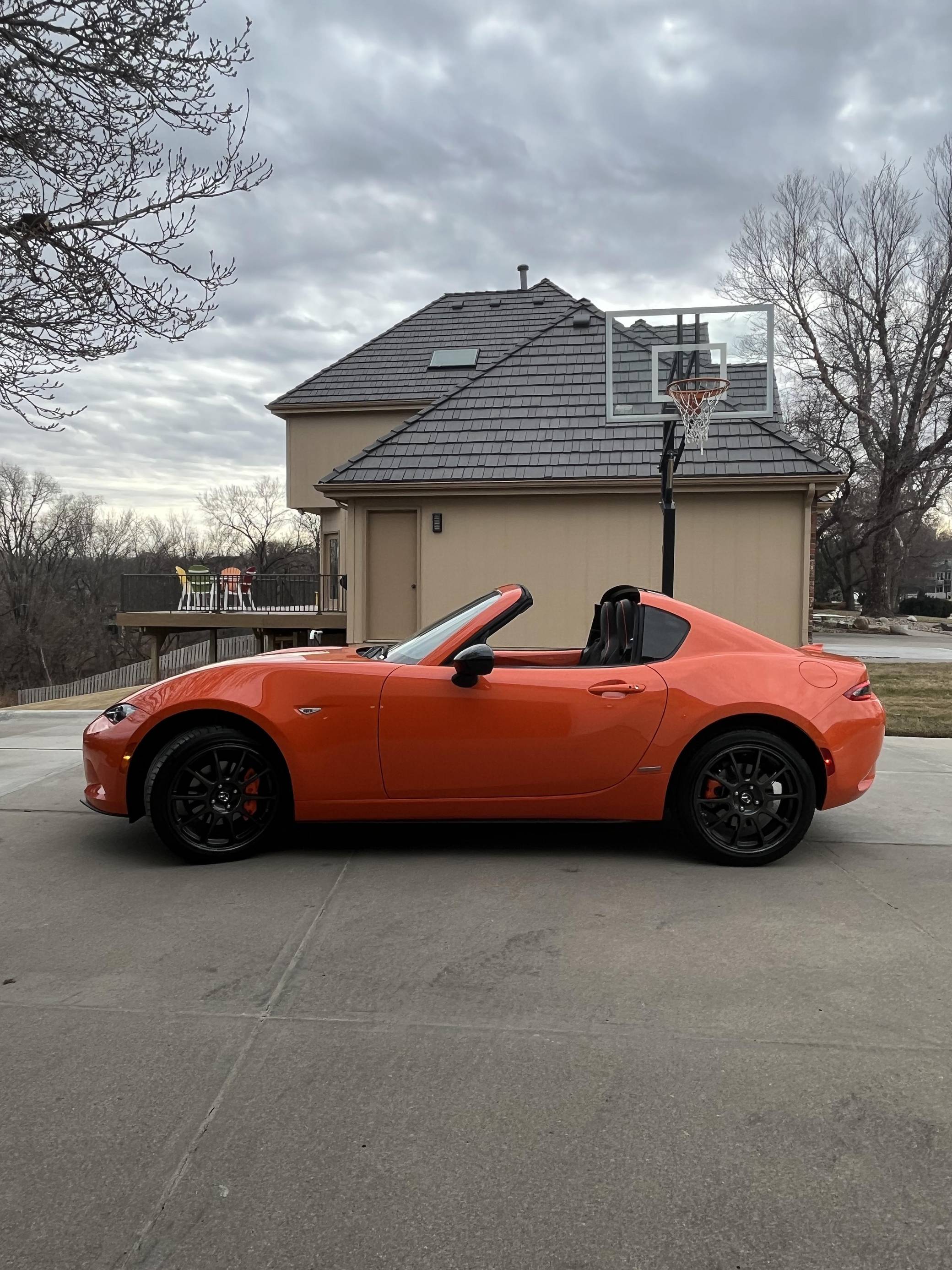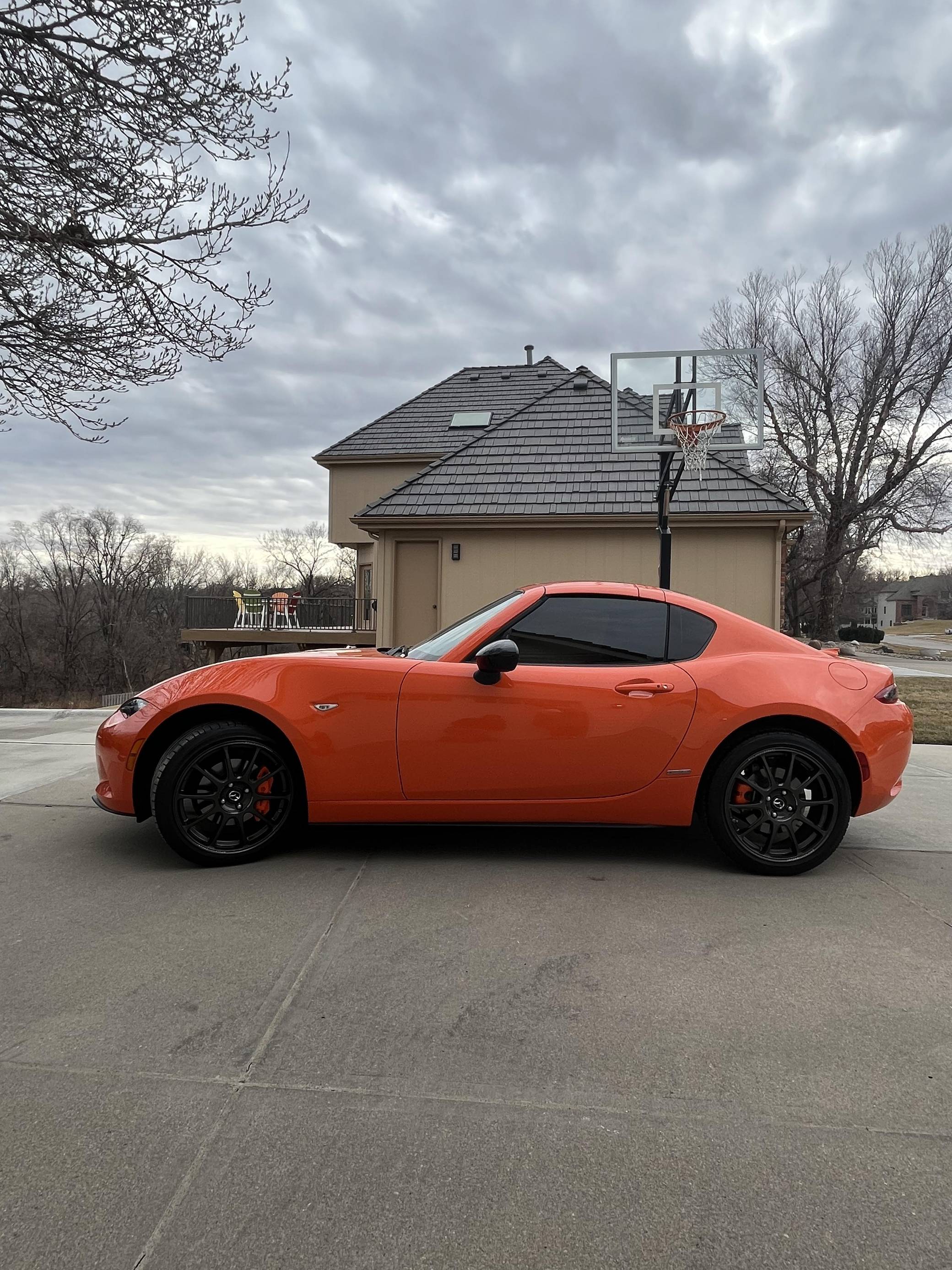 THIS… is a 2019 Mazda MX-5 RF 30th Anniversary Edition, finished in Racing Orange with a black interior. This MX-5 is fitted with the desirable 6-speed manual transmission, and the odometer currently displays approximately 6,900 miles. Modifications are limited to a stubby antenna and window tint. The "Retractable Fastback" or "RF" version of the "ND" Miata debuted in 2016 with a power-operated hardtop panel that disappears into the trunk area, as well as distinctive flying buttresses that alter the car's side profile. The "ND2" model launched for the 2019 model year and featured revisions to the engine with more power and a higher redline, a telescoping steering column, revised seat controls, a new cupholder, reverse camera, and a redesigned door handle mechanism. The 30th Anniversary Edition differentiates itself from other trim levels with a distinct Racing Orange hue, Rays forged wheels, Racing Orange-painted brake calipers, and orange accents throughout the interior, as well as a few other unique features. Only 3,000 were produced. Power comes from a 2. 0-liter inline-4, rated at 181 horsepower and 151 lb-ft of torque. Output is sent to the rear wheels via a 6-speed manual transmission.