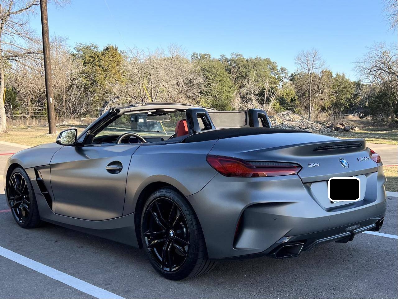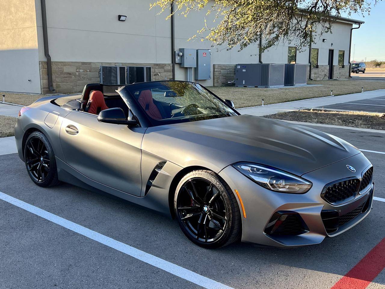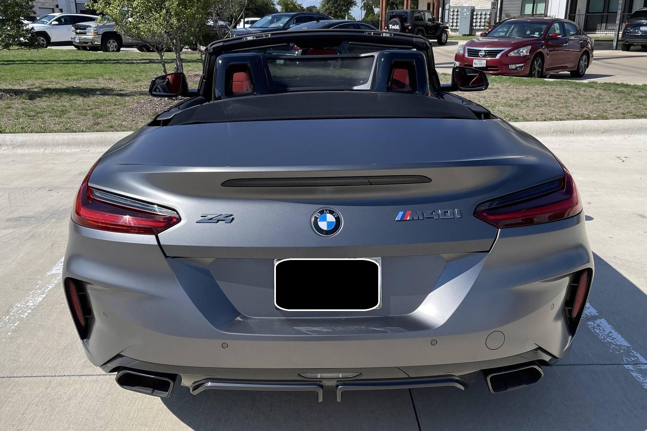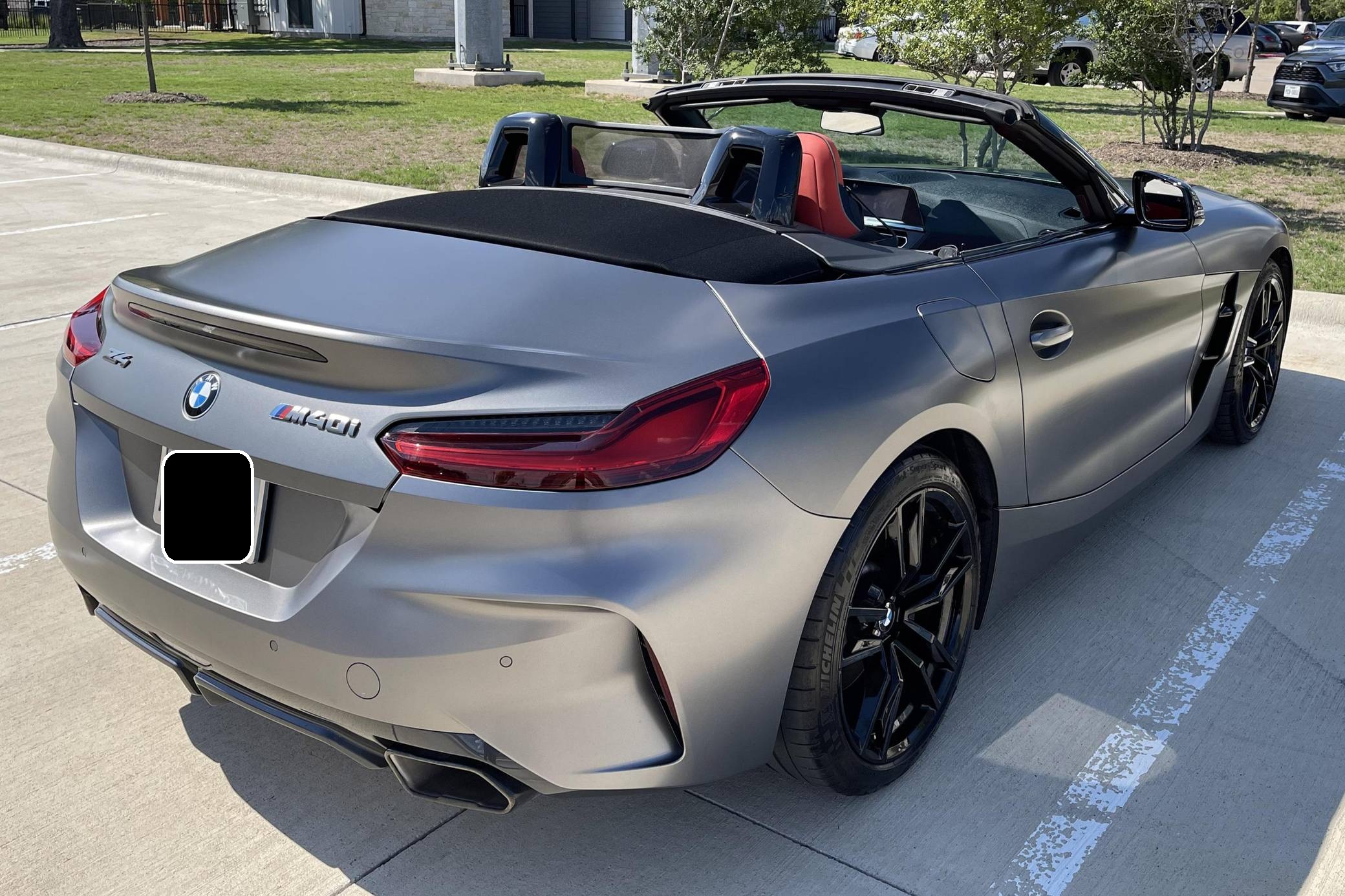 2021 BMW Z4 M40i, finished in Frozen Grey Metallic with a black soft top and a Magma Red interior. According to the build sheet provided in the gallery, factory equipment includes the Premium and Shadowline packages, Driving Assistant, M Sport brakes with red calipers, Vernasca leather upholstery, heated and power-adjustable seats, Park Distance Control (PDC), and ambient lighting. Modifications are limited to tinted windows. Called "G29" internally, the third-generation Z4 made its debut for 2018 as a soft top convertible to replace the hardtop-only E89-generation Z4. The G29 Z4 also offered enthusiasts a more sculpted exterior design, a nicer interior, and an available turbocharged straight-6 engine. Assembled in Austria, the G29-generation Z4 is built alongside the Toyota Supra. Power comes from a "B58" 3. 0-liter turbocharged straight-6, rated at 382 horsepower and 369 lb-ft of torque. Output is sent to the rear wheels via an 8-speed automatic transmission.
