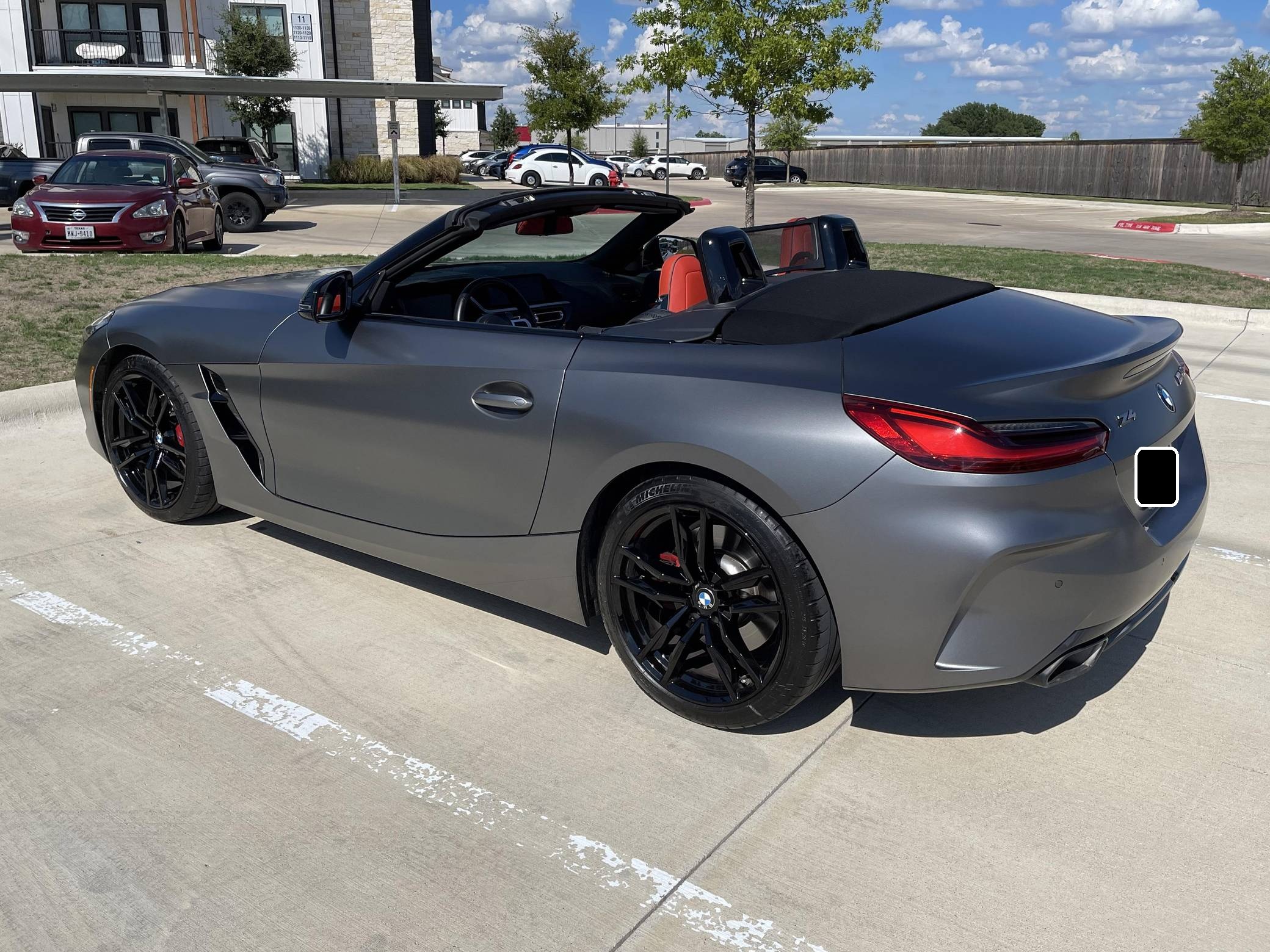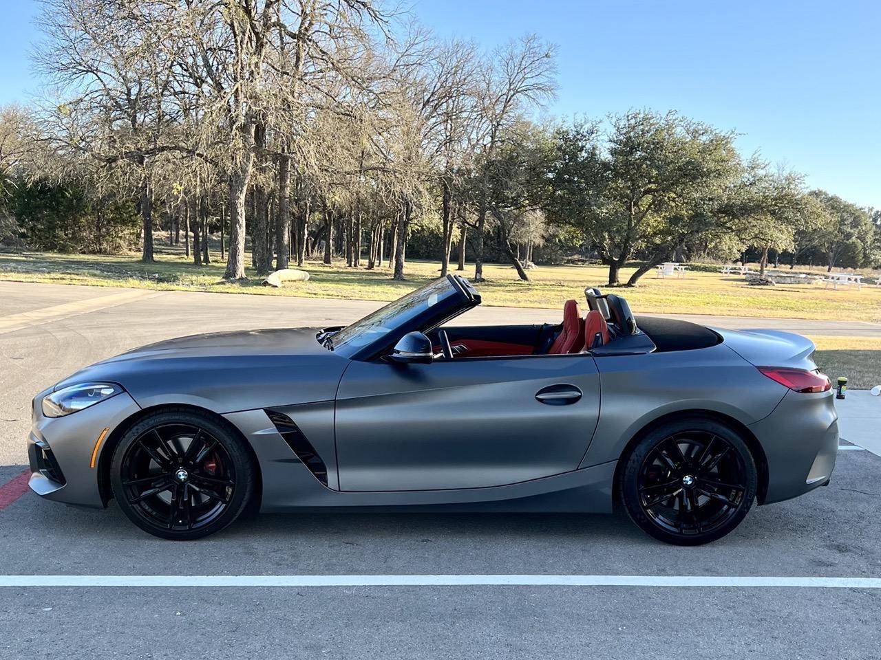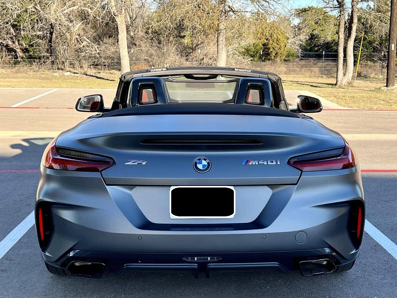 2021 BMW Z4 M40i, finished in Frozen Grey Metallic with a black soft top and a Magma Red interior. According to the build sheet provided in the gallery, factory equipment includes the Premium and Shadowline packages, Driving Assistant, M Sport brakes with red calipers, Vernasca leather upholstery, heated and power-adjustable seats, Park Distance Control (PDC), and ambient lighting. Modifications are limited to tinted windows. Called "G29" internally, the third-generation Z4 made its debut for 2018 as a soft top convertible to replace the hardtop-only E89-generation Z4. The G29 Z4 also offered enthusiasts a more sculpted exterior design, a nicer interior, and an available turbocharged straight-6 engine. Assembled in Austria, the G29-generation Z4 is built alongside the Toyota Supra. Power comes from a "B58" 3. 0-liter turbocharged straight-6, rated at 382 horsepower and 369 lb-ft of torque. Output is sent to the rear wheels via an 8-speed automatic transmission.