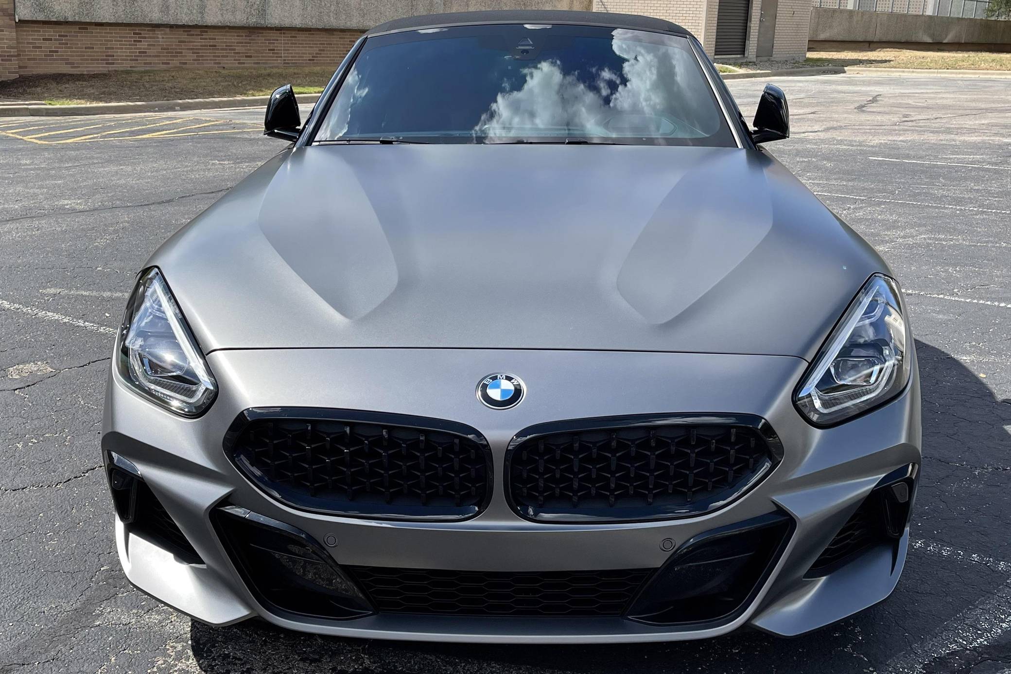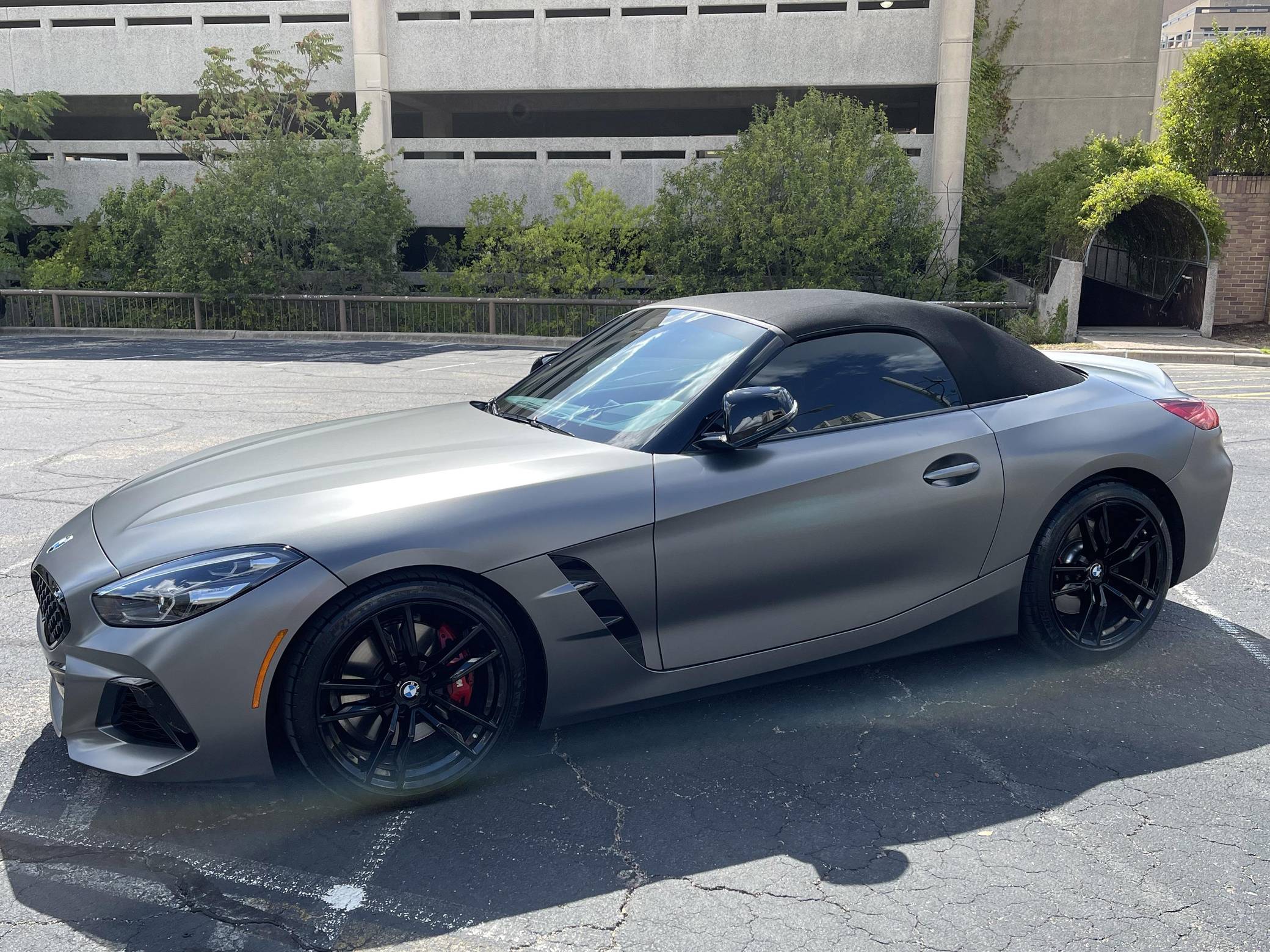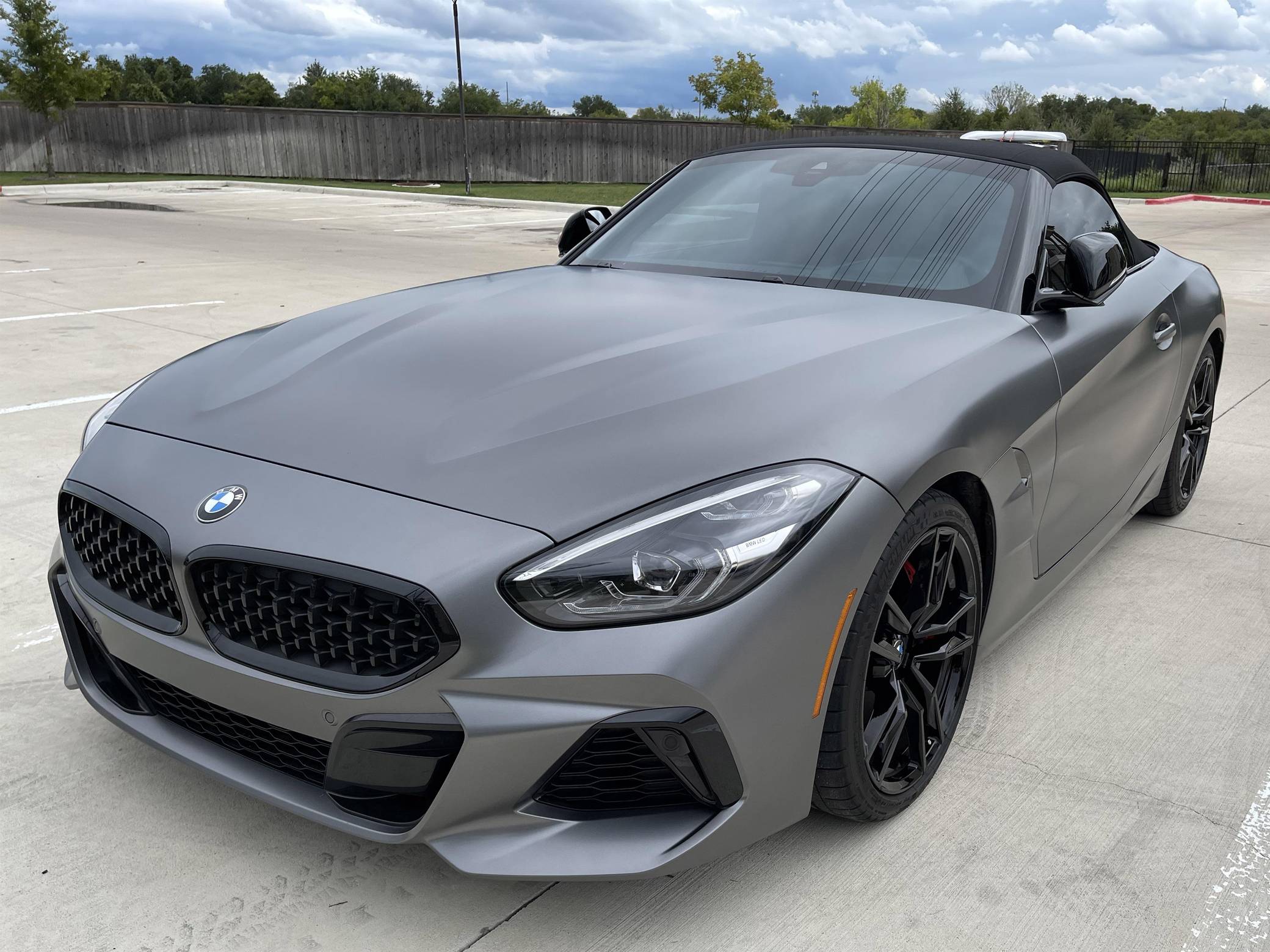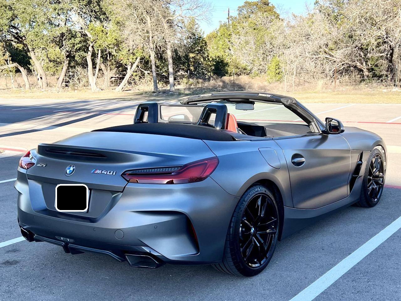 2021 BMW Z4 M40i, finished in Frozen Grey Metallic with a black soft top and a Magma Red interior. According to the build sheet provided in the gallery, factory equipment includes the Premium and Shadowline packages, Driving Assistant, M Sport brakes with red calipers, Vernasca leather upholstery, heated and power-adjustable seats, Park Distance Control (PDC), and ambient lighting. Modifications are limited to tinted windows. Called "G29" internally, the third-generation Z4 made its debut for 2018 as a soft top convertible to replace the hardtop-only E89-generation Z4. The G29 Z4 also offered enthusiasts a more sculpted exterior design, a nicer interior, and an available turbocharged straight-6 engine. Assembled in Austria, the G29-generation Z4 is built alongside the Toyota Supra. Power comes from a "B58" 3. 0-liter turbocharged straight-6, rated at 382 horsepower and 369 lb-ft of torque. Output is sent to the rear wheels via an 8-speed automatic transmission.