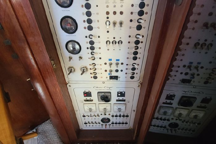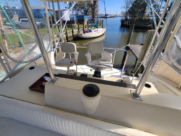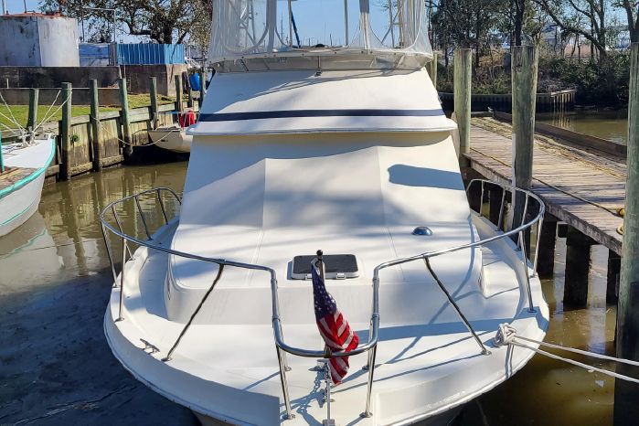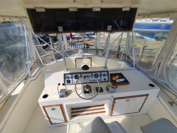 The Chris Craft 392 Commander is actually the old Uniflite 38 convertible dressed up in a more modern package. Chris Craft first marketed this boat in 1985 as the 382 Commander Sport Sedan - basically the late Uniflite 38 with a new name. The following year (1986) Chris Craft engineers redesigned the deckhouse and flybridge resulting in a much-improved profile. While the Chris 392 is light years ahead of the old Uniflite in appearance and decor, the well-known seakeeping properties of the original hull have been retained. The cockpit is large enough for a fighting chair, side decks are wide, and the bridge is arranged with bench seating forward of the helm. Beginning forward most is a bow anchor rode storage locker; next aft is the master stateroom fitted with a queen-size berth with storage compartment and drawers beneath, port and starboards small storage lockers, and a large hanging locker to starboard; master stateroom has a carpeted floor and side hull liner. Starboard side aft of the master stateroom is the guest stateroom fitted with upper and lower bunks and a large hanging locker. Portside aft of the master stateroom is a water closet with linoleum flooring, fitted with a toilet, shower stall, and lavatory/vanity. Centerline and up steps from the forward accommodation spaces and set to port is the galley with oak parquet flooring. Stepping up and aft of the galley above the engine room is the salon; starboard side forward salon is the AC and DC ships service electrical distribution panels. The salon is fitted with L shaped sleeper sofa, centerline aft most is the exit door to the cockpit.
