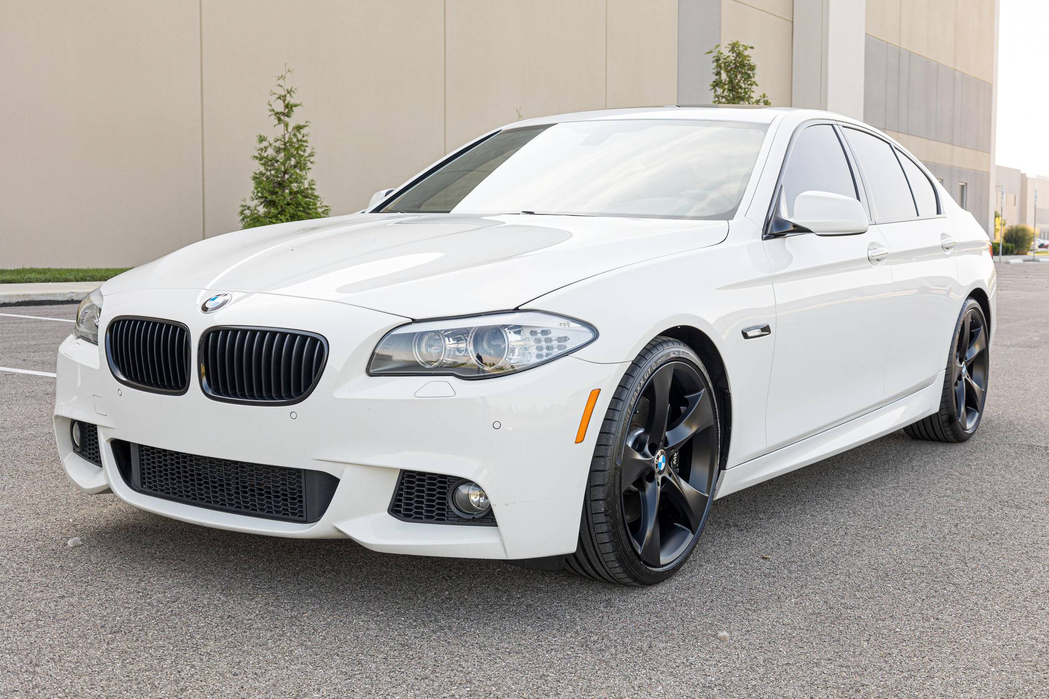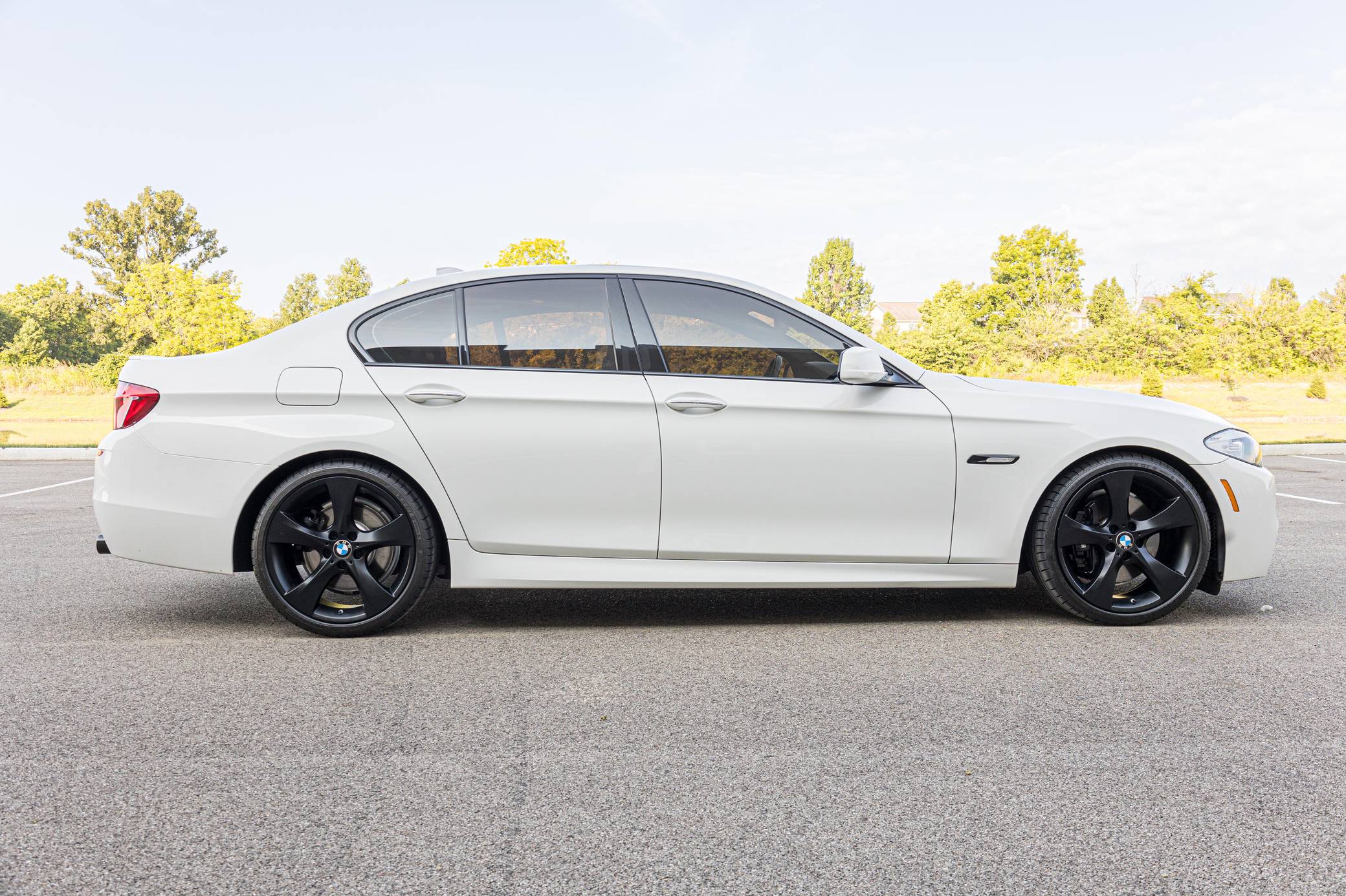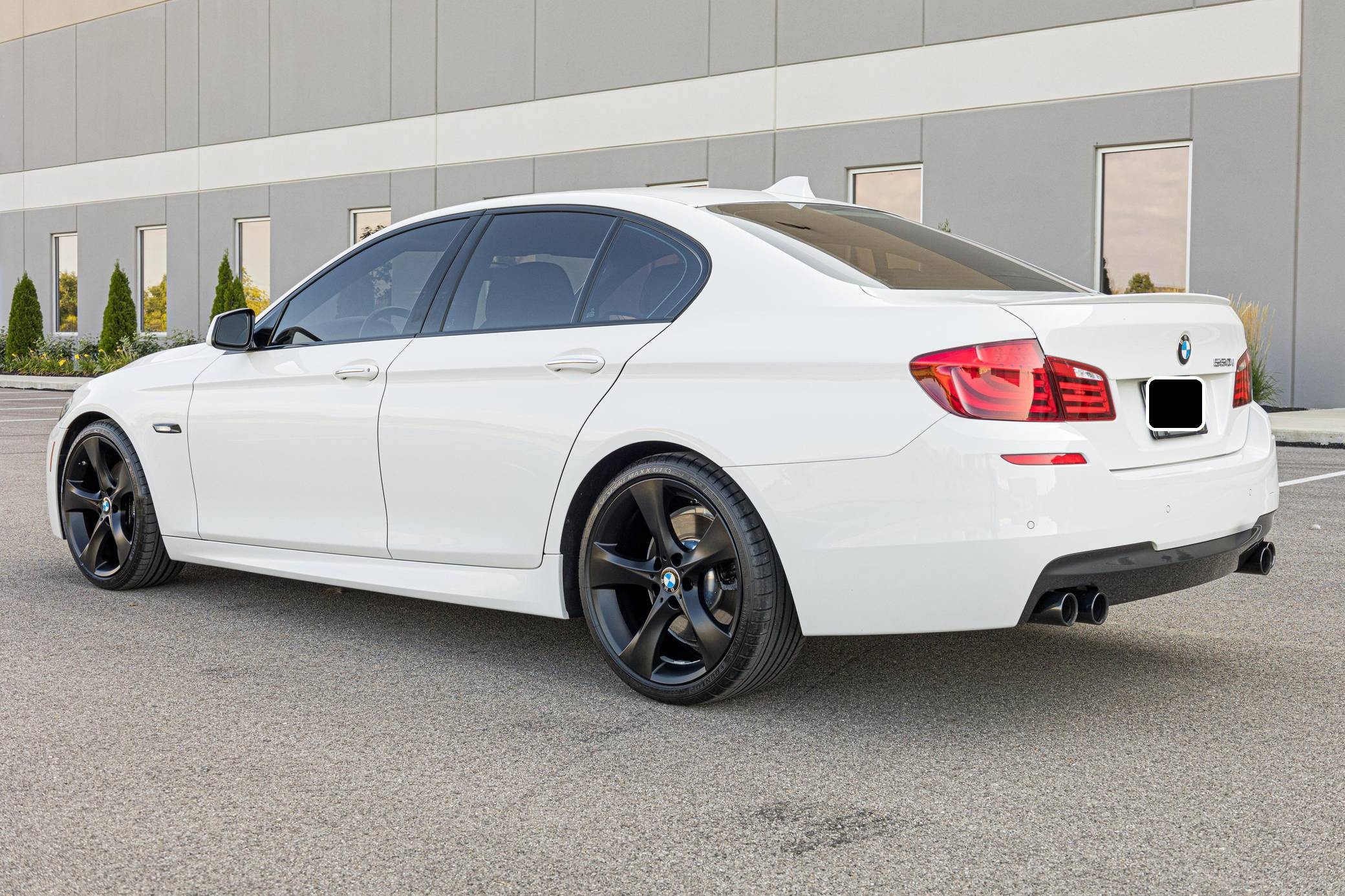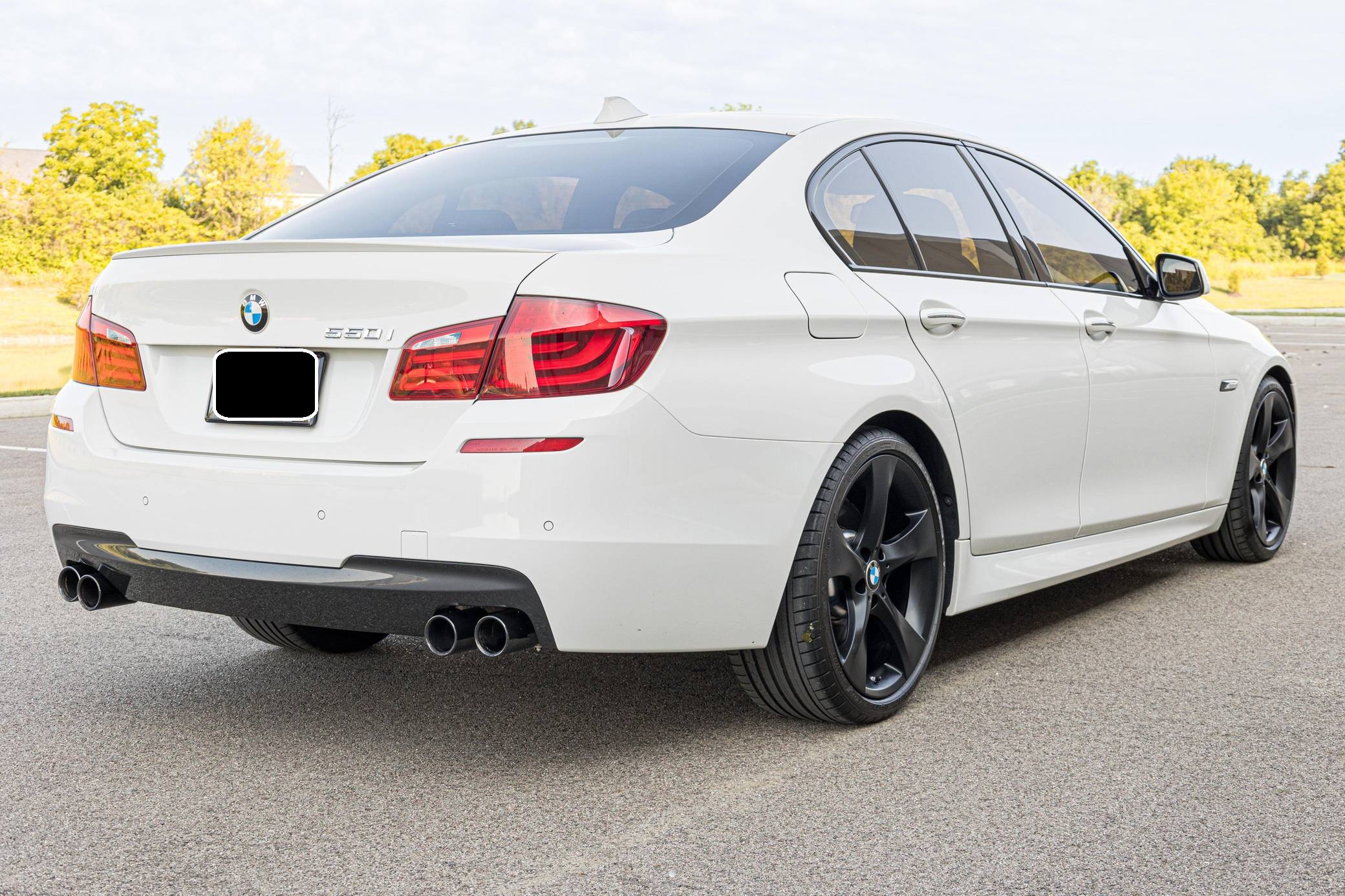 2013 BMW 550i, finished in Alpine White with a black interior. This 550i features the desirable 6-speed manual transmission. Modifications reported by the seller are limited to an exhaust system from a BMW M5, 20-inch Style 311 wheels powder coated black, black kidney grilles, and tinted windows. BMW released the F10-generation 5 Series for the 2011 model year. It wore a less extroverted design than its predecessor, and engineers overhauled nearly every part of the chassis to ensure it remained the driver's choice in the segment in the face of growing competition. Available at launch, the 550i landed at the top of the non-M-tuned range. Power comes from an "N63" twin-turbocharged 4. 4-liter V8 engine, rated at 400 horsepower and 450 lb-ft of torque. Output is sent to the rear wheels via a 6-speed manual transmission.