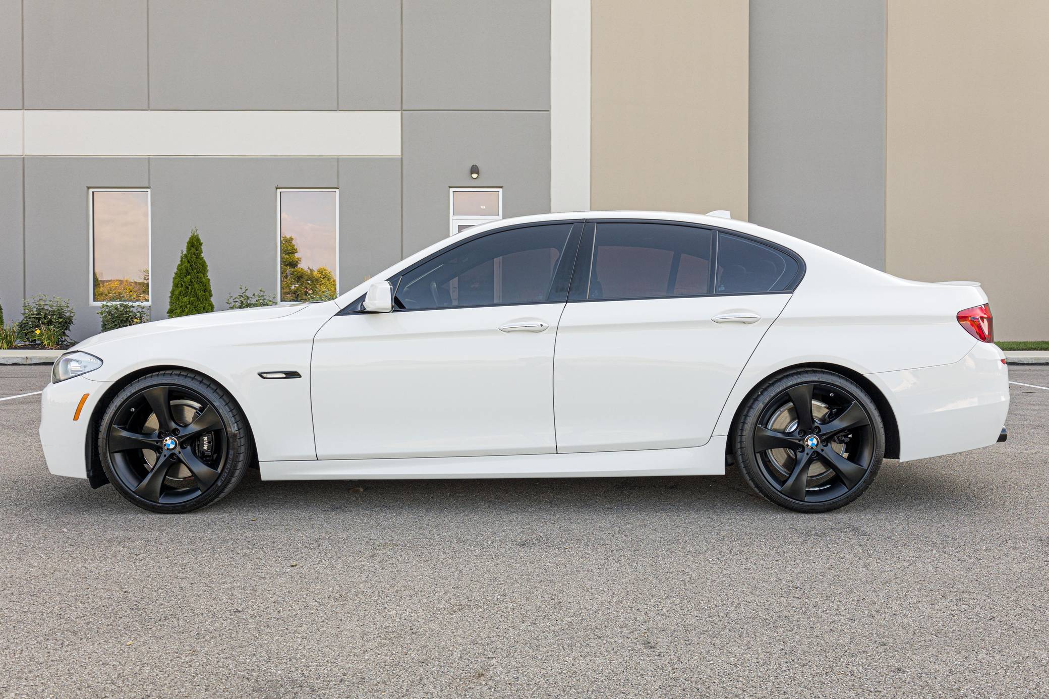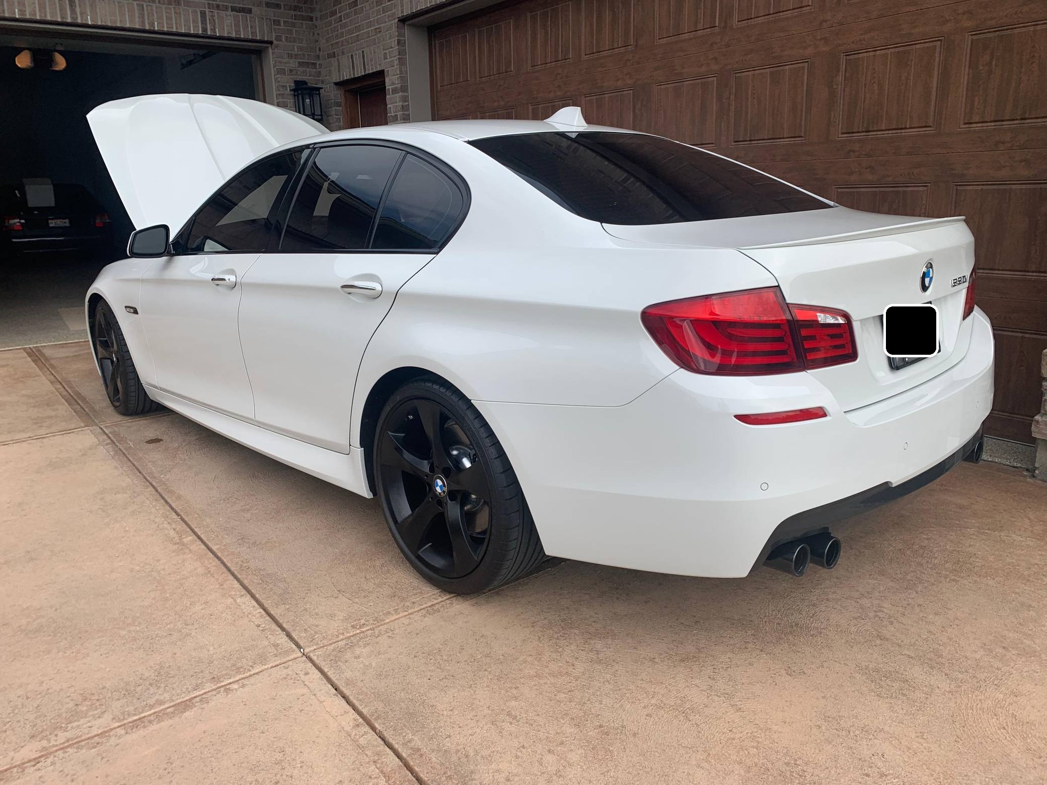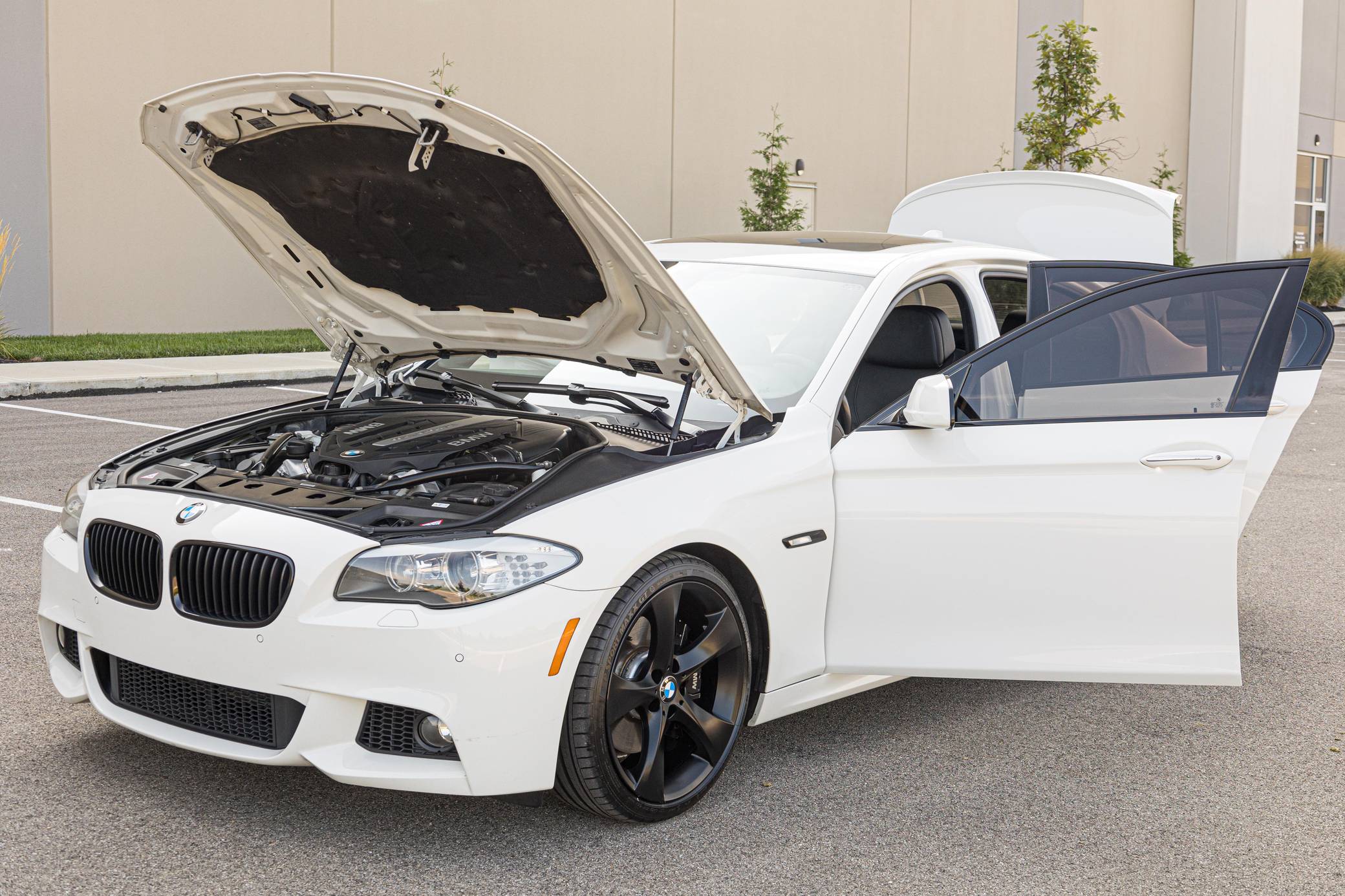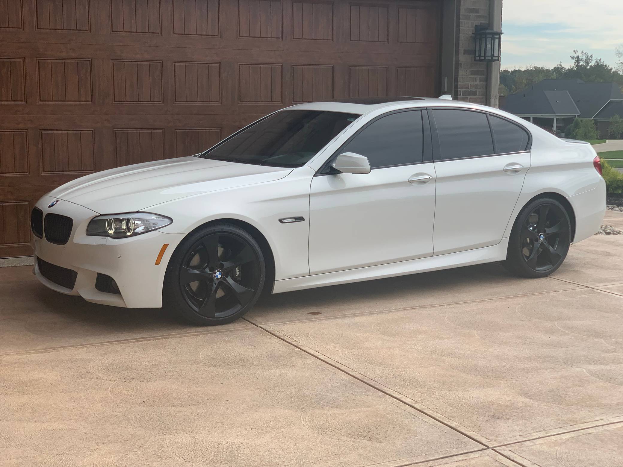 2013 BMW 550i, finished in Alpine White with a black interior. This 550i features the desirable 6-speed manual transmission. Modifications reported by the seller are limited to an exhaust system from a BMW M5, 20-inch Style 311 wheels powder coated black, black kidney grilles, and tinted windows. BMW released the F10-generation 5 Series for the 2011 model year. It wore a less extroverted design than its predecessor, and engineers overhauled nearly every part of the chassis to ensure it remained the driver's choice in the segment in the face of growing competition. Available at launch, the 550i landed at the top of the non-M-tuned range. Power comes from an "N63" twin-turbocharged 4. 4-liter V8 engine, rated at 400 horsepower and 450 lb-ft of torque. Output is sent to the rear wheels via a 6-speed manual transmission.
