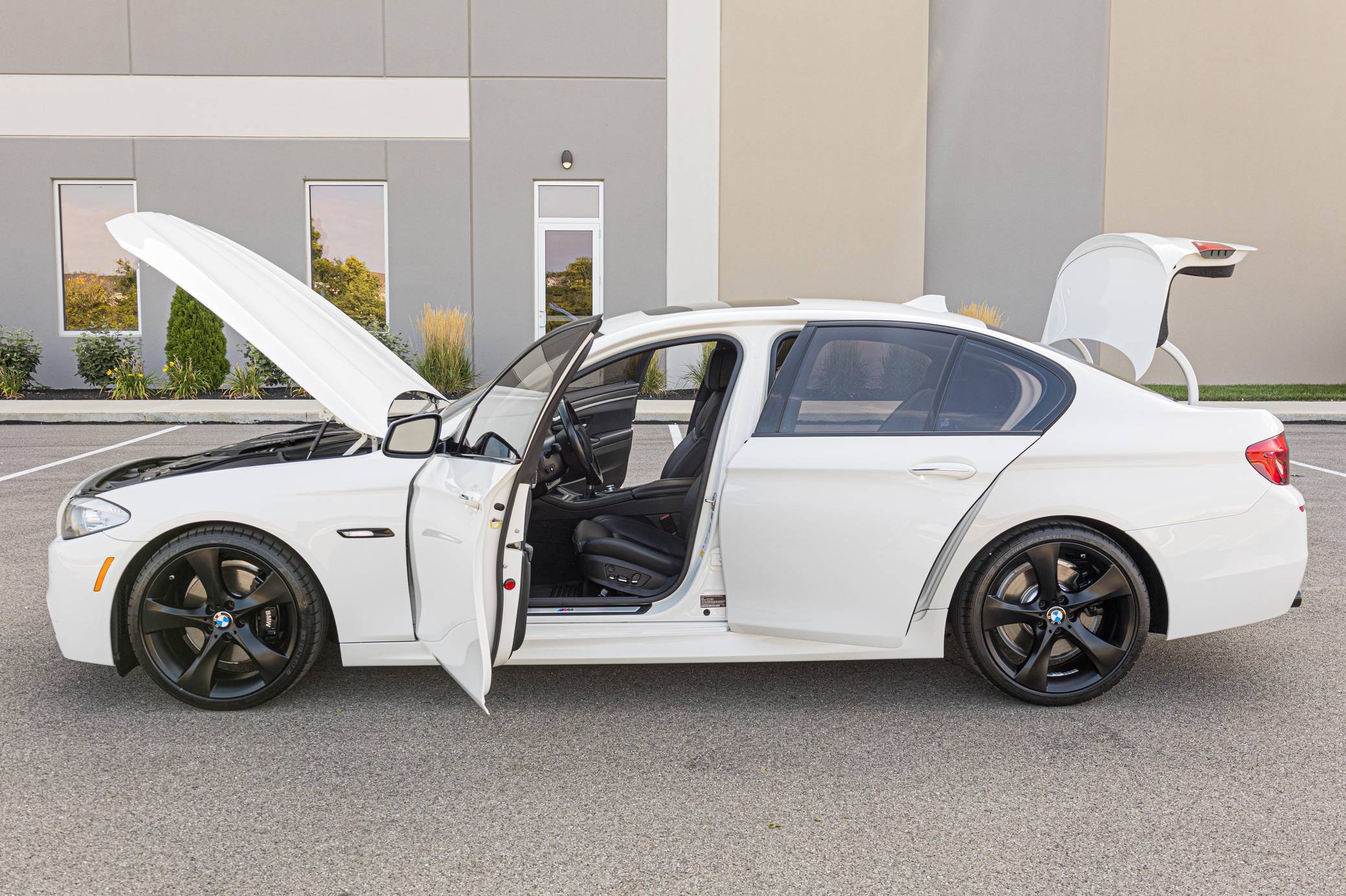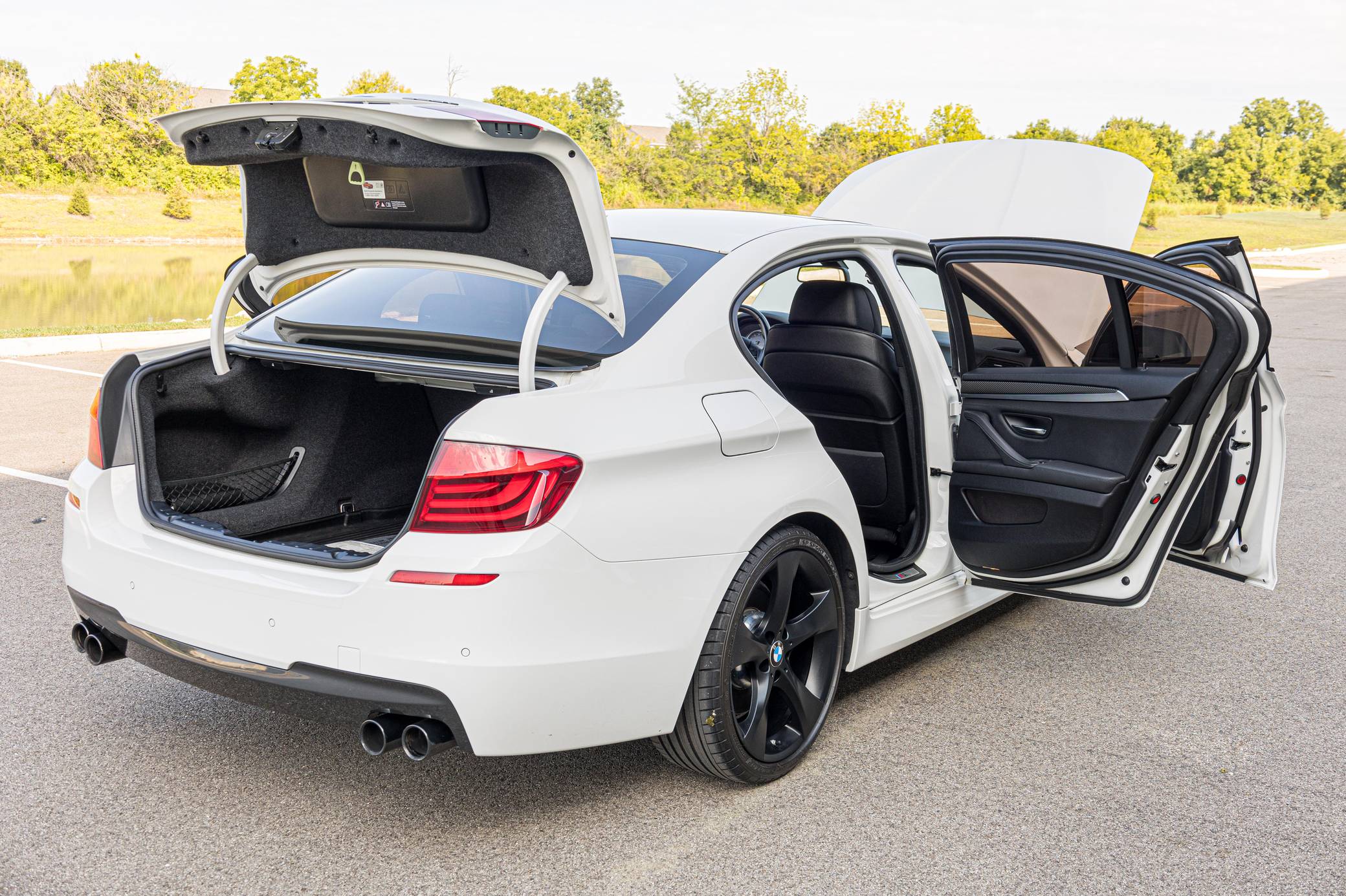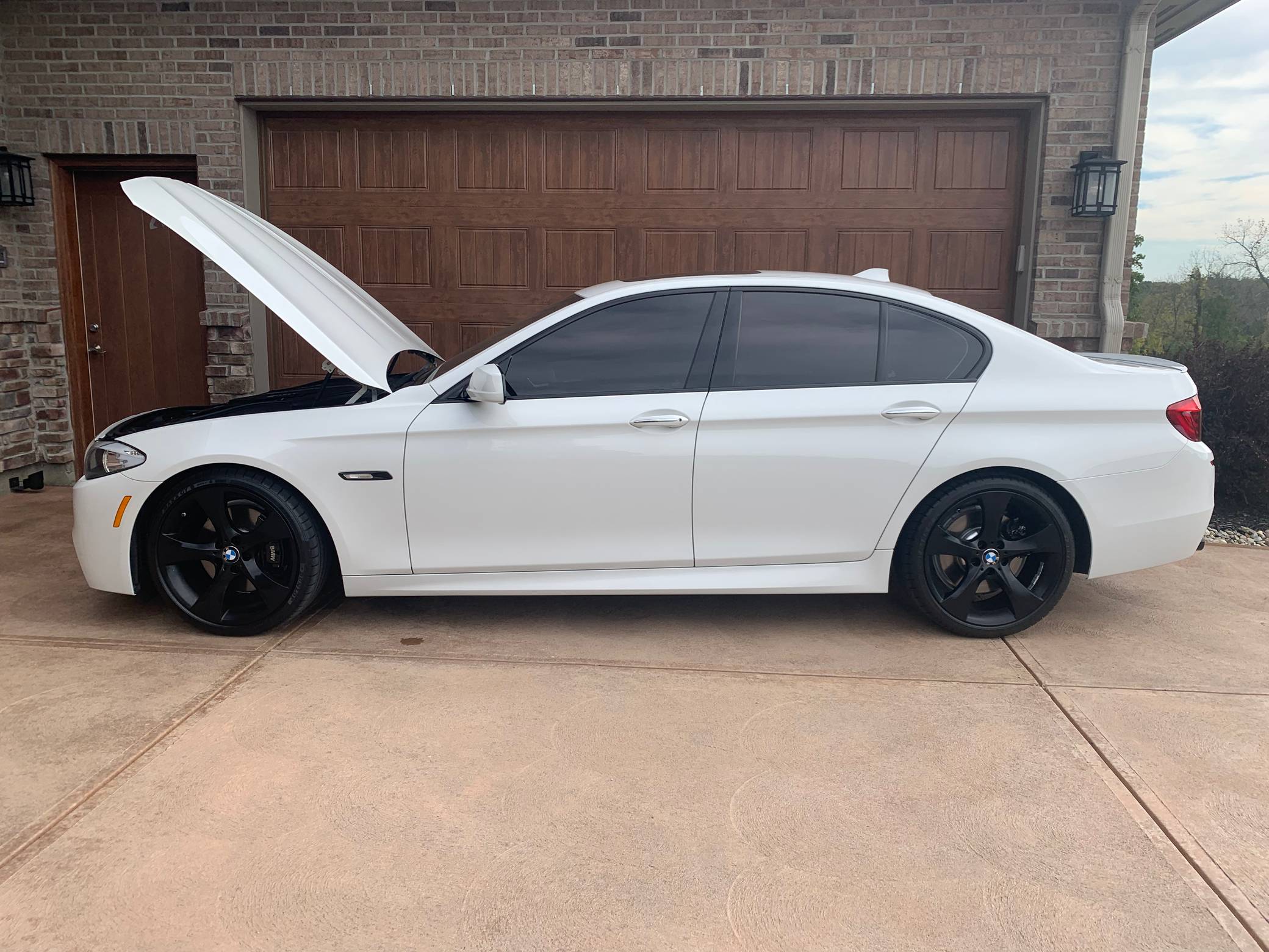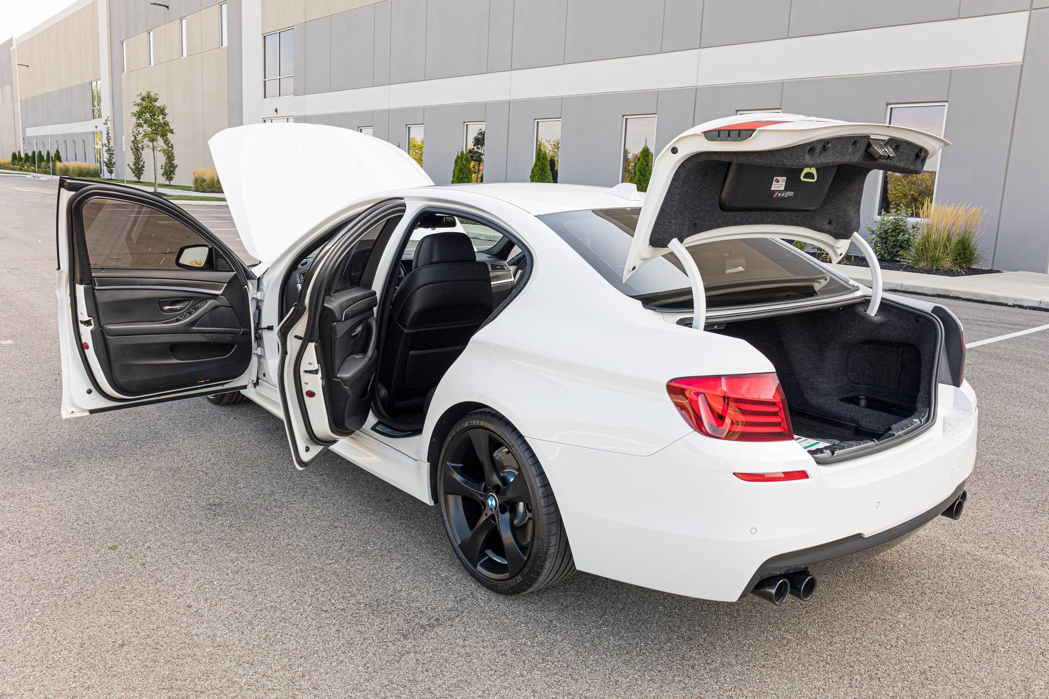 2013 BMW 550i, finished in Alpine White with a black interior. This 550i features the desirable 6-speed manual transmission. Modifications reported by the seller are limited to an exhaust system from a BMW M5, 20-inch Style 311 wheels powder coated black, black kidney grilles, and tinted windows. BMW released the F10-generation 5 Series for the 2011 model year. It wore a less extroverted design than its predecessor, and engineers overhauled nearly every part of the chassis to ensure it remained the driver's choice in the segment in the face of growing competition. Available at launch, the 550i landed at the top of the non-M-tuned range. Power comes from an "N63" twin-turbocharged 4. 4-liter V8 engine, rated at 400 horsepower and 450 lb-ft of torque. Output is sent to the rear wheels via a 6-speed manual transmission.