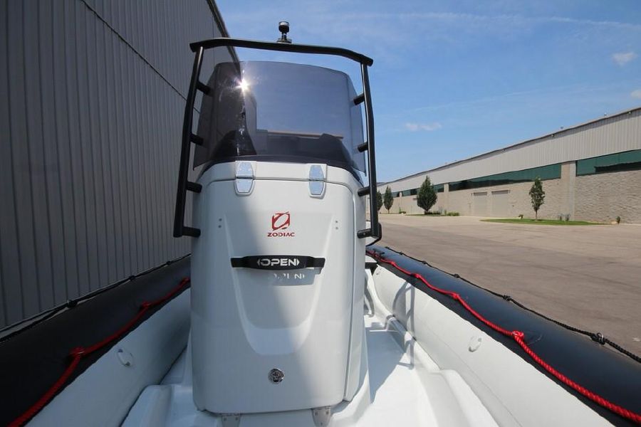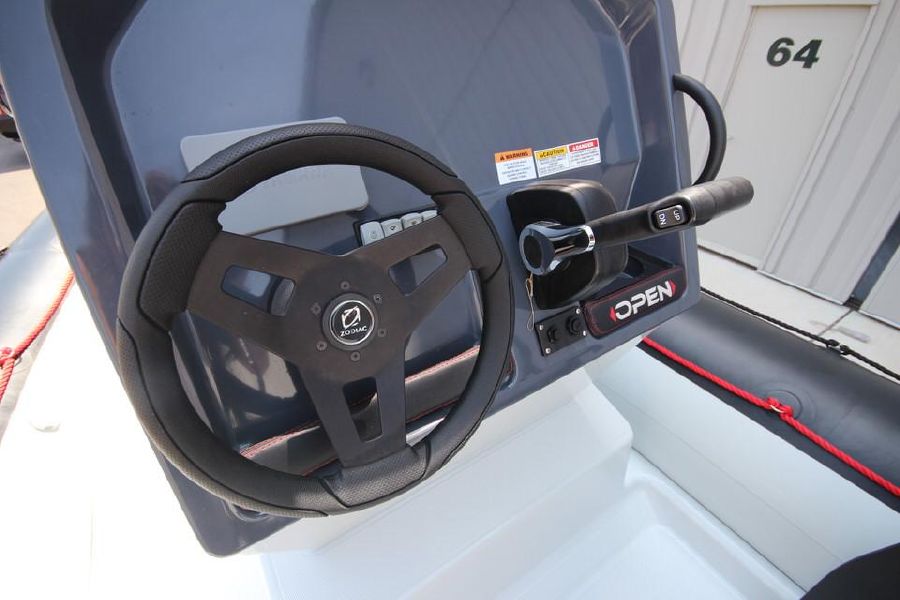 An adventurer style with sleek lines, a perfectly ergonomic cockpit, an exceptional reinforced deep-V hull offering control and stability through hazardous and rough seas, OPEN 5.5 is the SUV of the seas. Integrated fuel tank (26 Gallon / 100 L) + water/fuel separator, Battery switch, Navigation lights, Tilt forward console with front hatch, large dashboard surface, 2 empty-pockets, 12V/USB socket and cupholders, Protective windscreen, Mechanical steering system, Pilot/co-pilot leaning post, storage, Stern seats with removable backrests, 14 Gallon (54L) cooler, Bathing ladder, 2 paddles, foot pump & pressure gauge, repair kit and owner’s manual, Hull polyester, Anchor locker, 2 high volume bailers, Bollard, 2 rear handles for passengers, 1 bow mooring bollard and 2 stern cleats, 1 bow ring and 2 towing rings, Bilge pump, Buoyancy tube, Removable tube, Strongman or Neoprene fabric, Fiberglass bow step including anchor roller, Bumper Cone, Semi-recessed valves, Double grab line, Large profile rub strake, Bumper cones.