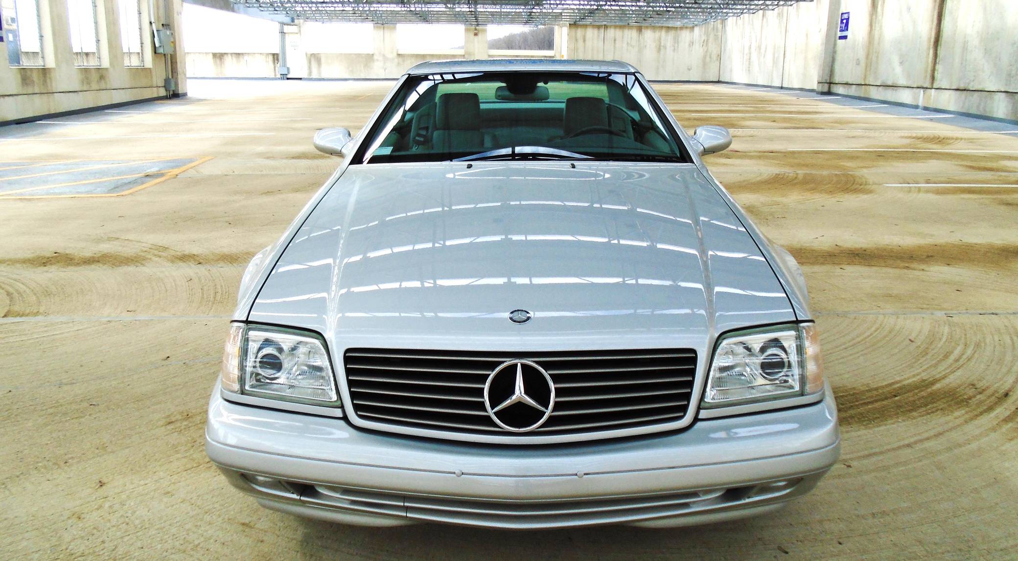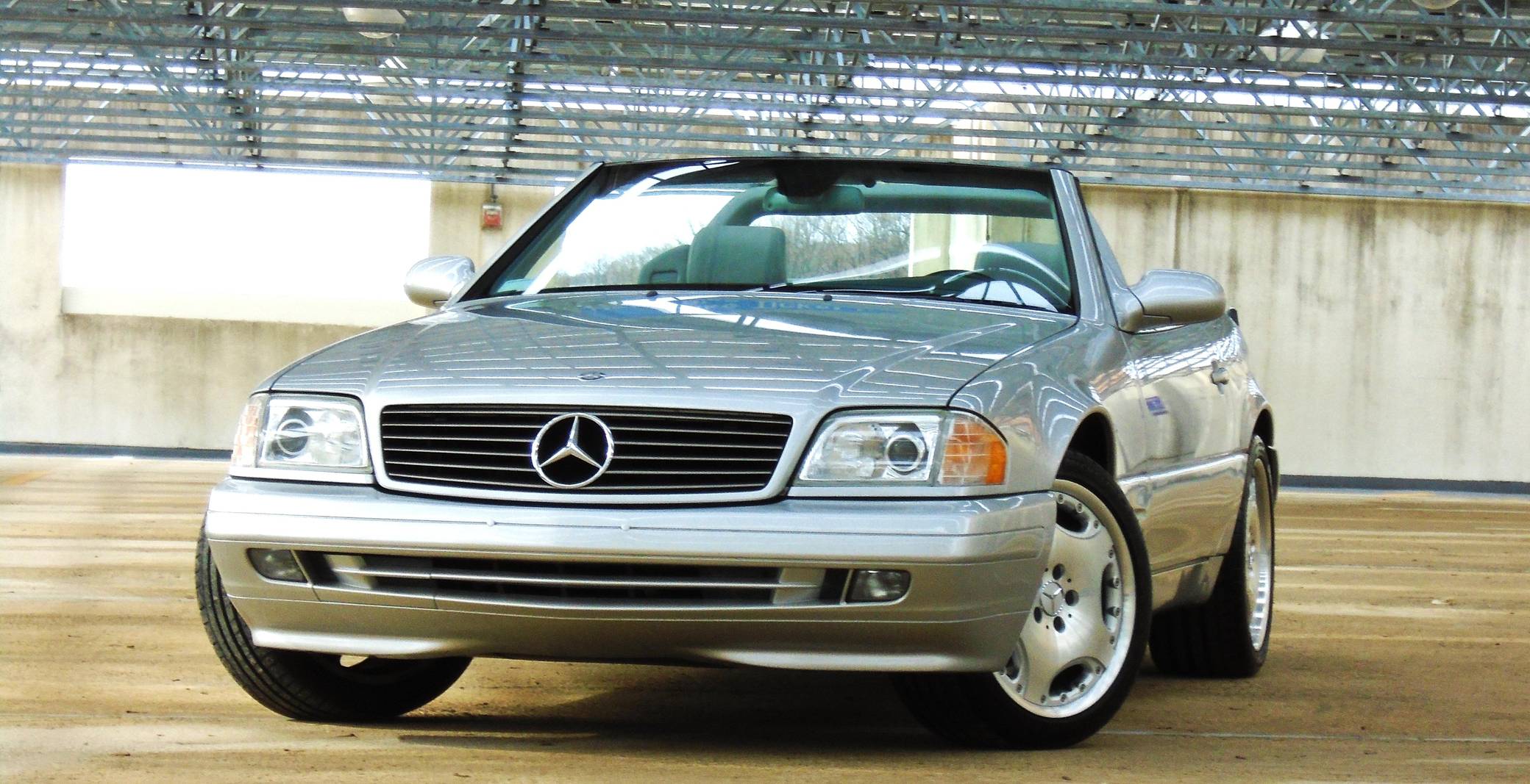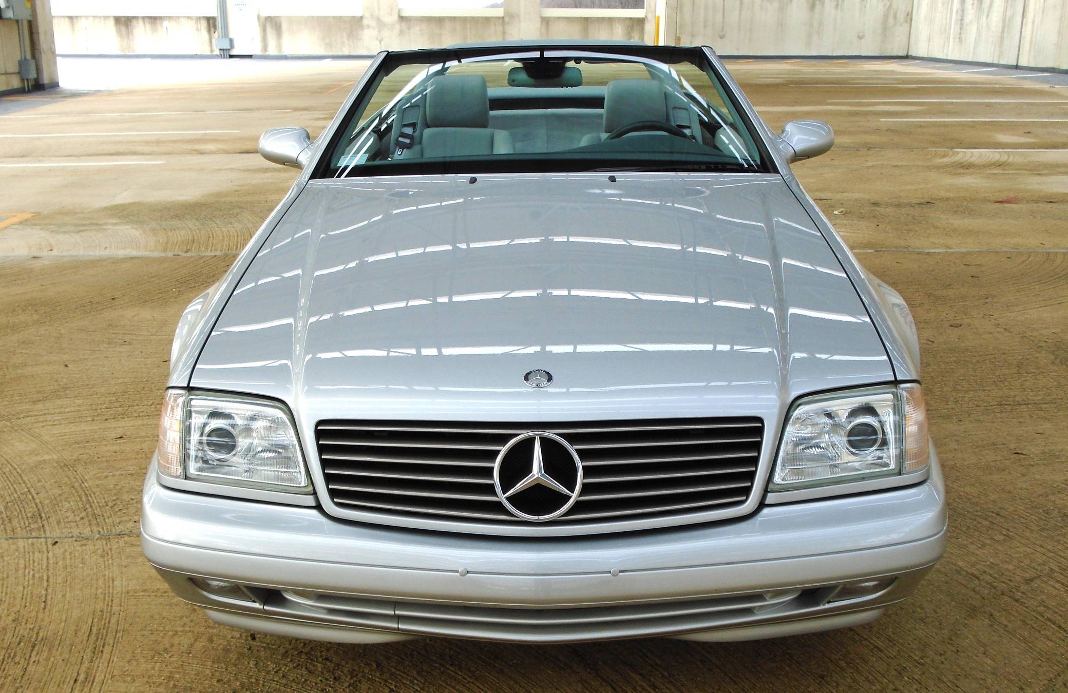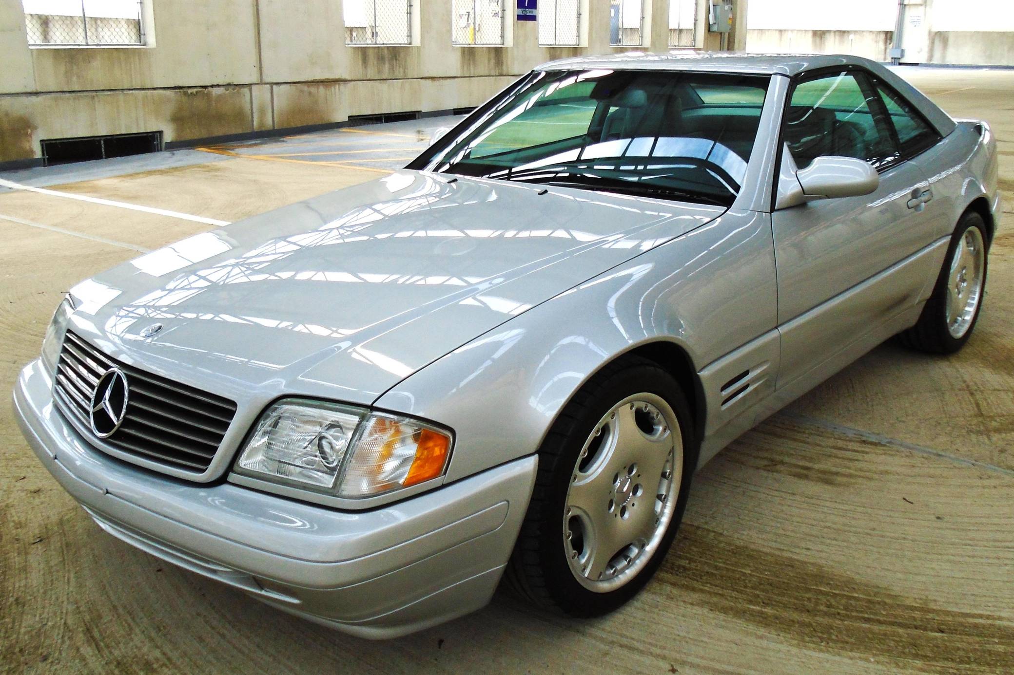 1999 Mercedes-Benz SL500, finished in Brilliant Silver Metallic with a gray interior. The odometer currently displays about 19,500 miles. According to the build sheet provided in the gallery, factory equipment includes a power-retractable soft top, Nappa leather seats, memory function for seats and mirrors, burred walnut root interior trim, a Bose premium audio system, and more. A factory color-matched hardtop is also included. Modifications are limited to a set of 18-inch Lorinser wheels. Mercedes-Benz sold the "R129"-generation SL from 1990 to 2002, and several visual cues (like the shape of the vents behind the front wheels and the rear lights) identify this SL500 as one of the later models built. It's quicker than its predecessor, the long-lived "R107" model, yet it's far simpler than the "R230" model introduced in 2003. Power comes from an "M113" 5. 0-liter V8, rated at 302 horsepower and 339 lb-ft of torque. Output is sent to the rear wheels via a 5-speed automatic transmission.