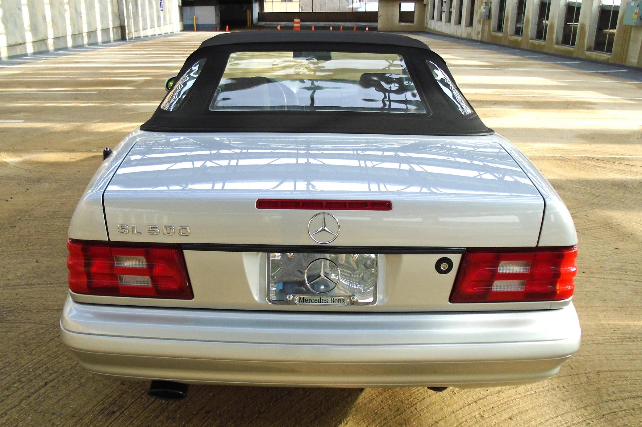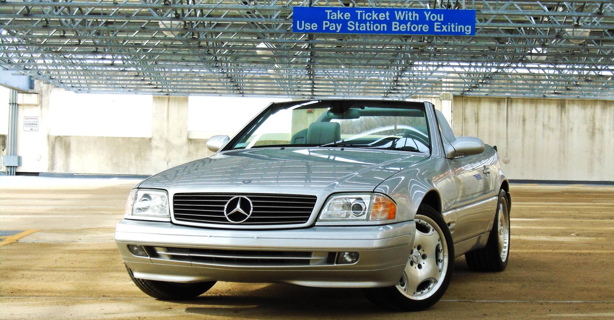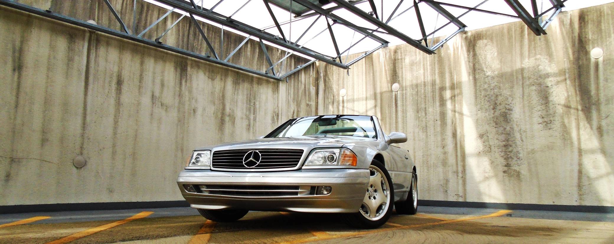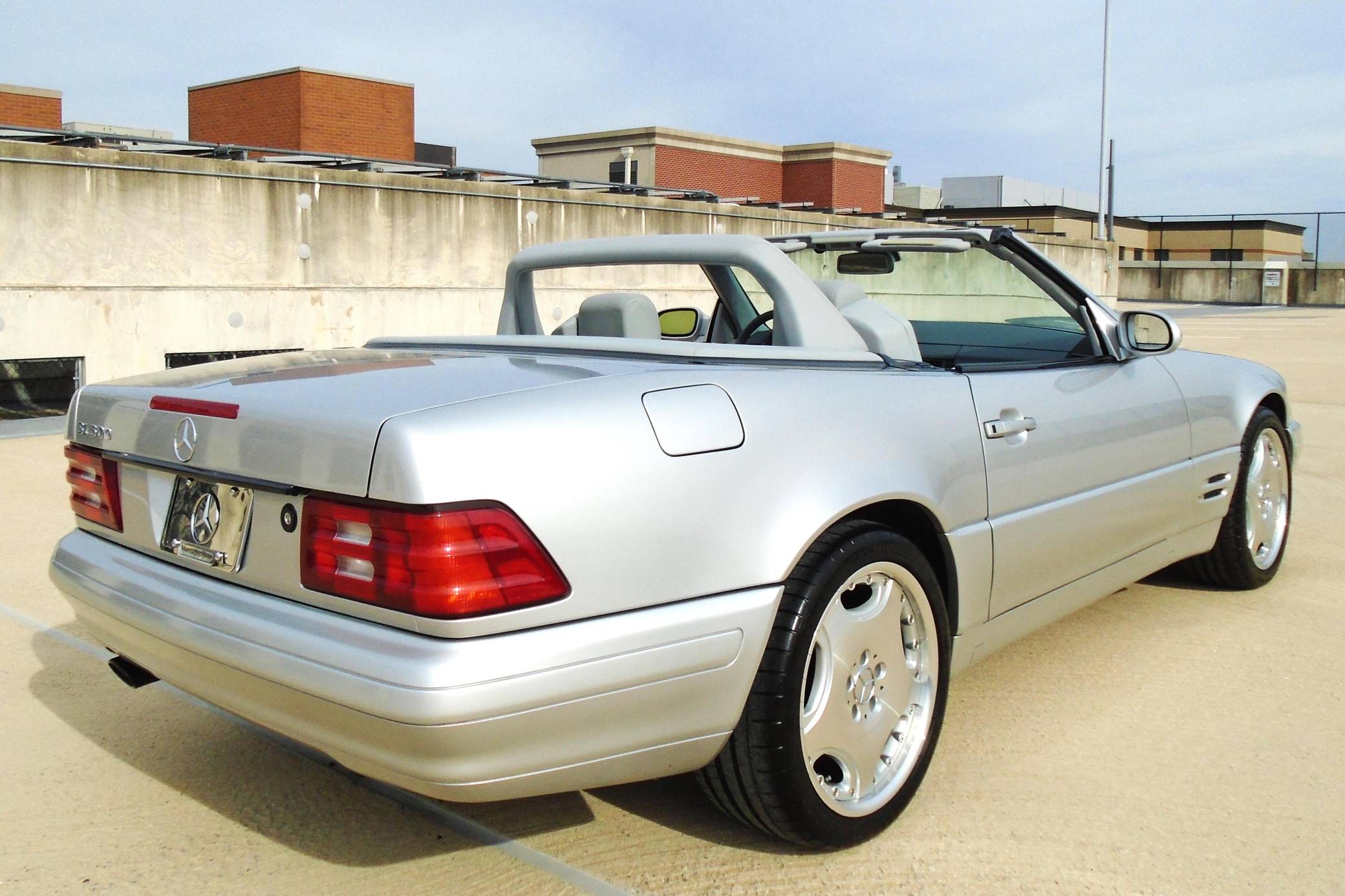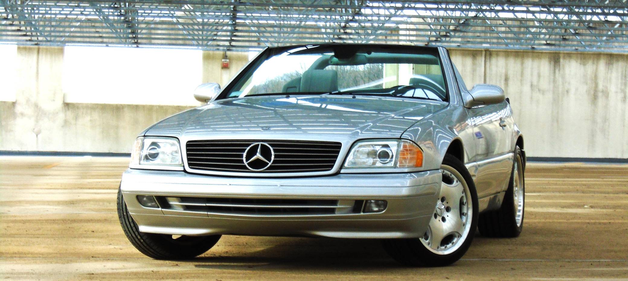 1999 Mercedes-Benz SL500, finished in Brilliant Silver Metallic with a gray interior. The odometer currently displays about 19,500 miles. According to the build sheet provided in the gallery, factory equipment includes a power-retractable soft top, Nappa leather seats, memory function for seats and mirrors, burred walnut root interior trim, a Bose premium audio system, and more. A factory color-matched hardtop is also included. Modifications are limited to a set of 18-inch Lorinser wheels. Mercedes-Benz sold the "R129"-generation SL from 1990 to 2002, and several visual cues (like the shape of the vents behind the front wheels and the rear lights) identify this SL500 as one of the later models built. It's quicker than its predecessor, the long-lived "R107" model, yet it's far simpler than the "R230" model introduced in 2003. Power comes from an "M113" 5. 0-liter V8, rated at 302 horsepower and 339 lb-ft of torque. Output is sent to the rear wheels via a 5-speed automatic transmission.