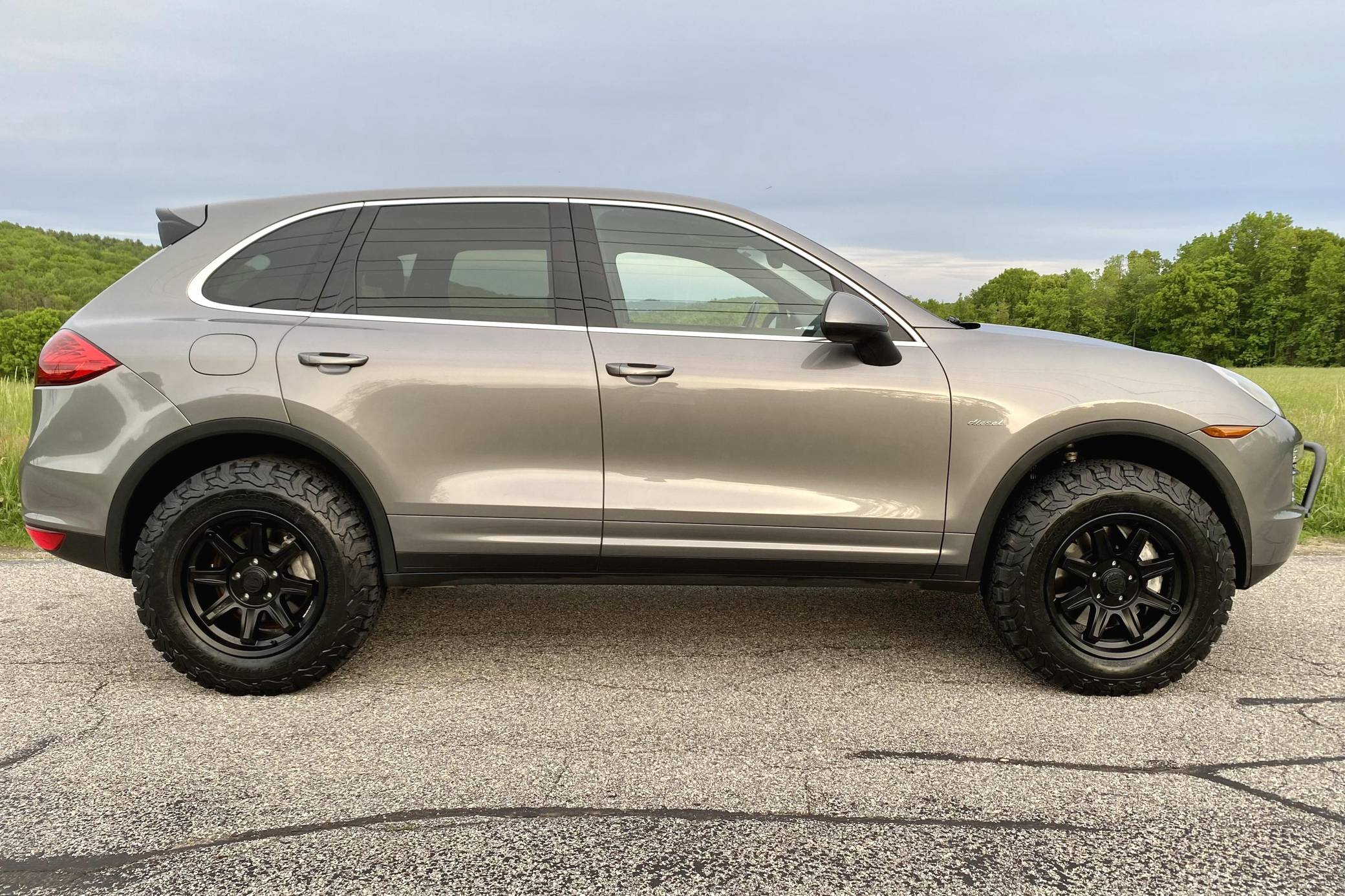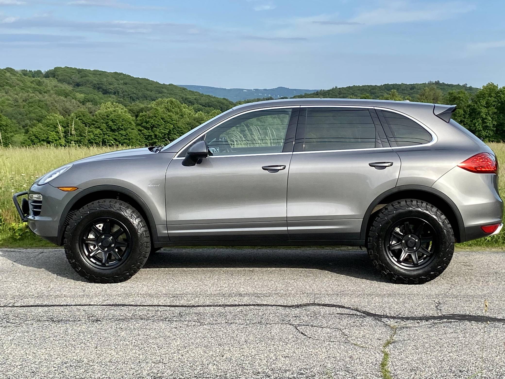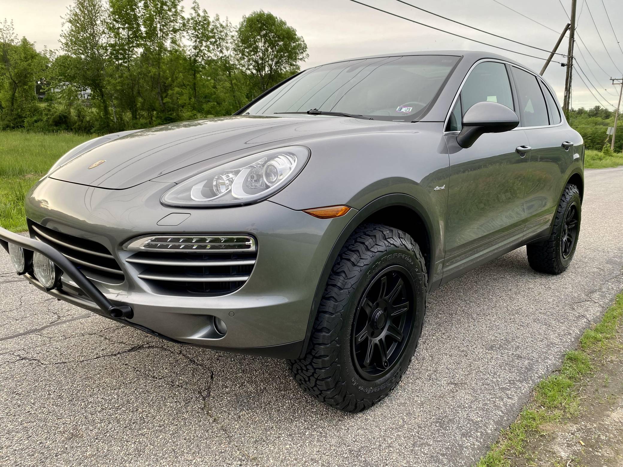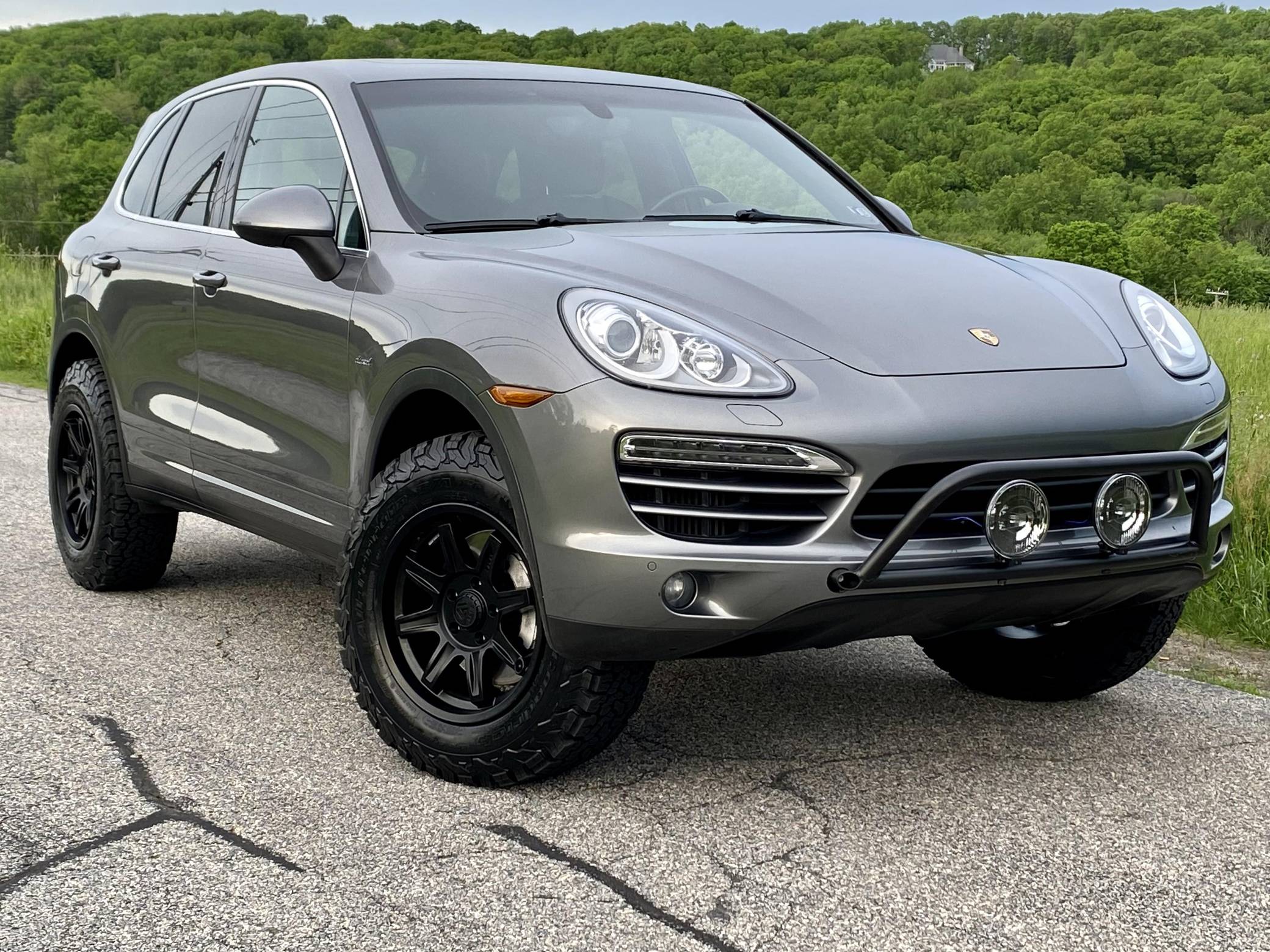 2014 Porsche Cayenne Diesel, finished in Meteor Grey Metallic with a black interior. A build sheet is provided in the photo gallery, and a partial list of notable equipment includes front fog lights, a rear roof spoiler, a panoramic sunroof, leather-wrapped multi-function steering wheel, power-adjustable and heated front seats, leather upholstery, a center touchscreen infotainment system, and a navigation system. Modifications reported by the seller include 18-inch ALPHA wheels with BFGoodrich All-Terrain T/A KO2 tires (size LT255/70 R18), a 2-inch lift kit, a Eurowise bull bar, and Hella Black Magic lights. A sticker under the hood indicates that this Cayenne had the diesel emissions fix performed in February 2018. Released for the 2011 model year, the second-generation Cayenne (called "958" internally) was slightly bigger and significantly lighter than its predecessor. It offered a smoother ride thanks to additional technology and luxury features, it was just as capable off-road, and critics agreed it was noticeably sportier than the first-generation model. Production ended in 2017. Power comes from a 3. 0-liter turbodiesel V6, rated at 240 horsepower and 406 lb-ft of torque. Output is sent to all four wheels via an 8-speed automatic transmission. The Cayenne Diesel's towing capacity is listed at 7,716 pounds.