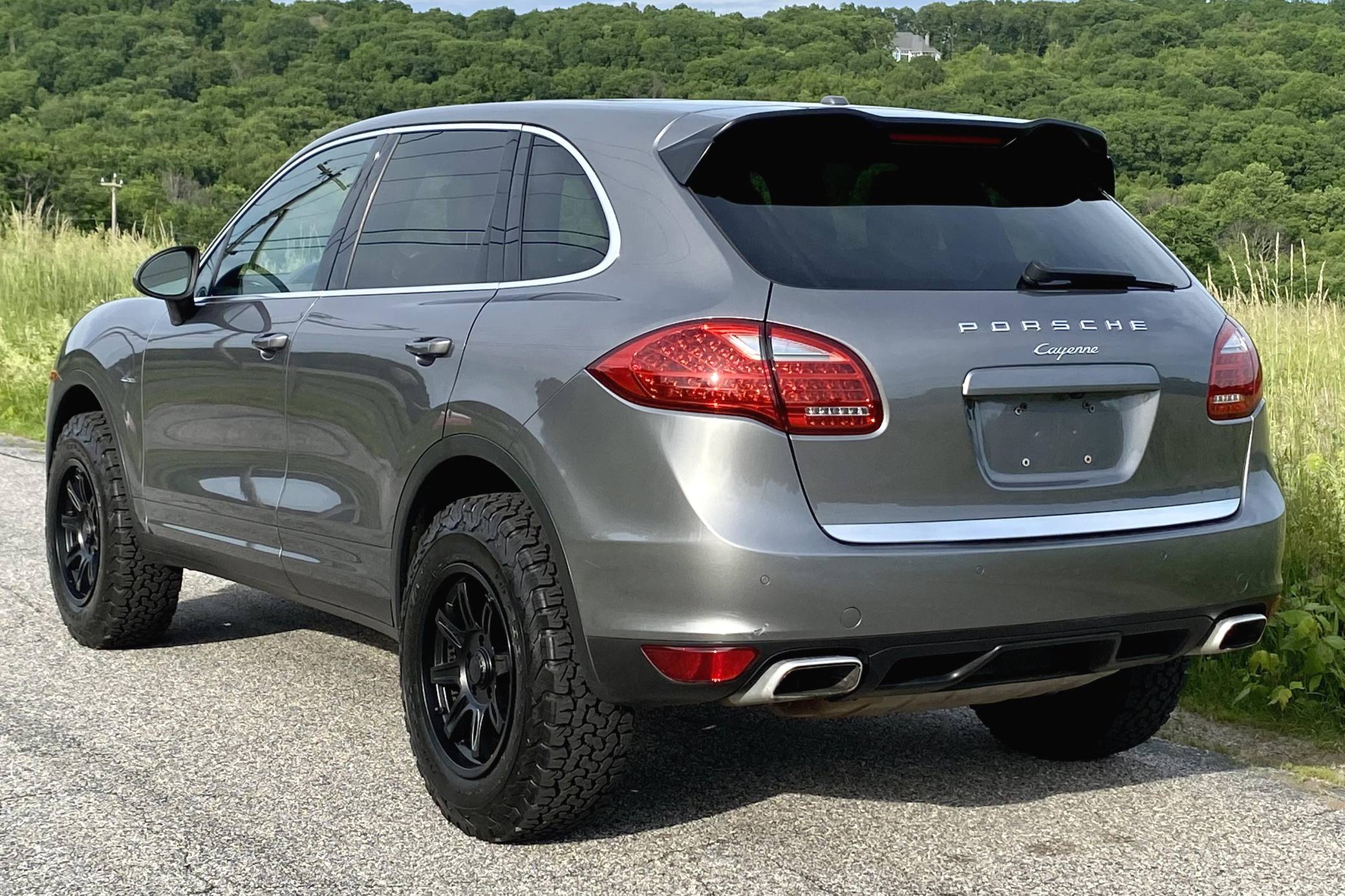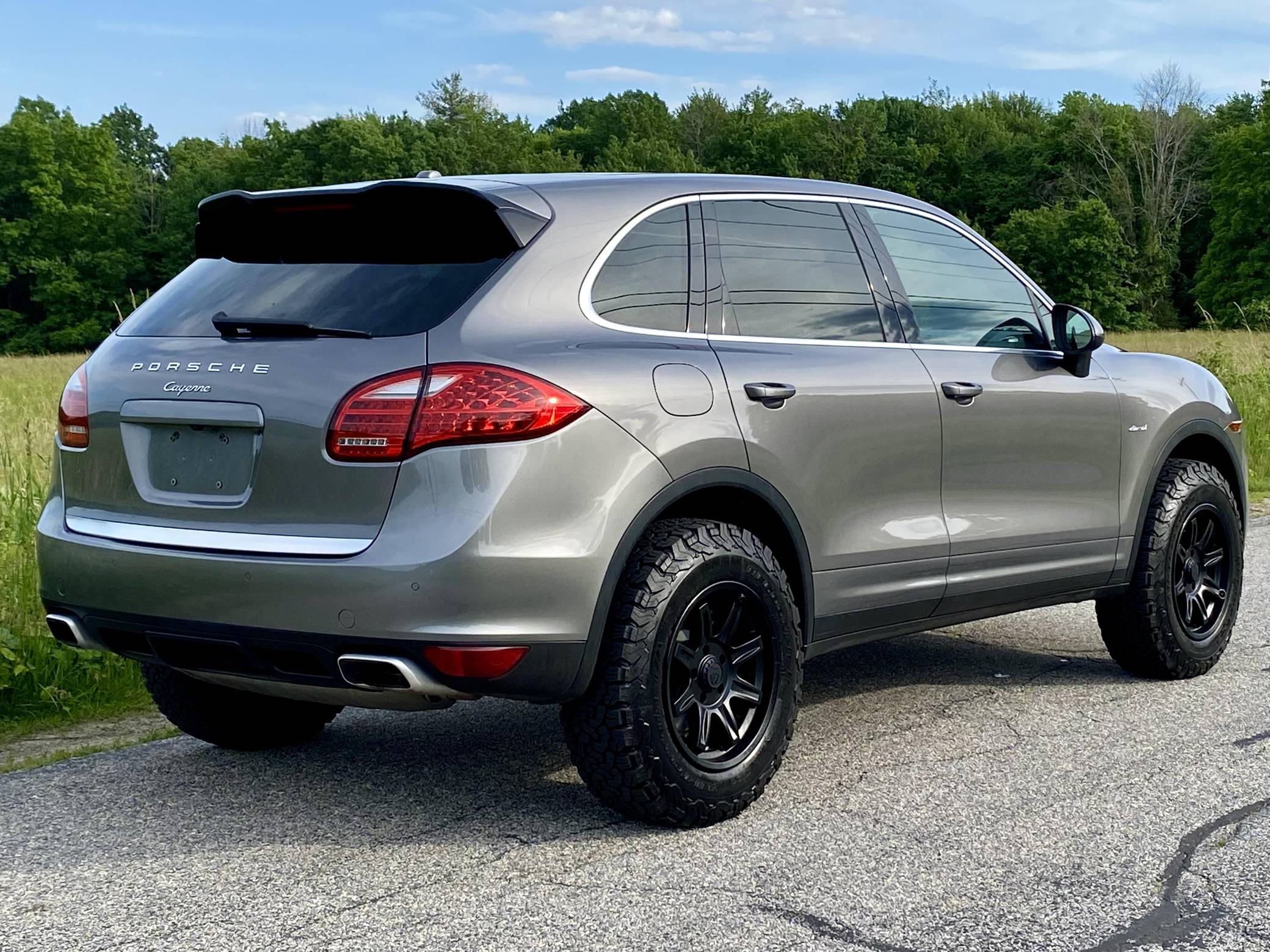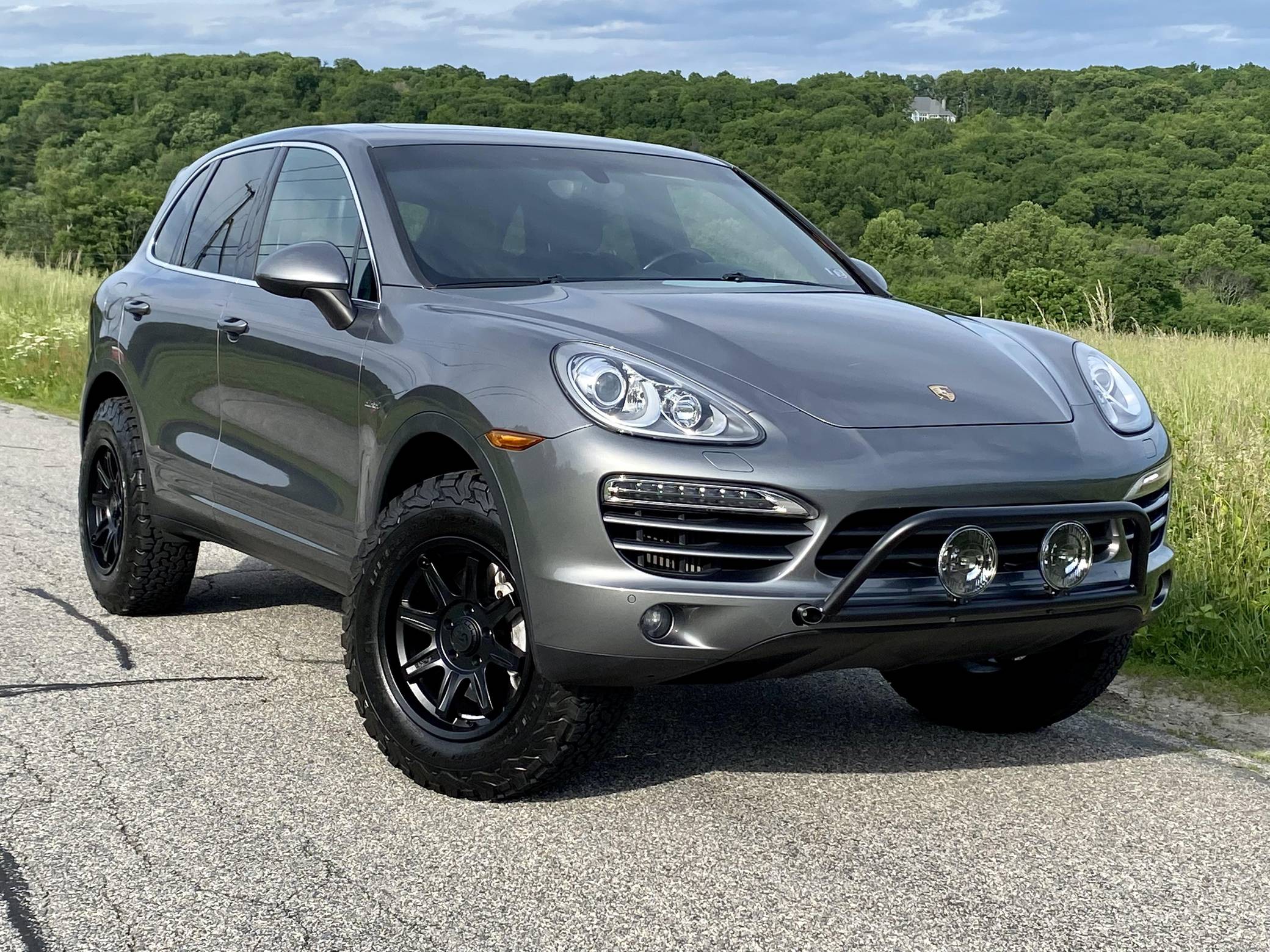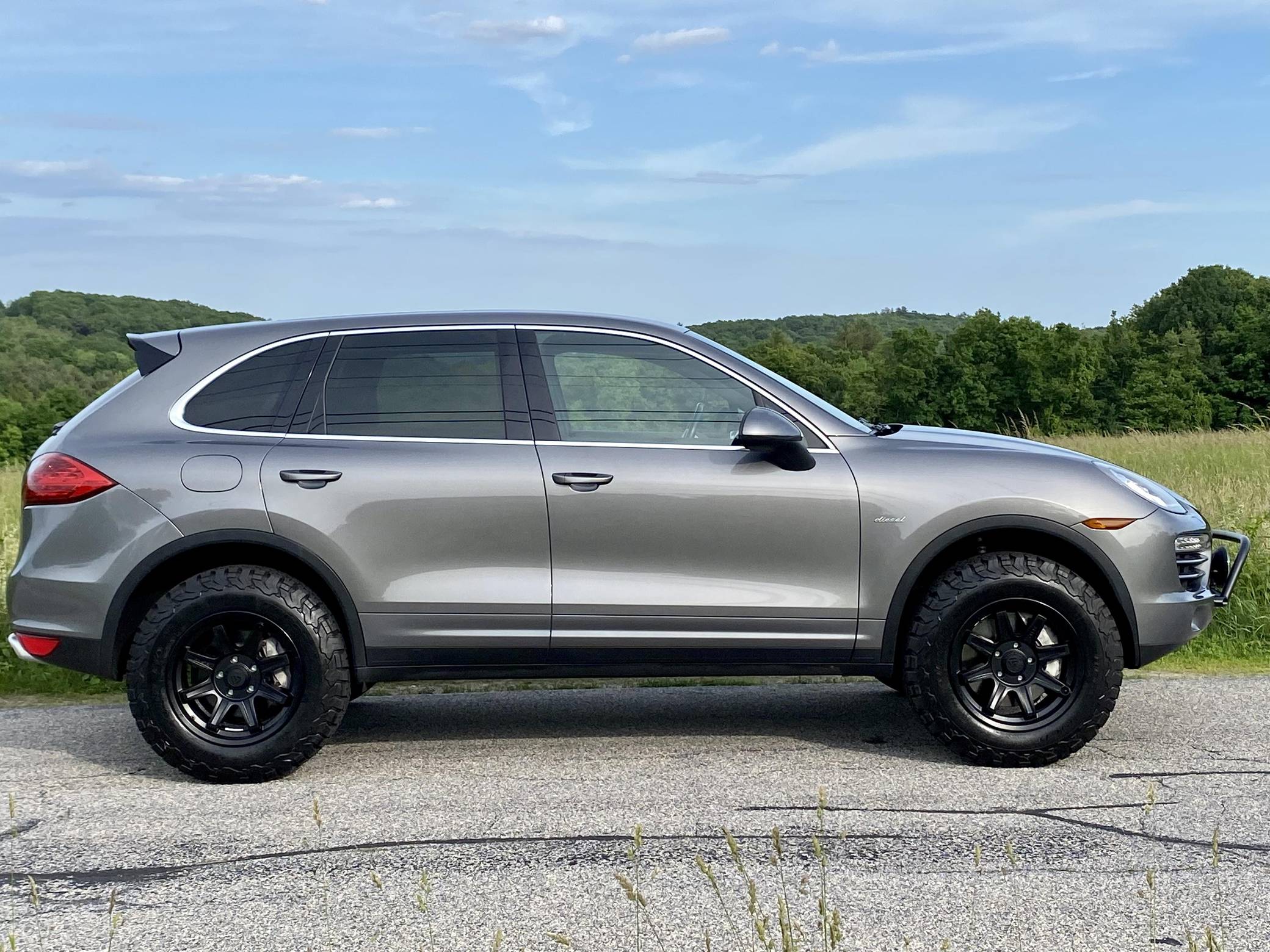 2014 Porsche Cayenne Diesel, finished in Meteor Grey Metallic with a black interior. A build sheet is provided in the photo gallery, and a partial list of notable equipment includes front fog lights, a rear roof spoiler, a panoramic sunroof, leather-wrapped multi-function steering wheel, power-adjustable and heated front seats, leather upholstery, a center touchscreen infotainment system, and a navigation system. Modifications reported by the seller include 18-inch ALPHA wheels with BFGoodrich All-Terrain T/A KO2 tires (size LT255/70 R18), a 2-inch lift kit, a Eurowise bull bar, and Hella Black Magic lights. A sticker under the hood indicates that this Cayenne had the diesel emissions fix performed in February 2018. Released for the 2011 model year, the second-generation Cayenne (called "958" internally) was slightly bigger and significantly lighter than its predecessor. It offered a smoother ride thanks to additional technology and luxury features, it was just as capable off-road, and critics agreed it was noticeably sportier than the first-generation model. Production ended in 2017. Power comes from a 3. 0-liter turbodiesel V6, rated at 240 horsepower and 406 lb-ft of torque. Output is sent to all four wheels via an 8-speed automatic transmission. The Cayenne Diesel's towing capacity is listed at 7,716 pounds.