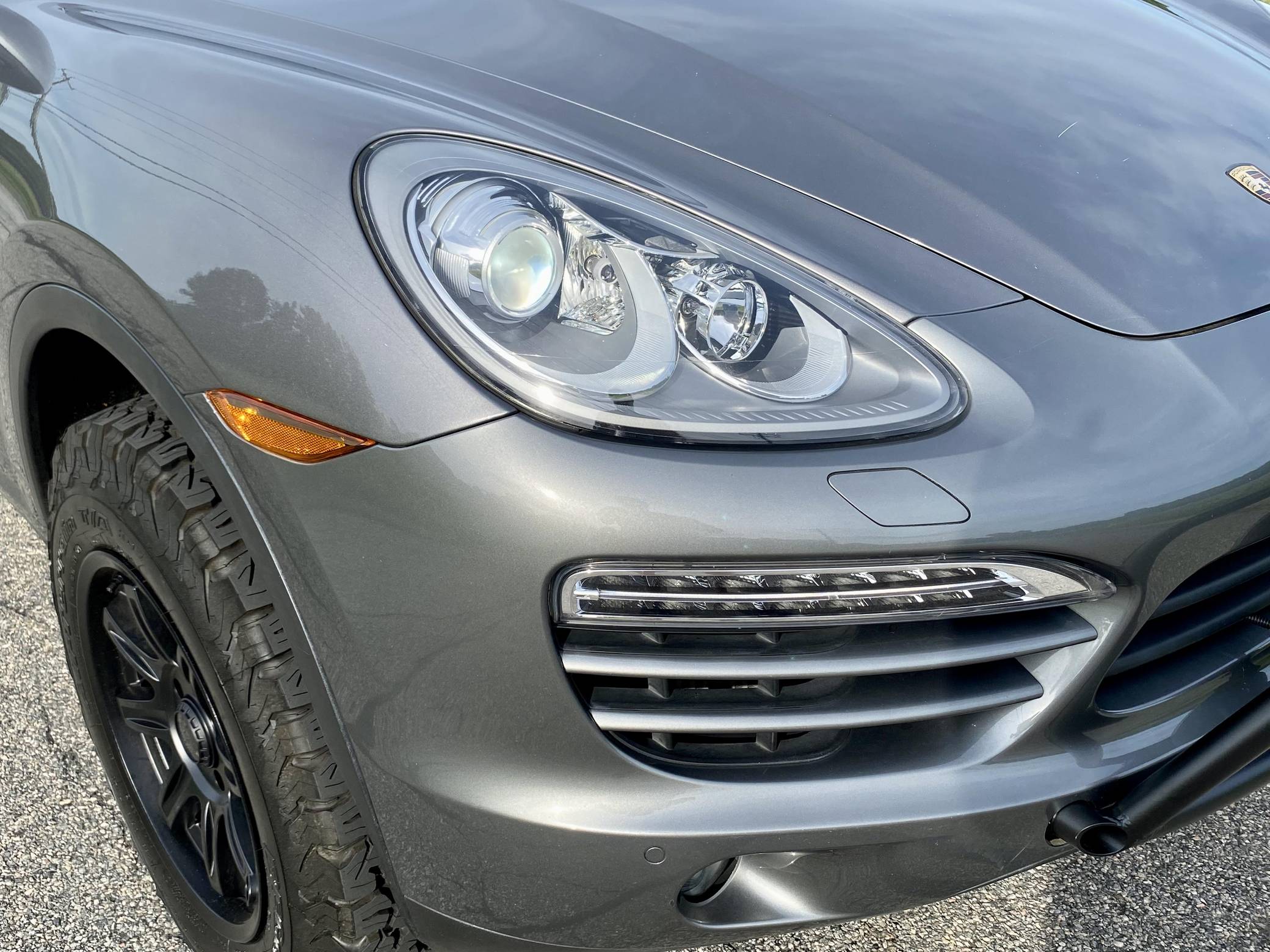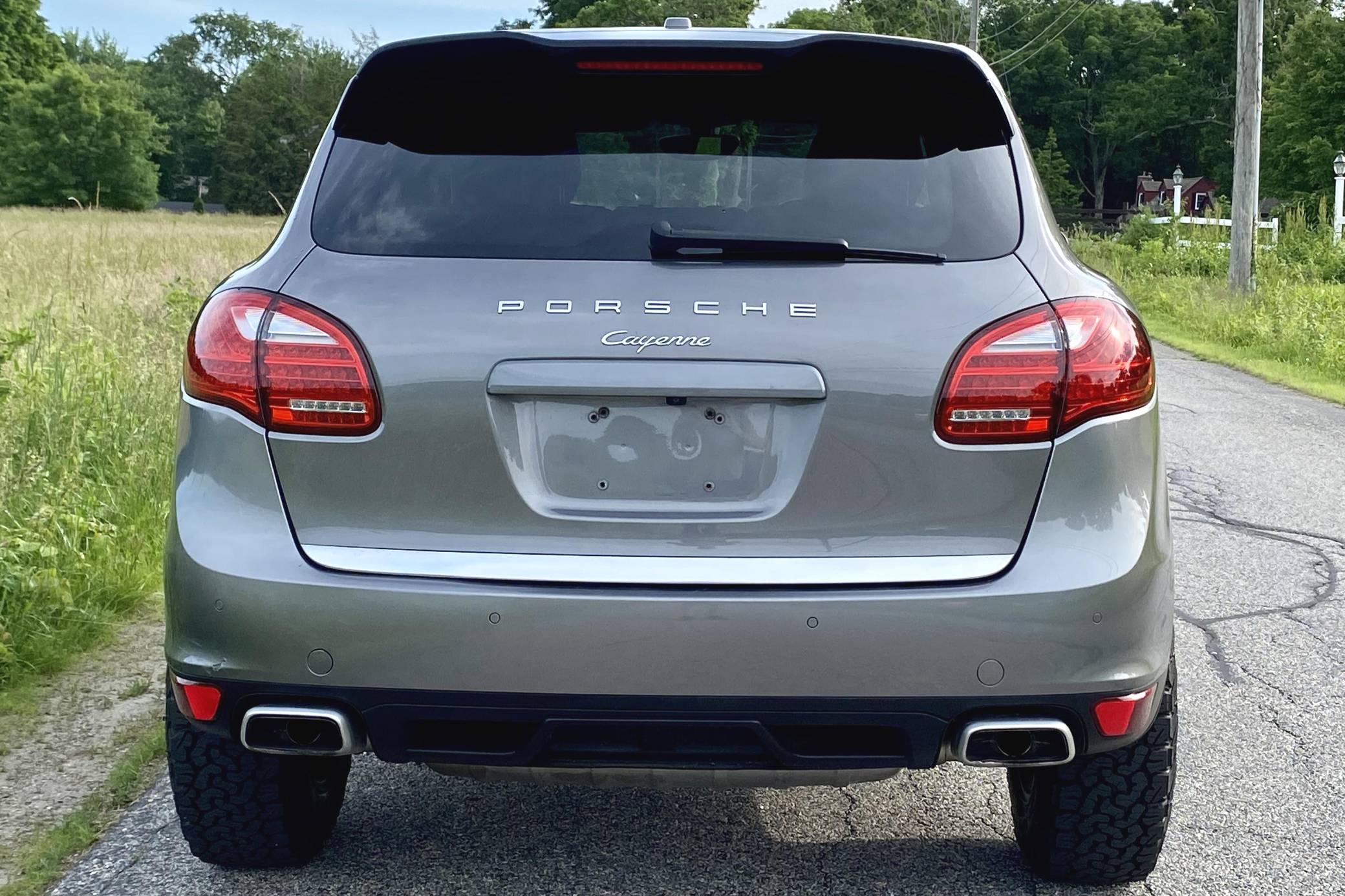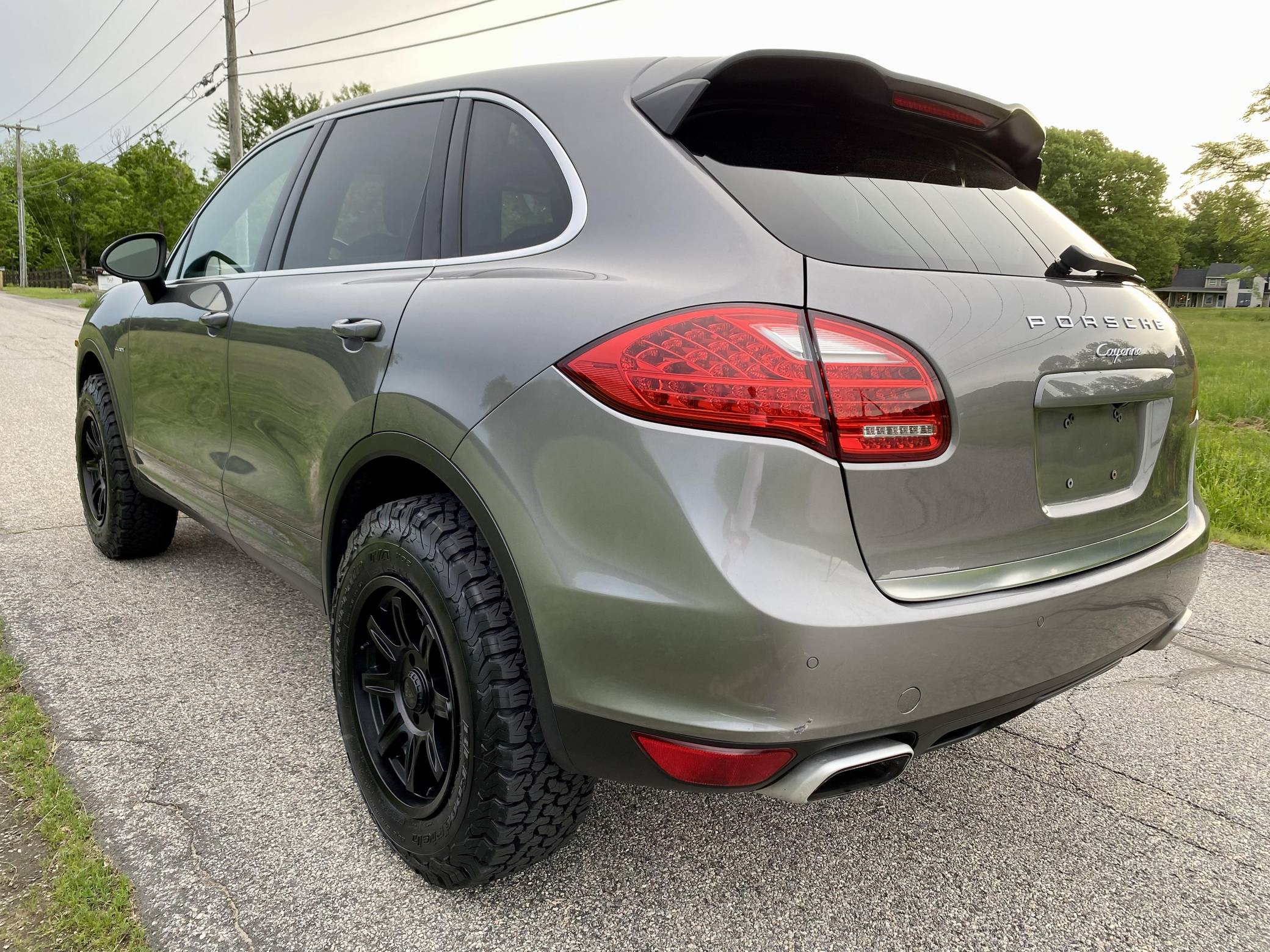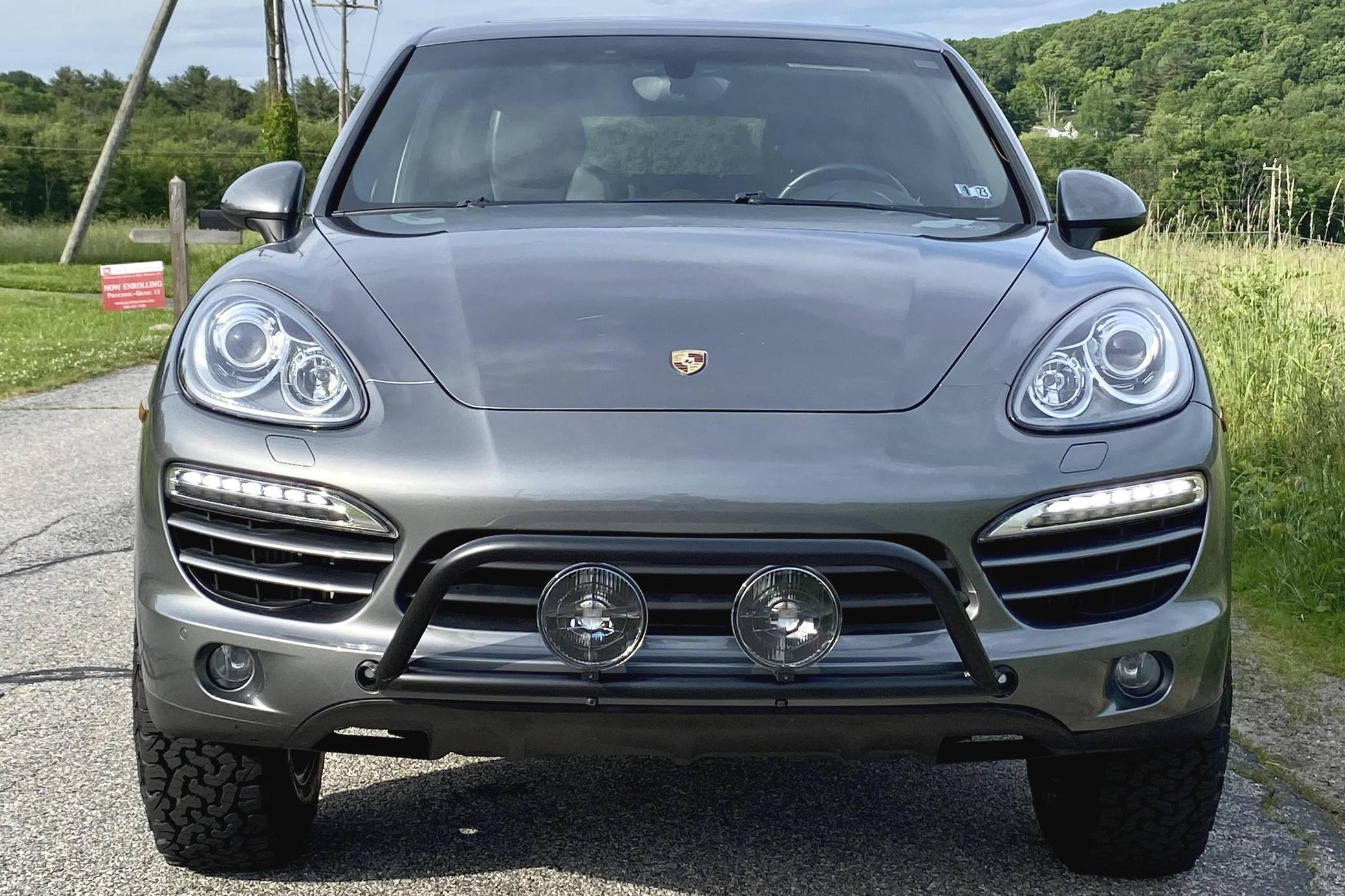 2014 Porsche Cayenne Diesel, finished in Meteor Grey Metallic with a black interior. A build sheet is provided in the photo gallery, and a partial list of notable equipment includes front fog lights, a rear roof spoiler, a panoramic sunroof, leather-wrapped multi-function steering wheel, power-adjustable and heated front seats, leather upholstery, a center touchscreen infotainment system, and a navigation system. Modifications reported by the seller include 18-inch ALPHA wheels with BFGoodrich All-Terrain T/A KO2 tires (size LT255/70 R18), a 2-inch lift kit, a Eurowise bull bar, and Hella Black Magic lights. A sticker under the hood indicates that this Cayenne had the diesel emissions fix performed in February 2018. Released for the 2011 model year, the second-generation Cayenne (called "958" internally) was slightly bigger and significantly lighter than its predecessor. It offered a smoother ride thanks to additional technology and luxury features, it was just as capable off-road, and critics agreed it was noticeably sportier than the first-generation model. Production ended in 2017. Power comes from a 3. 0-liter turbodiesel V6, rated at 240 horsepower and 406 lb-ft of torque. Output is sent to all four wheels via an 8-speed automatic transmission. The Cayenne Diesel's towing capacity is listed at 7,716 pounds.