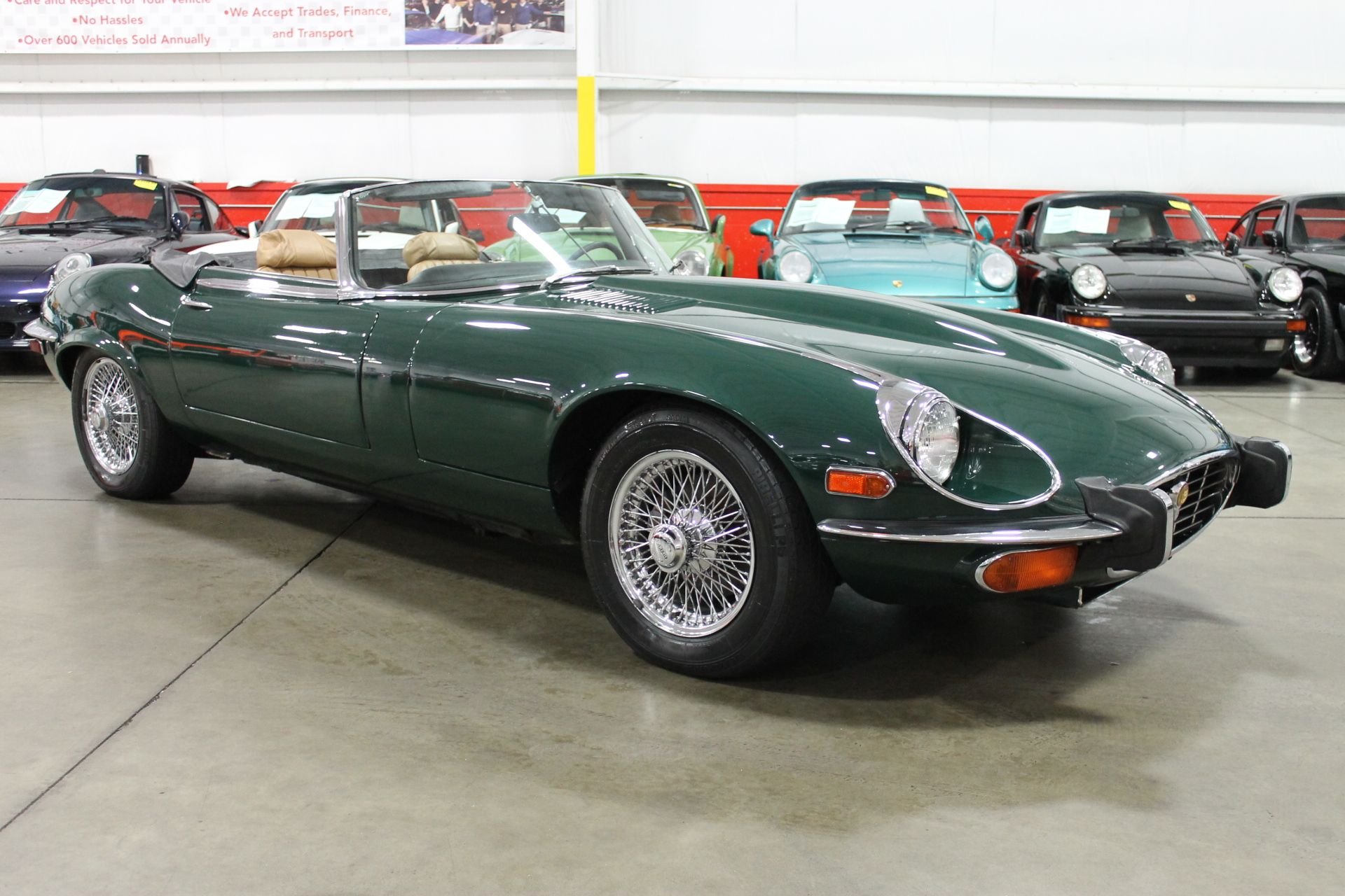 From 1961 to 1974, the E-type dominated the sports car market with high performance and amazing style. It's featured on many lists of top cars of all time. The New York Museum of Modern Art recognized the significance of the styling of the XKE with a display of a roadster (one of just six vehicles to ever earn the distinction). All E-types featured independent coil spring rear suspension with torsion bar front ends, and 4-wheel power-assisted disc brakes. The Series III generation is known for the powerful 5.3L V12 engine. This XKE convertible is in excellent condition. The car looks amazing in British Racing Green as the paint is in awesome shape, and it has a new convertible top. This car drives great and has a very smooth automatic transmission. This car is very original, and has tons of curb appeal. It's a 2-owner car that has always been stored and well maintained. We hold a folder of receipts, and original sales documentation. It doesn't get any better than V12, top down motoring in one of the best designed vehicles of all time.