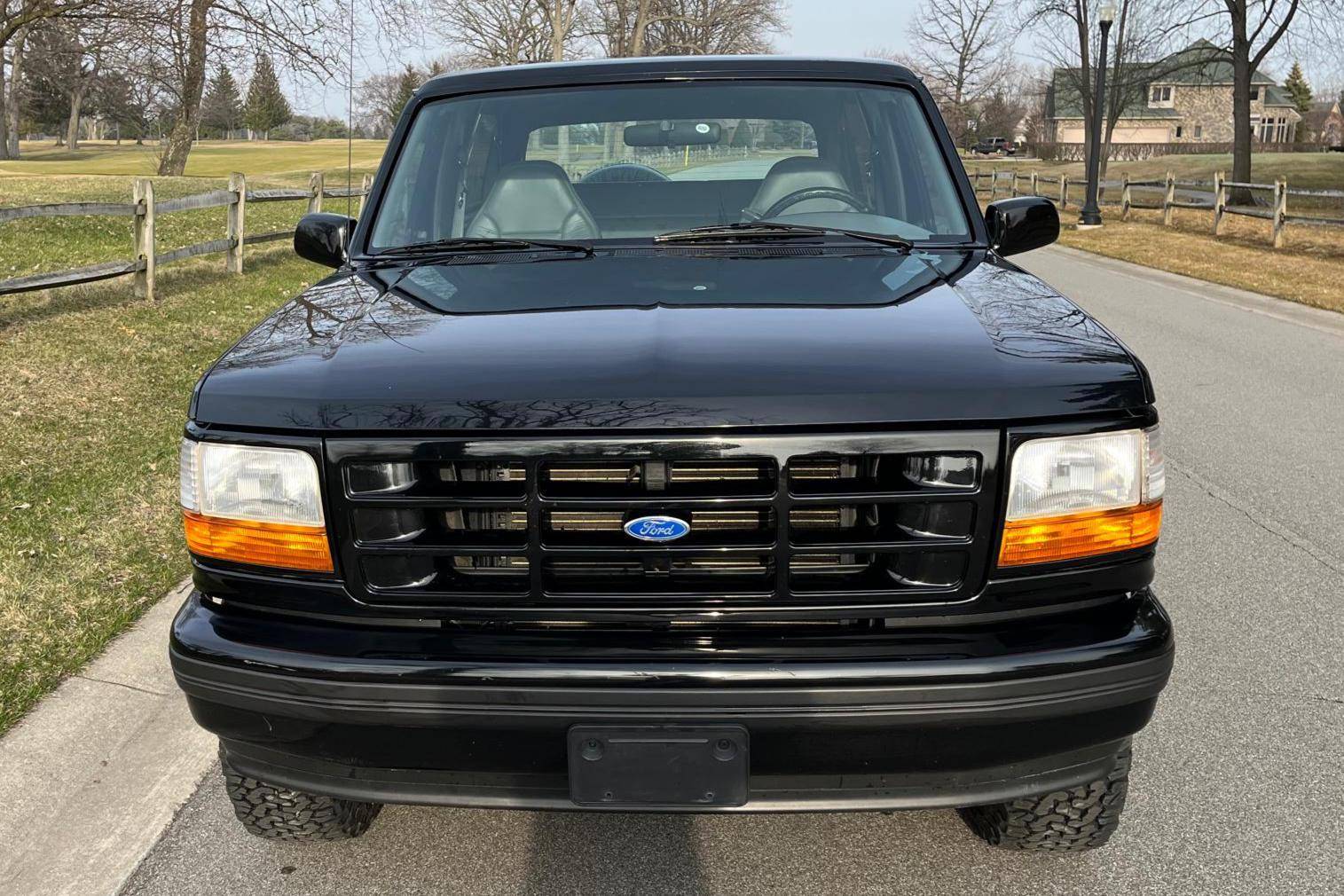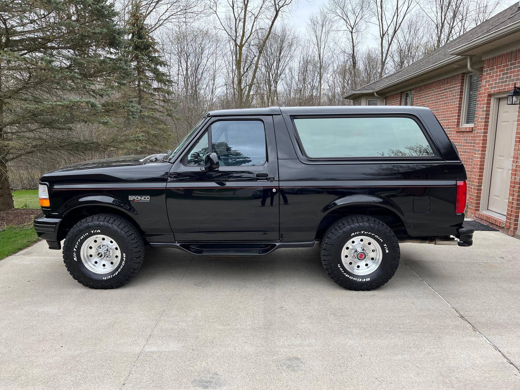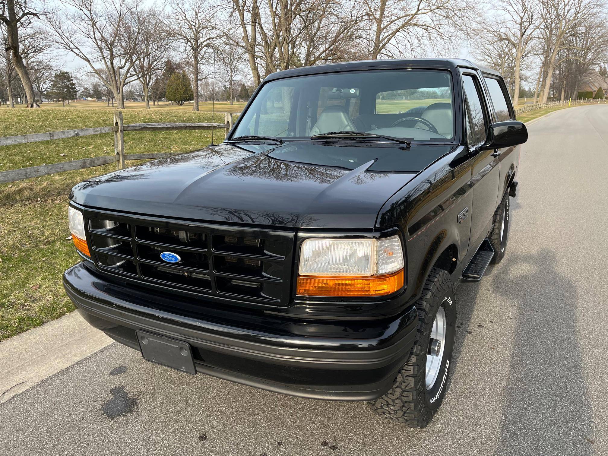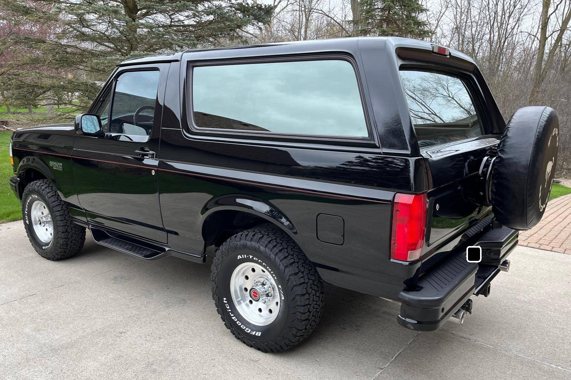 1996 Ford Bronco XLT 4x4, finished in black with an Opal Gray interior. The odometer currently indicates about 80,500 miles. Factory equipment includes the XLT Sport Package, 15-inch forged aluminum deep dish wheels, leather upholstery, air conditioning, cruise control, and power window and door locks. Modifications to this SUV include a Panasonic head unit and a K&N intake. Ford introduced the fifth-generation Bronco for the 1992 model year. Again closely related to the F-150, the body-on-frame SUV received a new-look front end and a more modern interior. Production ended in 1996, and Ford consigned the Bronco nameplate to the automotive attic until the sixth-generation model made its debut in 2020. Power comes from a 5. 0-liter V8, rated at 199 horsepower and 270 lb-ft of torque. Output is sent to the rear or all four wheels via a 4-speed automatic transmission and a 2-speed transfer case.