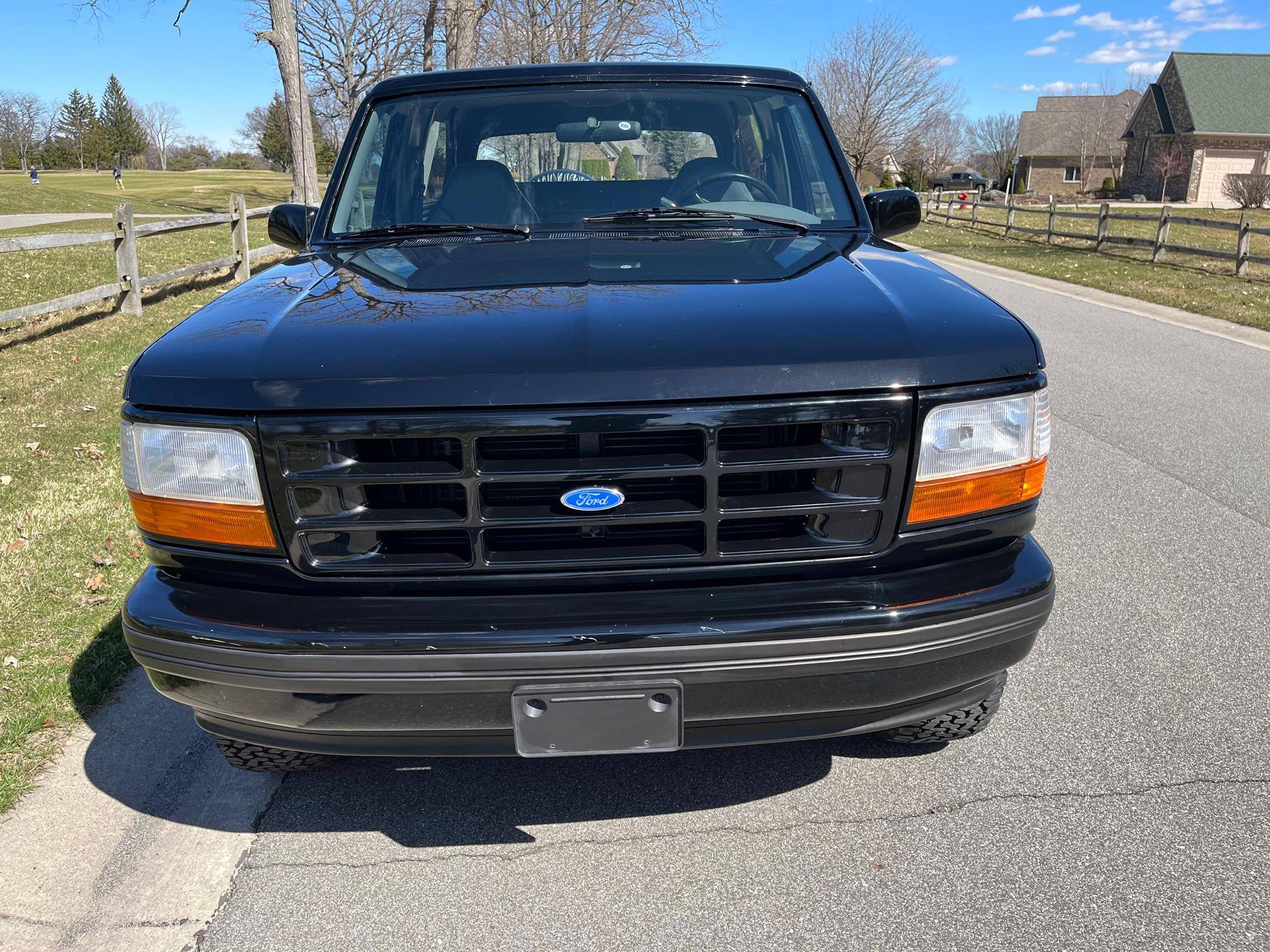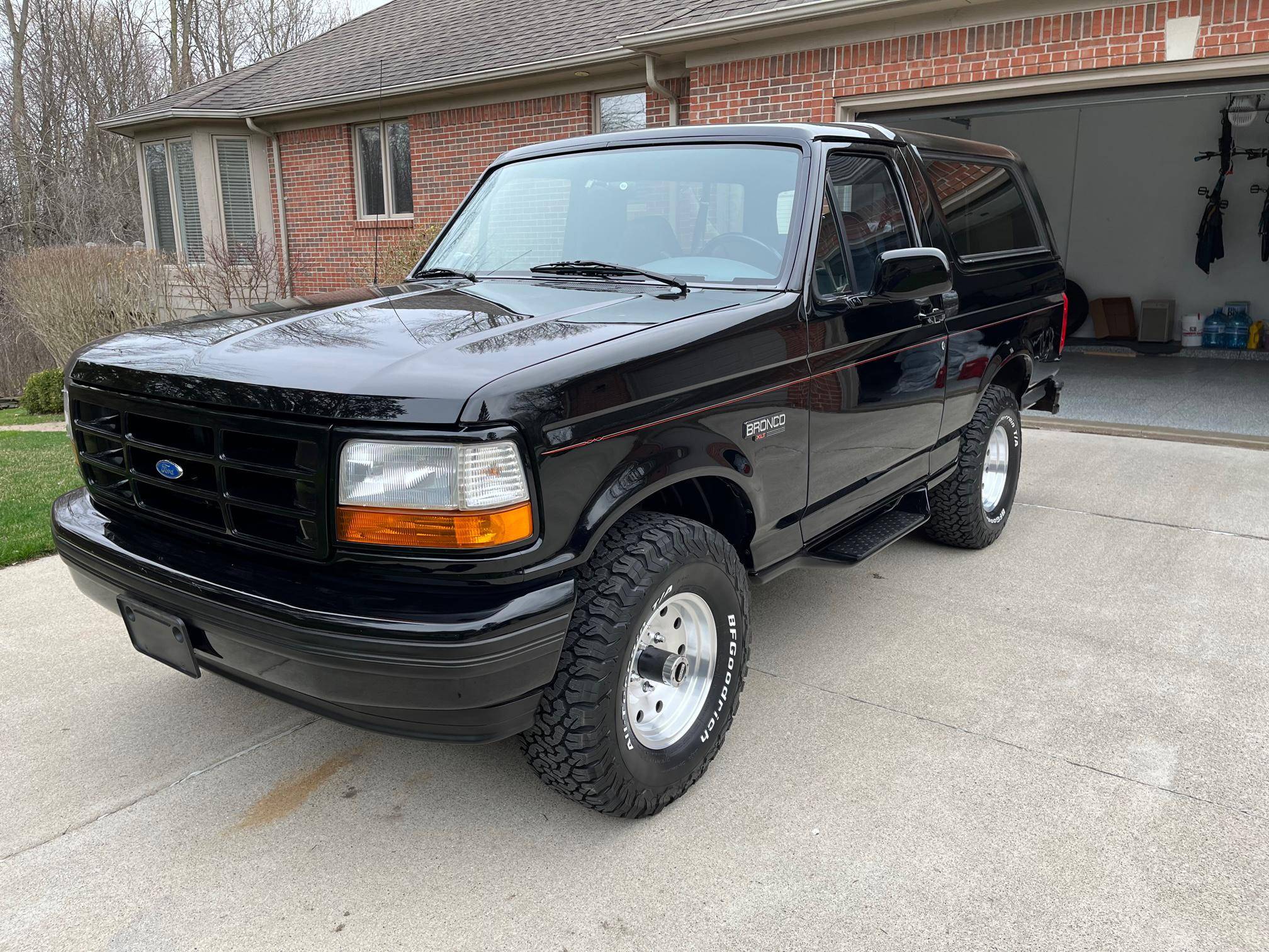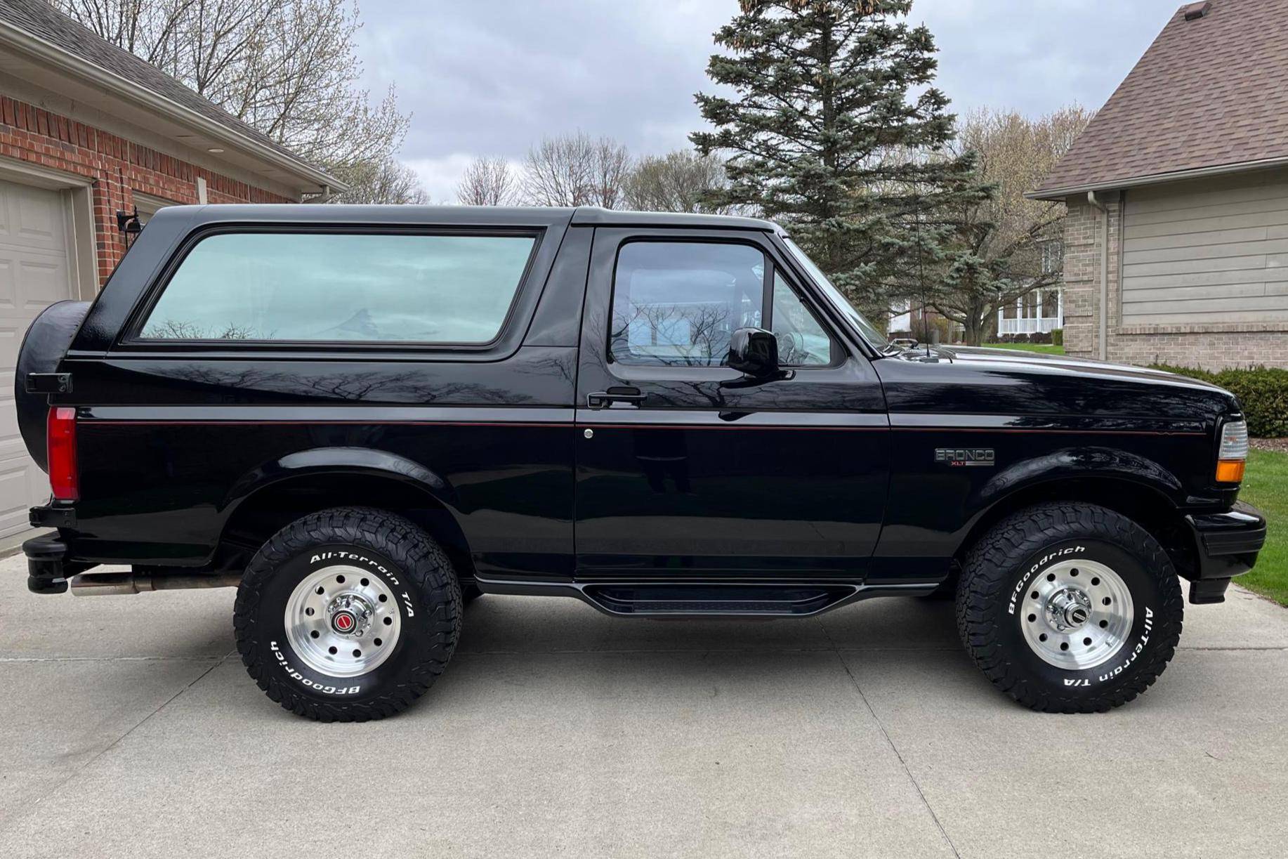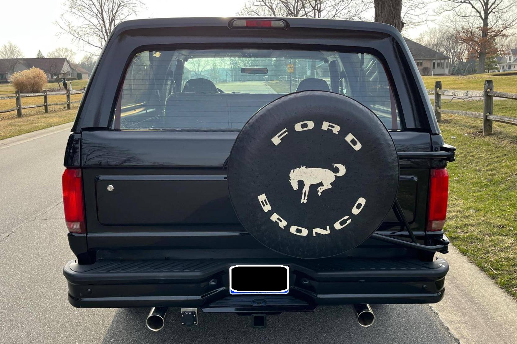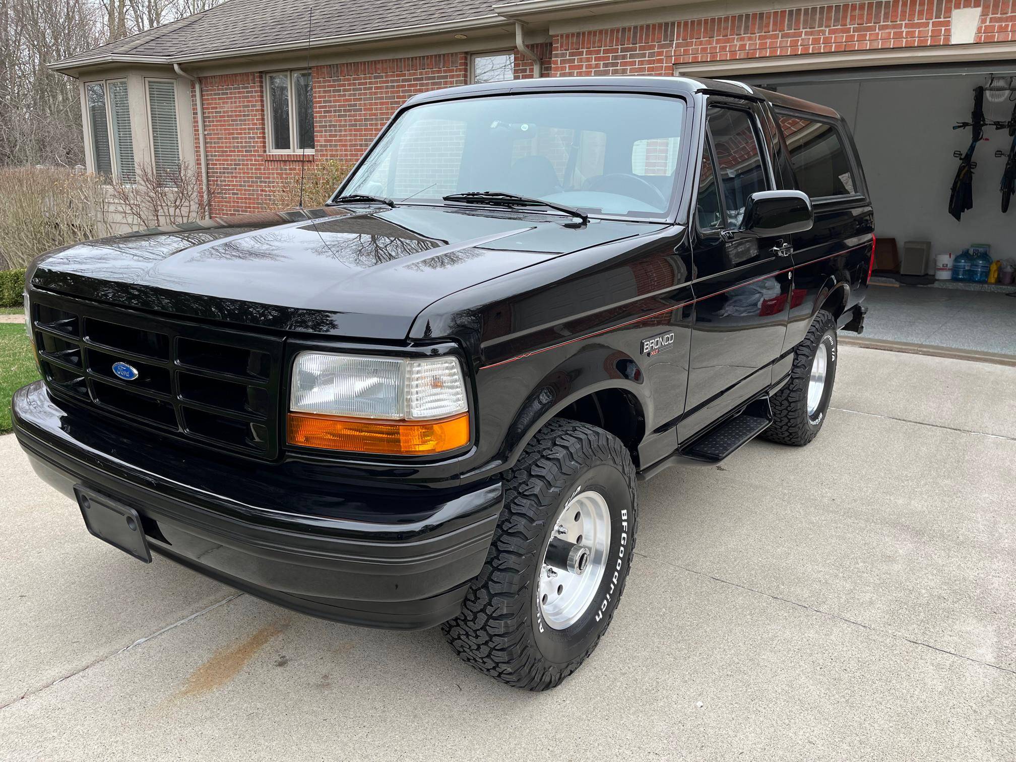 1996 Ford Bronco XLT 4x4, finished in black with an Opal Gray interior. The odometer currently indicates about 80,500 miles. Factory equipment includes the XLT Sport Package, 15-inch forged aluminum deep dish wheels, leather upholstery, air conditioning, cruise control, and power window and door locks. Modifications to this SUV include a Panasonic head unit and a K&N intake. Ford introduced the fifth-generation Bronco for the 1992 model year. Again closely related to the F-150, the body-on-frame SUV received a new-look front end and a more modern interior. Production ended in 1996, and Ford consigned the Bronco nameplate to the automotive attic until the sixth-generation model made its debut in 2020. Power comes from a 5. 0-liter V8, rated at 199 horsepower and 270 lb-ft of torque. Output is sent to the rear or all four wheels via a 4-speed automatic transmission and a 2-speed transfer case.