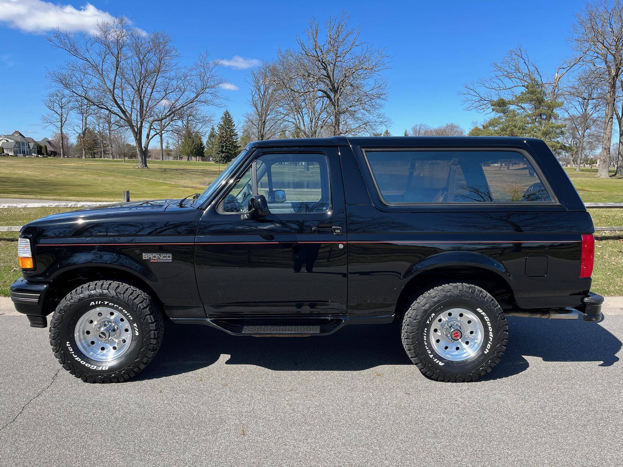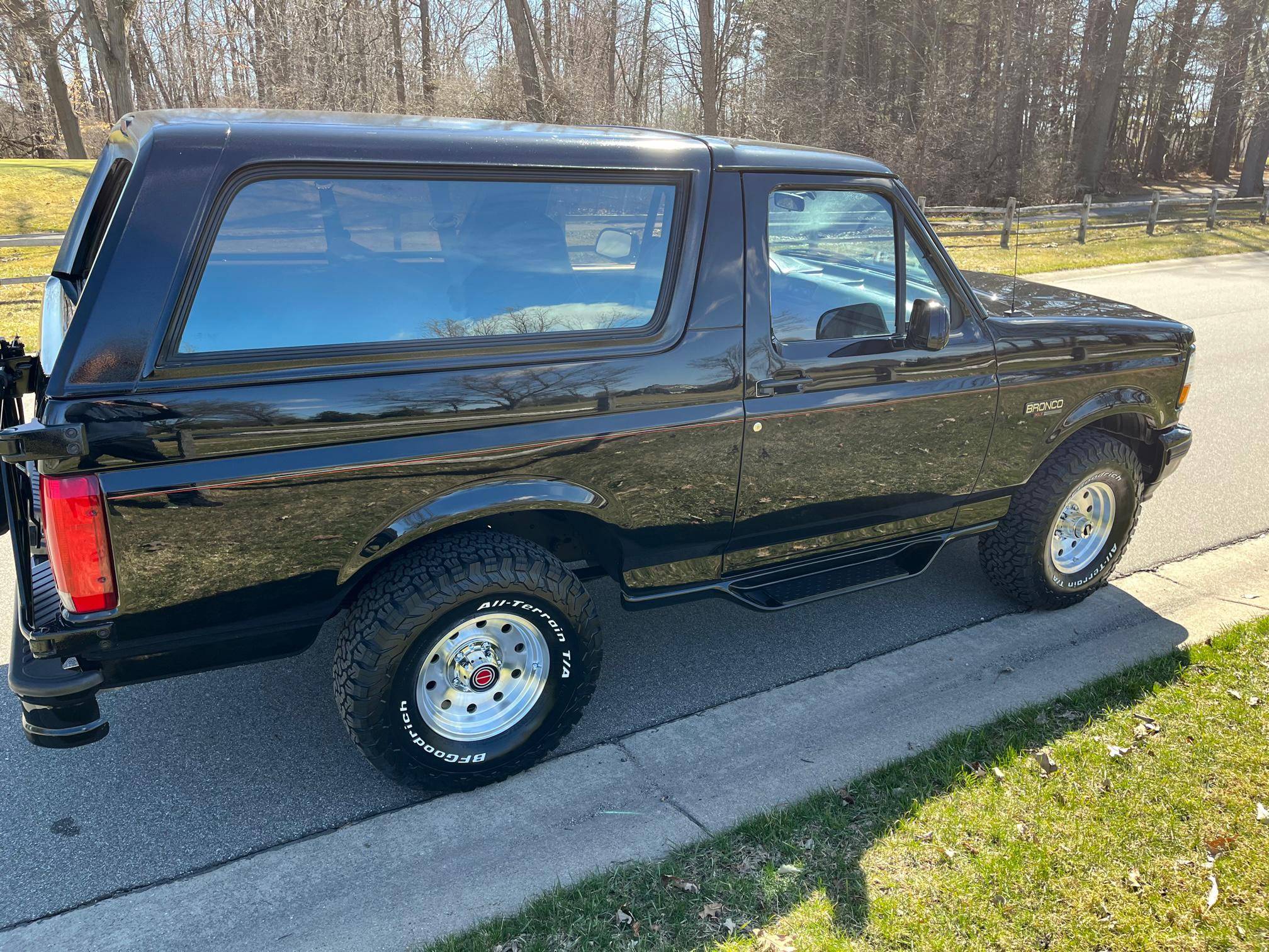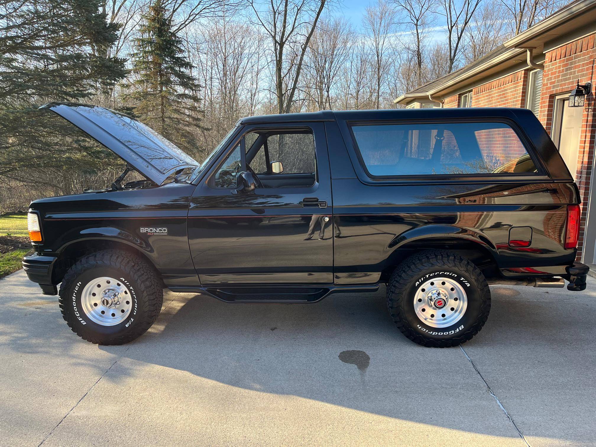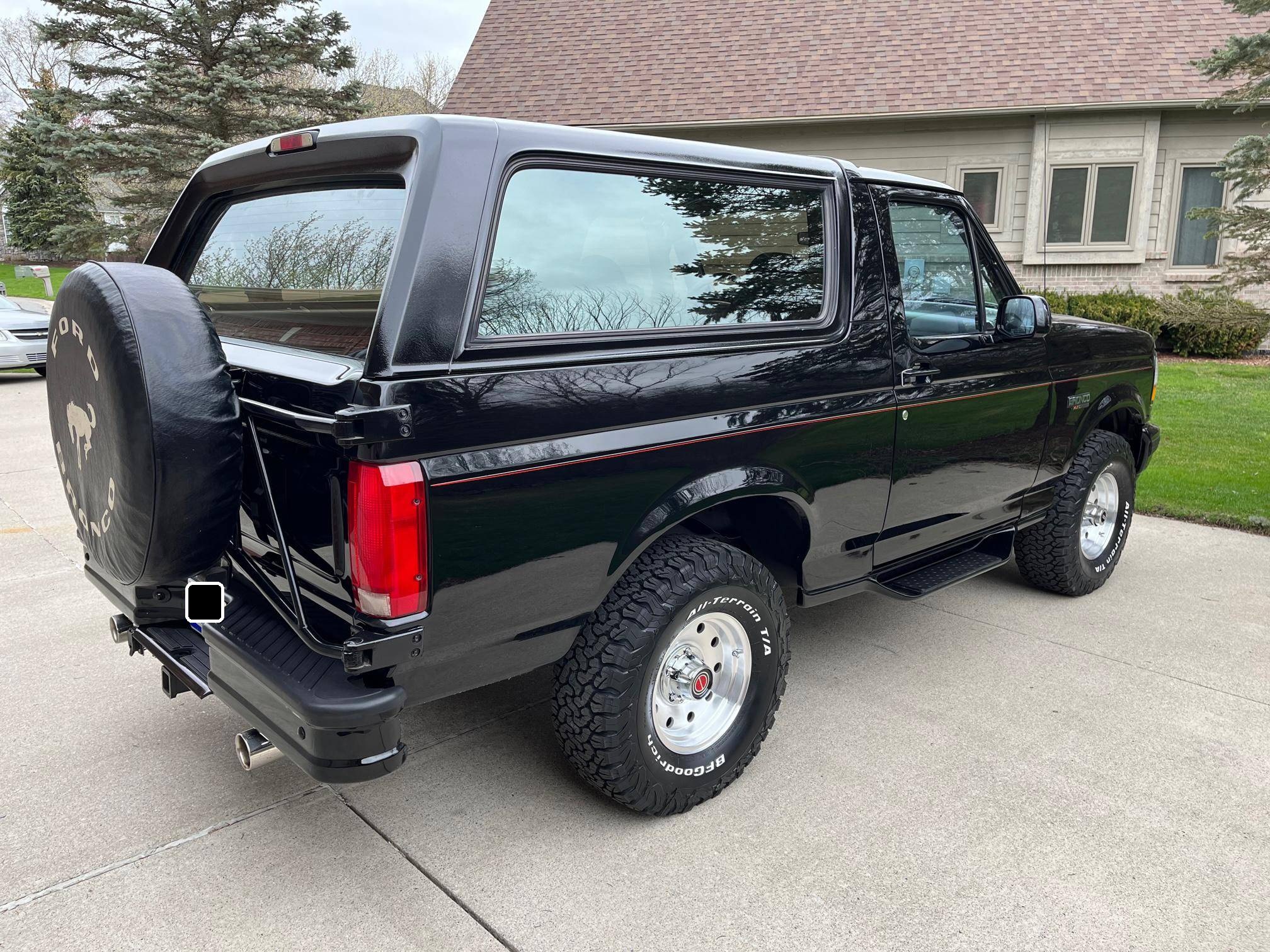 1996 Ford Bronco XLT 4x4, finished in black with an Opal Gray interior. The odometer currently indicates about 80,500 miles. Factory equipment includes the XLT Sport Package, 15-inch forged aluminum deep dish wheels, leather upholstery, air conditioning, cruise control, and power window and door locks. Modifications to this SUV include a Panasonic head unit and a K&N intake. Ford introduced the fifth-generation Bronco for the 1992 model year. Again closely related to the F-150, the body-on-frame SUV received a new-look front end and a more modern interior. Production ended in 1996, and Ford consigned the Bronco nameplate to the automotive attic until the sixth-generation model made its debut in 2020. Power comes from a 5. 0-liter V8, rated at 199 horsepower and 270 lb-ft of torque. Output is sent to the rear or all four wheels via a 4-speed automatic transmission and a 2-speed transfer case.