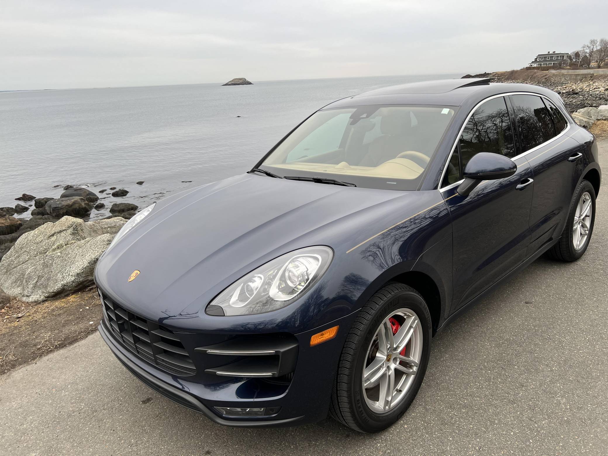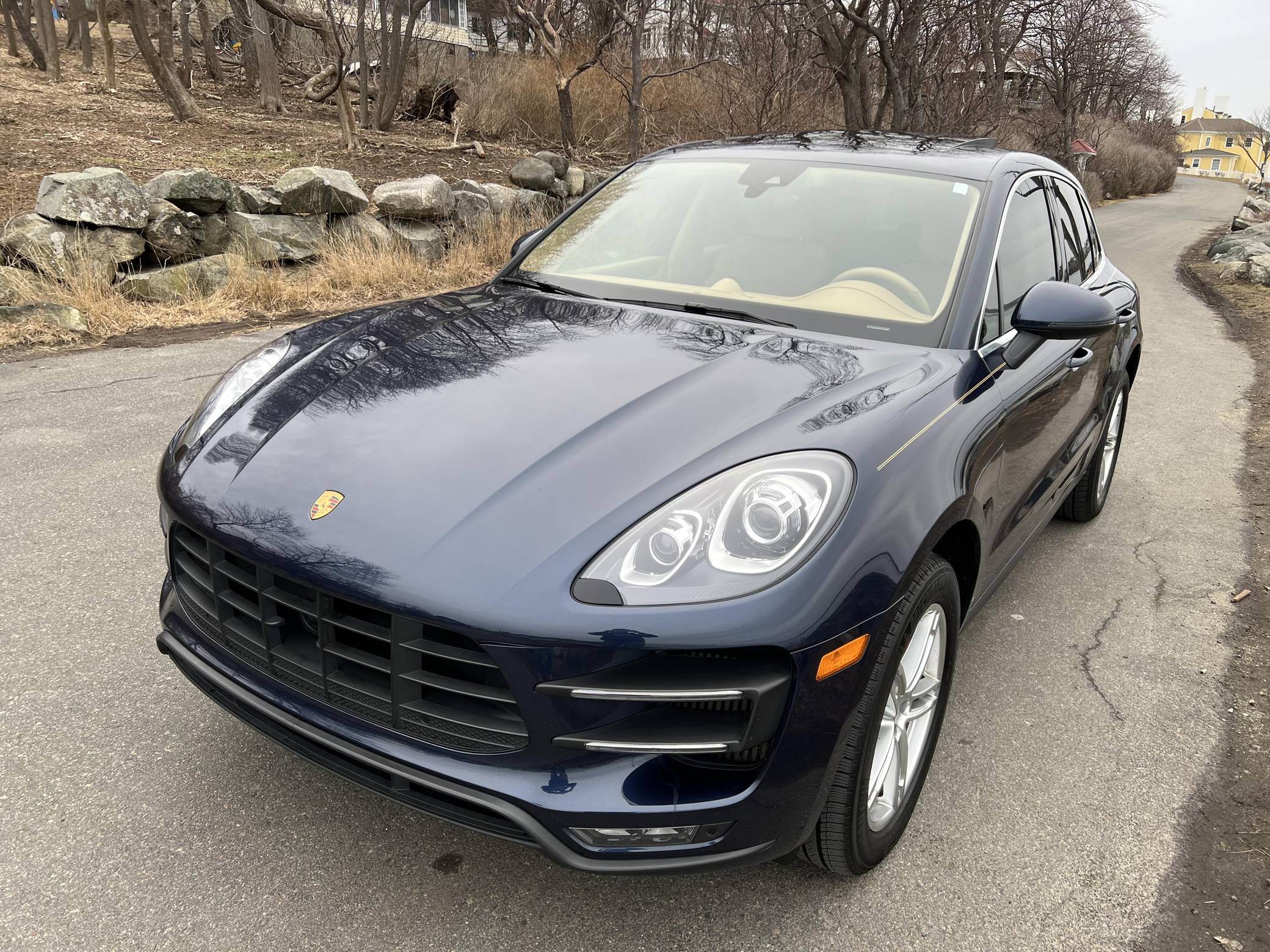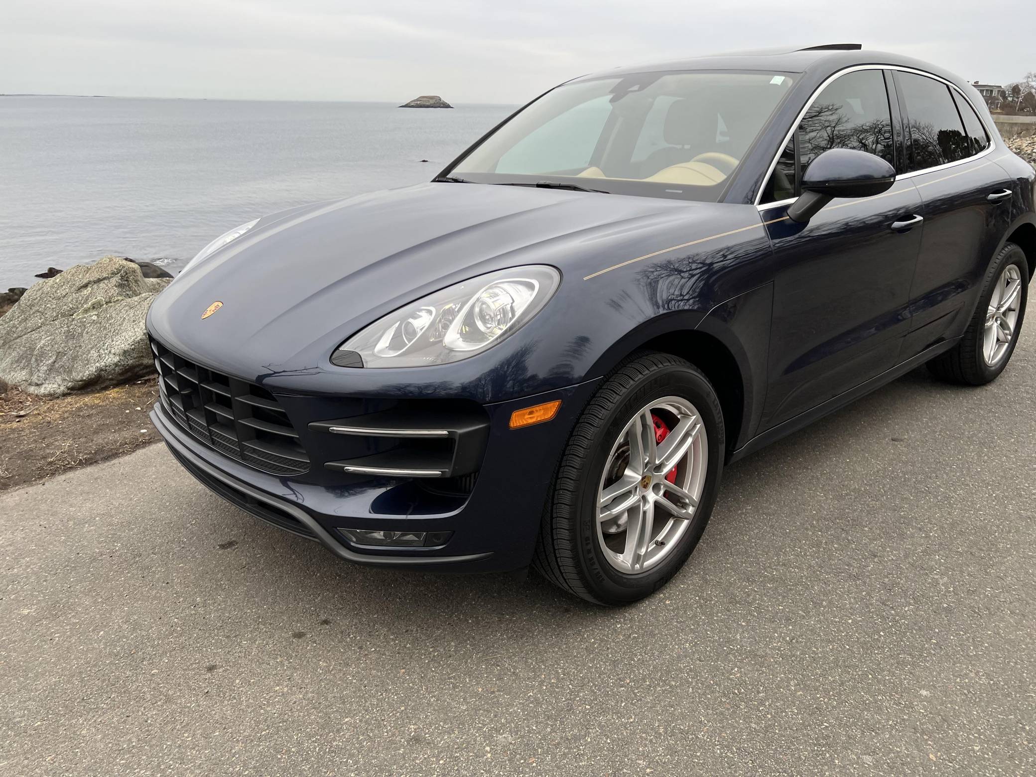 2015 Porsche Macan Turbo, finished in Dark Blue Metallic with a Luxor Beige interior. A build sheet is provided in the photo gallery, and a partial list of notable equipment includes the Premium Package Plus, the Sport Chrono, Comfort Lighting, and Carbon Fiber Interior packages, 19-inch Macan Turbo wheels, leather upholstery, power-adjustable, heated, and ventilated front seats, a navigation system, a Bose surround sound system, and more as detailed below. Modifications reported by the seller are limited to side pinstripes, tinted windows, and an Escort Passport 9500ci radar detector. Encouraged by the Cayenne's success and eager to tap into one of the biggest segments of the market, Porsche introduced the Macan as its entry-level SUV for 2015. Some of the model's underpinnings came from Audi, but Porsche dialed in a level of performance and handling that's unusual to find in a compact SUV. The Turbo model was positioned at the top of the line-up through the 2021 model year. Power comes from a turbocharged 3. 6-liter V6, rated at 400 horsepower and 406 lb-ft of torque. It spins the four wheels via a 7-speed dual-clutch automatic transmission.