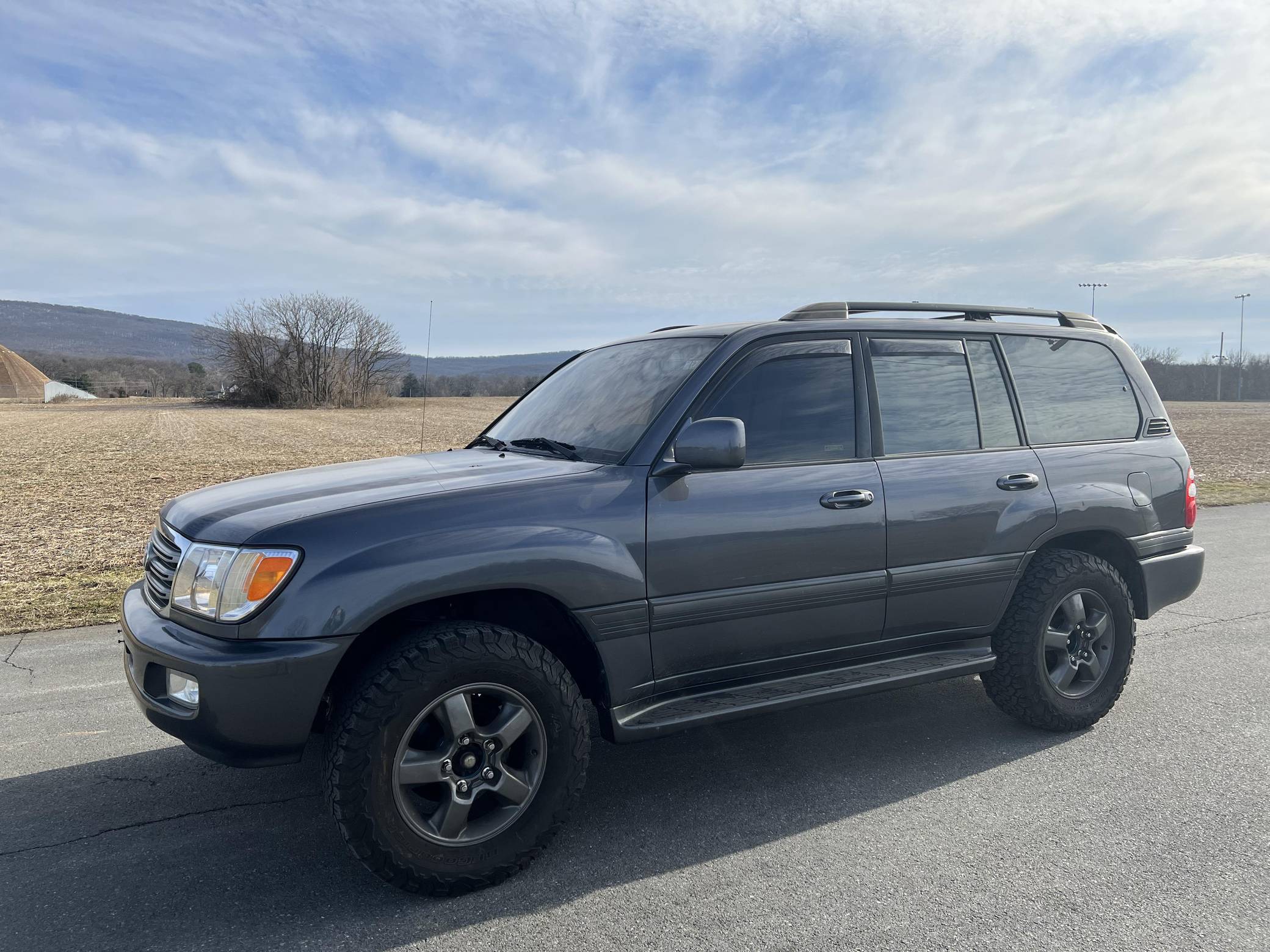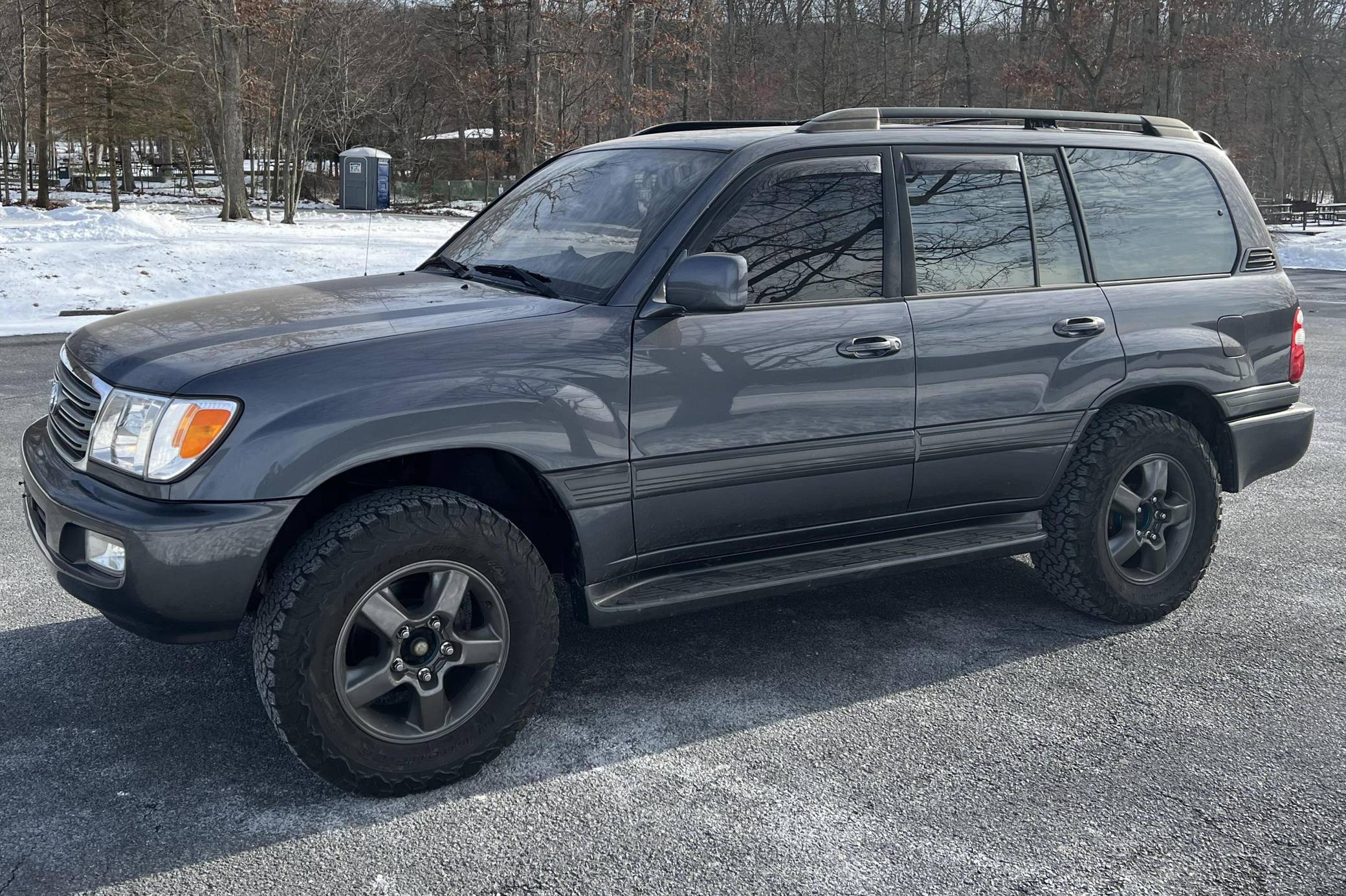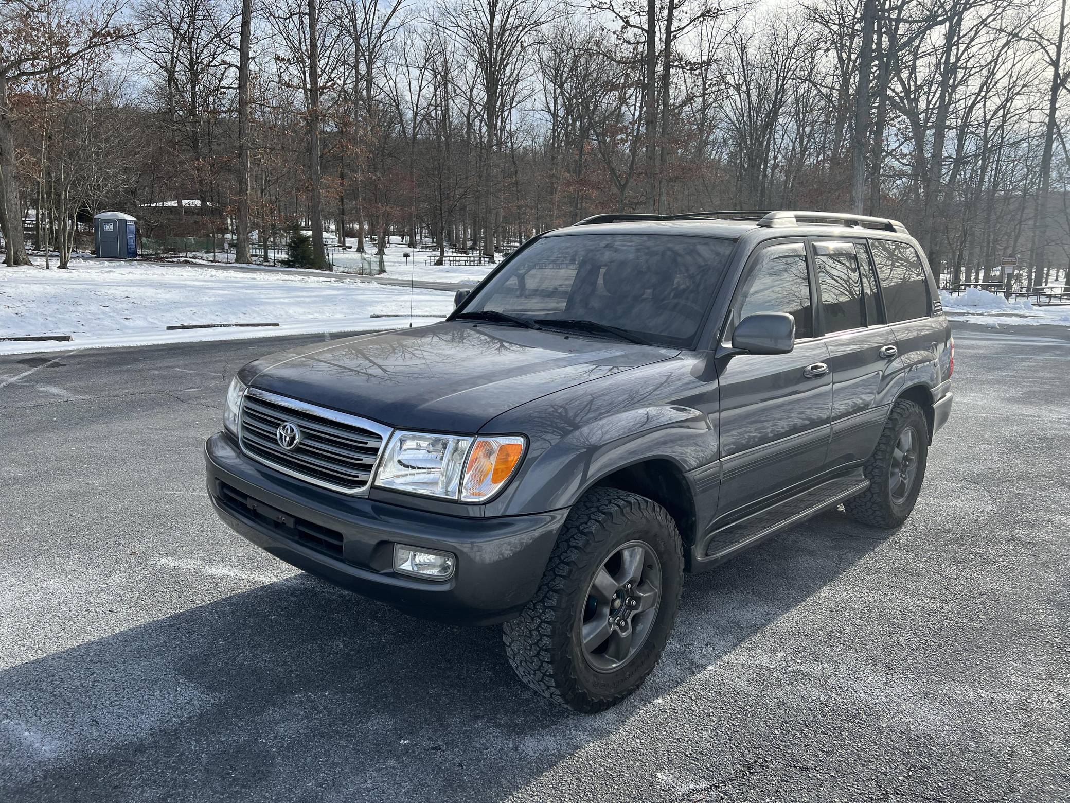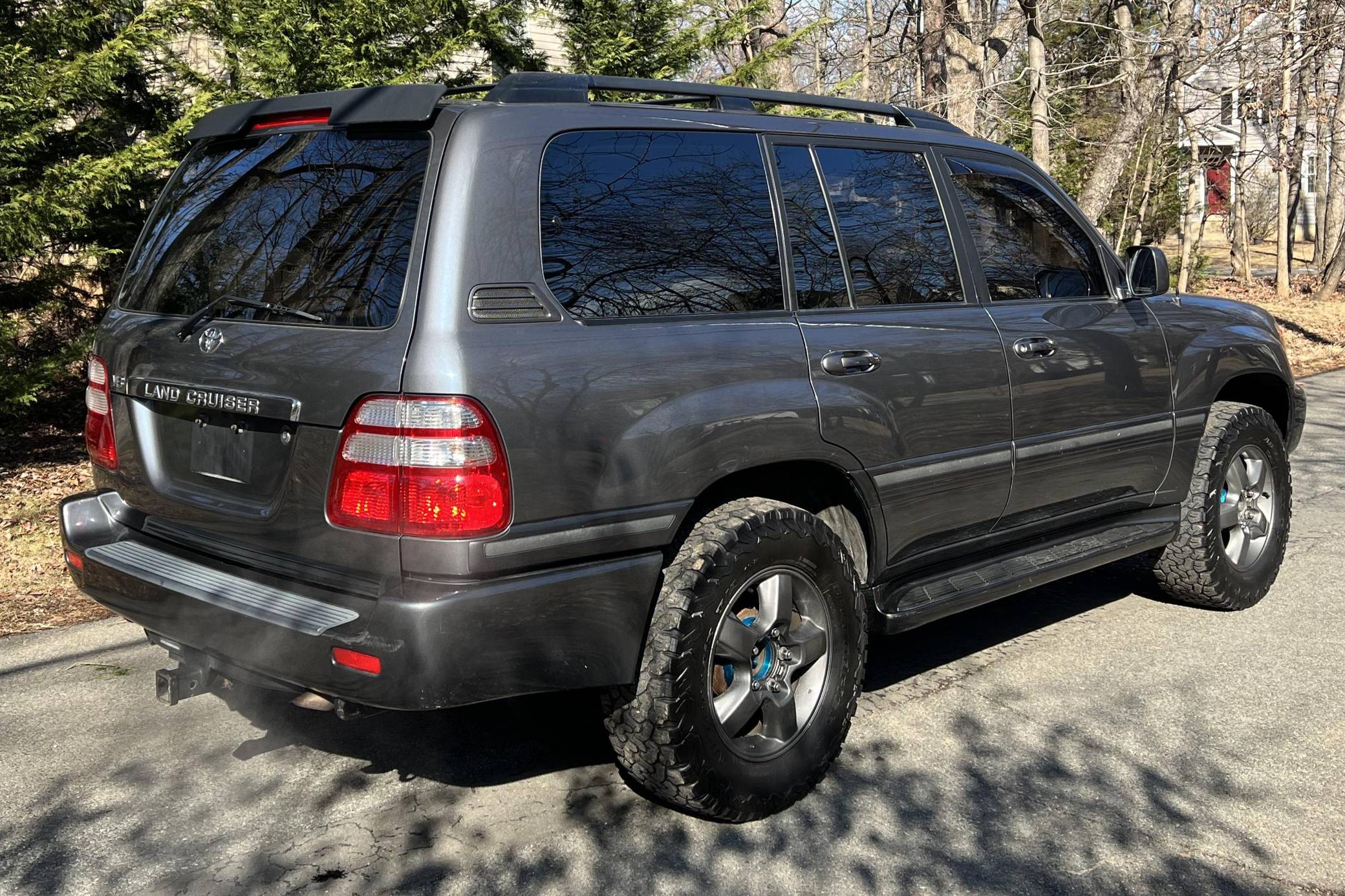 THIS… is a 2003 Toyota Land Cruiser, finished in Galactic Gray Mica with a gray interior. It also shows that this Land Cruiser is a two-owner car. Factory equipment includes the Convenience Package, 18-inch wheels, a center locking differential, a tow hitch, a roof rack, a power sunroof, leather upholstery with heated front seats, third-row seats, a rear seat entertainment system, a JBL audio system, and more as detailed below. Modifications reported by the seller include Bilstein suspension, a 2-inch lift kit, wheel spacers, BFGoodrich tires, and interior ambient lighting. The 100-Series Land Cruiser replaced the 80-Series model in 1998 with amenities like an electronically-controlled 4-wheel drive system with skid control, improved passenger comfort, and digital navigation that brought the nameplate firmly into the modern era. Toyota's now-legendary "2UZ-FE" V8 was another serious upgrade to the platform, and it's one of the big reasons this machine is a favorite of those who wish to not only get far off the grid but also come back safely. Power comes from a “2UZ-FE” 4. 7-liter V8, rated at 235 horsepower and 320 lb-ft of torque. Output is sent to all four wheels through a 5-speed automatic transmission and a 2-speed transfer case.