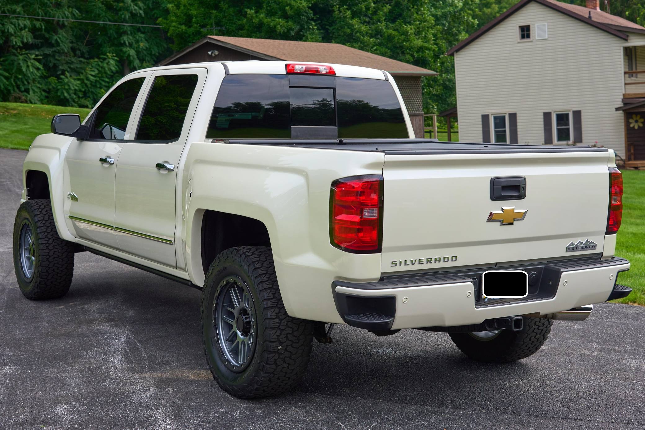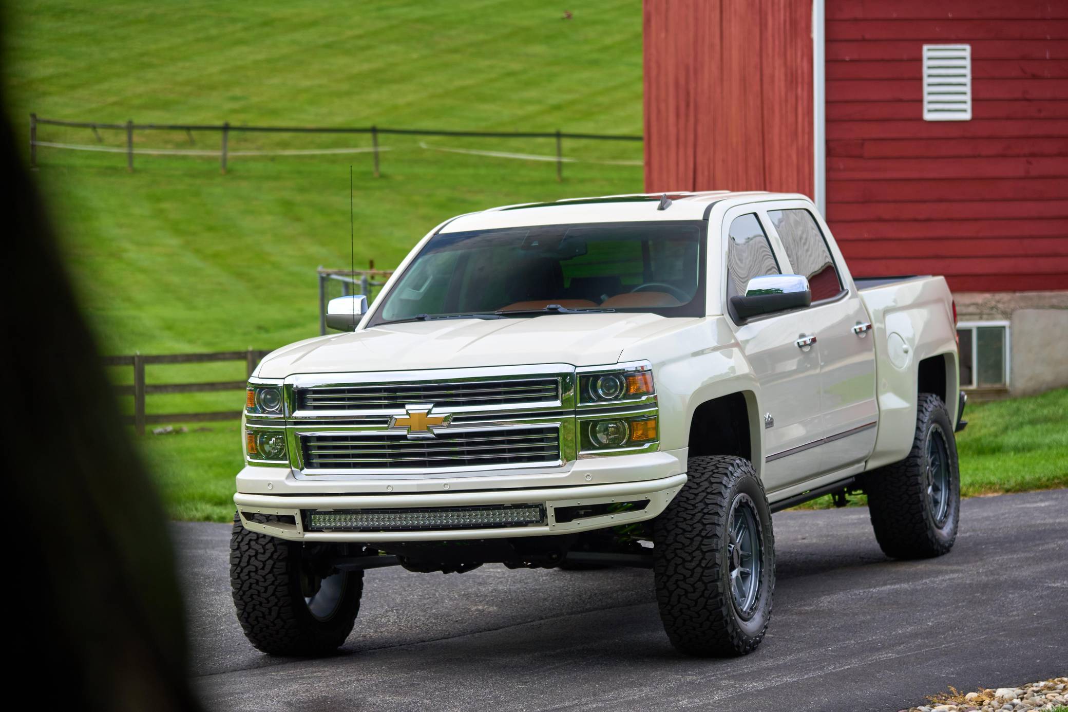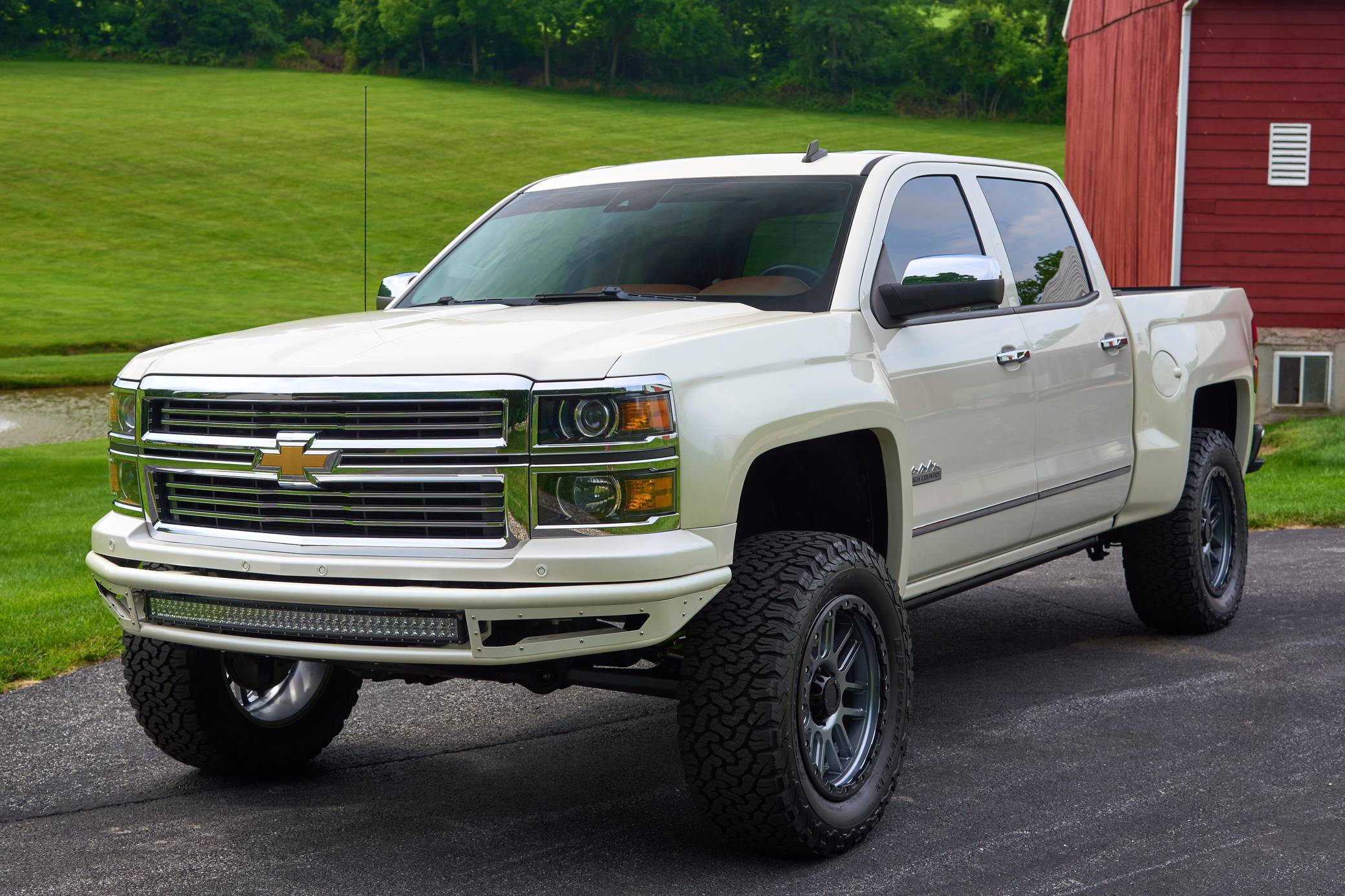 THIS… is a 2014 Chevrolet Silverado 1500 High Country, finished in White Diamond Tricoat with a Saddle Brown interior. Factory equipment includes the High Country Premium package, a sunroof, leather upholstery, power-adjustable heated and ventilated front seats, a MyLink infotainment system, and a Bose sound system. Modifications to this Silverado are extensive, and the full list is detailed below. include a Magnuson supercharger, a Mazzulla Offroad Mid Travel suspension kit with King Off-Road 2. 5 remote-reservoir shocks and Deaver springs, 20-inch Nemesis wheels, FiberwerX 3-inch fenders and bedsides, and more, as detailed below. Chevrolet launched the third-generation Silverado for 2014. Underpinned by the K2XX platform, the Silverado offered greater comfort thanks to its redesigned suspension and the more rigid cab. High Country models were positioned at the top of the lineup as the most luxurious trim level to cater to customers looking for a high-end truck. Power comes from a supercharged 6. 2-liter V8, rated at 420 horsepower and 460 lb-ft of torque, when left stock and naturally aspirated. The seller states that this Silverado made 480 horsepower at the wheels during a dyno run, but a dyno sheet was not provided to confirm. Output is sent to the rear wheels via a 6-speed automatic transmission.