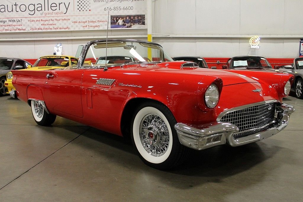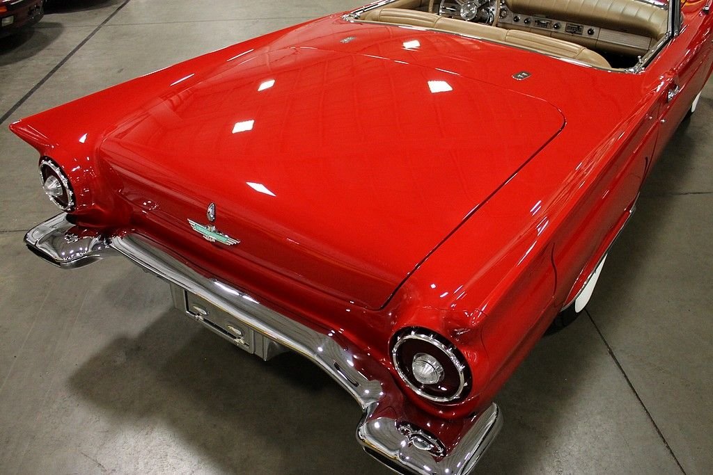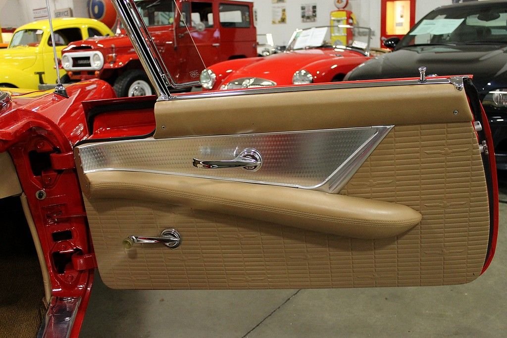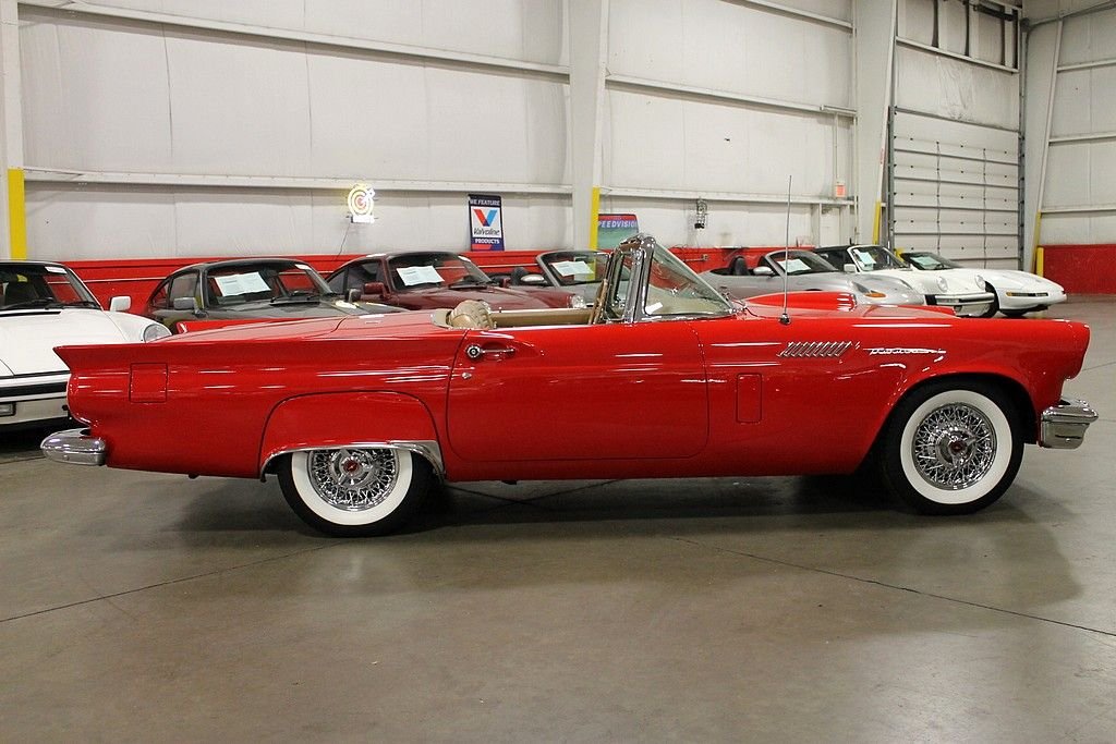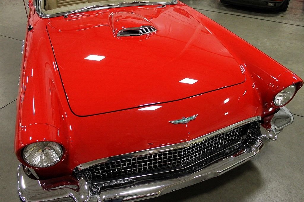 The Ford Thunderbird project was in direct response to that of the Chevrolet Corvette. In fact, the number of T-Birds sold the first 3 years of production was much greater than the Corvette. This might have been the result of a better marketing campaign by Ford. They were the first to market the term “personal luxury car” vs “sports car”. The original 2 seater personal luxury car reached its pinnacle in the final year of production, 1957. The car received some subtle styling changes up front along with pronounced tail fins on the rear of the car. Fords Thunderbird for 1957 still remains one of the most recognizable car on the planet. The example offered here is an outstanding example that was sold new at Ames Ford Sales, San Rafael, CA. This 1957 Thunderbird has been treated to a no expense spared, nut and bolt restoration finished in classis Flame Red over Tan interior, tan top. The 292 V8 has been completely rebuilt and fortified with hardened valve seats for today's gas, high output alternator, new radiator and heating core, and a 4 barrel carburetor with automatic choke. Other features include vintage air conditioning, added electric cooling fans that come on when the air conditioning engages, power steering, power brakes, Kelsey Hayes wire wheels with wide whites, new glass, and AM / FM radio. Mechanically, all aspects of this American icon have been refurbished and rebuilt and or replaced with much attention to detail and drivability. Our test drive revealed the best driving early T-bird that we have seen. Cosmetically, the paint, chrome, interior, engine compartment and underside are breathtaking. Documentation includes progress photos of the restoration, original dealer invoice, and owners manual. We all know that the T-bird has been an iconic part of collector car world from movies to being a staple among many personal and museum collections. The car offered here features a top shelf restoration and is fully sorted as it has been driven 1883 miles since completion. It does not get better than this. A must consider for any collection