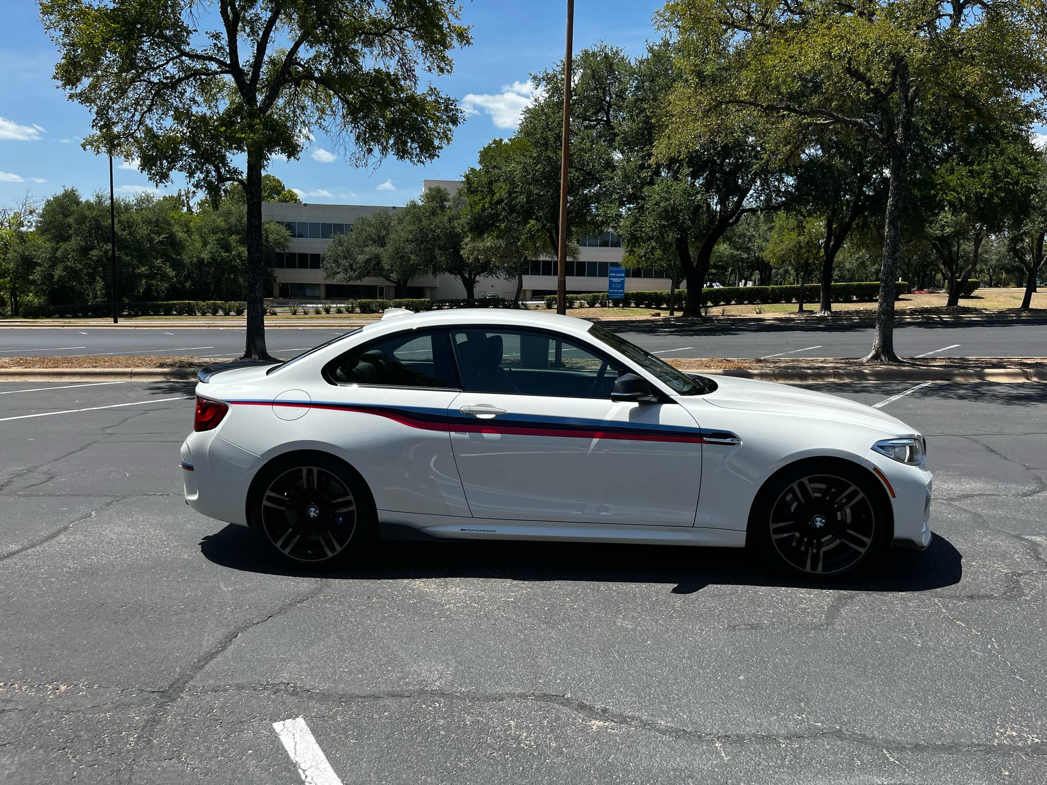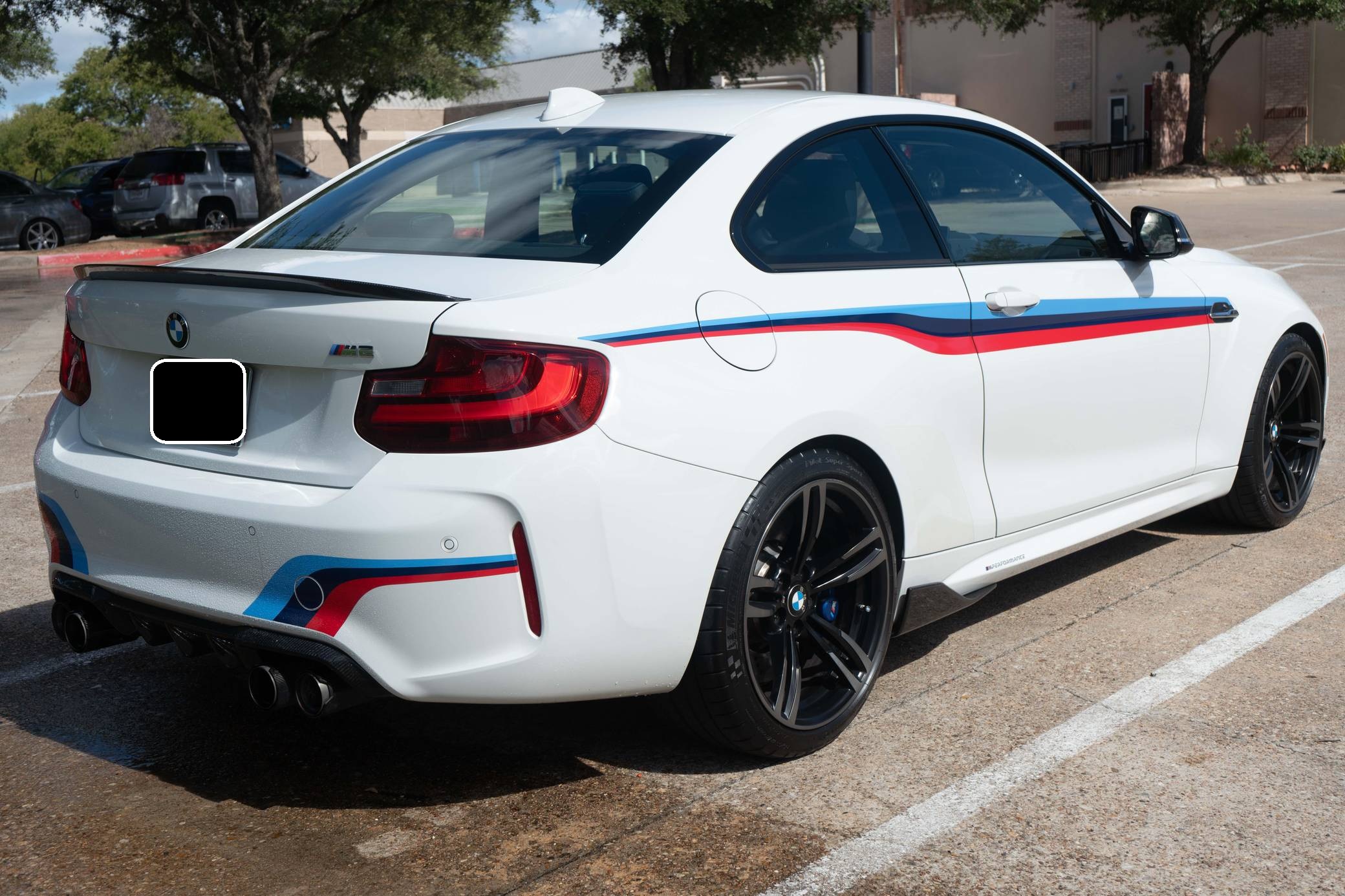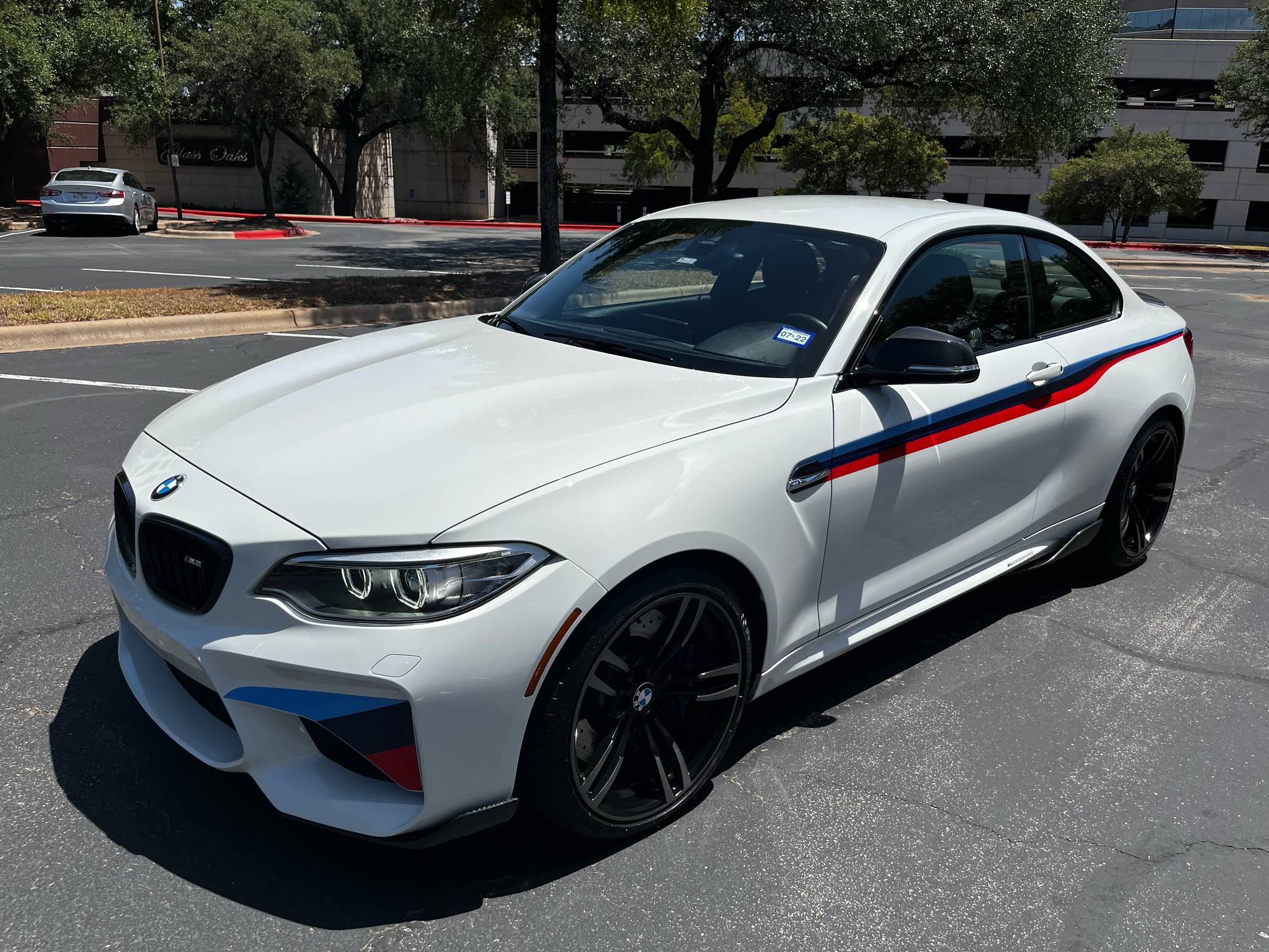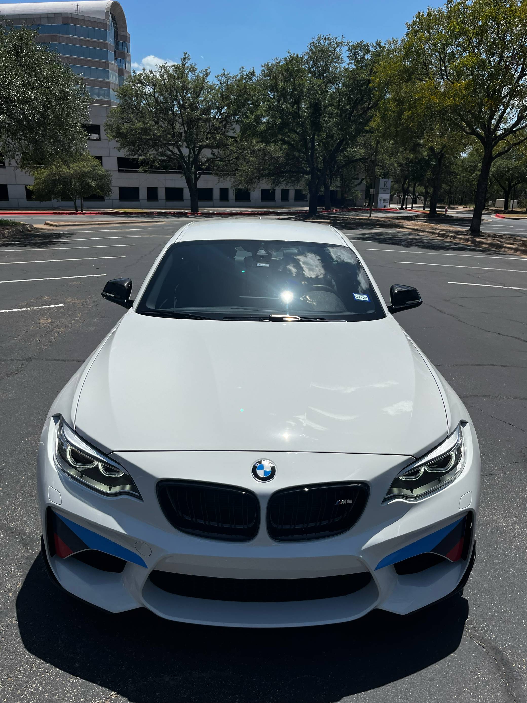 2017 BMW M2, finished in Alpine White with a black interior. Factory equipment includes the M Performance, Executive, and M Driver's packages, a carbon fiber aero kit, BMW Motorsport stripes, Dakota leather upholstery with blue stitching, carbon fiber and Alcantara trim, stainless steel pedals, Apple CarPlay compatibility, and a Harman/Kardon sound system. The seller reports no modifications. BMW introduced the F87 M2 for the 2016 model year as a high-performance evolution of the "F22"-generation 2 Series. Developed to replace the vaunted 1 Series M Coupe, it was celebrated as one of BMW M's greatest modern hits. It stood out from the 2 Series thanks to a more powerful engine, a revised chassis, M-specific suspension with aluminum components, and a more muscular-looking exterior design. Power comes from a turbocharged "N55" 3. 0-liter straight-6 engine, rated at 365 horsepower and 343 lb-ft of torque. Output is sent to the rear wheels via a 7-speed double-clutch automatic transmission.