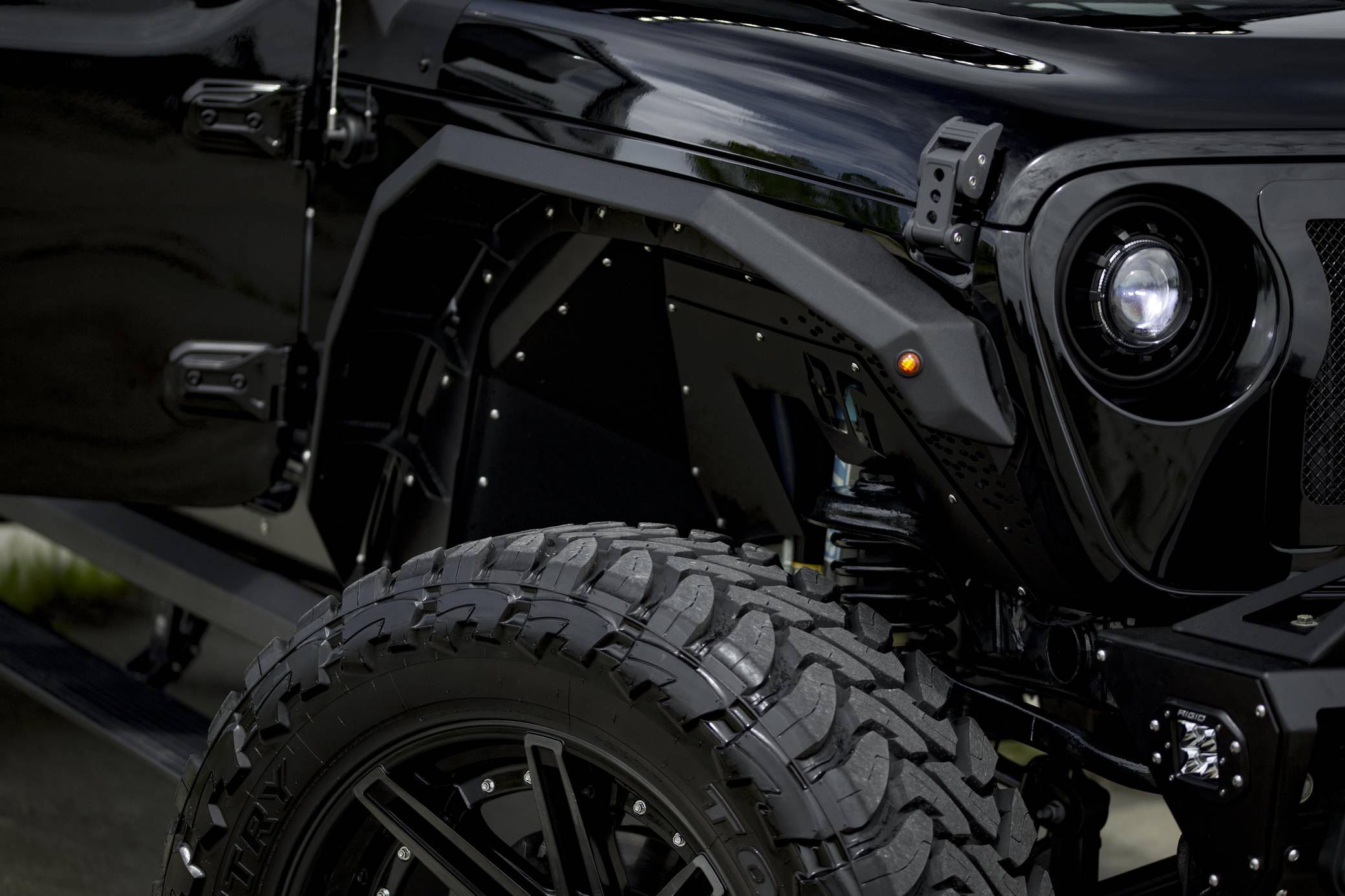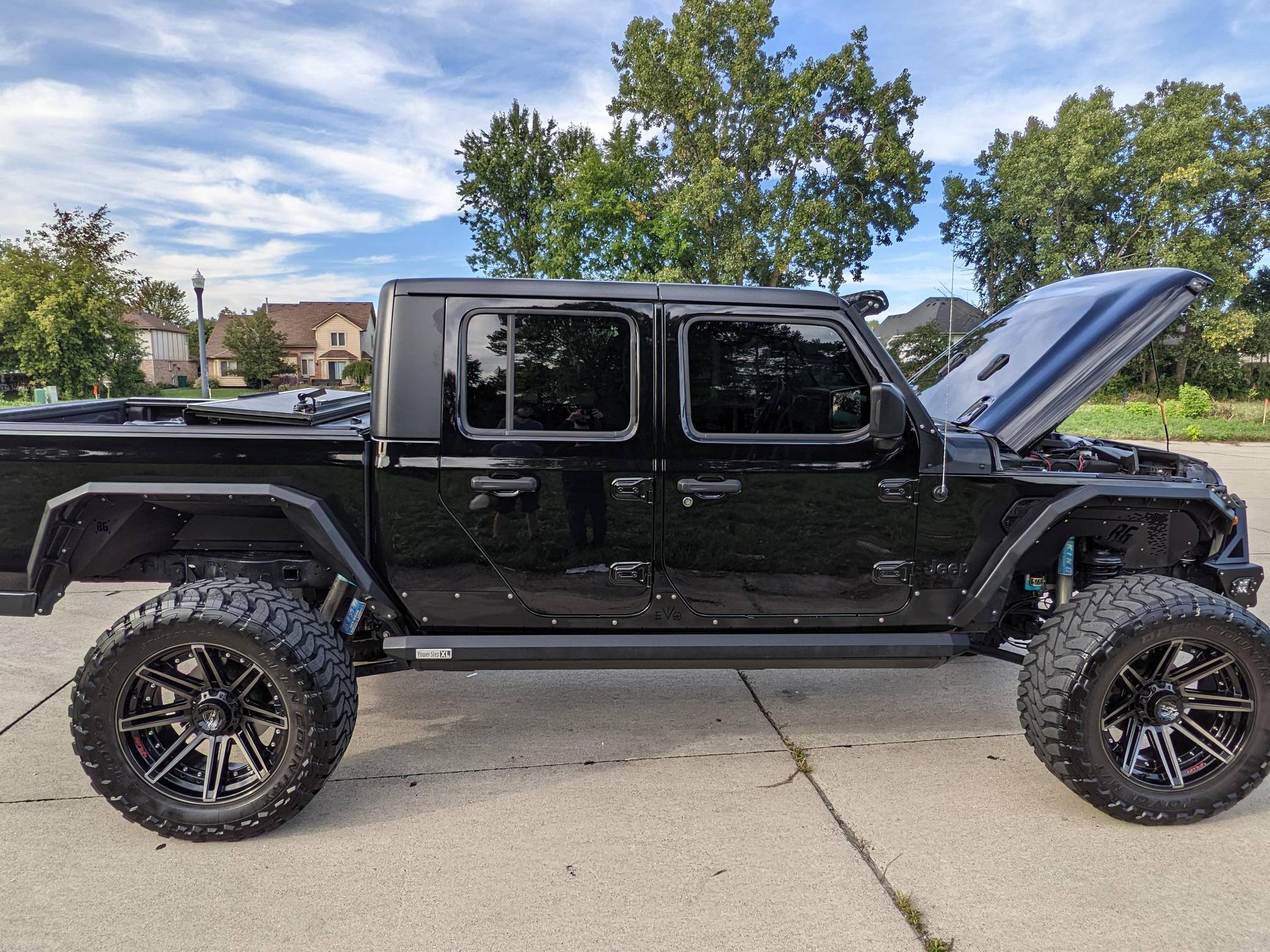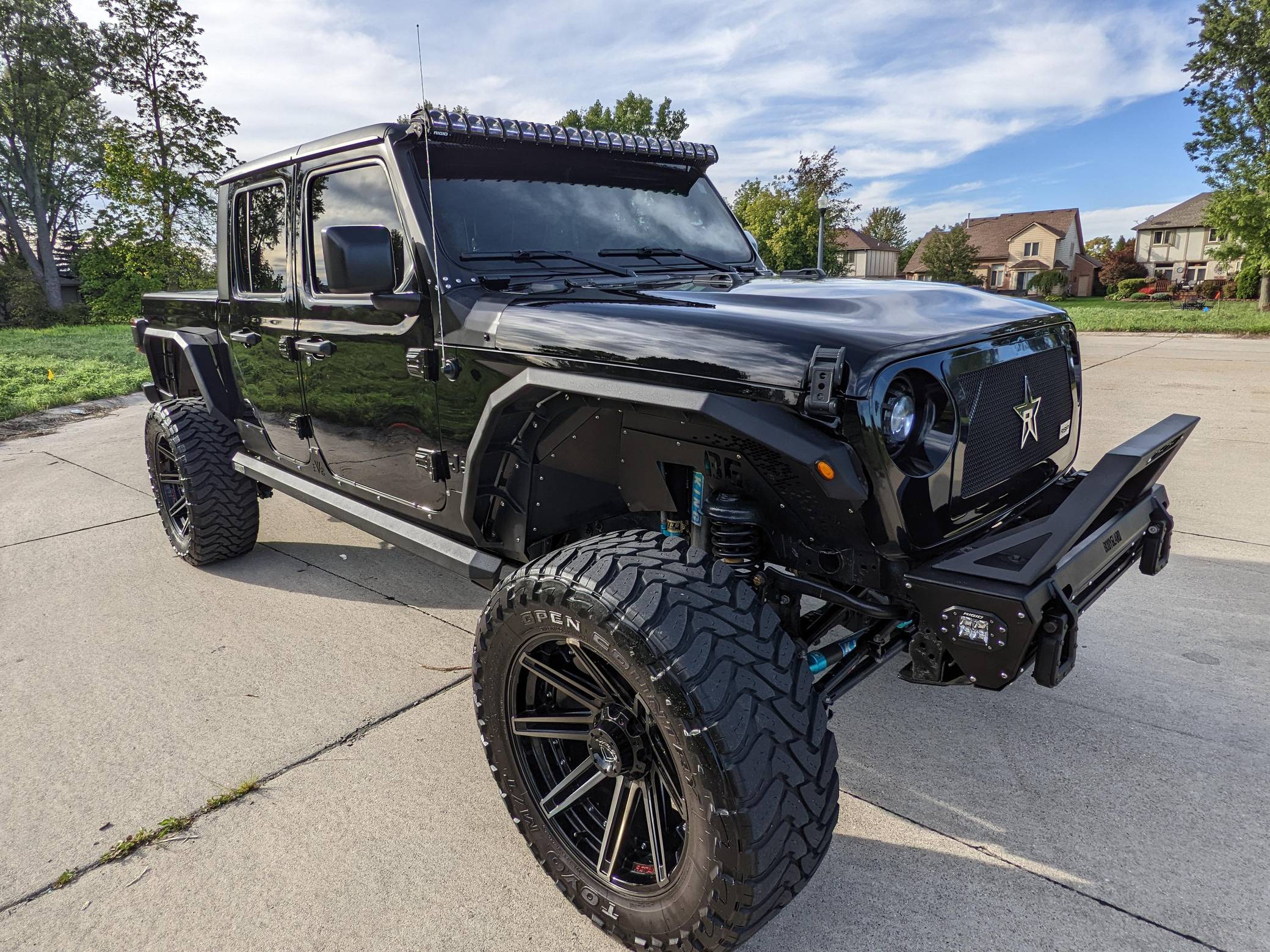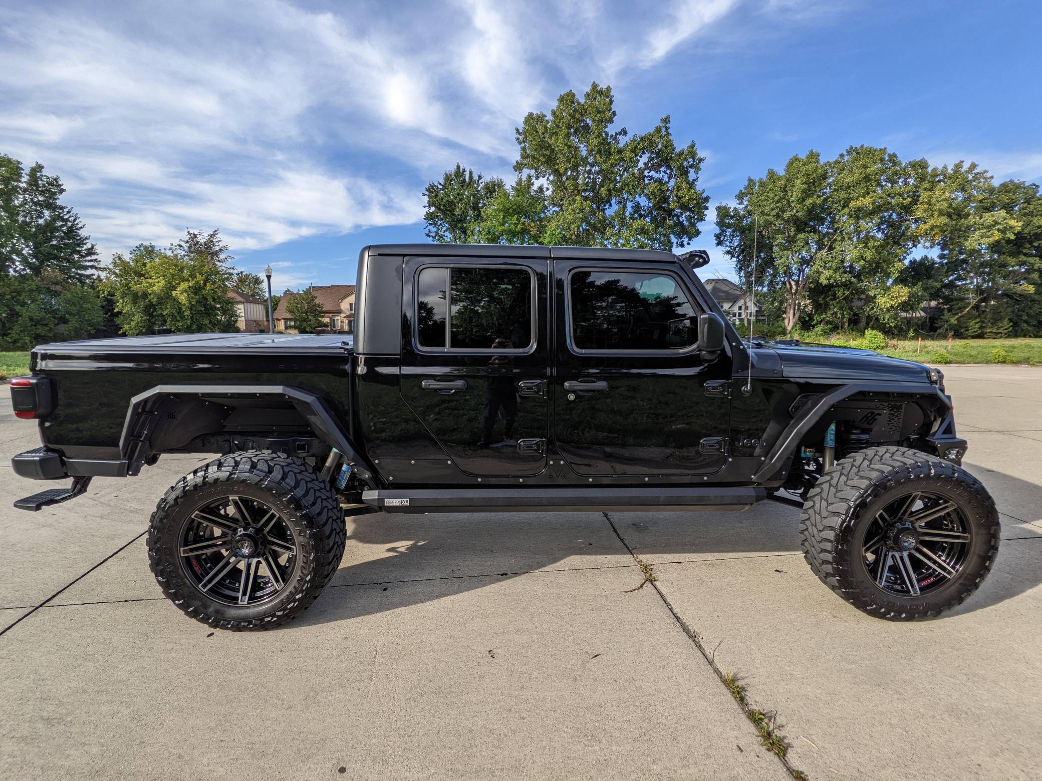 THIS. . . is a 2020 Jeep Gladiator Sport 4x4, finished in black with a black interior. It also confirms that it's a one-owner truck. A partial list of notable equipment includes a Command-Trac 4WD system, a 3-piece hard top, LED taillights, heated front seats, a heated steering wheel, an Alpine audio system, remote start, blind-spot monitoring, and a Uconnect 4 infotainment system with Android Auto and Apple CarPlay. Modifications to this Gladiator are extensive, and the full list is detailed below. include 22-inch 4Play wheels with Toyo M/T Open Country 37-inch tires, an EVO Manufacturing 4. 5-inch lift kit with King shocks, a Rigid Industries light bar, AMP Research power running boards, a Bodyguard RX front bumper, Bodyguard RX fenders, and Katzkin TekStitch Tuscany leather interior. The Gladiator -- Jeep's first pickup in nearly three decades -- arrived for the 2020 model year. Closely related to the Wrangler JL, the Gladiator rides on a 137. 3-inch wheelbase and boasts a 60. 3-inch bed. With the Max Tow package and the 8-speed automatic transmission, a stock Gladiator Sport is rated to lug up to 7,650 pounds. Power comes from a 3. 6-liter V6 engine, rated at 285 horsepower and 260 lb-ft of torque. Output is sent to the four wheels via an 8-speed automatic transmission and a Command-Trac part-time 2-speed transfer case.