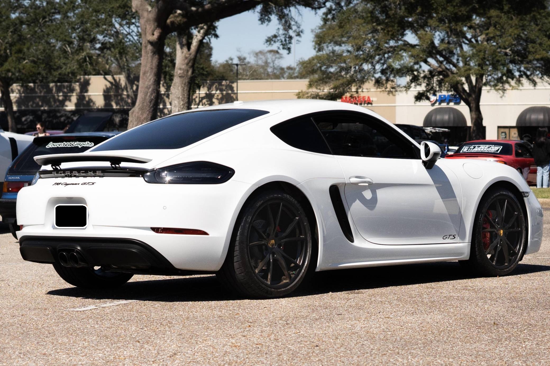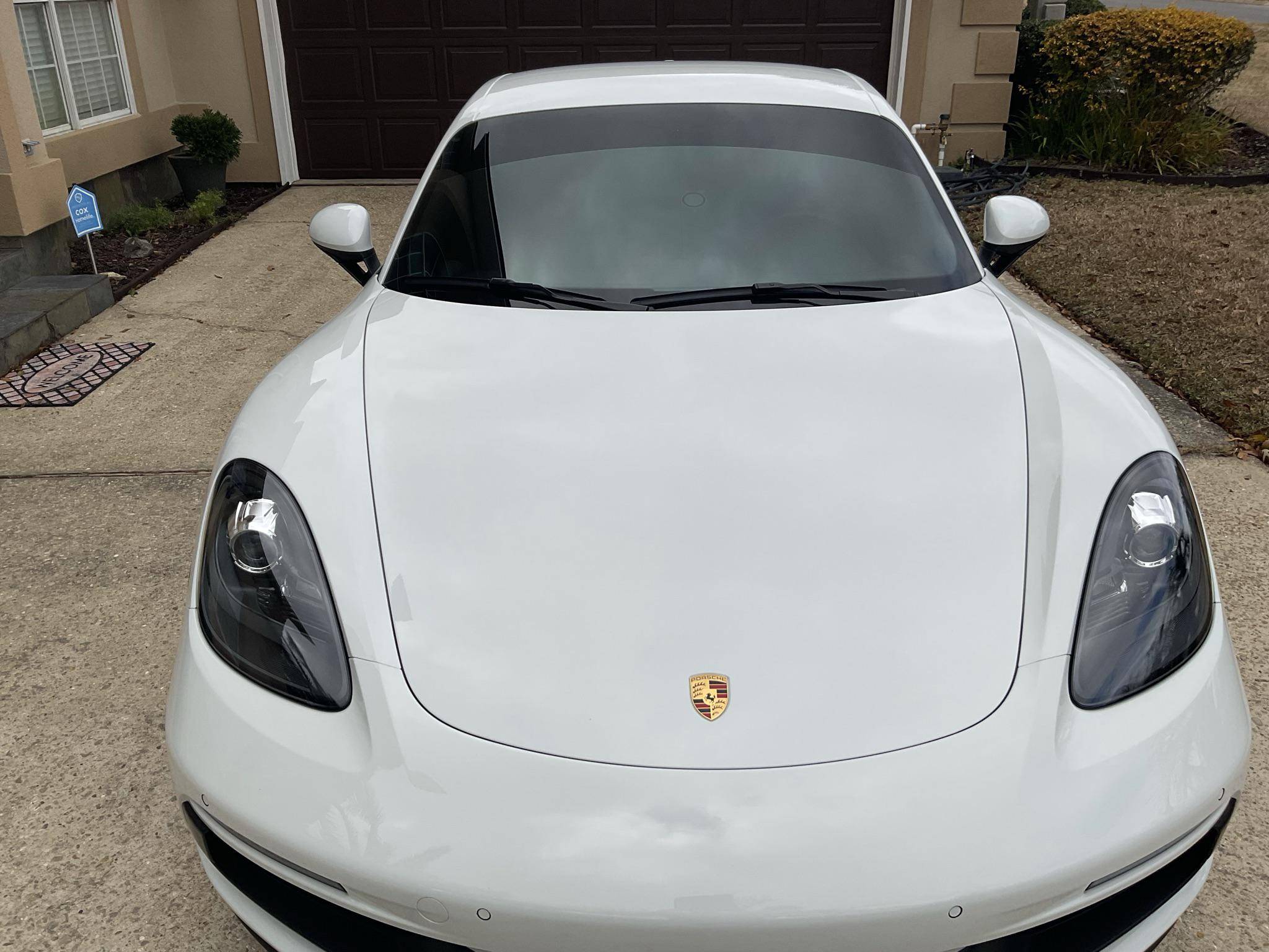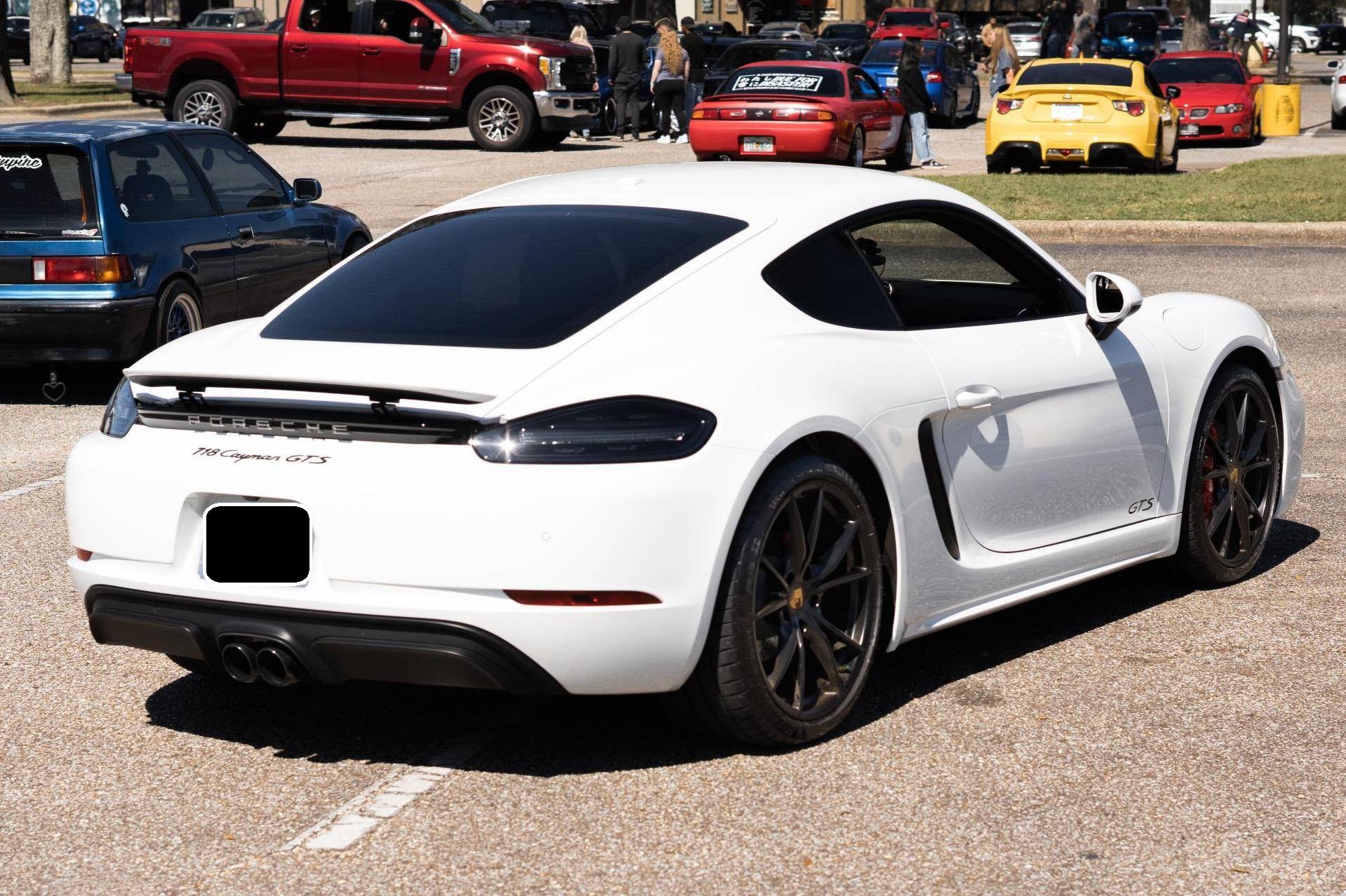 2019 Porsche 718 Cayman GTS, finished in white with a black interior. This Cayman is equipped with the desirable 6-speed manual transmission, and the odometer currently displays about 8,300 miles. A build sheet is provided in the photo gallery, and a partial list of notable equipment includes the Sport Chrono Package, GTS Interior Package, SportDesign Package, full carbon fiber bucket seats, carbon fiber interior trim, tachometer in Guards Red, and front and rear ParkAssist. Modifications are limited to tinted windows. The "982" generation 718 Cayman debuted for the 2017 model year as an evolution on the Cayman nameplate, with the "718" designation paying homage to Porsche's 718 race cars from the 1950s. The model's powerplant was updated with a turbocharged 4-cylinder engine, and the result was a more powerful and more efficient car than its predecessor. The GTS model received a more powerful 2. 5-liter motor, as well as a Porsche Sport Exhaust and PASM adaptive suspension as standard equipment, among other upgrades over the S model. Power comes from a mid-mounted 2. 5-liter turbocharged flat-4, rated at 365 horsepower and 309 lb-ft of torque. Output is sent to the rear wheels via a 6-speed manual transmission.