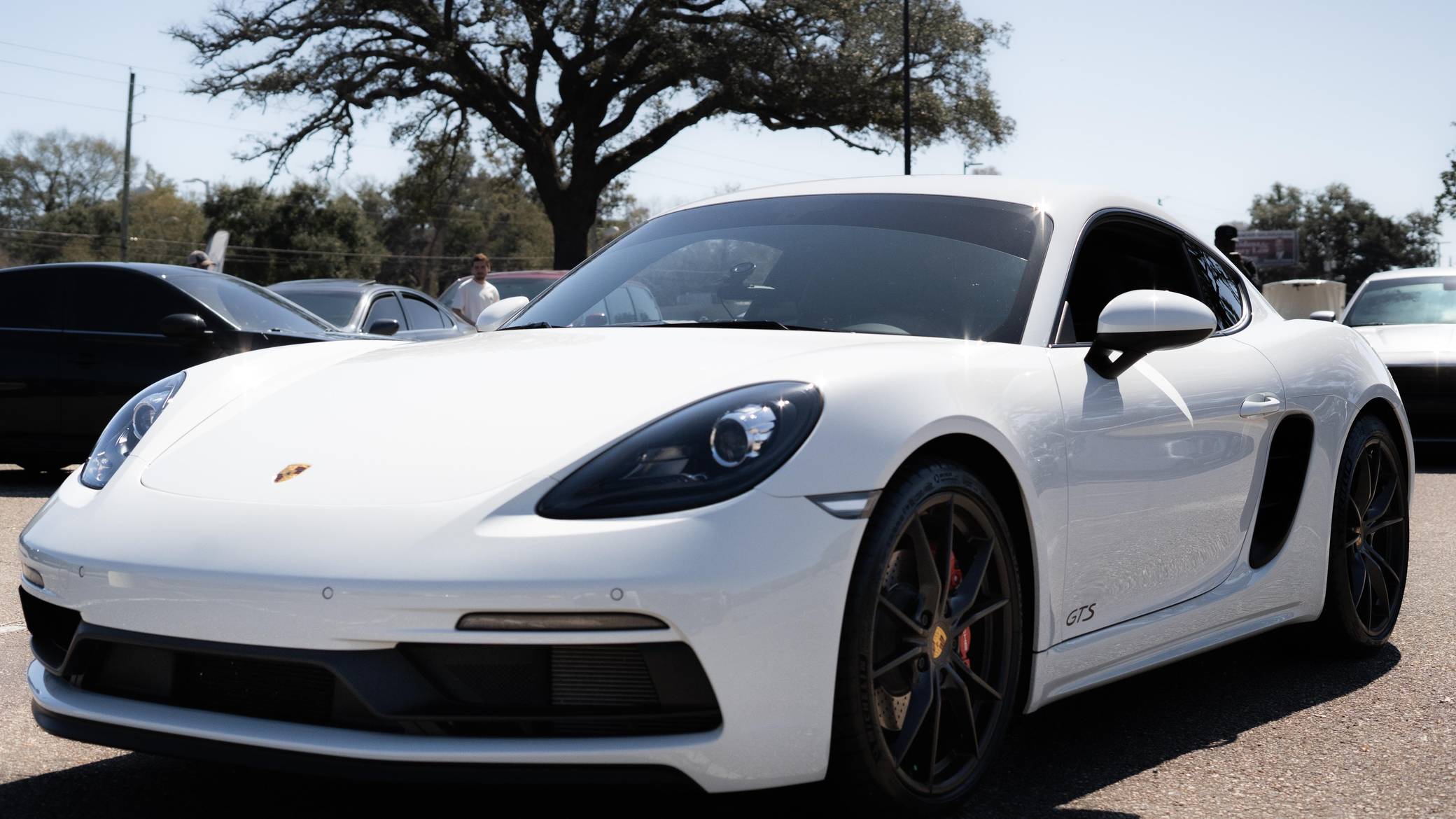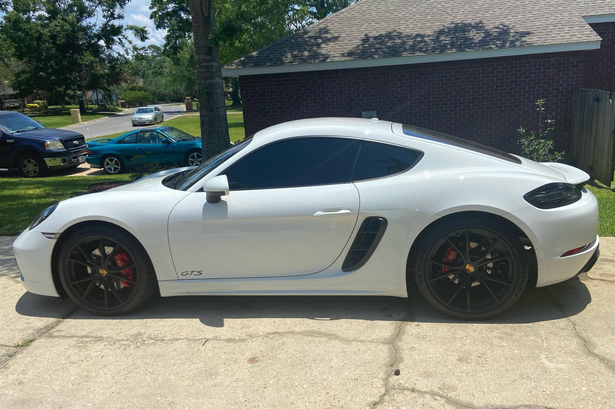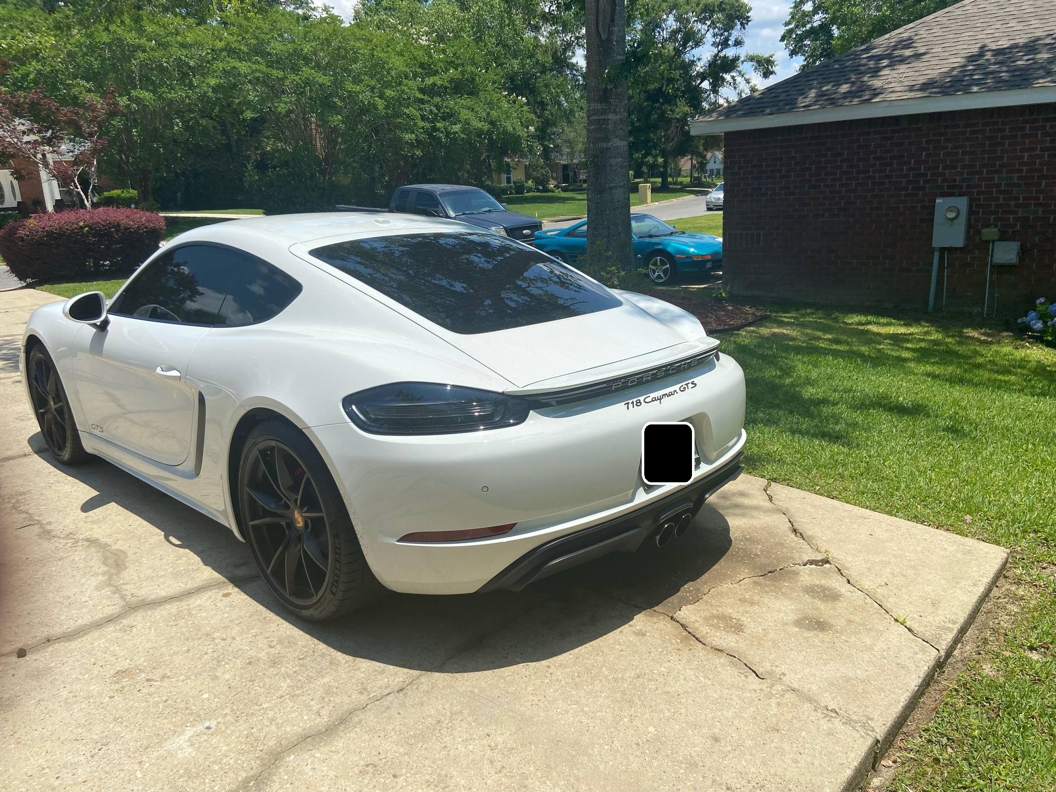 2019 Porsche 718 Cayman GTS, finished in white with a black interior. This Cayman is equipped with the desirable 6-speed manual transmission, and the odometer currently displays about 8,300 miles. A build sheet is provided in the photo gallery, and a partial list of notable equipment includes the Sport Chrono Package, GTS Interior Package, SportDesign Package, full carbon fiber bucket seats, carbon fiber interior trim, tachometer in Guards Red, and front and rear ParkAssist. Modifications are limited to tinted windows. The "982" generation 718 Cayman debuted for the 2017 model year as an evolution on the Cayman nameplate, with the "718" designation paying homage to Porsche's 718 race cars from the 1950s. The model's powerplant was updated with a turbocharged 4-cylinder engine, and the result was a more powerful and more efficient car than its predecessor. The GTS model received a more powerful 2. 5-liter motor, as well as a Porsche Sport Exhaust and PASM adaptive suspension as standard equipment, among other upgrades over the S model. Power comes from a mid-mounted 2. 5-liter turbocharged flat-4, rated at 365 horsepower and 309 lb-ft of torque. Output is sent to the rear wheels via a 6-speed manual transmission.