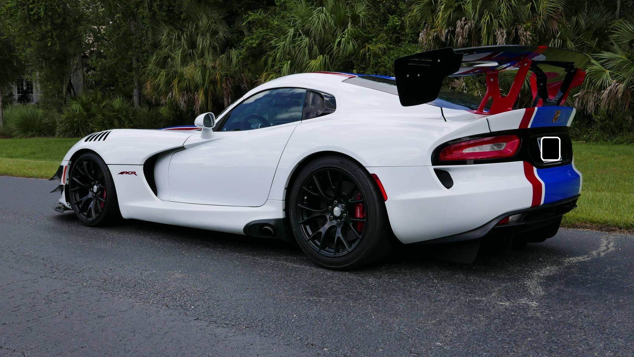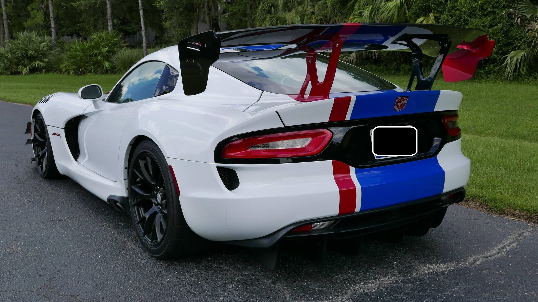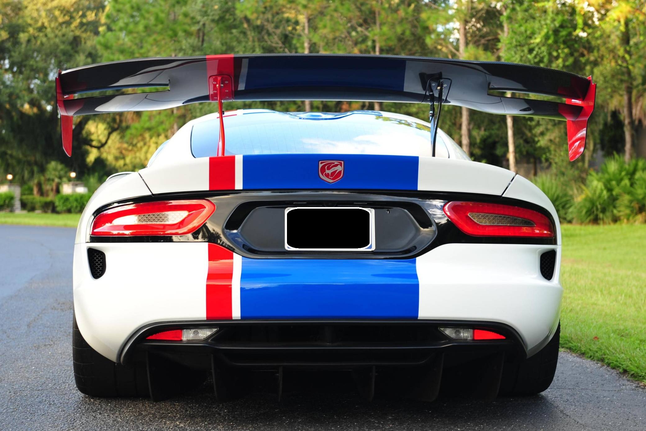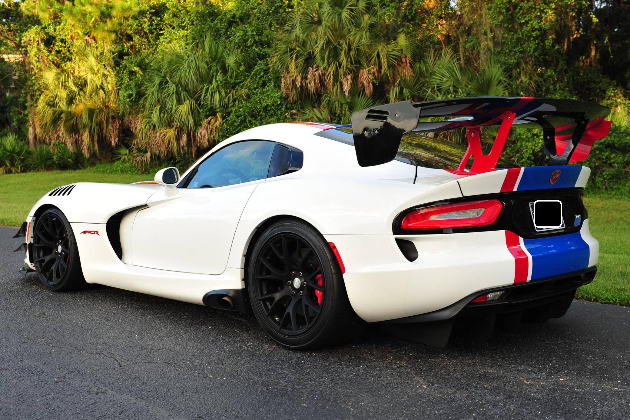 2017 Dodge Viper ACR Extreme, finished in Viper White with Adrenaline Red and Competition Blue stripes, and a black interior. The odometer on this Viper currently displays approximately 14,400 miles. A partial list of notable equipment includes the ACR Package, Extreme Aero Package, ACR Interior Package, a limited-slip differential, Brembo carbon ceramic brake system, an aluminum structural X-brace, an 8. 4-inch touchscreen display, and a Harman Kardon 12-speaker high performance audio system. The only modifications reported by the seller are an aftermarket shift knob, and a paint protection film applied to the entire exterior. The fifth-generation "VX I" Viper launched in 2013 and replaced the fourth-generation "ZB II" Viper, which finished production in 2010. Launched under the SRT brand, the fifth generation Viper was unveiled at the 2012 New York International Auto Show. The ACR Extreme is the most track-focused Viper variant, with manually adjustable suspension, and significantly increased aero amounting to over 1700 pounds of down force at its 177 mph top speed. This "Dealer Edition" Viper is 1 of 22 produced for top-selling Viper dealers Tomball Dodge and Roanoke Dodge; a plaque on the glovebox indicates that this is #1 of the units designated for Roanoke Dodge. Power comes from an 8. 4-liter V10, rated at 645 horsepower and 600 lb-ft of torque. The engine spins the rear wheels via a 6-speed manual transmission.