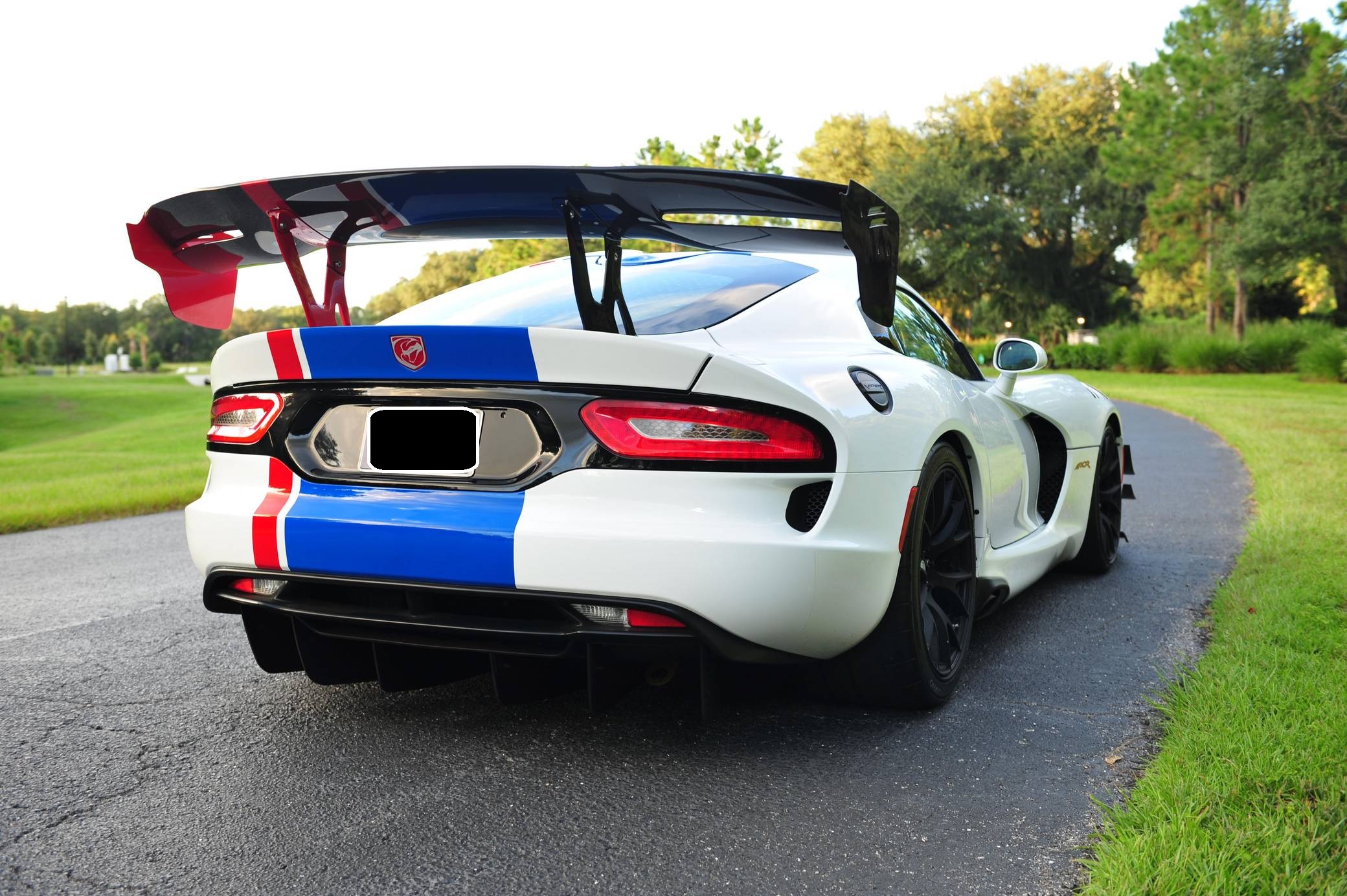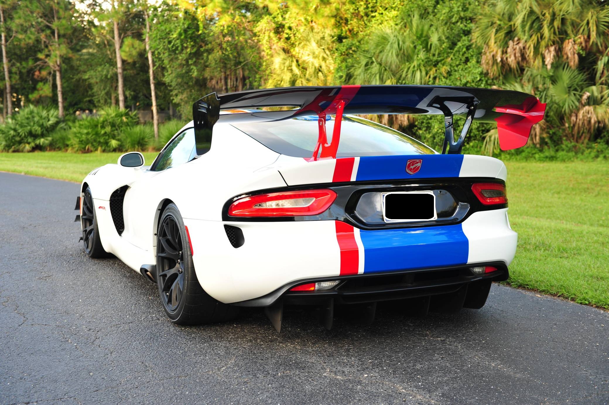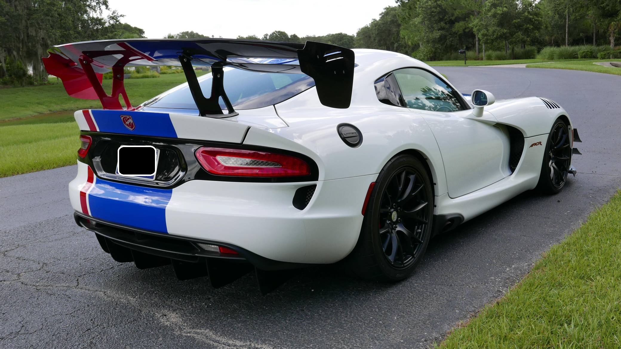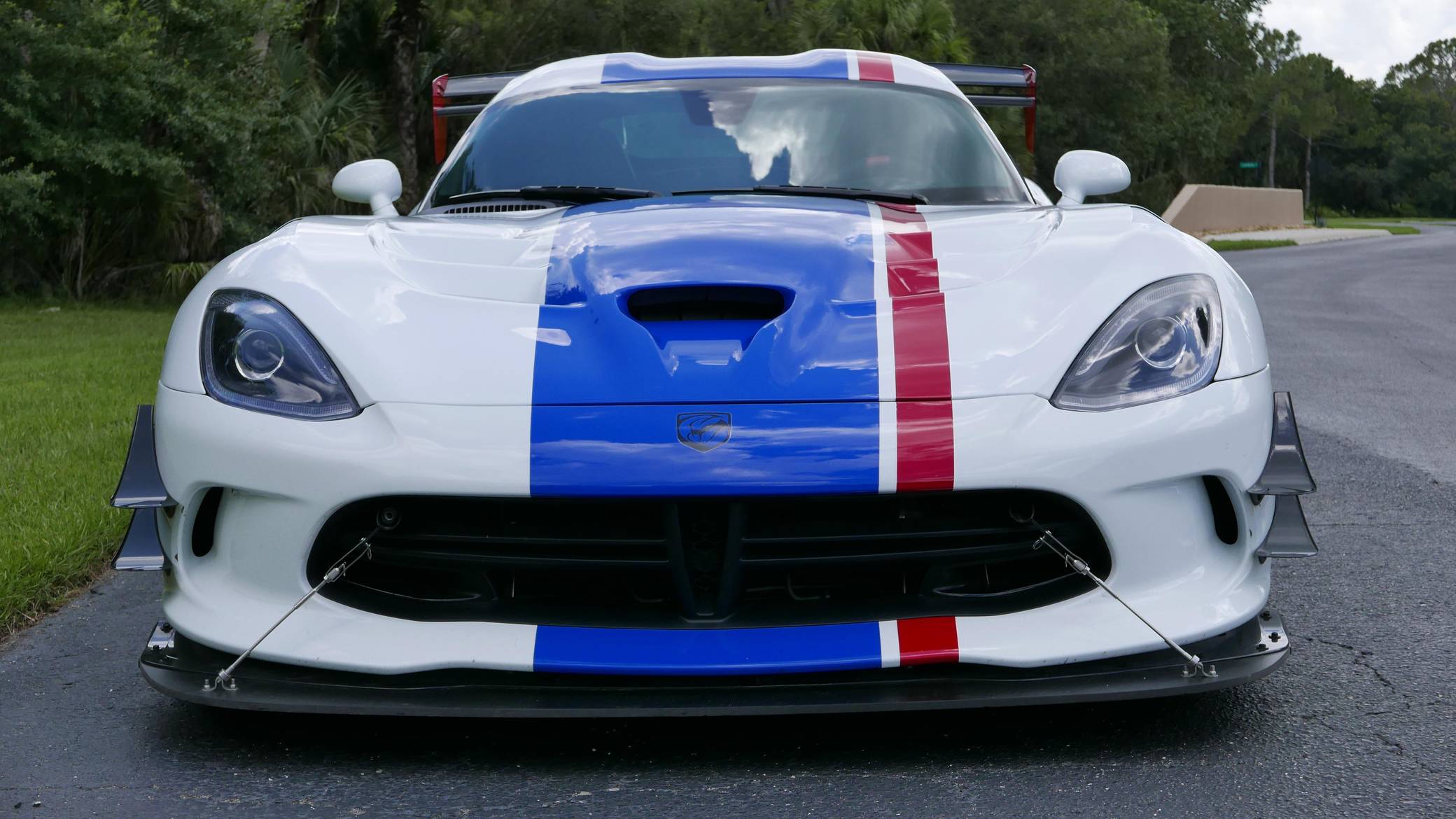 2017 Dodge Viper ACR Extreme, finished in Viper White with Adrenaline Red and Competition Blue stripes, and a black interior. The odometer on this Viper currently displays approximately 14,400 miles. A partial list of notable equipment includes the ACR Package, Extreme Aero Package, ACR Interior Package, a limited-slip differential, Brembo carbon ceramic brake system, an aluminum structural X-brace, an 8. 4-inch touchscreen display, and a Harman Kardon 12-speaker high performance audio system. The only modifications reported by the seller are an aftermarket shift knob, and a paint protection film applied to the entire exterior. The fifth-generation "VX I" Viper launched in 2013 and replaced the fourth-generation "ZB II" Viper, which finished production in 2010. Launched under the SRT brand, the fifth generation Viper was unveiled at the 2012 New York International Auto Show. The ACR Extreme is the most track-focused Viper variant, with manually adjustable suspension, and significantly increased aero amounting to over 1700 pounds of down force at its 177 mph top speed. This "Dealer Edition" Viper is 1 of 22 produced for top-selling Viper dealers Tomball Dodge and Roanoke Dodge; a plaque on the glovebox indicates that this is #1 of the units designated for Roanoke Dodge. Power comes from an 8. 4-liter V10, rated at 645 horsepower and 600 lb-ft of torque. The engine spins the rear wheels via a 6-speed manual transmission.