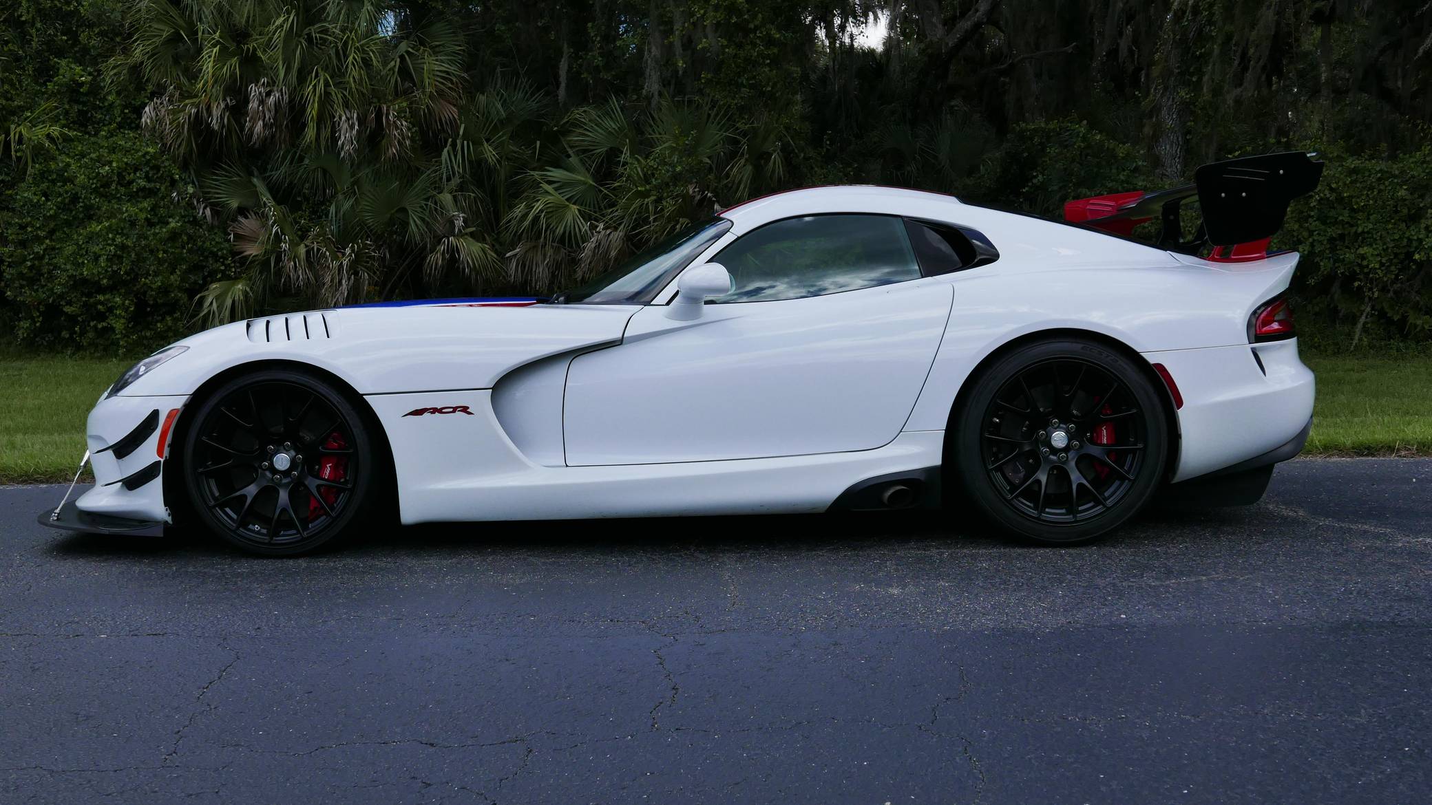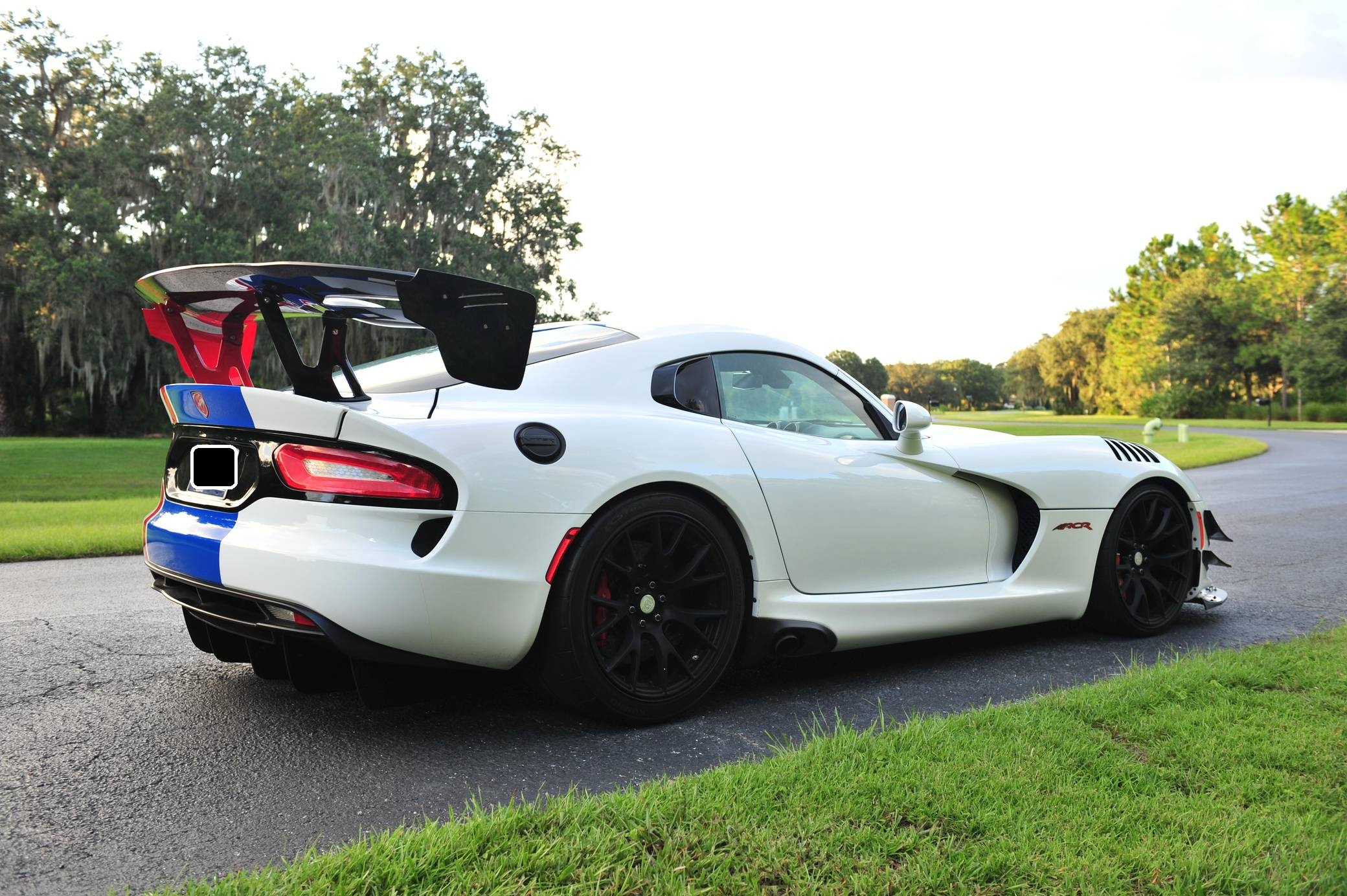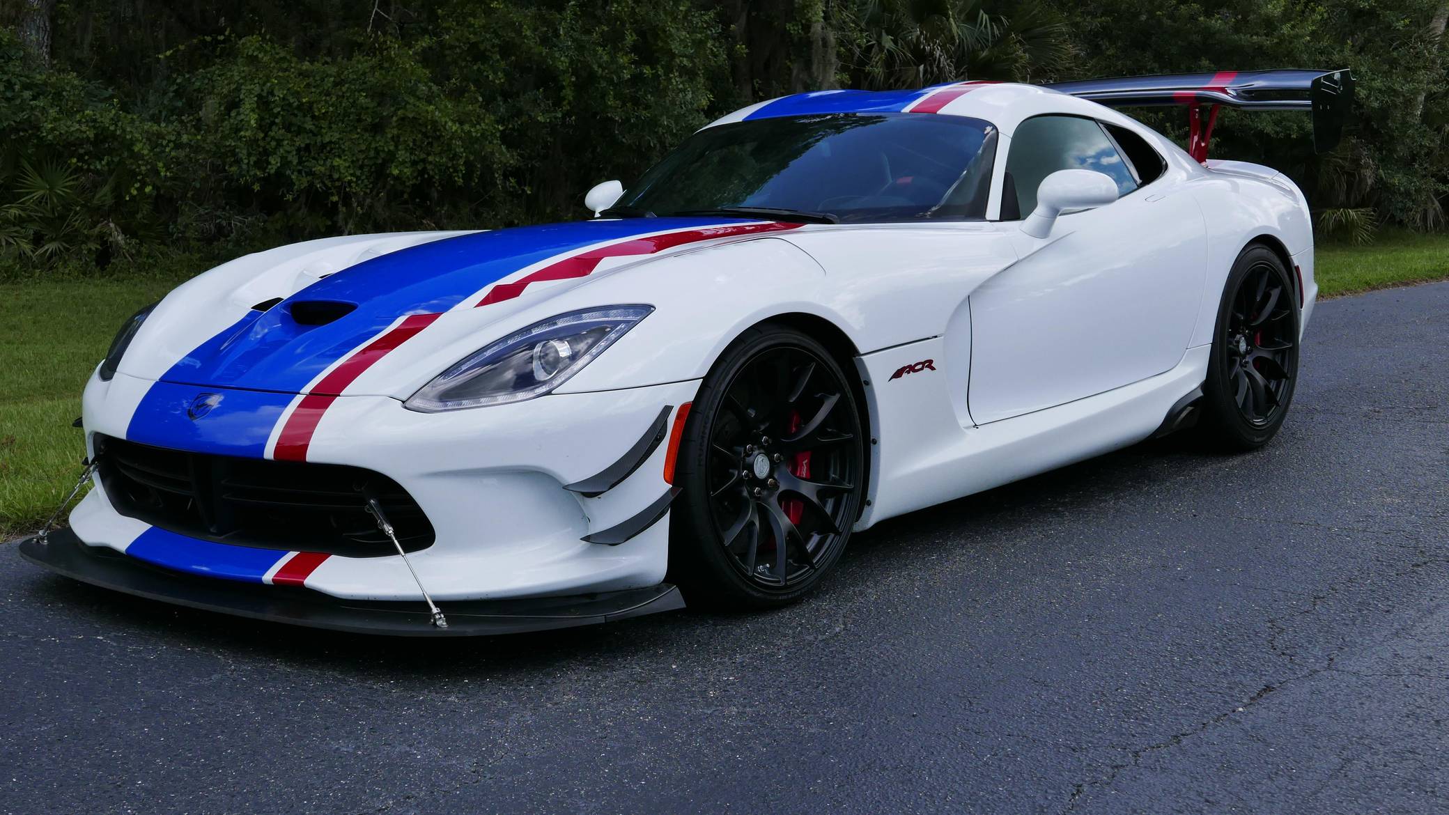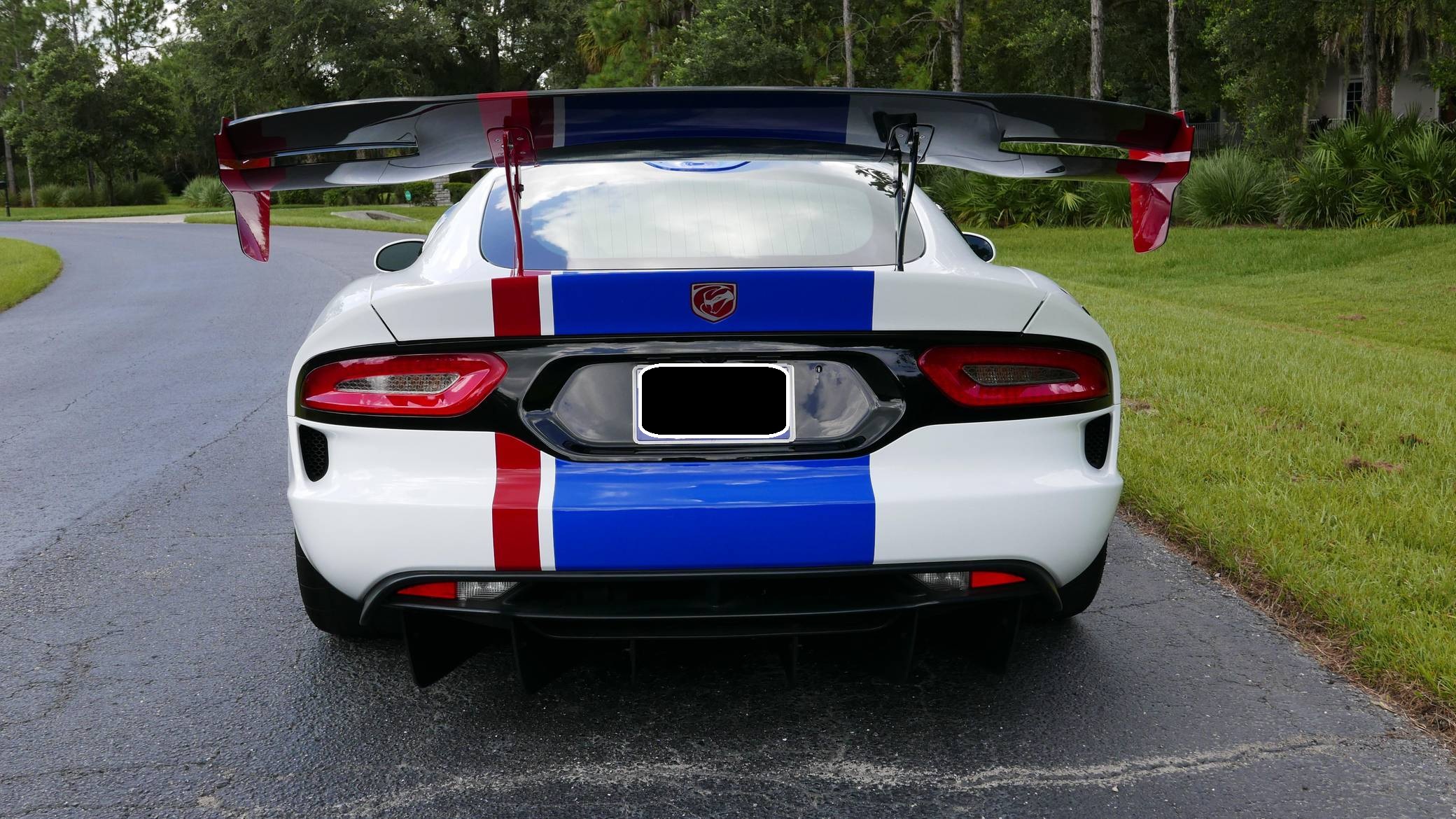 2017 Dodge Viper ACR Extreme, finished in Viper White with Adrenaline Red and Competition Blue stripes, and a black interior. The odometer on this Viper currently displays approximately 14,400 miles. A partial list of notable equipment includes the ACR Package, Extreme Aero Package, ACR Interior Package, a limited-slip differential, Brembo carbon ceramic brake system, an aluminum structural X-brace, an 8. 4-inch touchscreen display, and a Harman Kardon 12-speaker high performance audio system. The only modifications reported by the seller are an aftermarket shift knob, and a paint protection film applied to the entire exterior. The fifth-generation "VX I" Viper launched in 2013 and replaced the fourth-generation "ZB II" Viper, which finished production in 2010. Launched under the SRT brand, the fifth generation Viper was unveiled at the 2012 New York International Auto Show. The ACR Extreme is the most track-focused Viper variant, with manually adjustable suspension, and significantly increased aero amounting to over 1700 pounds of down force at its 177 mph top speed. This "Dealer Edition" Viper is 1 of 22 produced for top-selling Viper dealers Tomball Dodge and Roanoke Dodge; a plaque on the glovebox indicates that this is #1 of the units designated for Roanoke Dodge. Power comes from an 8. 4-liter V10, rated at 645 horsepower and 600 lb-ft of torque. The engine spins the rear wheels via a 6-speed manual transmission.