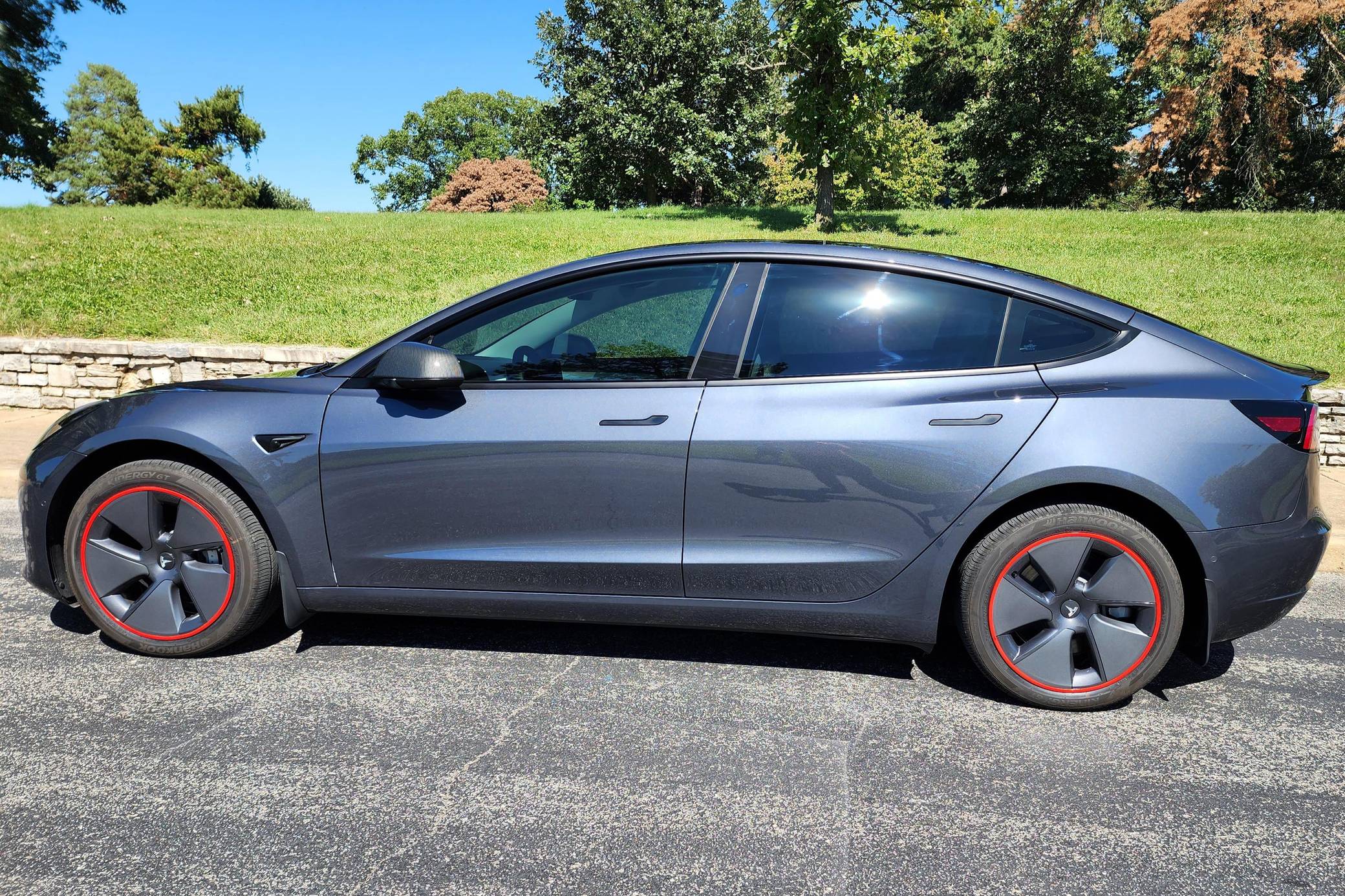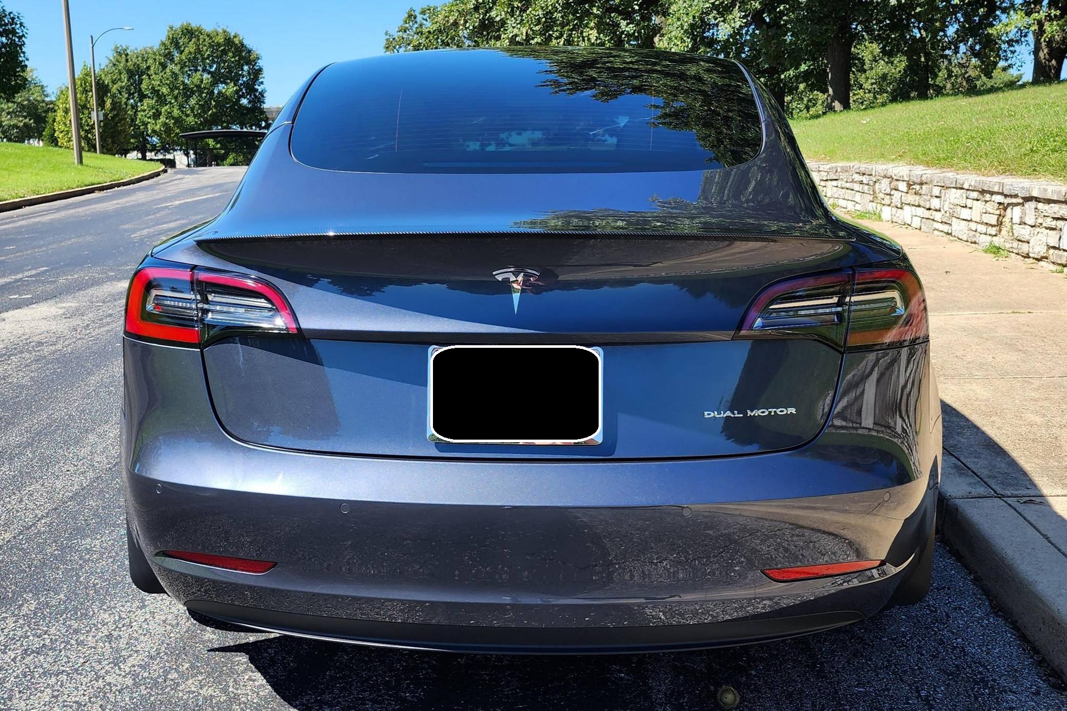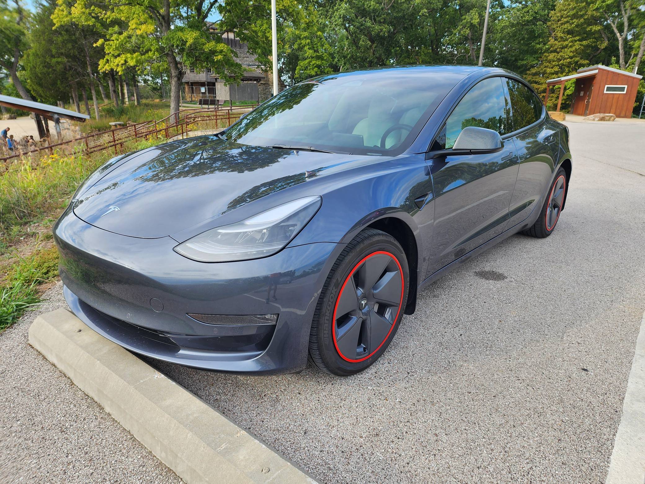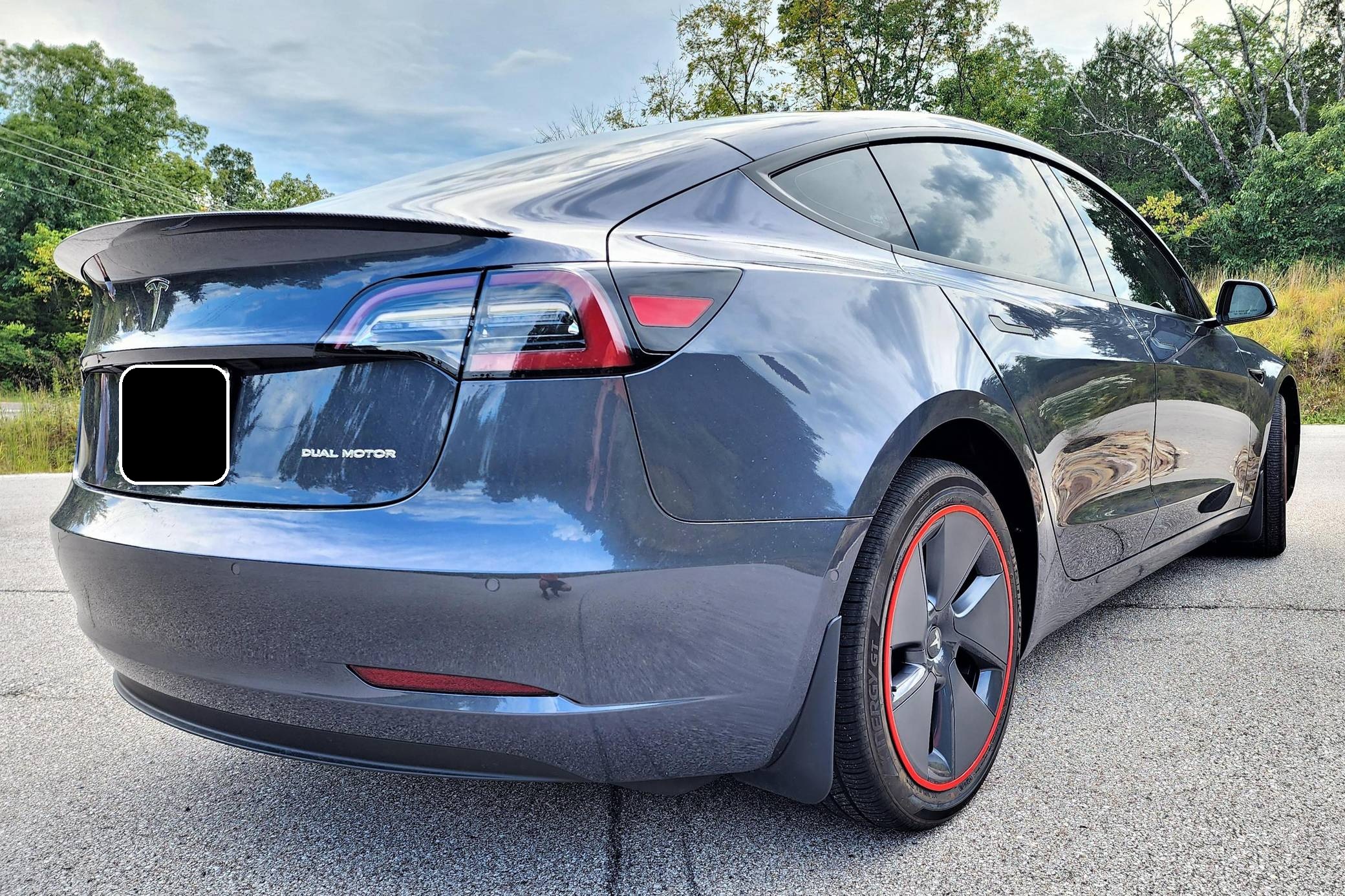 THIS. . . is a 2022 Tesla Model 3 Long Range AWD, finished in Midnight Silver Metallic with a white and black interior. Modifications reported by the seller include red wheel trim rings, carbon fiber mirror caps, a swiveling and tilting central touchscreen, an aftermarket rear lip spoiler, and a custom center arm rest. Positioned as Tesla's entry-level car, the Model 3 was celebrated as a premium EV with a usable range and respectable performance, all at a reasonably attainable price. It's still available today, and it has gone through several evolutions (including many software updates) since its introduction. Power comes from a pair of electric motors that draw electricity from an 82-kilowatt-hour lithium-ion battery pack to zap the four wheels with 346 horsepower and 389 lb-ft of torque, according to third-party estimates. In 2022, the Long Range received a maximum driving range rating of 358 miles from the EPA.