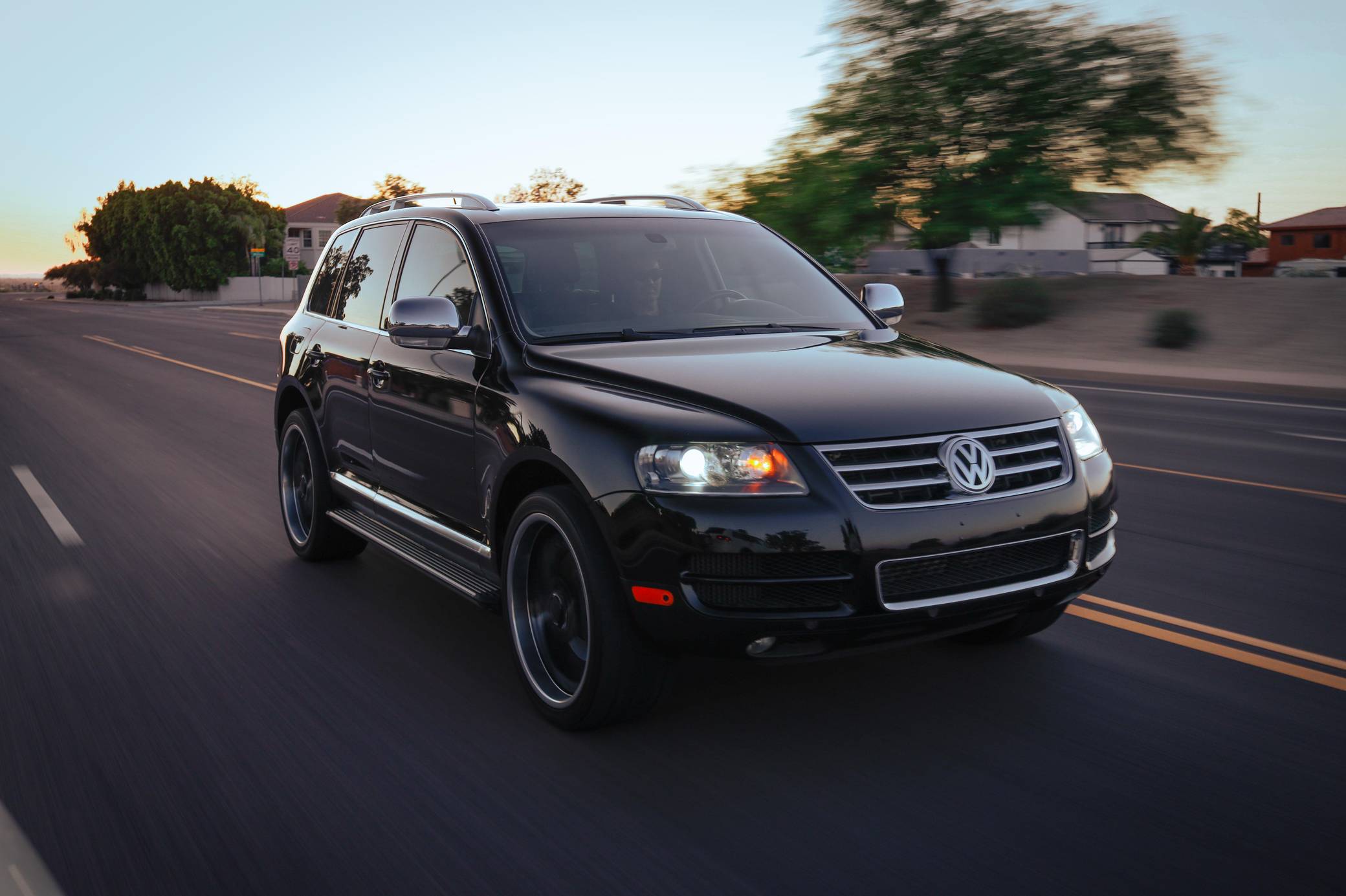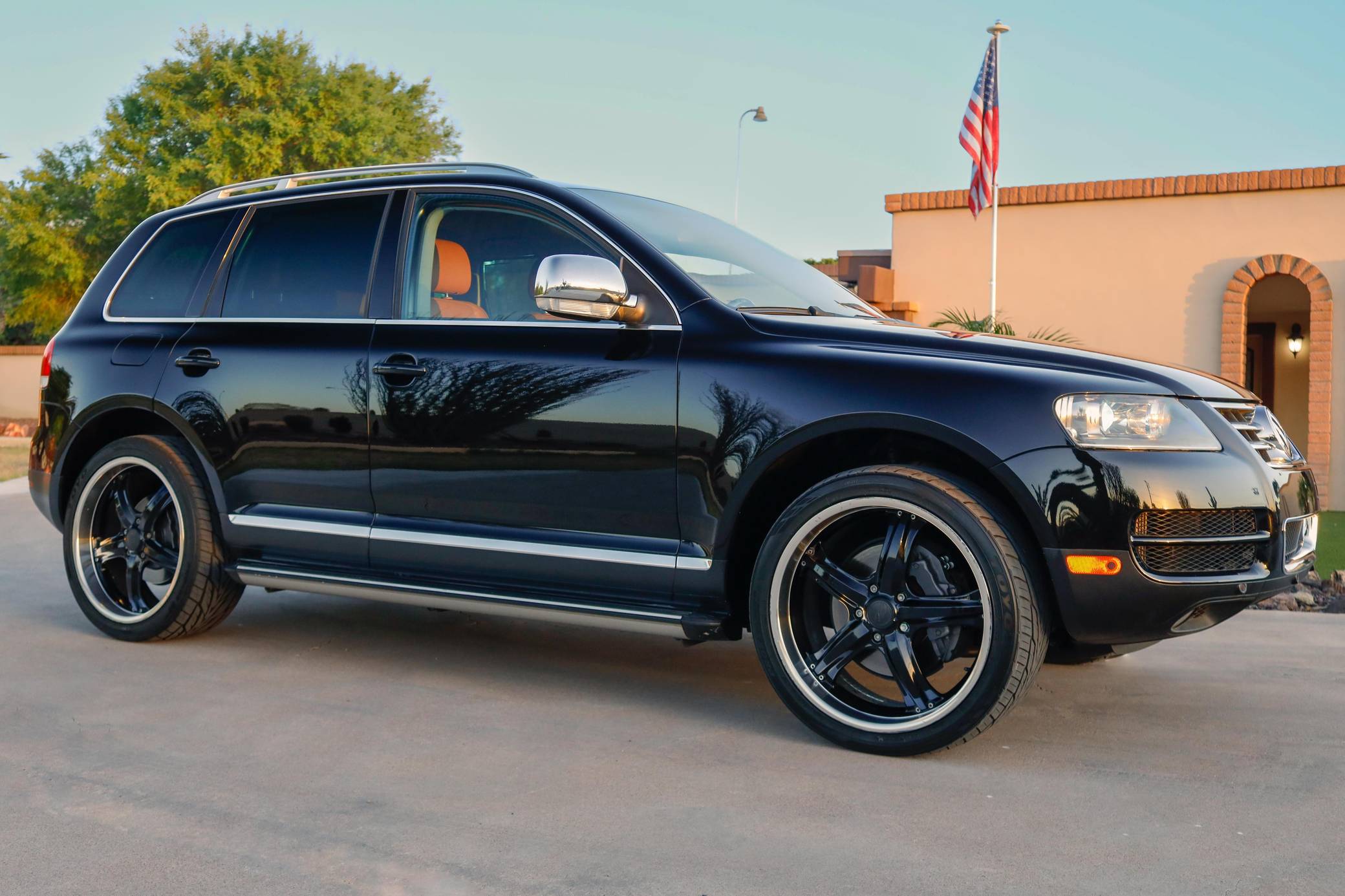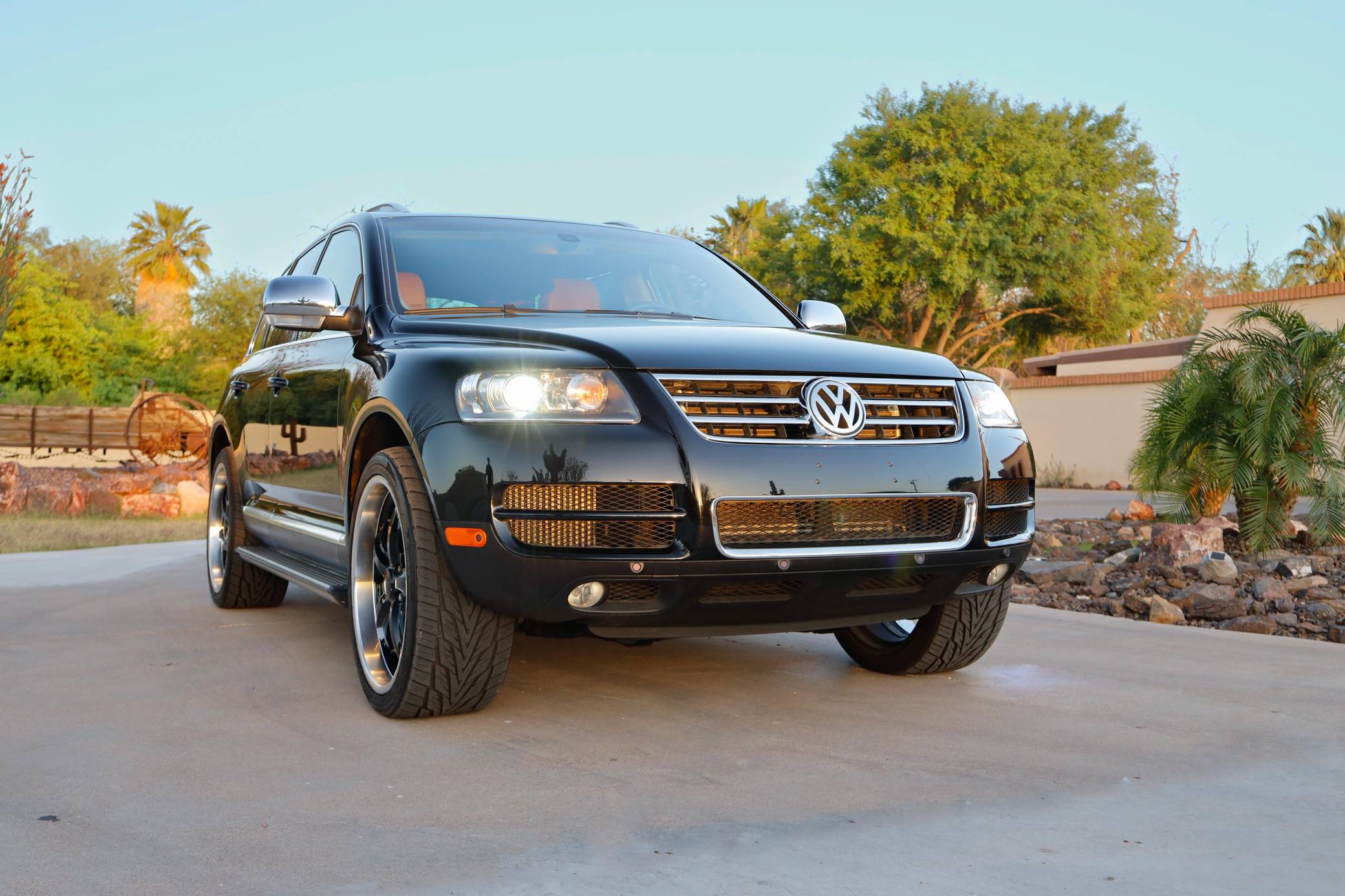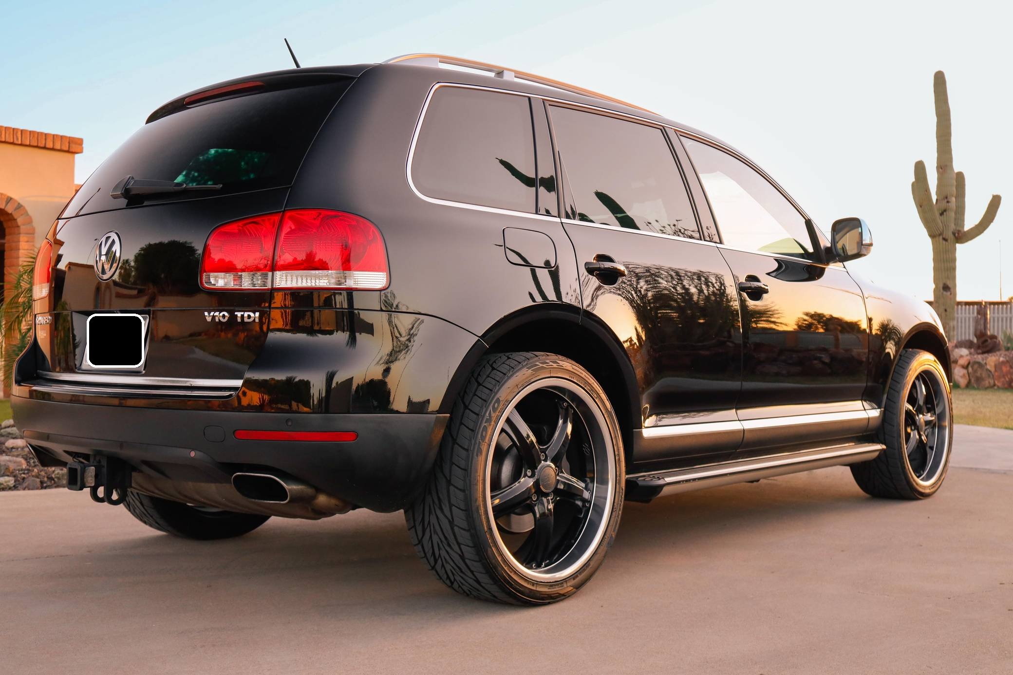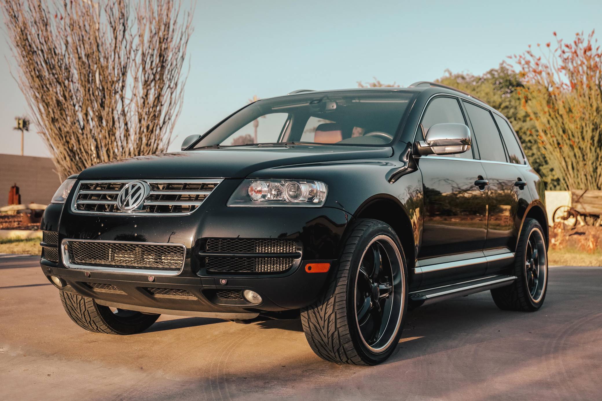 THIS… is a 2007 Volkswagen Touareg V10 TDI, finished in black with a Sioux interior. A build sheet is provided in the photo gallery, and a partial list of notable equipment includes Volkswagen's 4XMotion permanent all-wheel-drive system with low range gear, locking center and rear differentials, 4-corner air suspension with electronic shock absorption control, a power-operated sunroof, walnut wood interior trim, leather upholstery, heated front and rear seats, 4-zone automatic climate control, and a navigation system. Modifications reported by the seller are limited to 22-inch CEC wheels and aftermarket side steps. Volkswagen introduced the Touareg, its first modern SUV, for the 2004 model year. Part of the brand's upmarket push, it was related to the original Porsche Cayenne, and it was marketed as a true off-roader packed with luxury features. Many compared it to the Range Rover, as it could cross rivers, tow a boat, or cruise on the highway for hours on end. The V10 TDI-powered model was positioned at the top of the Touareg range in the United States, where the mighty W12 engine was never available on the Touareg. Power comes from a 5. 0-liter turbodiesel V10, rated at 310 horsepower and 553 lb-ft of torque. Output is sent to all four wheels via a 6-speed automatic transmission, Volkswagen's 4XMotion permanent four-wheel drive system, and locking center and rear differentials.
