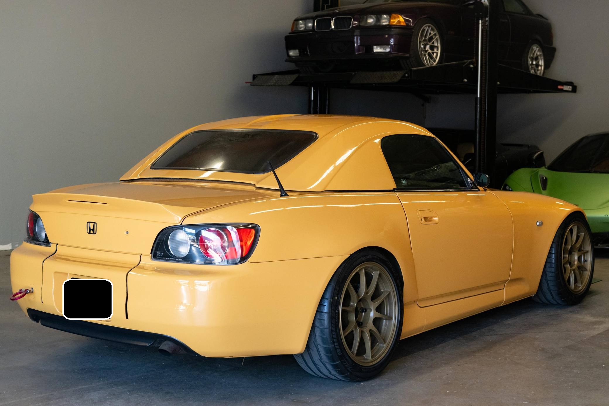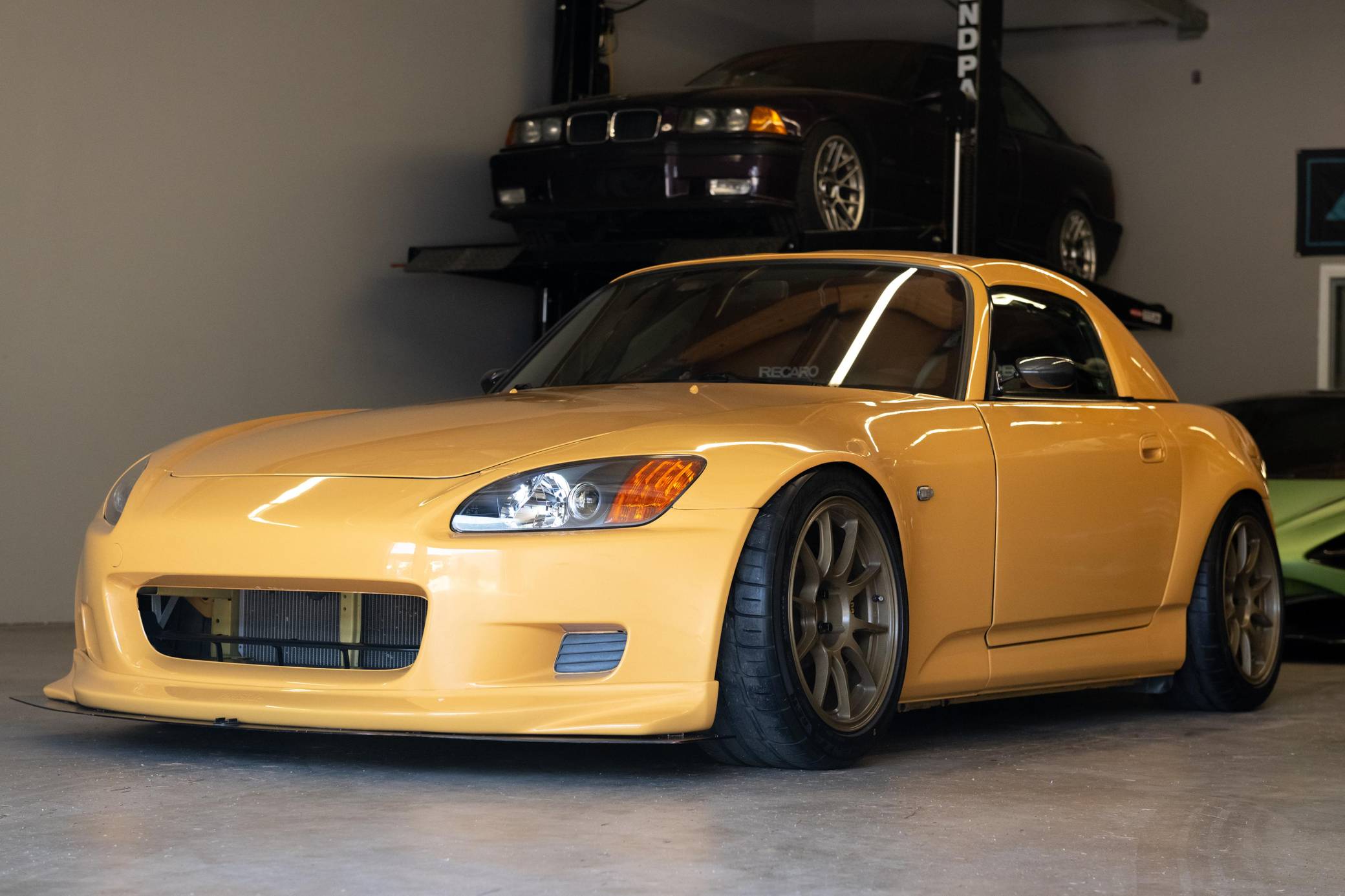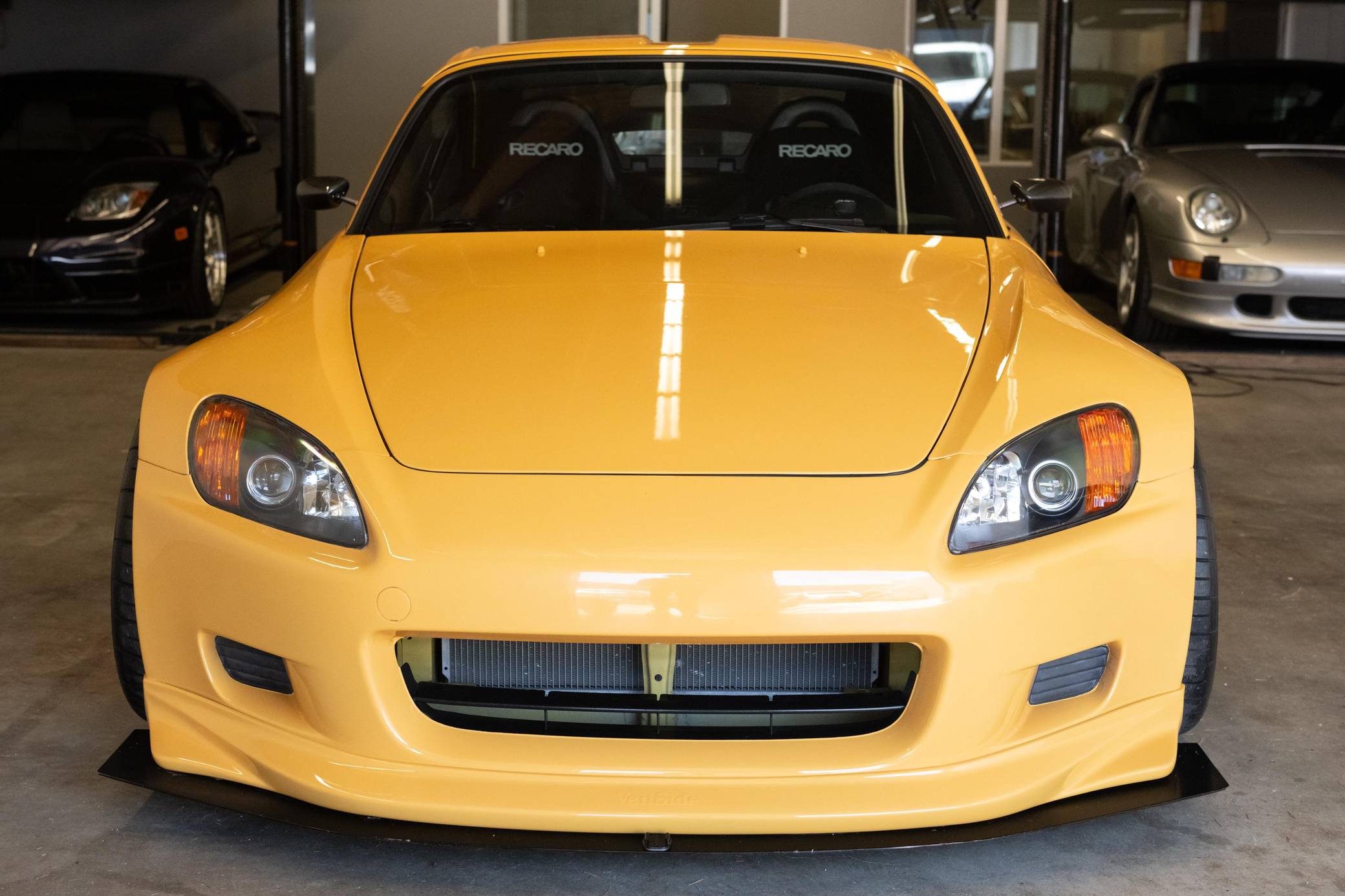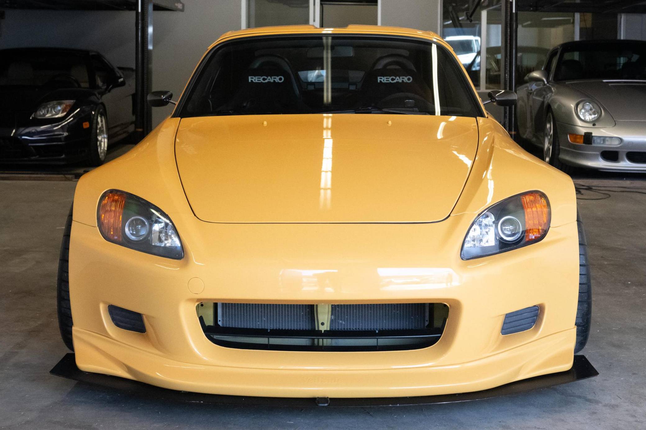 2002 Honda S2000, finished in Mellow Yellow with a black interior. Factory equipment includes a limited-slip differential, HID headlights, air conditioning, cruise control, and a CD player. Modifications to this S2000 are extensive, and the full list is detailed below. include 17-inch WedsSport TC105N wheels, an AP2 6-speed manual transmission, BMC Racing intake manifold, KW V3 coil overs, a color change from Spa Yellow to Mellow Yellow, Veilside front bumper and splitter, aftermarket widebody front fenders, aftermarket rear widebody, convertible soft top removed, Mugen Hardtop, Recaro SPG Seats, Seibon carbon fiber doors, and a Sparco Alcantara steering wheel. The Honda S2000 (known as "AP1" internally) was introduced for the 2000 model year; its model designation references the engine's 2000cc displacement, and its per-liter output was the highest of any naturally aspirated regular-production car. The AP1 also boasted 50/50 weight distribution and independently-sprung, double-wishbone suspension at each corner. Power comes from a 2. 0-liter inline-4 with VTEC technology, rated at 240 horsepower and 153 lb-ft of torque. This engine may be making more power as a result of the modifications, though a dyno sheet is not included. Output is sent to the rear wheels via a 6-speed manual transmission.