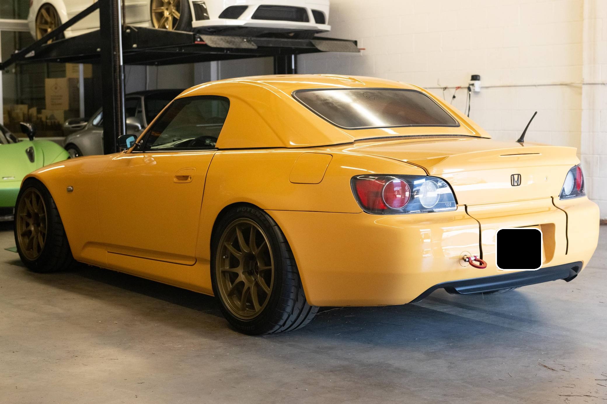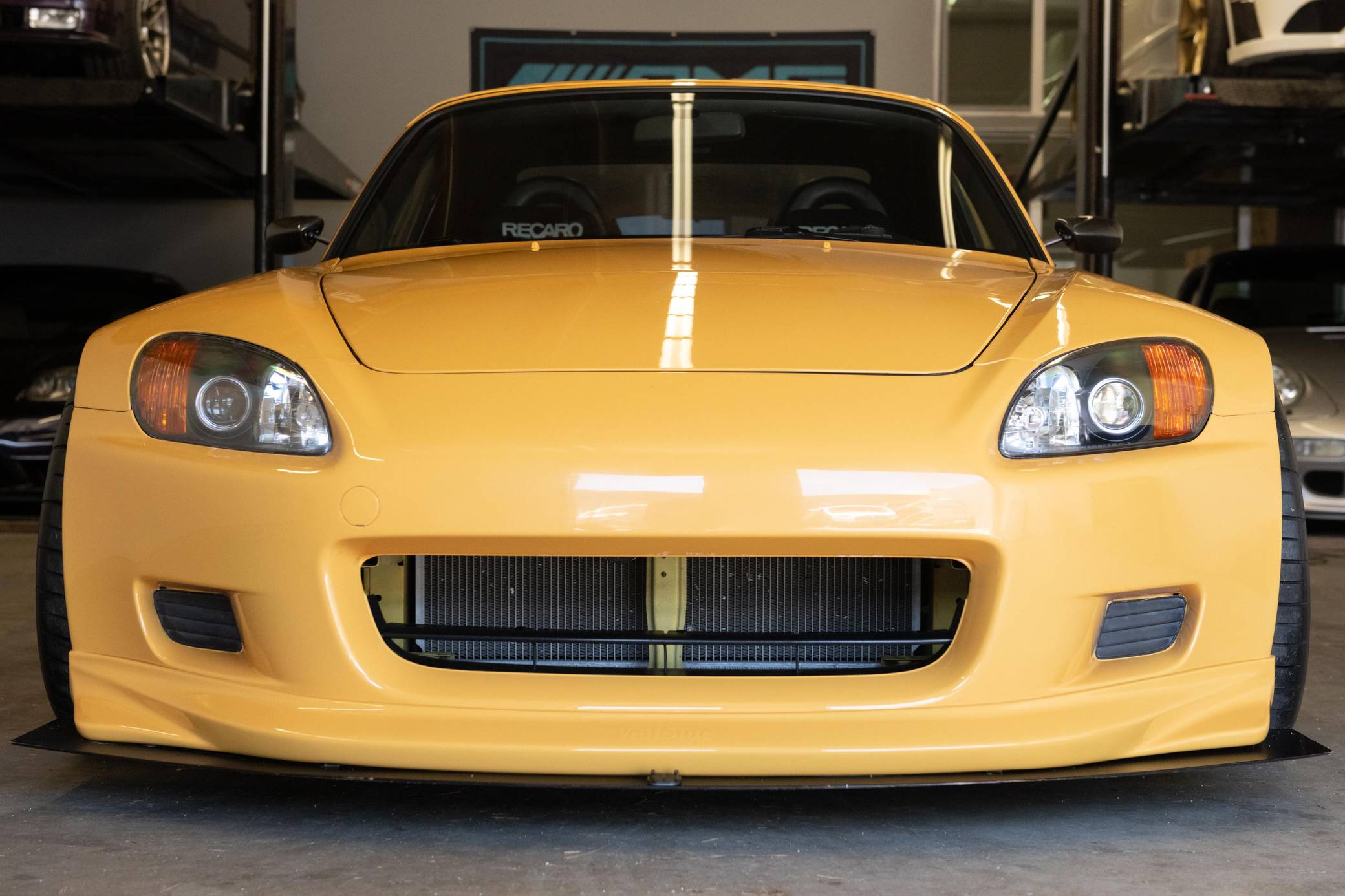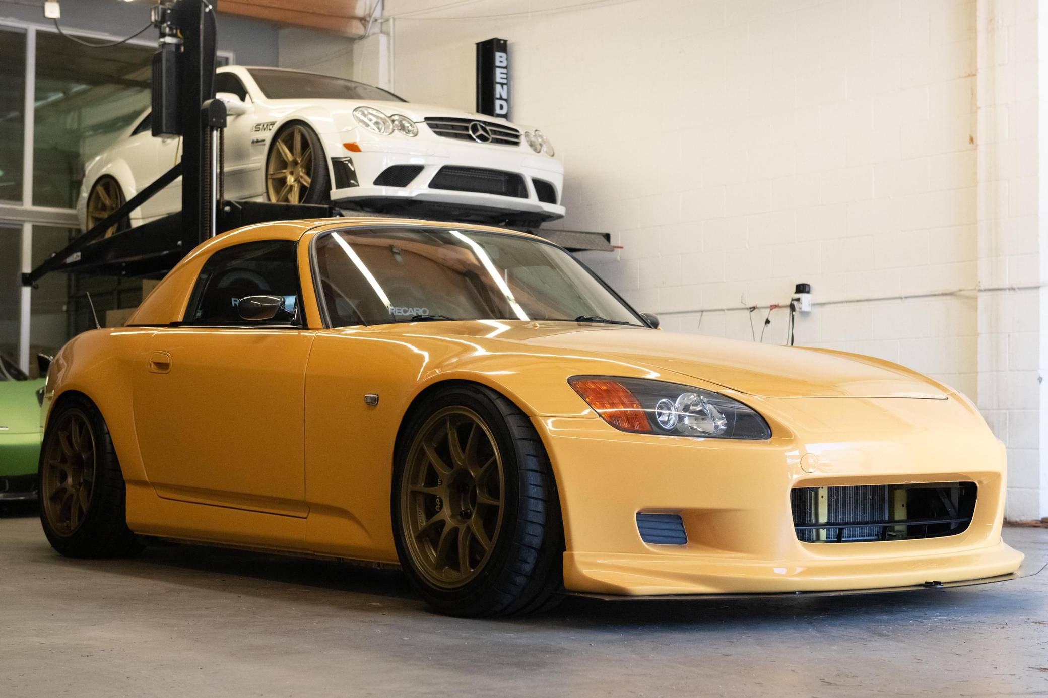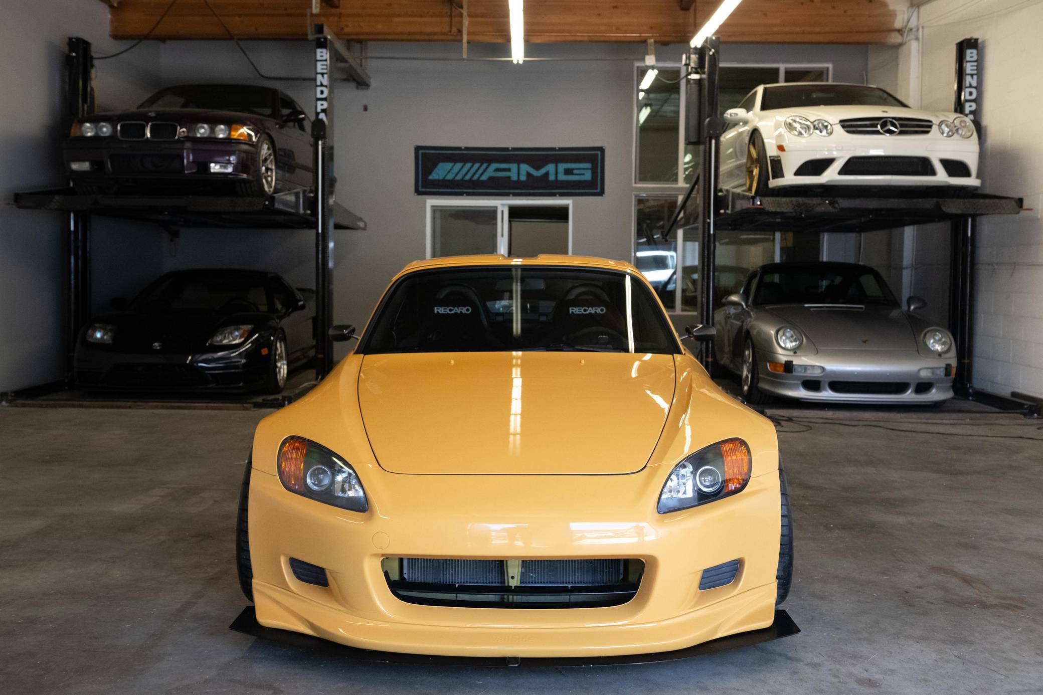 2002 Honda S2000, finished in Mellow Yellow with a black interior. Factory equipment includes a limited-slip differential, HID headlights, air conditioning, cruise control, and a CD player. Modifications to this S2000 are extensive, and the full list is detailed below. include 17-inch WedsSport TC105N wheels, an AP2 6-speed manual transmission, BMC Racing intake manifold, KW V3 coil overs, a color change from Spa Yellow to Mellow Yellow, Veilside front bumper and splitter, aftermarket widebody front fenders, aftermarket rear widebody, convertible soft top removed, Mugen Hardtop, Recaro SPG Seats, Seibon carbon fiber doors, and a Sparco Alcantara steering wheel. The Honda S2000 (known as "AP1" internally) was introduced for the 2000 model year; its model designation references the engine's 2000cc displacement, and its per-liter output was the highest of any naturally aspirated regular-production car. The AP1 also boasted 50/50 weight distribution and independently-sprung, double-wishbone suspension at each corner. Power comes from a 2. 0-liter inline-4 with VTEC technology, rated at 240 horsepower and 153 lb-ft of torque. This engine may be making more power as a result of the modifications, though a dyno sheet is not included. Output is sent to the rear wheels via a 6-speed manual transmission.
