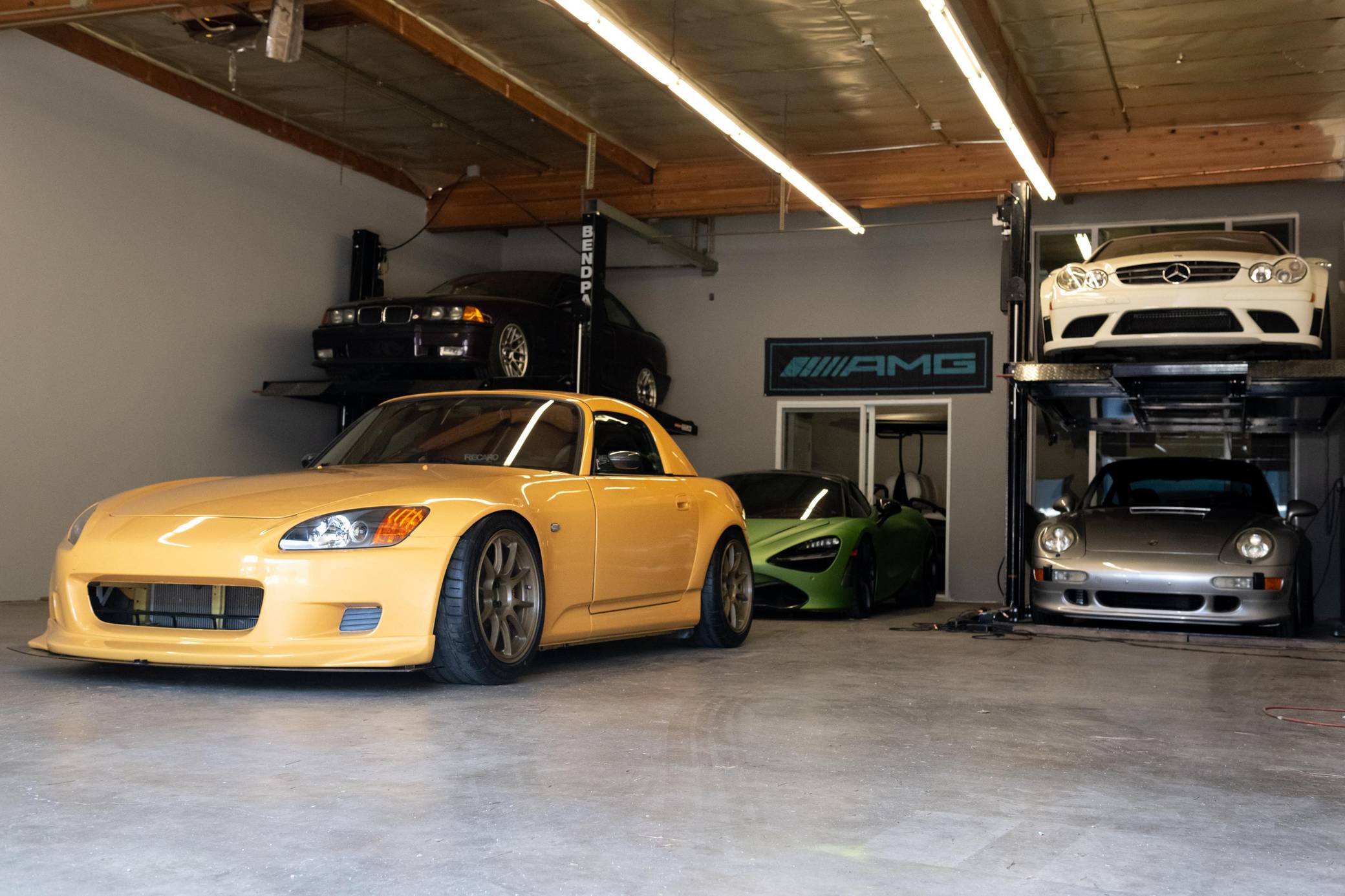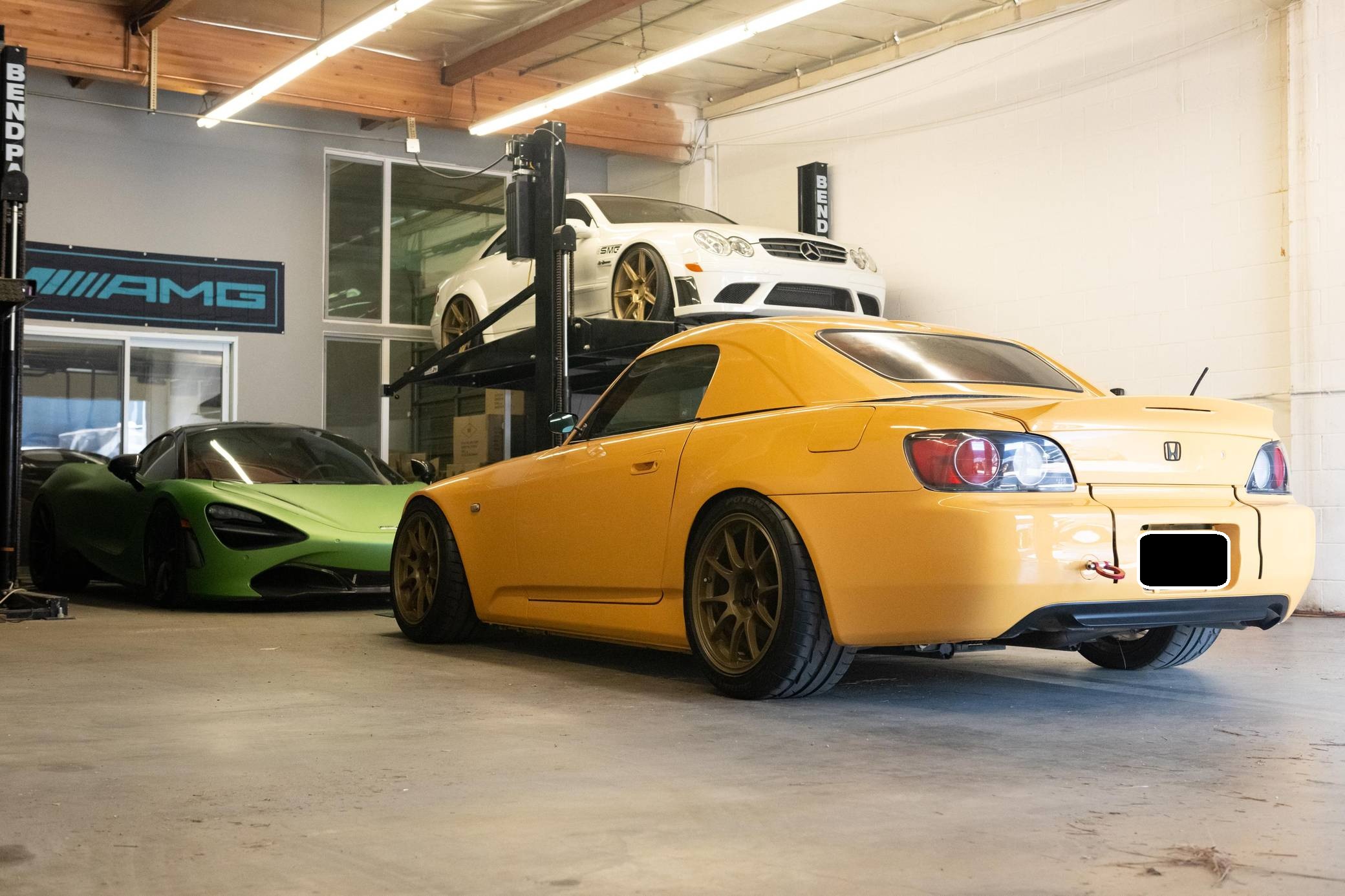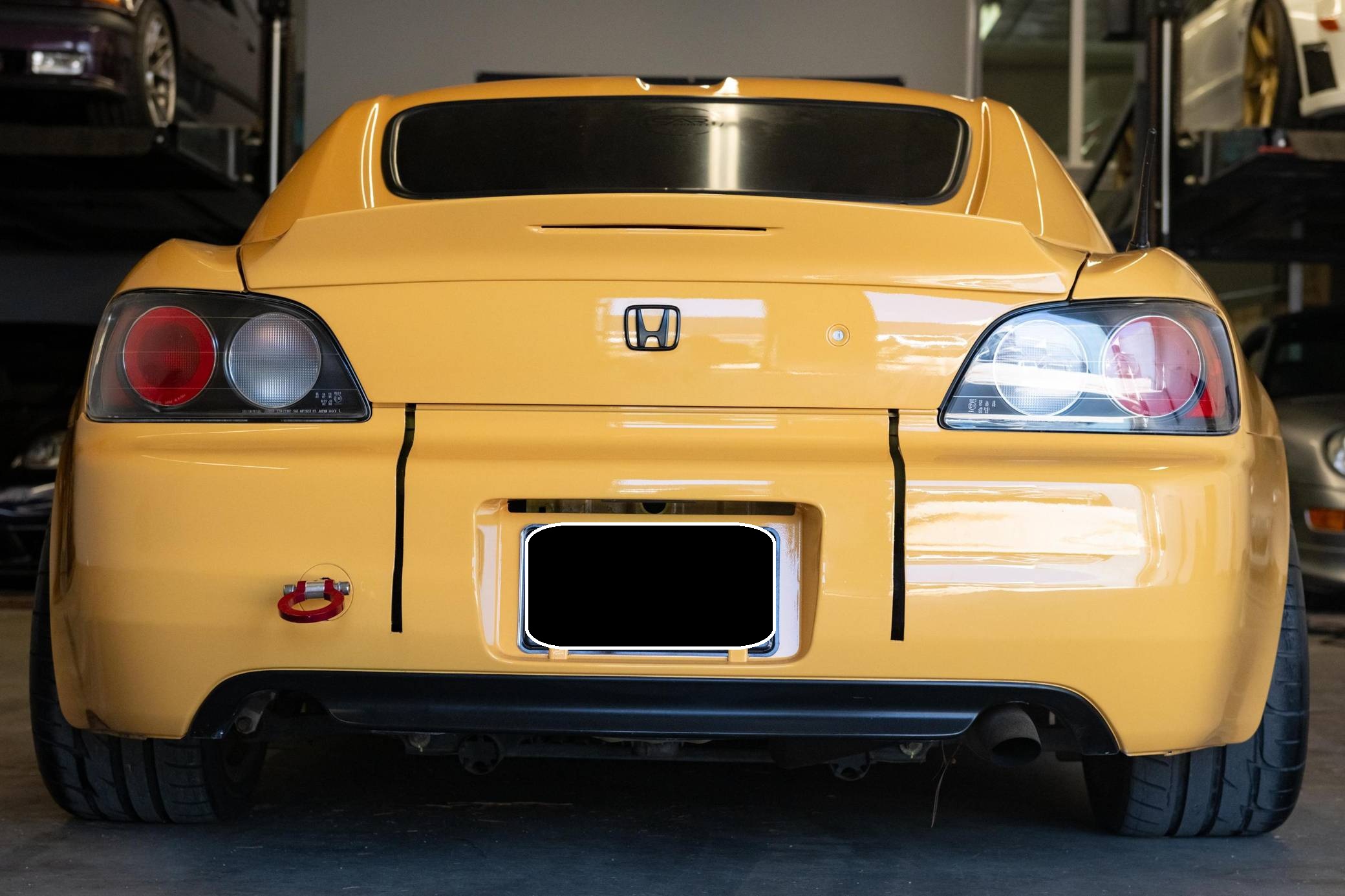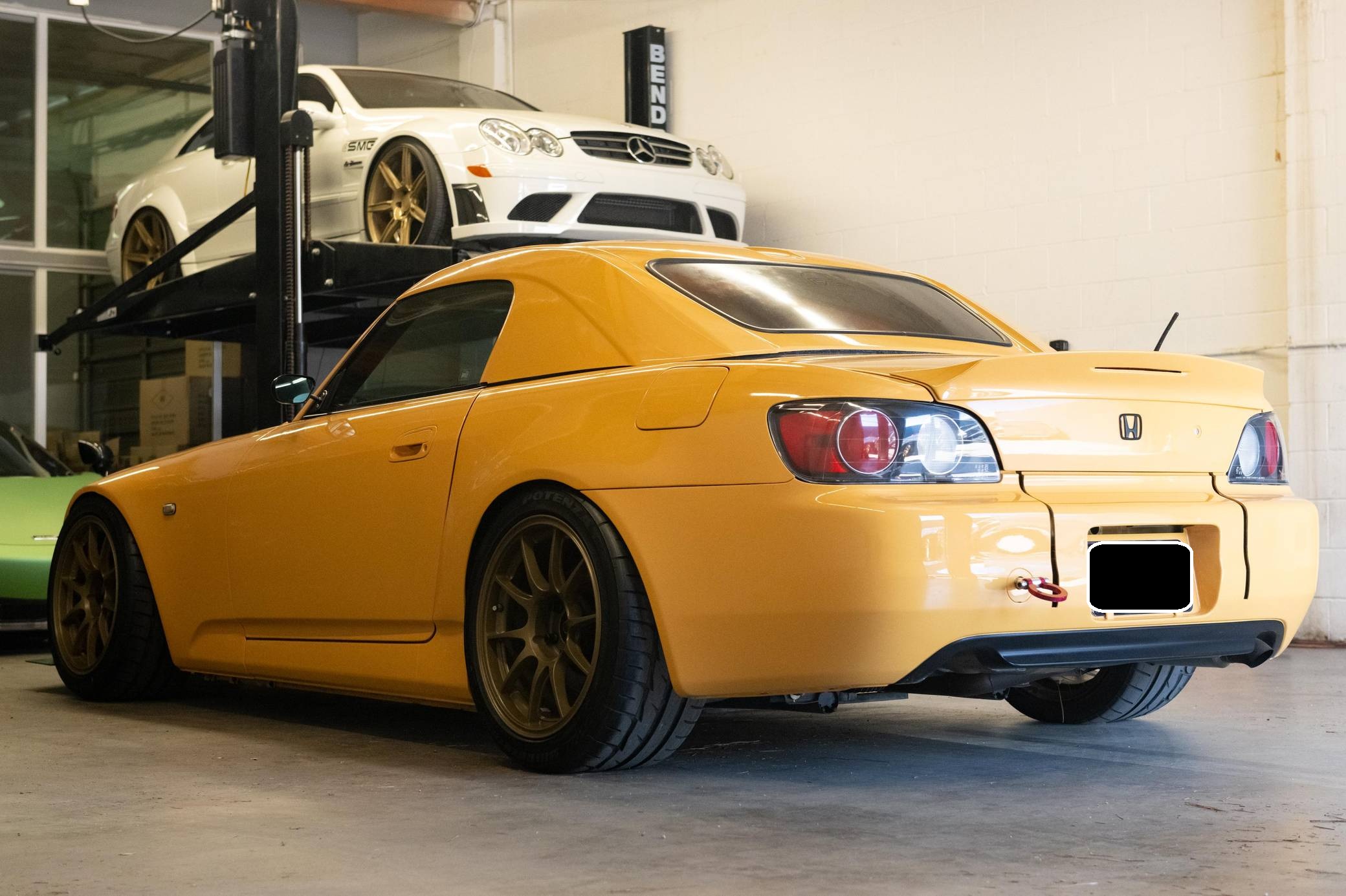 2002 Honda S2000, finished in Mellow Yellow with a black interior. Factory equipment includes a limited-slip differential, HID headlights, air conditioning, cruise control, and a CD player. Modifications to this S2000 are extensive, and the full list is detailed below. include 17-inch WedsSport TC105N wheels, an AP2 6-speed manual transmission, BMC Racing intake manifold, KW V3 coil overs, a color change from Spa Yellow to Mellow Yellow, Veilside front bumper and splitter, aftermarket widebody front fenders, aftermarket rear widebody, convertible soft top removed, Mugen Hardtop, Recaro SPG Seats, Seibon carbon fiber doors, and a Sparco Alcantara steering wheel. The Honda S2000 (known as "AP1" internally) was introduced for the 2000 model year; its model designation references the engine's 2000cc displacement, and its per-liter output was the highest of any naturally aspirated regular-production car. The AP1 also boasted 50/50 weight distribution and independently-sprung, double-wishbone suspension at each corner. Power comes from a 2. 0-liter inline-4 with VTEC technology, rated at 240 horsepower and 153 lb-ft of torque. This engine may be making more power as a result of the modifications, though a dyno sheet is not included. Output is sent to the rear wheels via a 6-speed manual transmission.